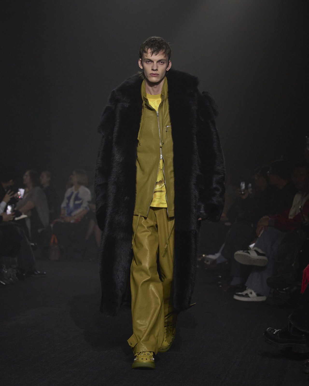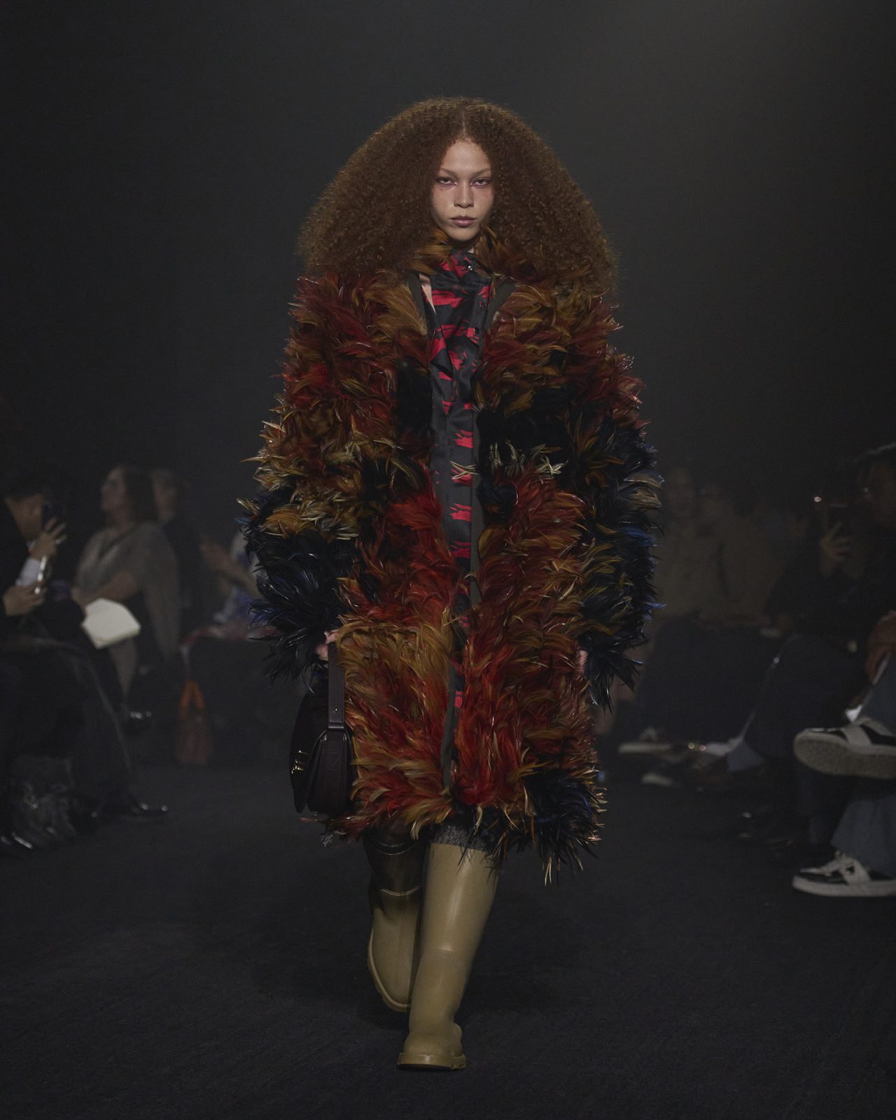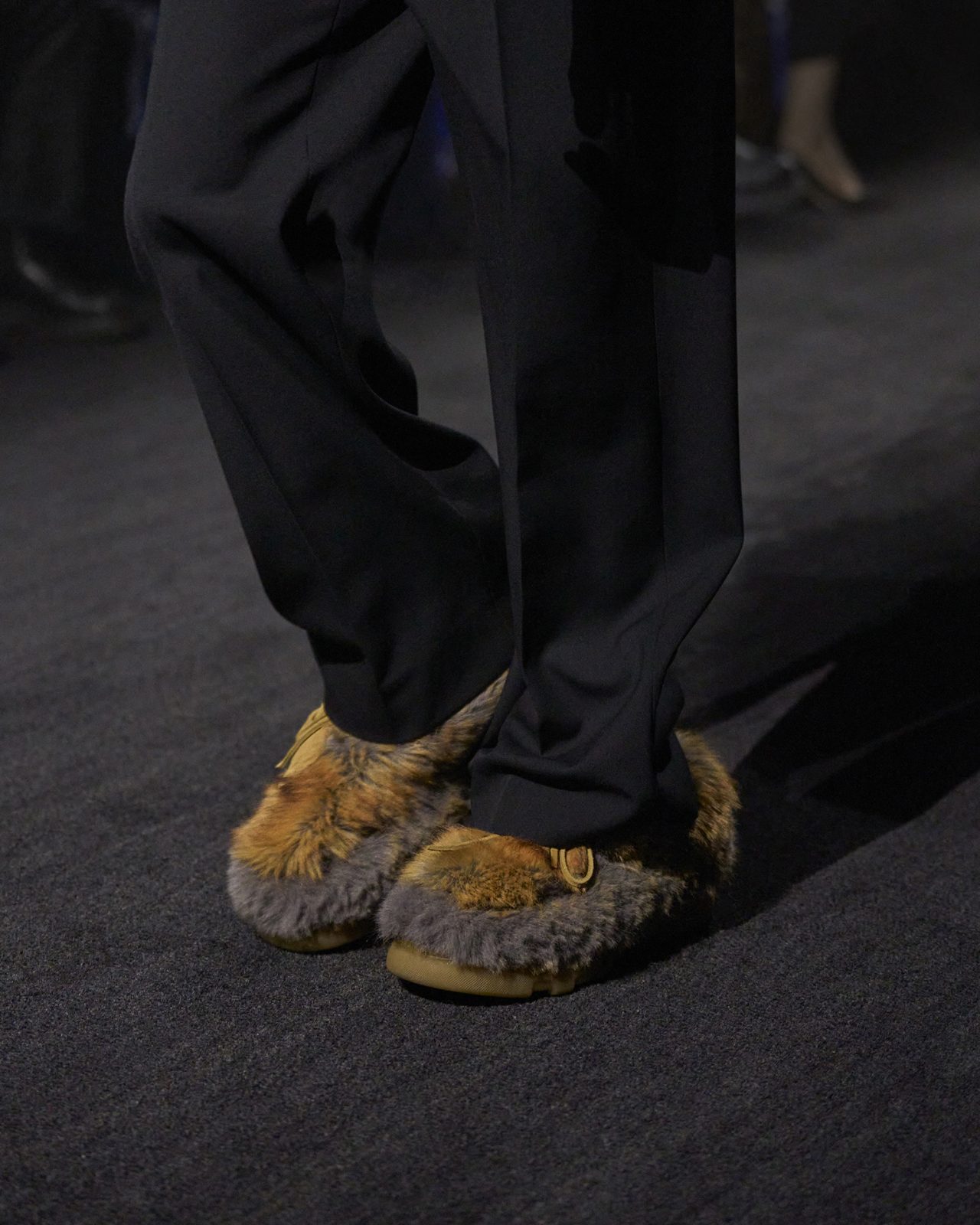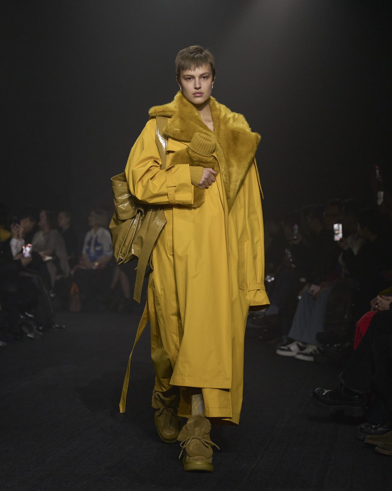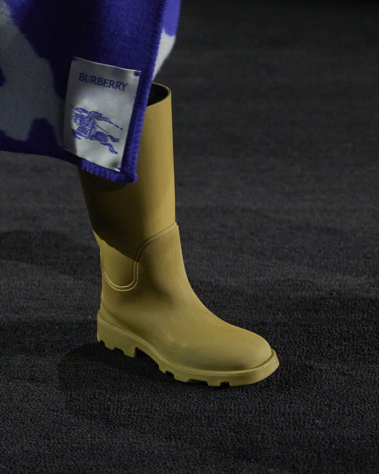 足元にも注目したい。スウェードの乗馬ブーツやラバーレインブーツは、ブランドの原点である機能性から着想を得てデザインされた。スニーカーはシルエットを強調し、サンダルやミュール、パンプスにはシグネチャーであるスクエアシェイプを採用、柔らかな質感のフェイクファーやシアリングを取り入れている。