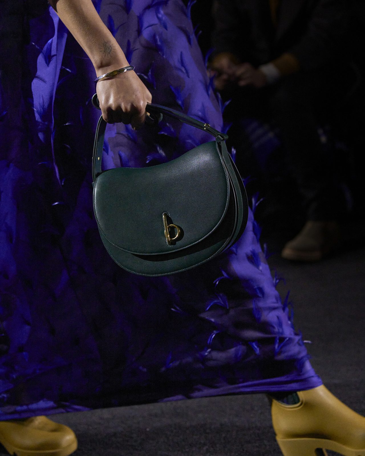 バッグは、Burberry が得意とするアウトドアの美学を反映させた。丈夫な素材から作られた大胆なカラーのサドルバッグやサッチェルには、ブランドのイニシャル「b」を留め具に施した。細かなディテールにこだわり、実用性を兼ね備えたデザインに仕上がっている。