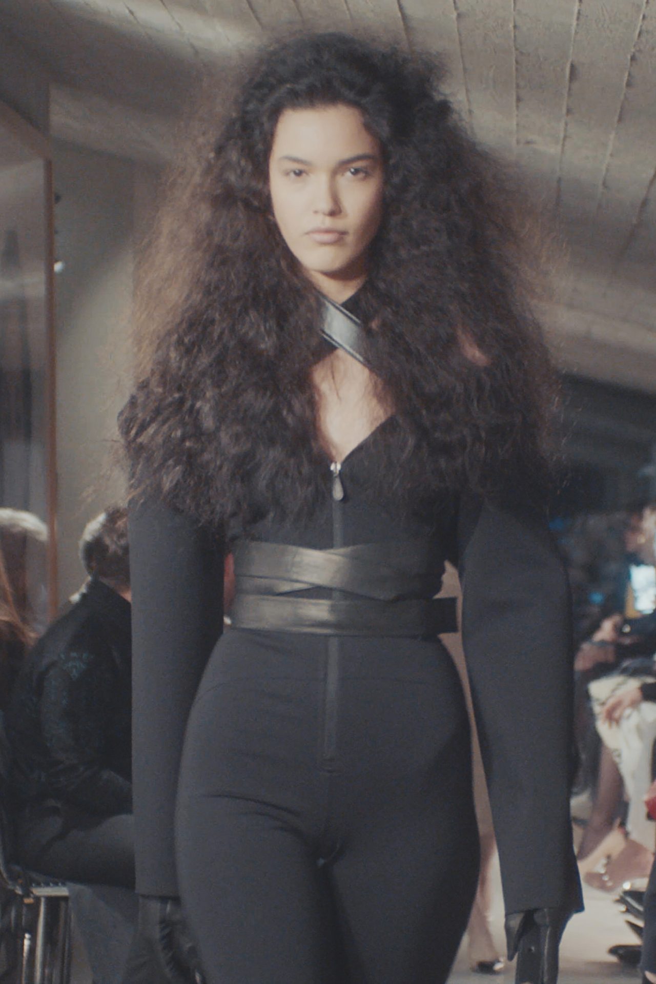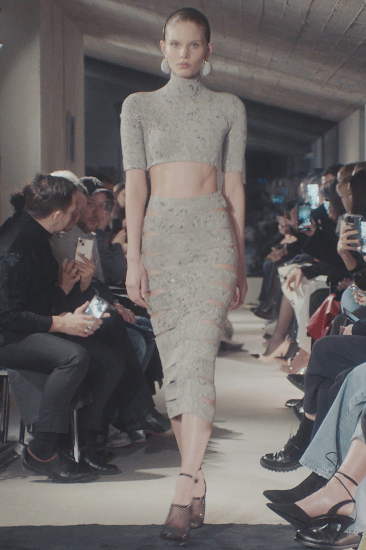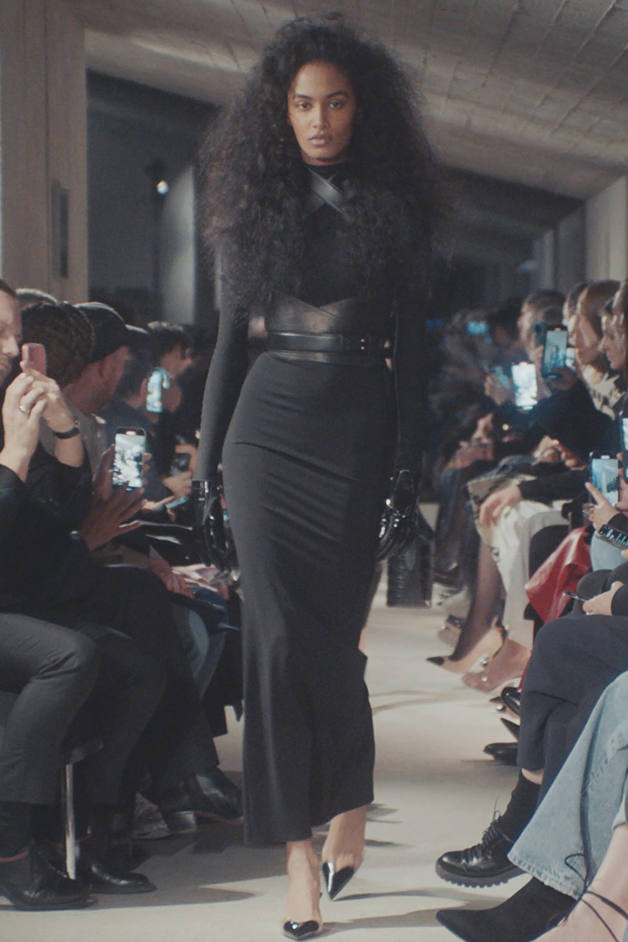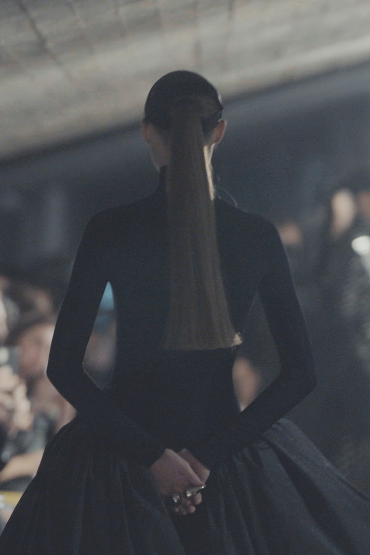 本コレクションは、全体的に ALAÏA らしい洗練されたモノトーンで表現された。華美な装飾を施さず、ボディに沿ったシルエットを強調し、ボディコンシャスな雰囲気の中にエレガンスムードを漂わせている。緻密でありながら自然な曲線美は、ALAÏA の普遍的なものであり、官能的なラインを演出しながら女性の真髄を映し出す。