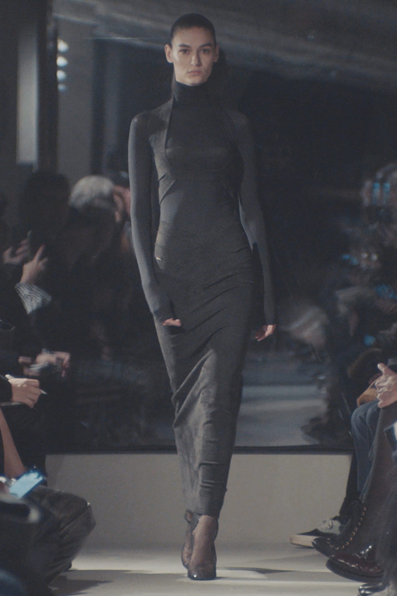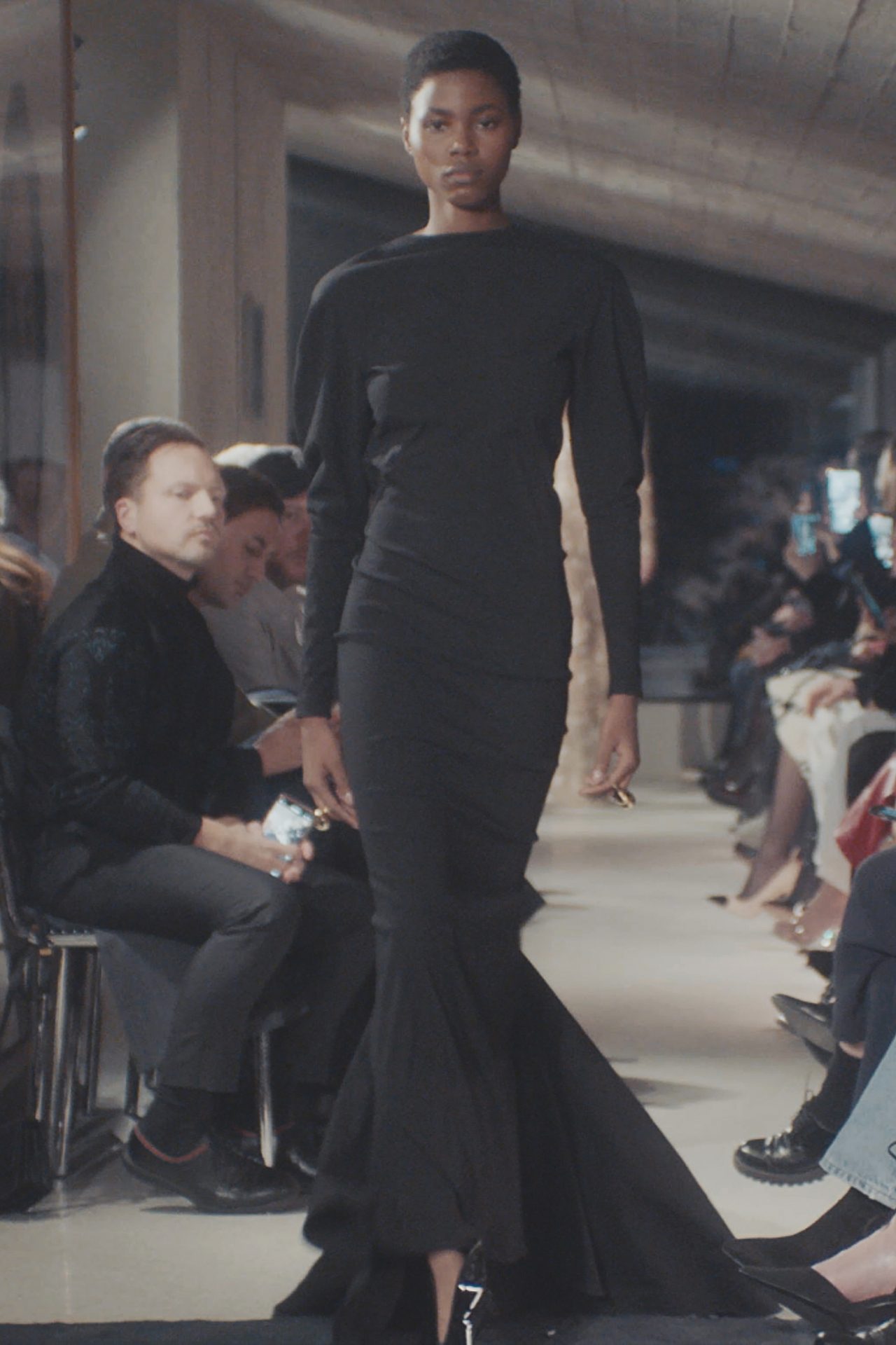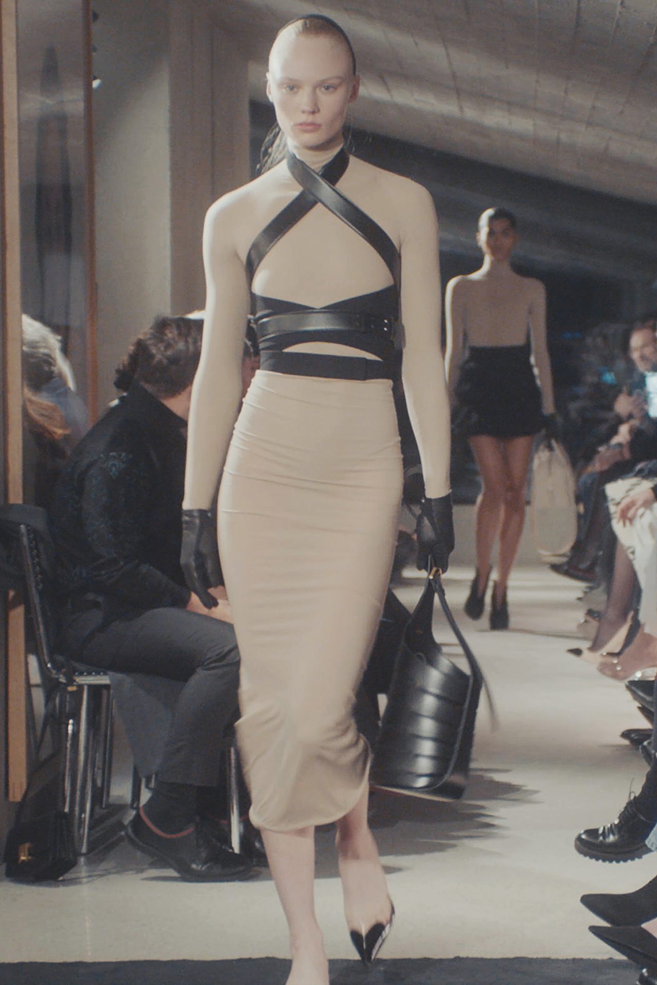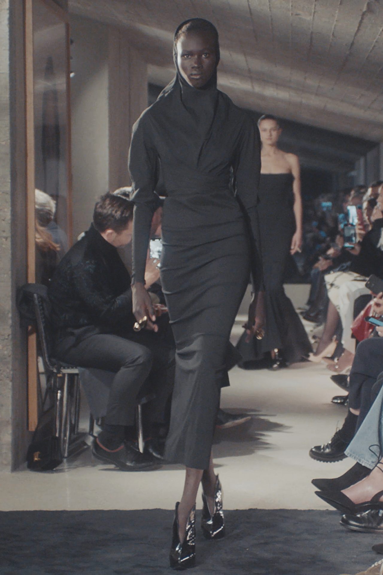 本コレクションは、全体的に ALAÏA らしい洗練されたモノトーンで表現された。華美な装飾を施さず、ボディに沿ったシルエットを強調し、ボディコンシャスな雰囲気の中にエレガンスムードを漂わせている。緻密でありながら自然な曲線美は、ALAÏA の普遍的なものであり、官能的なラインを演出しながら女性の真髄を映し出す。