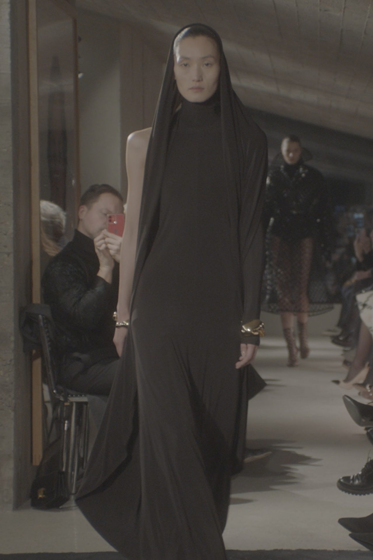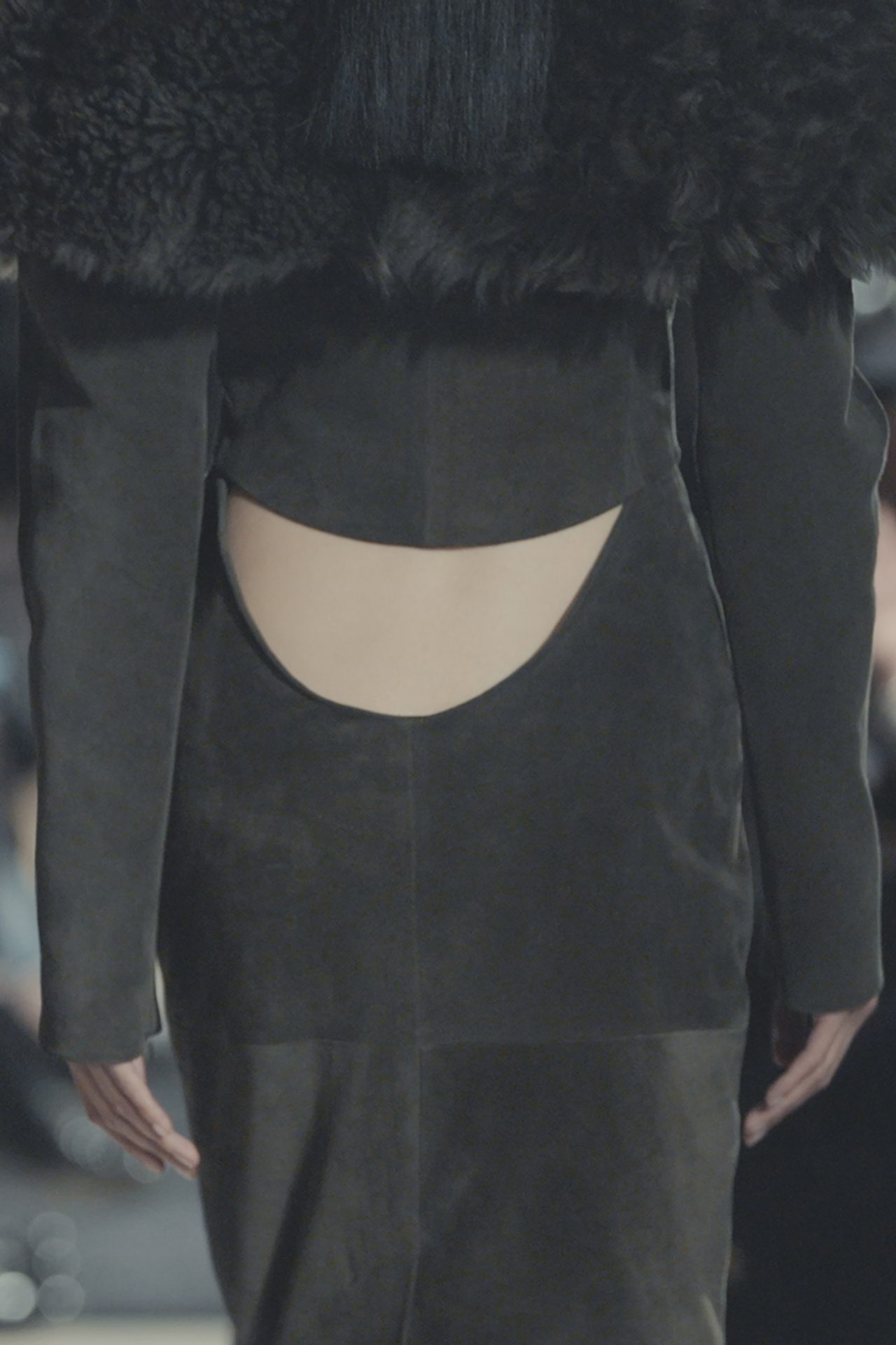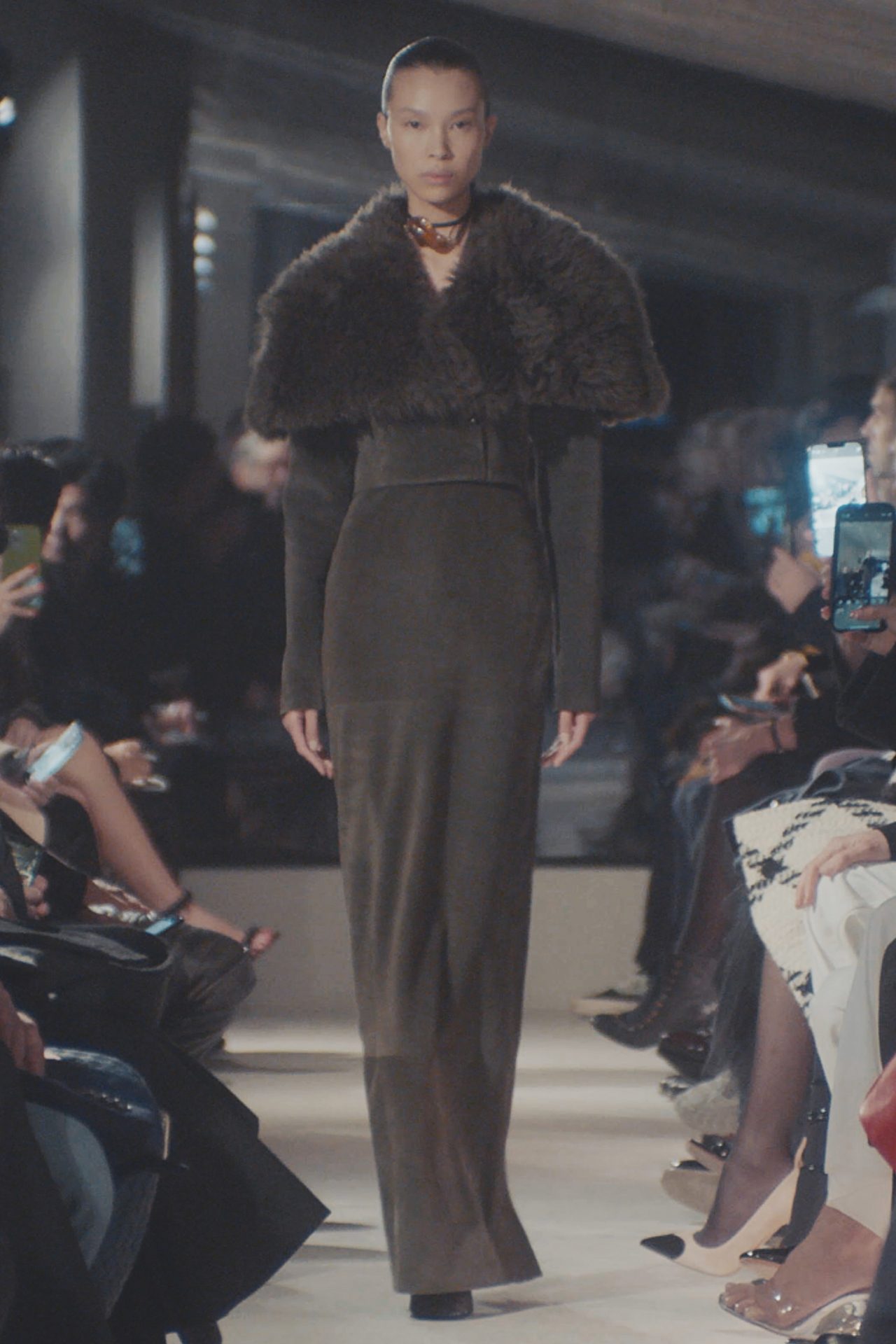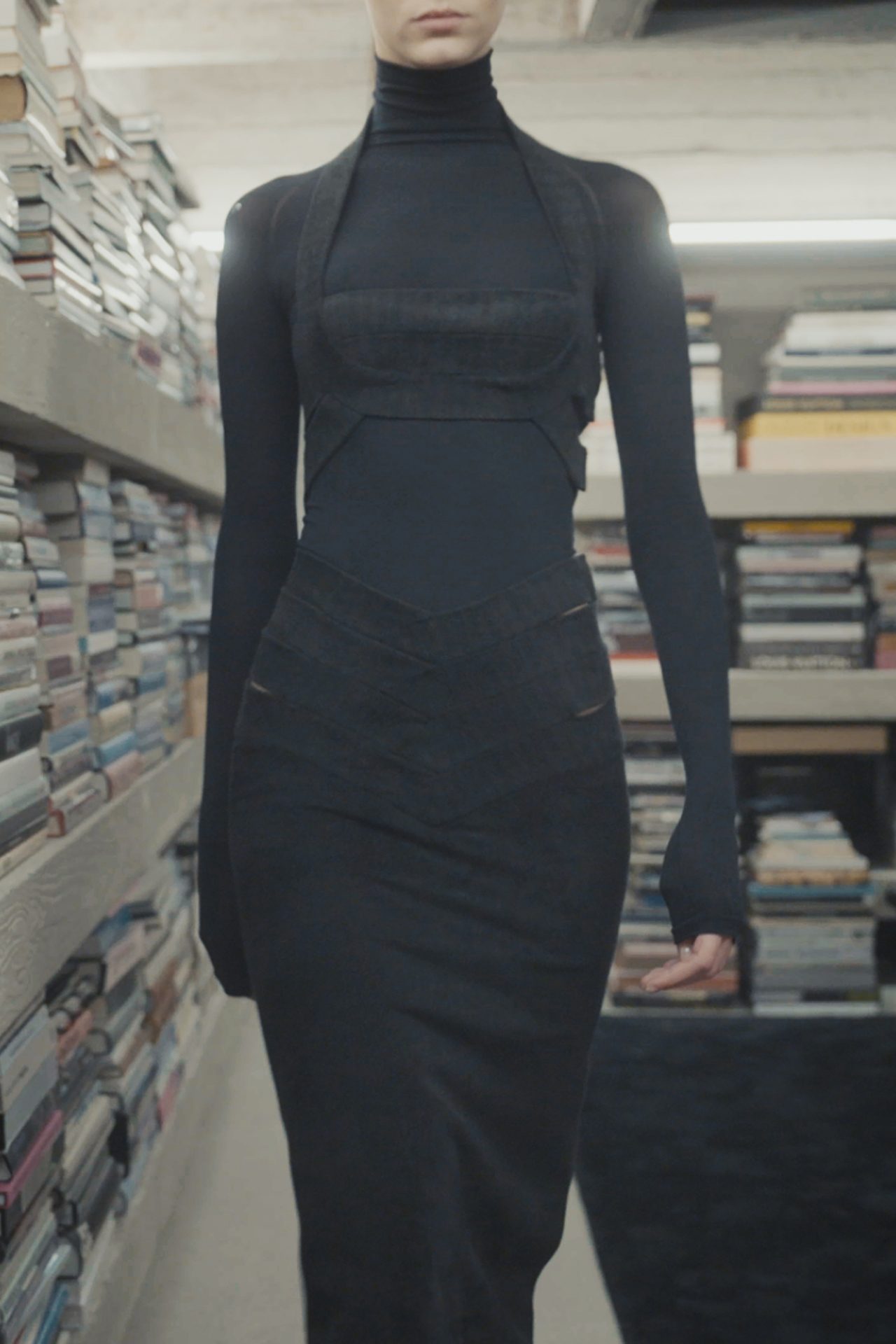 本コレクションは、全体的に ALAÏA らしい洗練されたモノトーンで表現された。華美な装飾を施さず、ボディに沿ったシルエットを強調し、ボディコンシャスな雰囲気の中にエレガンスムードを漂わせている。緻密でありながら自然な曲線美は、ALAÏA の普遍的なものであり、官能的なラインを演出しながら女性の真髄を映し出す。