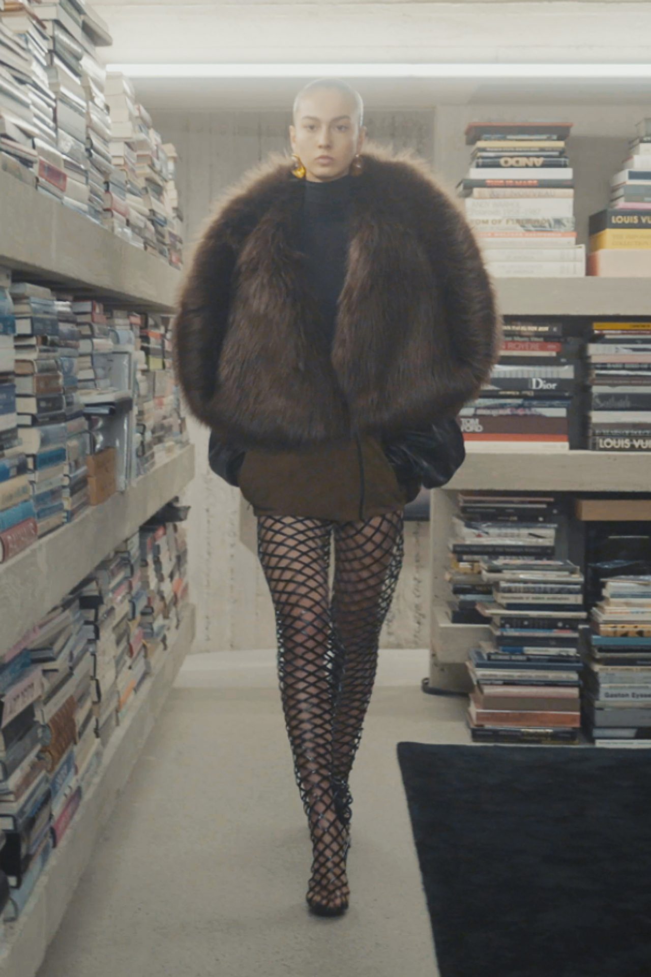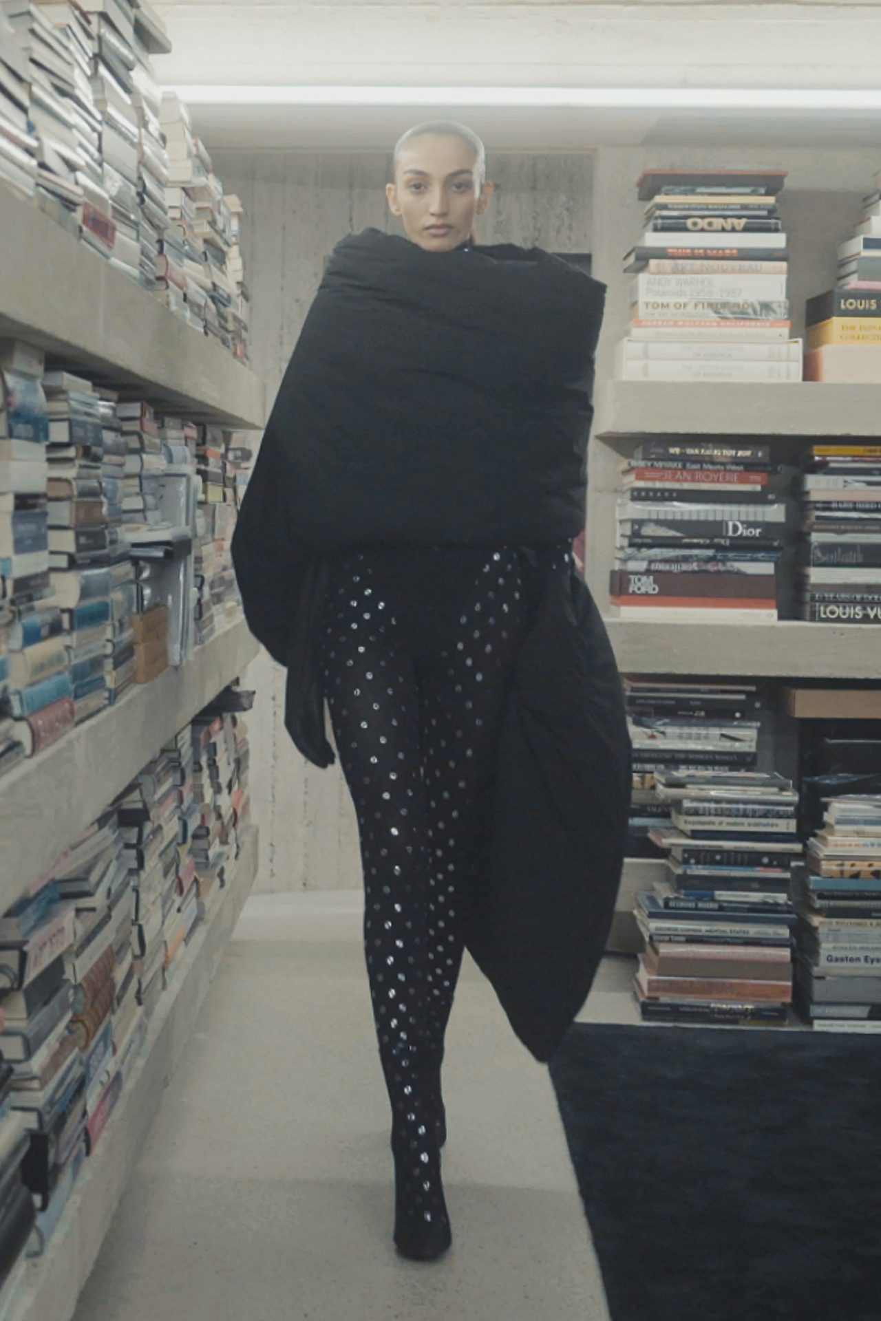 今回のコレクションは、アントワープにある Pieter Mulier の「家(メゾン)」にゲストを招いてショーを行った。彼の所有する本や家具に囲まれた会場は、親密で個人的な空間となり、人生を通して構築されたウェアとメゾンとのインタラクティブな交流を楽しむことができる。フランス語の Maison (メゾン) は、物理的なものと心理的なものの両方を表すことができる言葉だ。ALAÏA にとって、ホームは重要な要素の一つであるという。彼のアトリエ兼自宅の会場は、幅を狭くし、ゲストが間近でコレクションを鑑賞できるように配慮された。