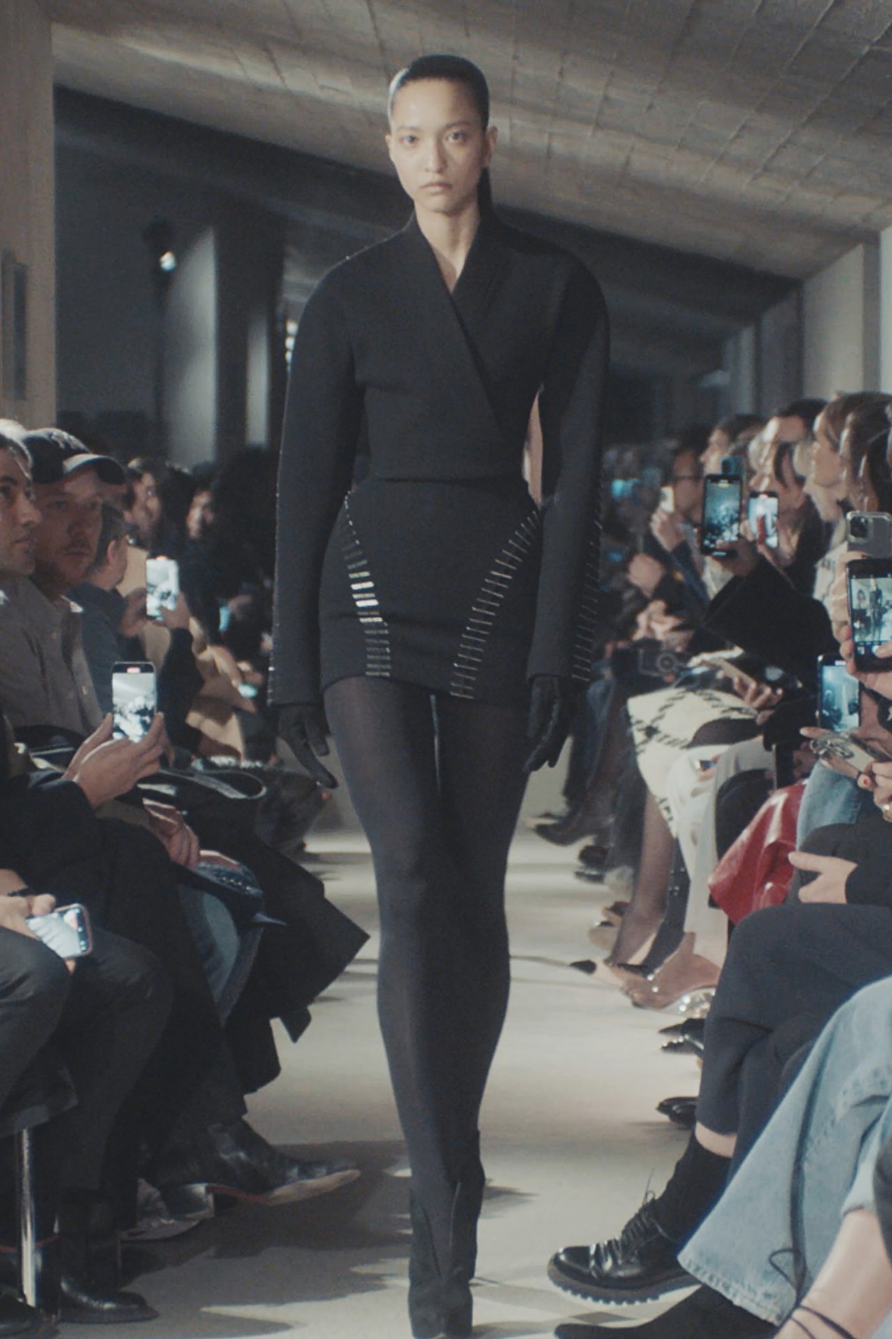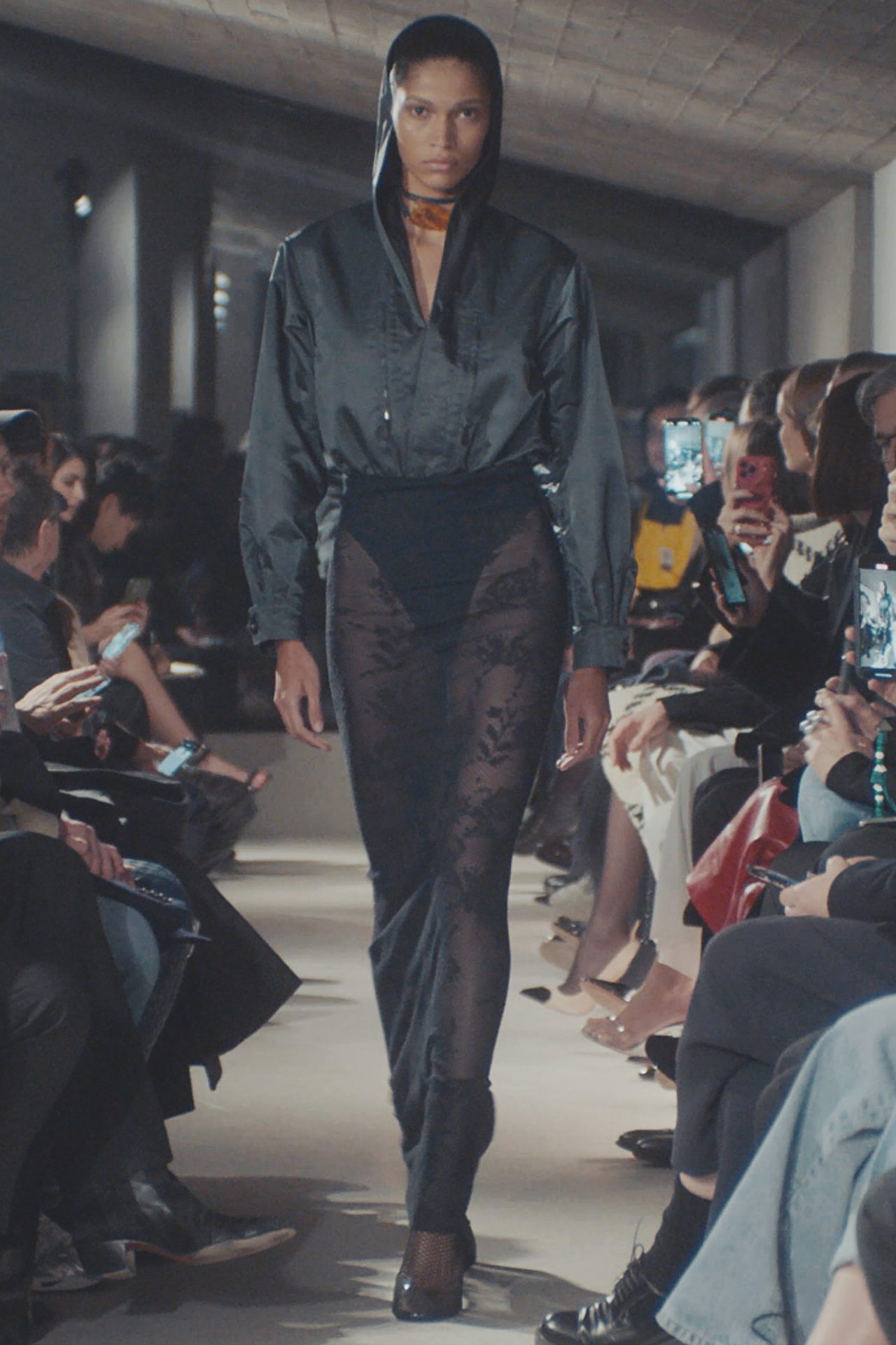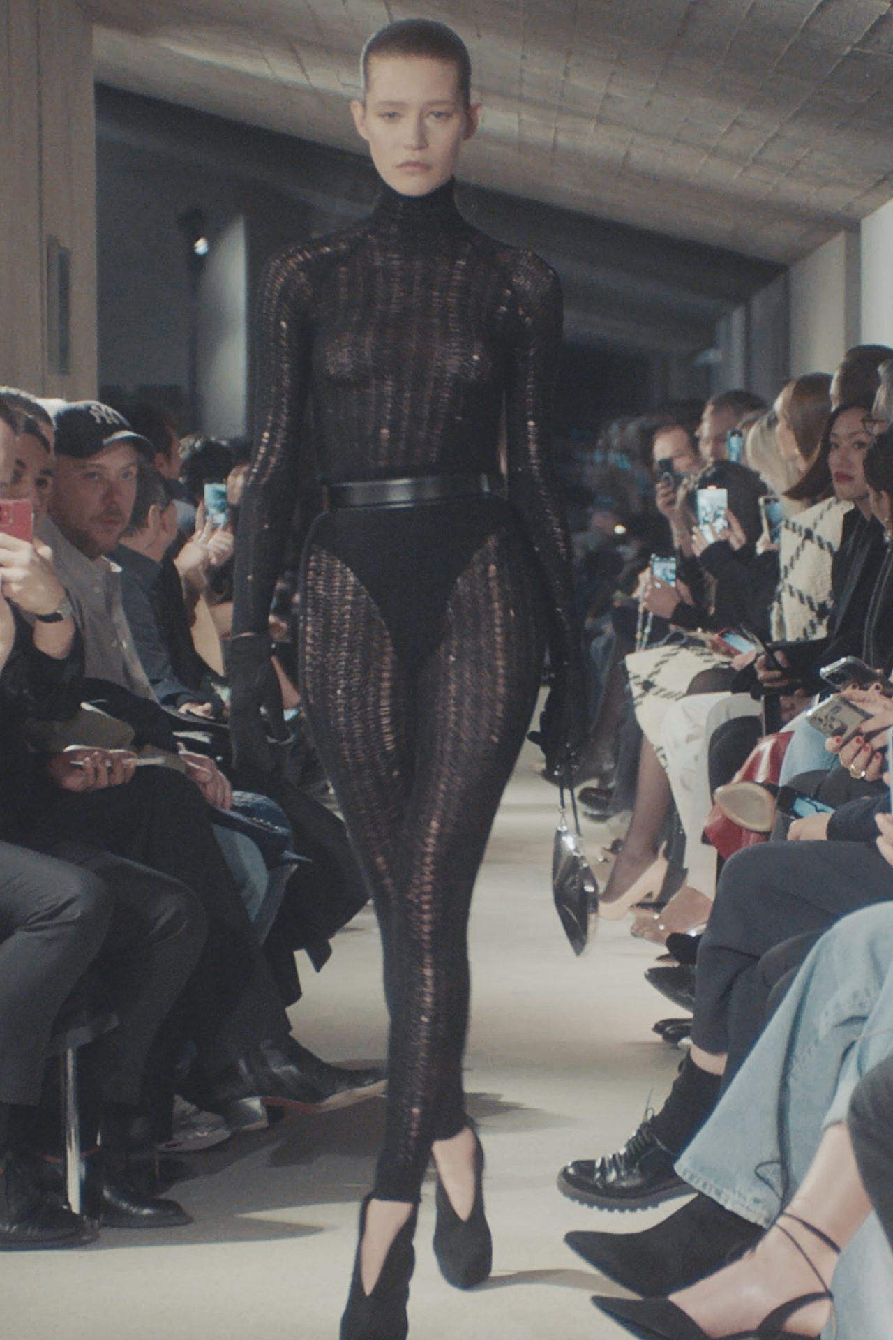 また、インパクトのあるレザーをパンチング加工したアイテムも登場。シューズやレギンス、コートなどに採用し、立体的なフォルムを作り上げた。他にも、カッティングや総レース、細かなプリーツ、クロスデザインのハーネスなど、クチュリエの職人技が光るディテールの数々に圧倒されることだろう。メゾンの伝統的なセンシュアリティスタイルに、テーラリングやストリート、パンクの要素も加えた絶妙なバランス感覚が、Pieter Mulier のサヴォアフェールなのだ。