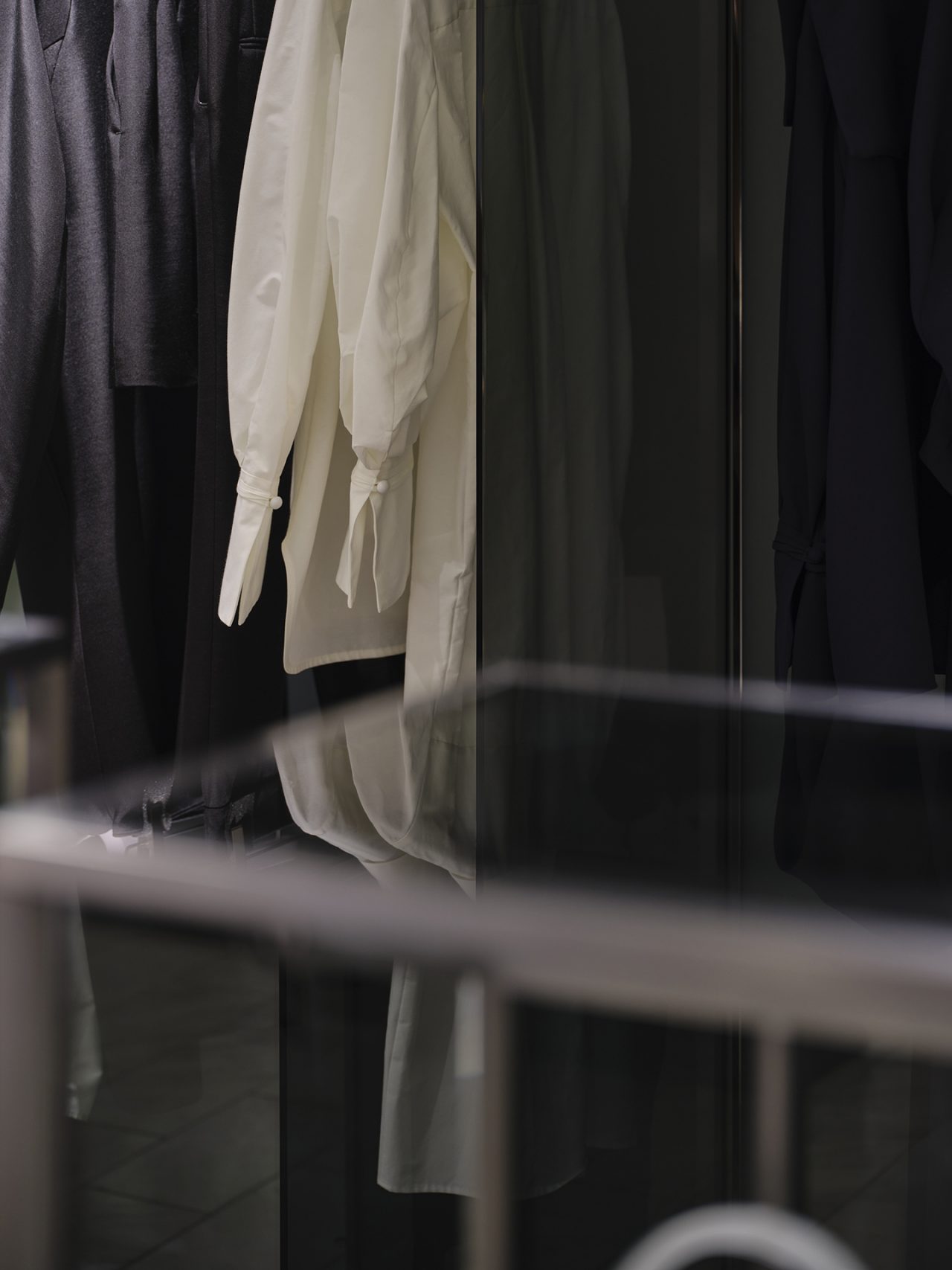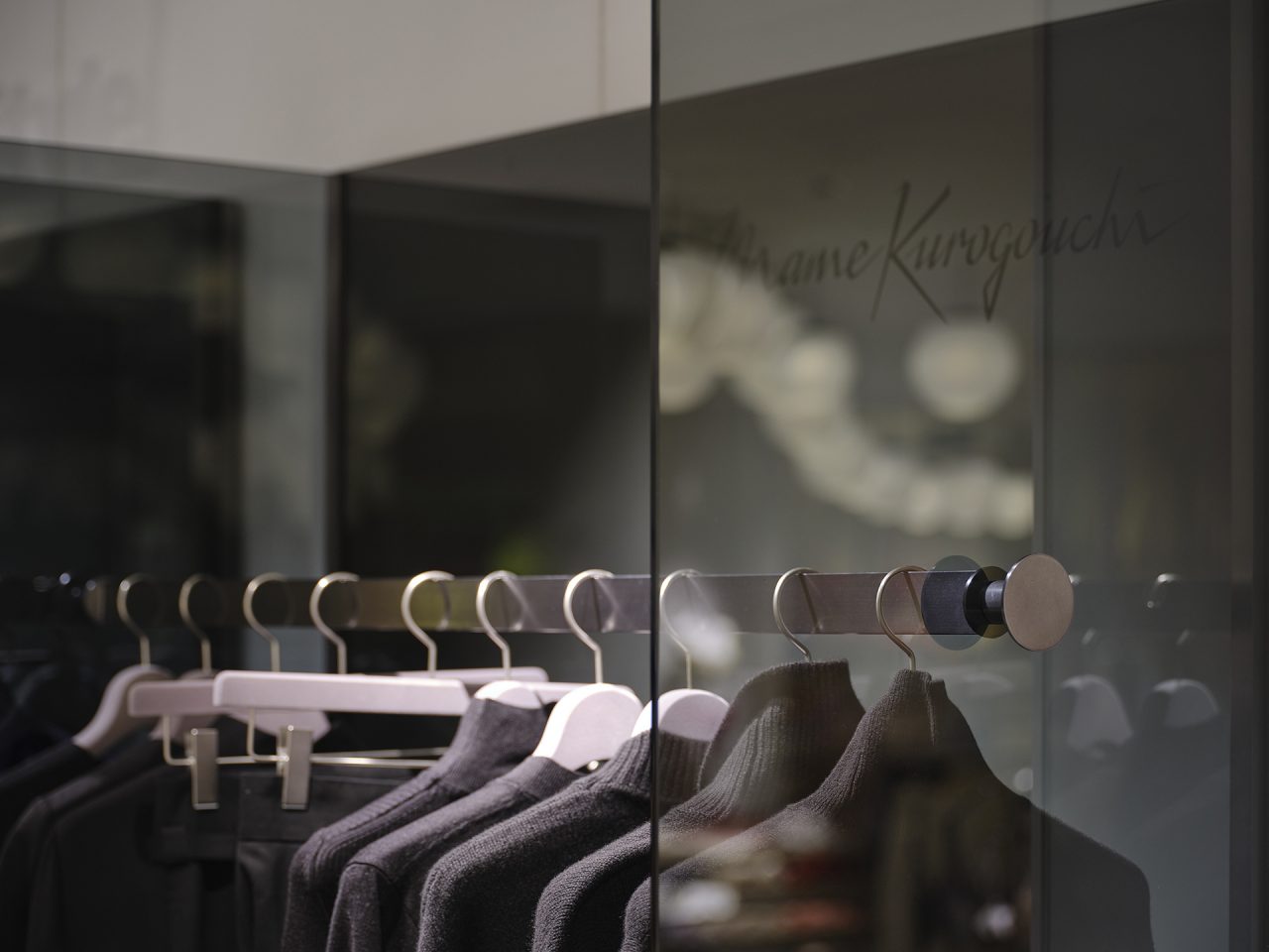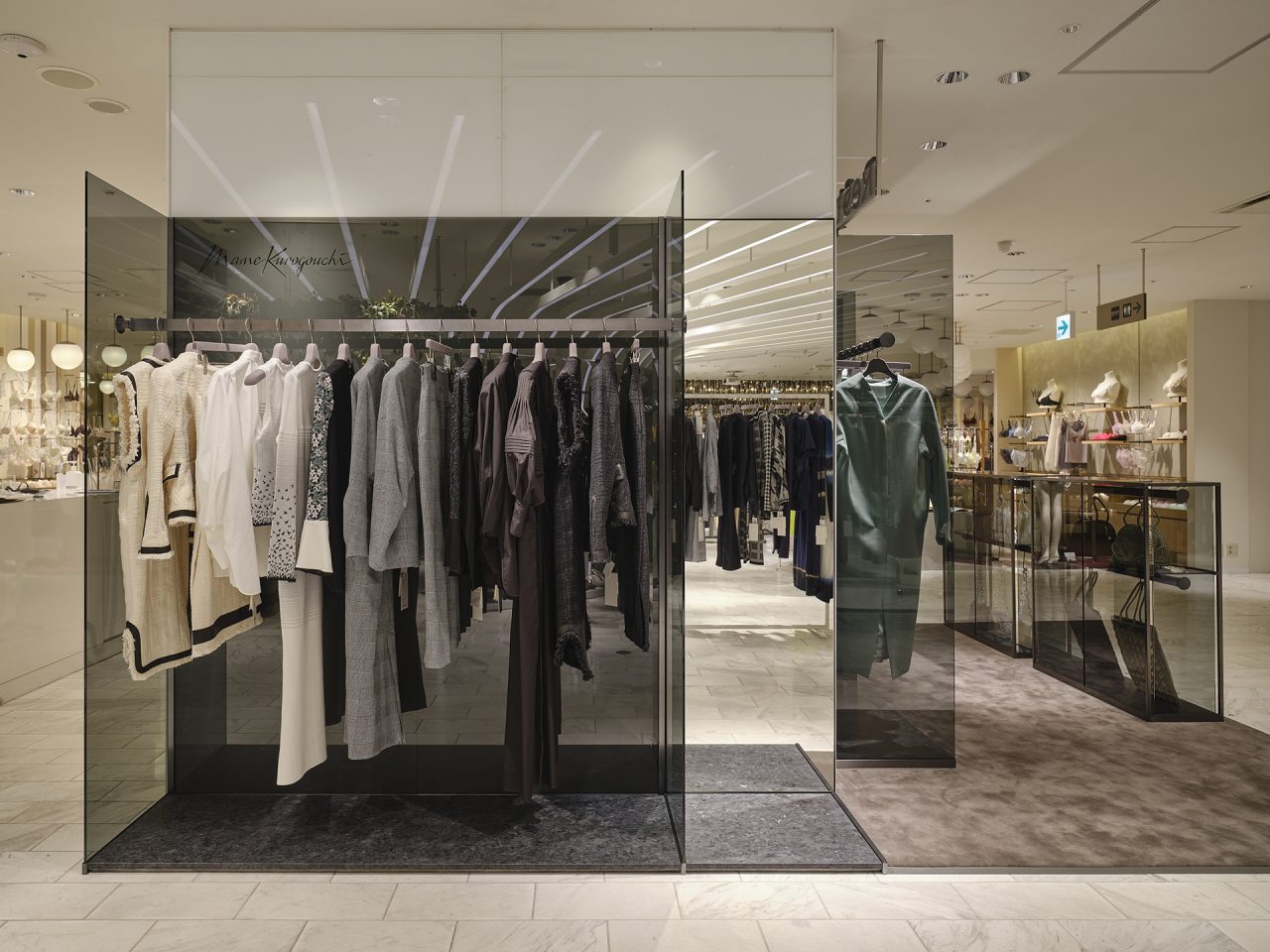 多くの人が行き交い、様々な情報が交差する百貨店という場において、ブランドのフィロソフィーとものづくりを体現し、コレクションの力強さに鋭くフォーカスを当てる。Mame Kurogouchi Aoyama で採用された石灰岩と同様、什器に使用されたガラスは、古代から存在し、長く残り続ける普遍的な素材として、その表情を次々と変化させ、新たな景色への案内役を担う。これにより立ち上がる空間は、そのガラス面に周囲の情報を取り込み、反射させ、曖昧にさせながら、その環境に溶け込むように共存し、Mame Kurogouchi が目指すものづくりが内包する、時間軸の一端を映し出すことだろう。