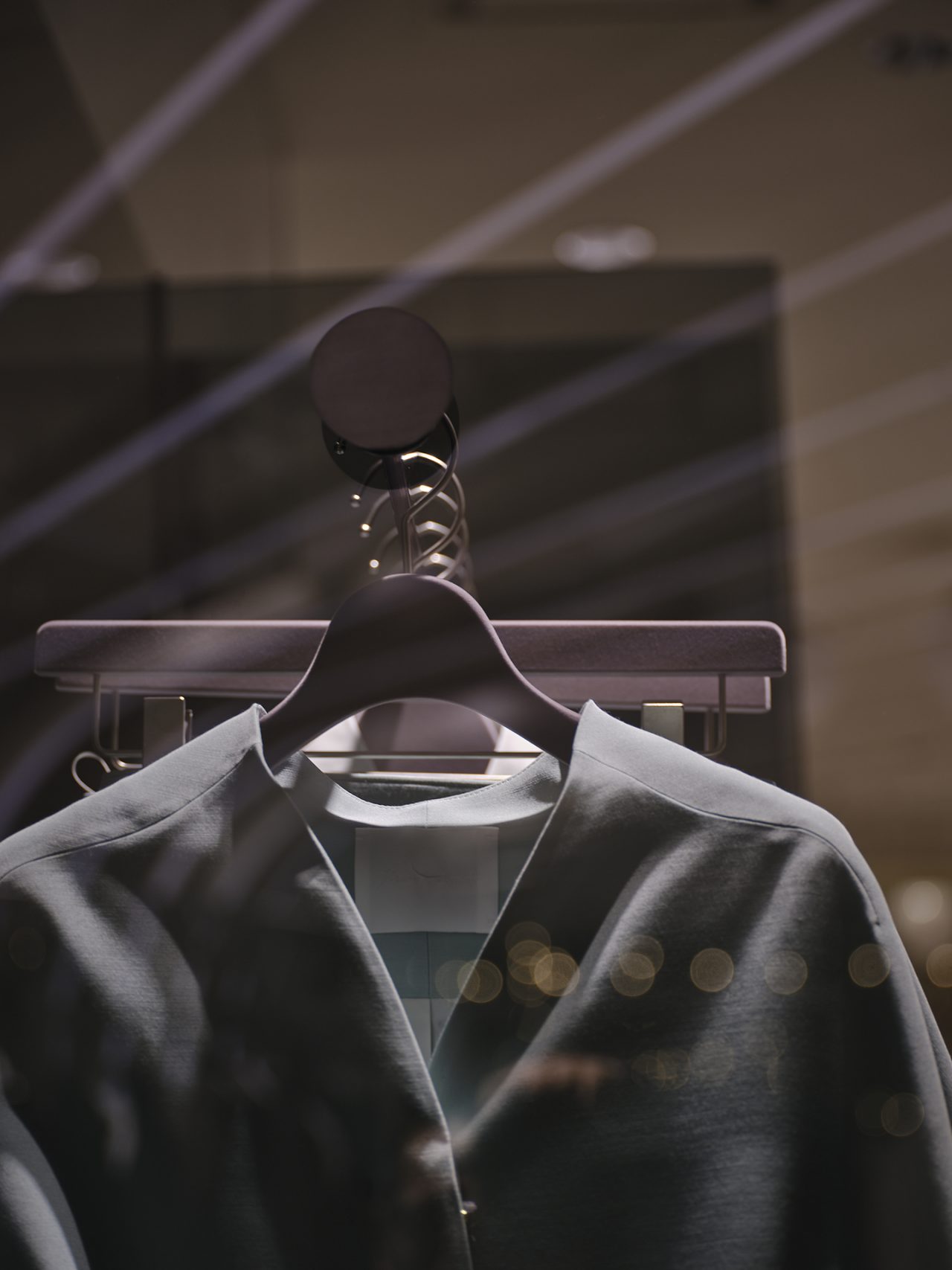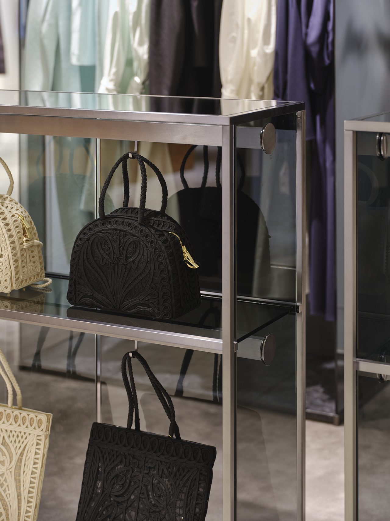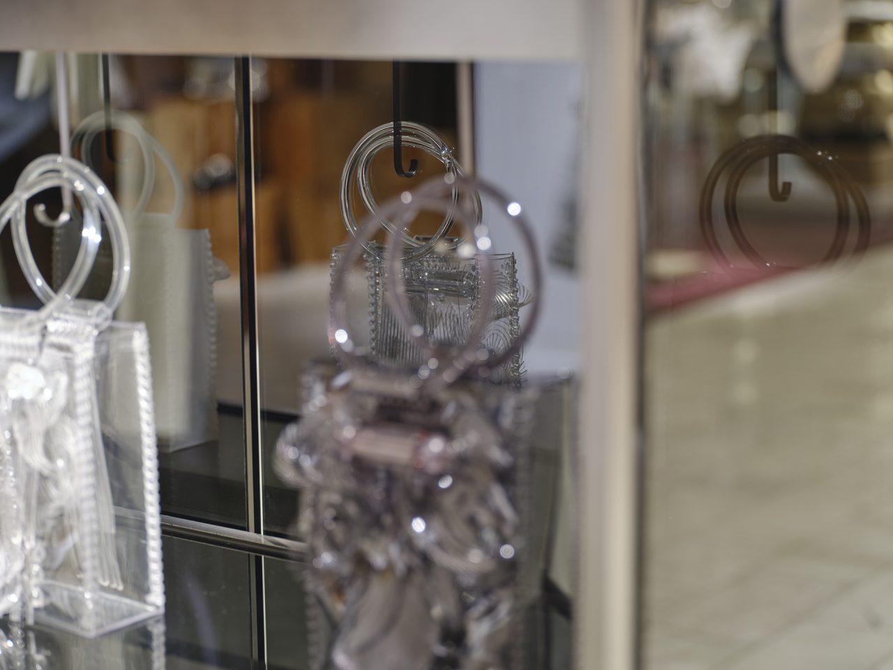 多くの人が行き交い、様々な情報が交差する百貨店という場において、ブランドのフィロソフィーとものづくりを体現し、コレクションの力強さに鋭くフォーカスを当てる。Mame Kurogouchi Aoyama で採用された石灰岩と同様、什器に使用されたガラスは、古代から存在し、長く残り続ける普遍的な素材として、その表情を次々と変化させ、新たな景色への案内役を担う。これにより立ち上がる空間は、そのガラス面に周囲の情報を取り込み、反射させ、曖昧にさせながら、その環境に溶け込むように共存し、Mame Kurogouchi が目指すものづくりが内包する、時間軸の一端を映し出すことだろう。