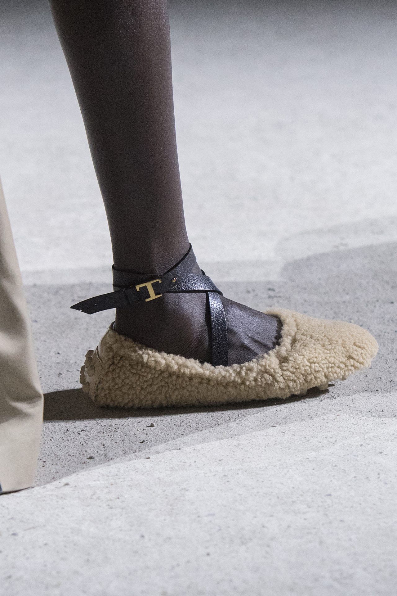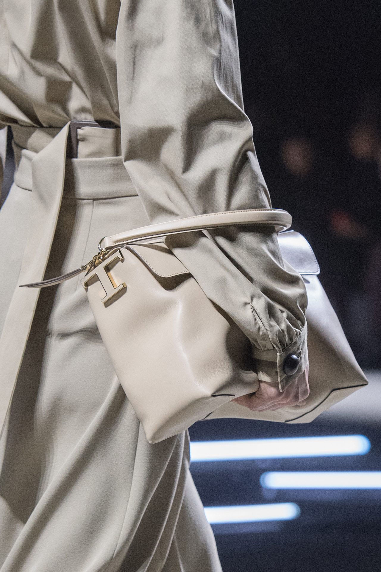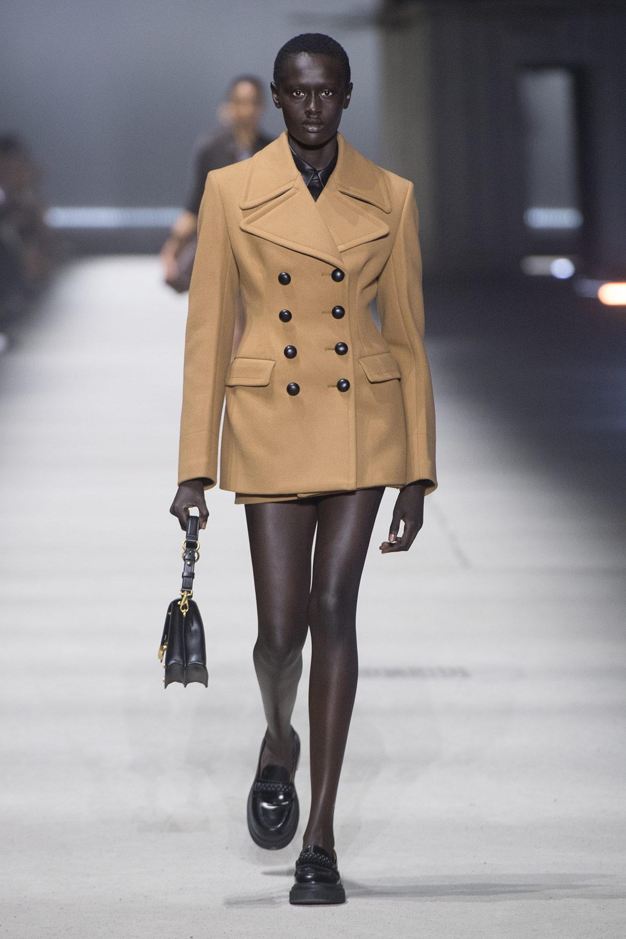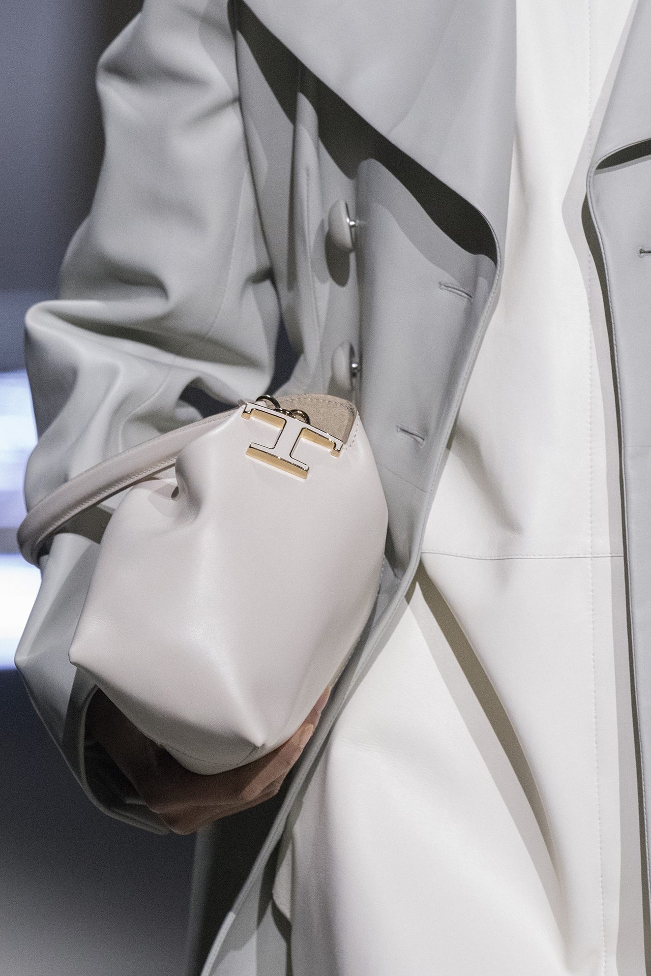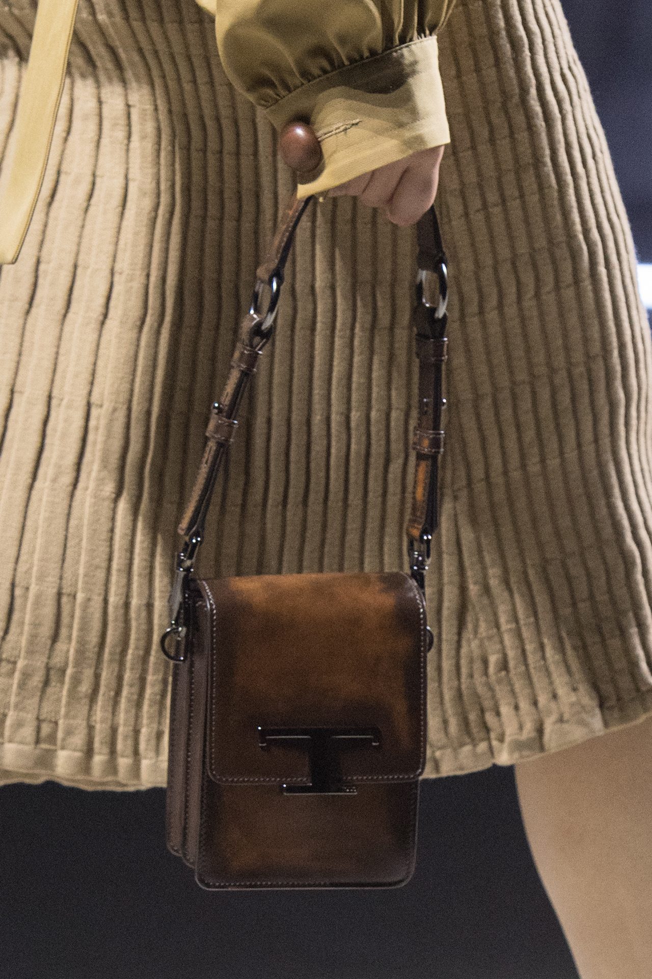天然素材のファブリックのみが使用され、キャメル、ブラウン、クリームといった暖色系から、ブラックとホワイトのモノトーンまでのカラーパレットで統一された本コレクション。TOD’S のアイコニックなペブルモチーフを想わせる、革のくるみボタンが付いたピーコート、シアリングのディテールが加えられたショート丈のボンバージャケットや、エレガントなパデッドジャケットなど、希少な素材が用いられたアウターが登場。フェミニンなニットウェアとは反対に、マスキュリンなスーツは、構築的なシャツと合わせてお披露目された。
