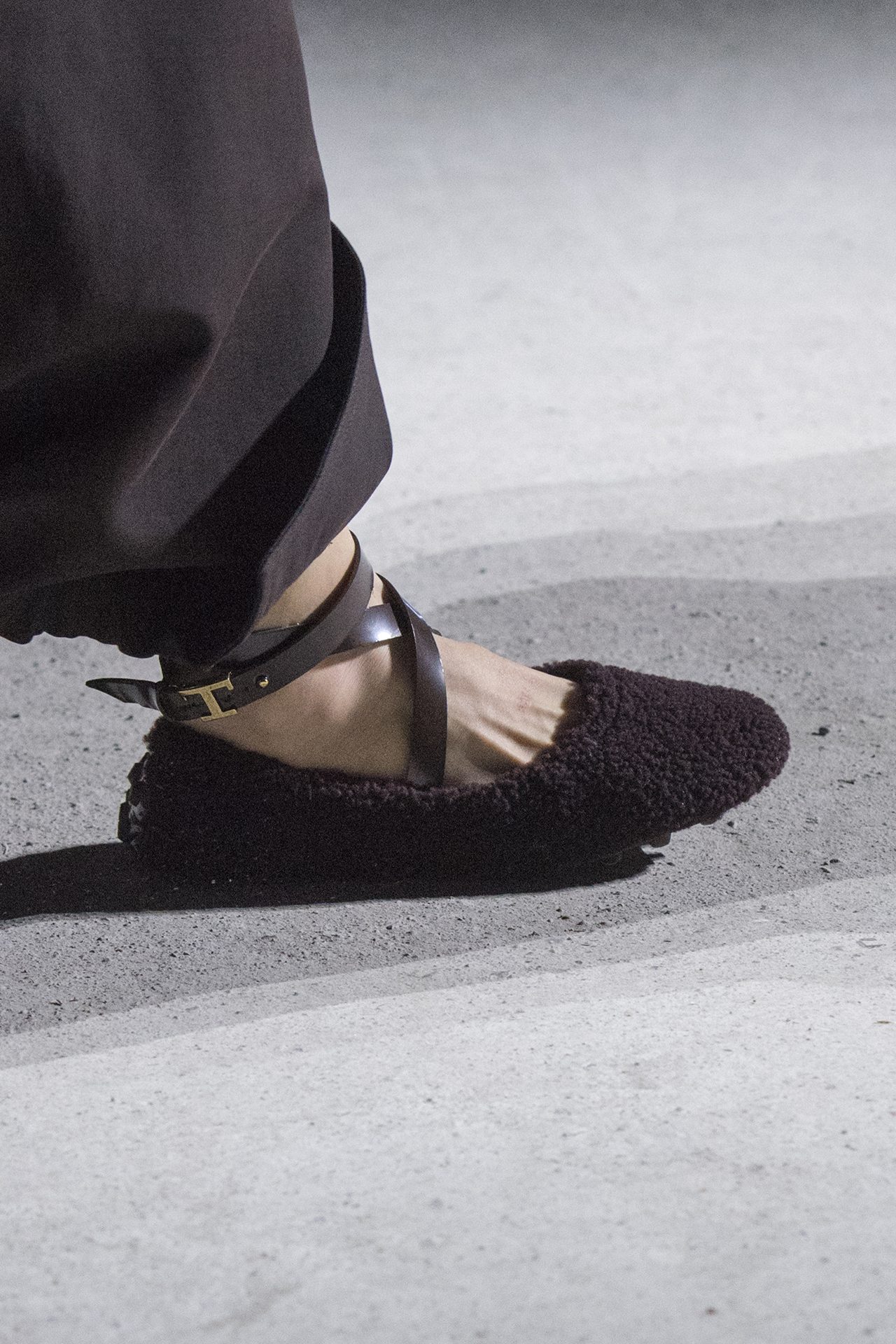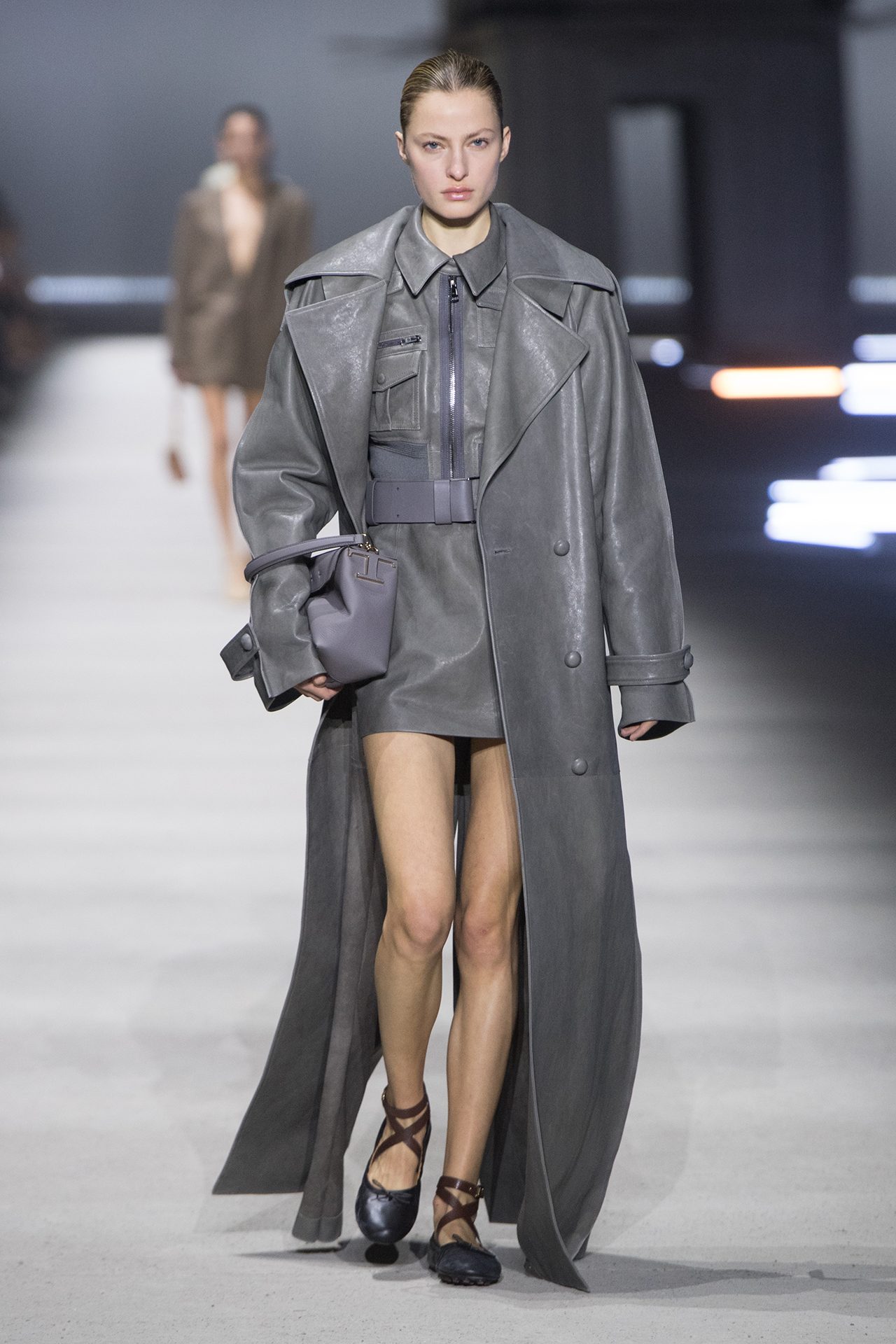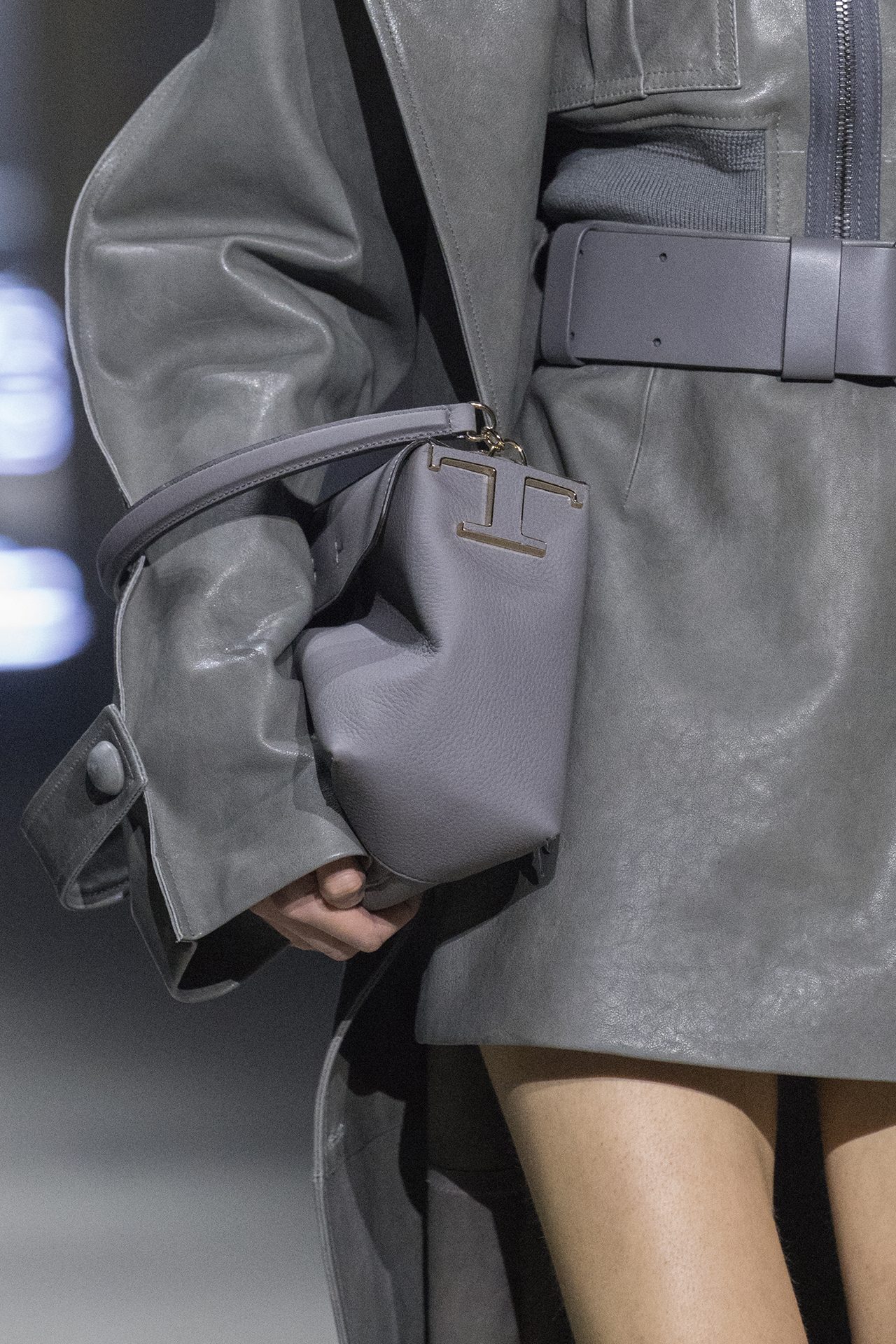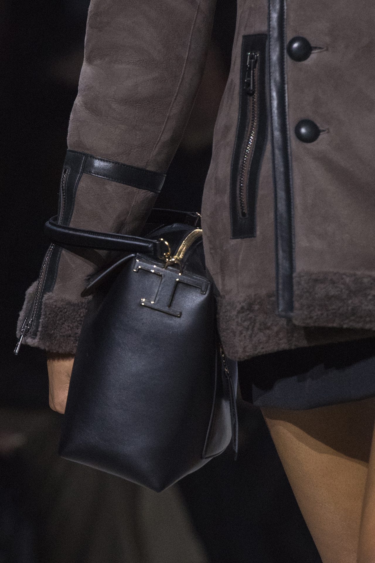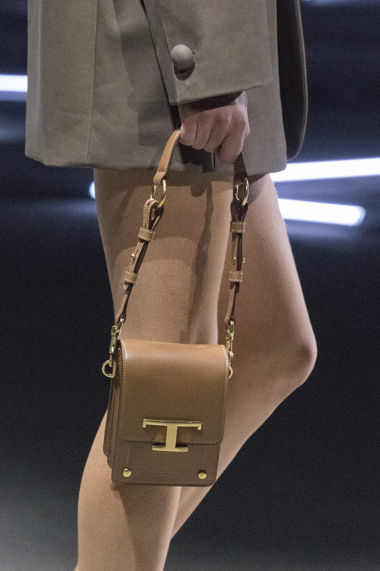 天然素材のファブリックのみが使用され、キャメル、ブラウン、クリームといった暖色系から、ブラックとホワイトのモノトーンまでのカラーパレットで統一された本コレクション。TOD’S のアイコニックなペブルモチーフを想わせる、革のくるみボタンが付いたピーコート、シアリングのディテールが加えられたショート丈のボンバージャケットや、エレガントなパデッドジャケットなど、希少な素材が用いられたアウターが登場。フェミニンなニットウェアとは反対に、マスキュリンなスーツは、構築的なシャツと合わせてお披露目された。