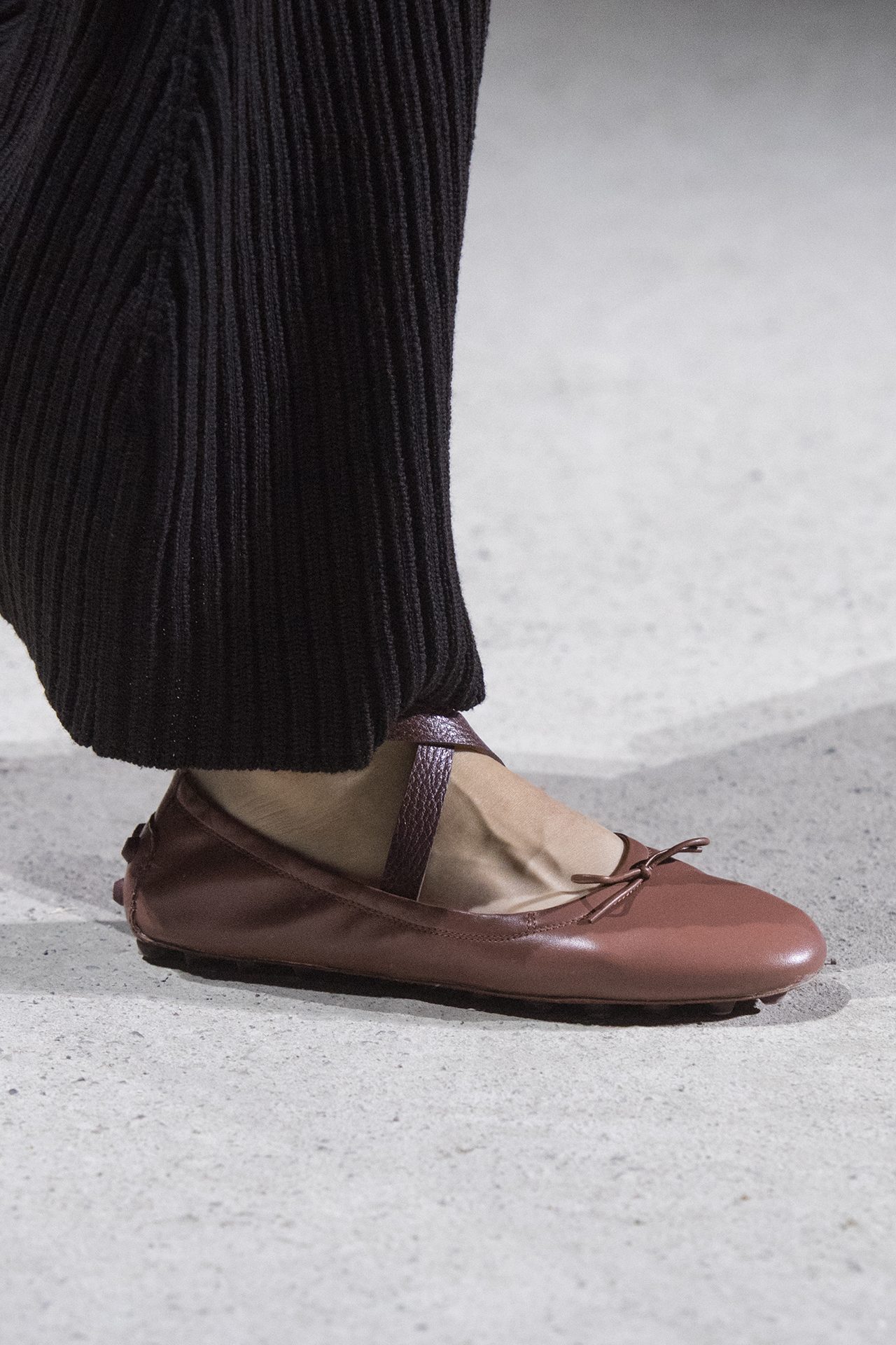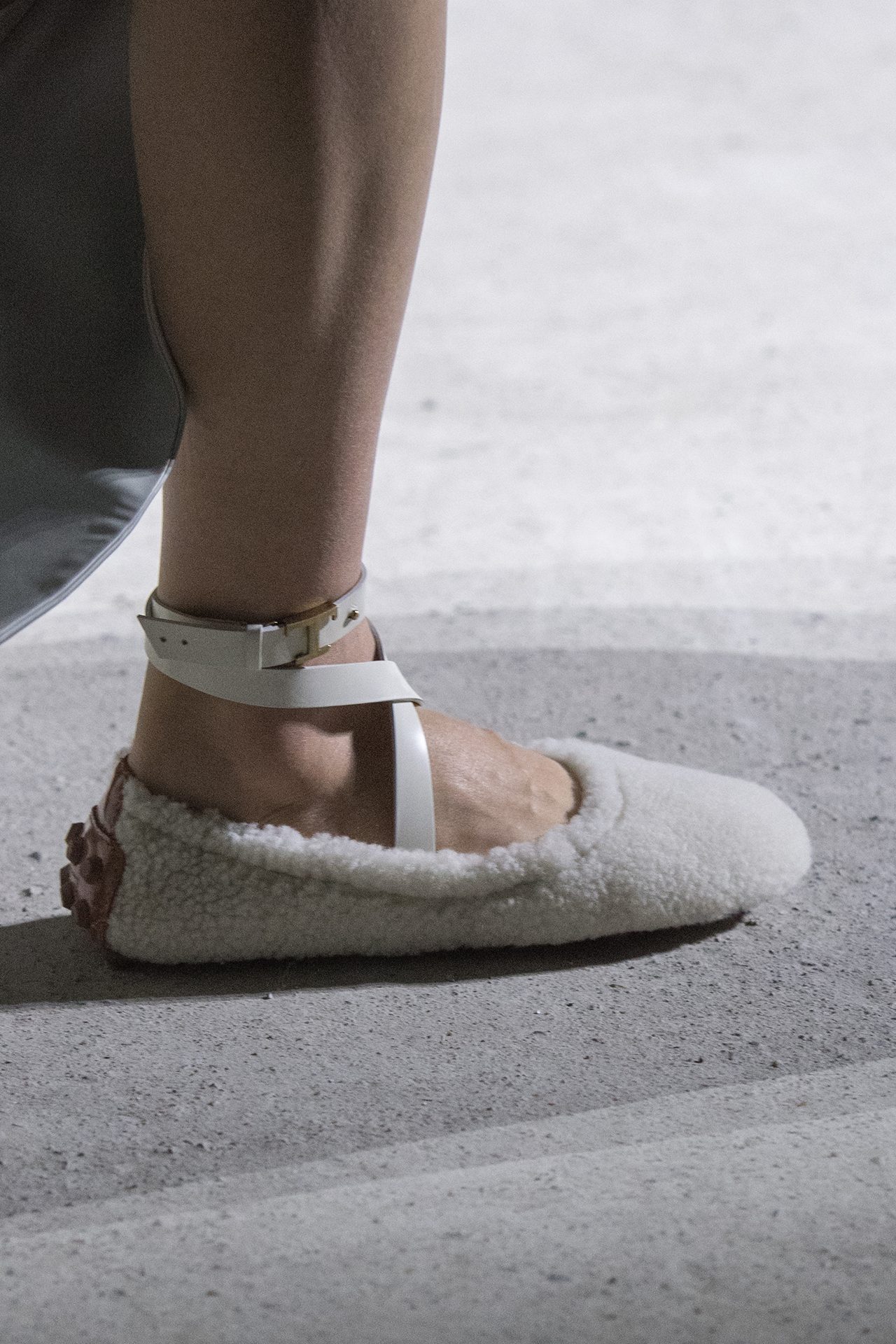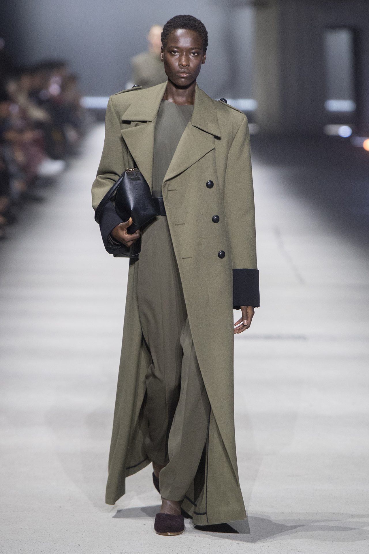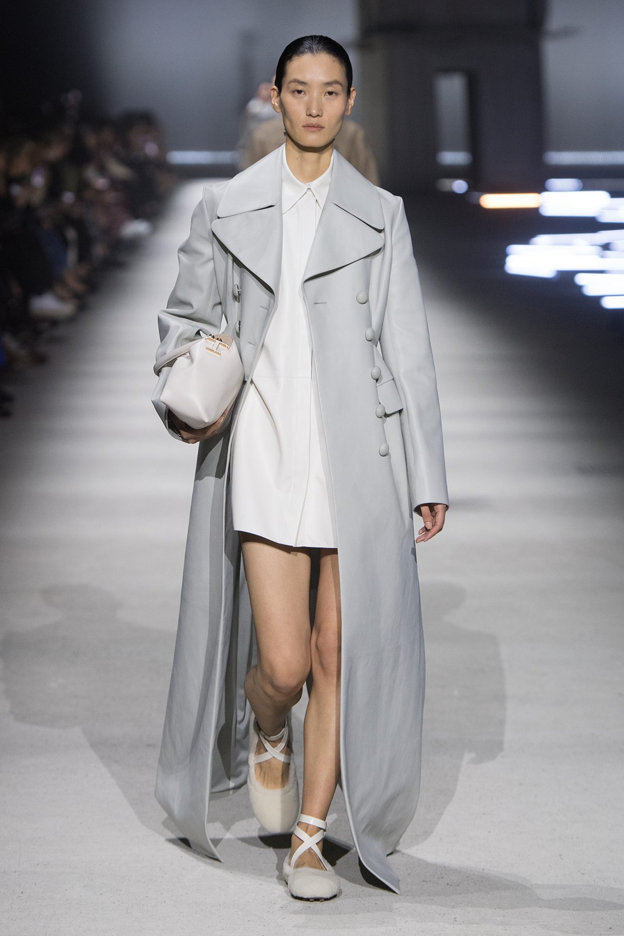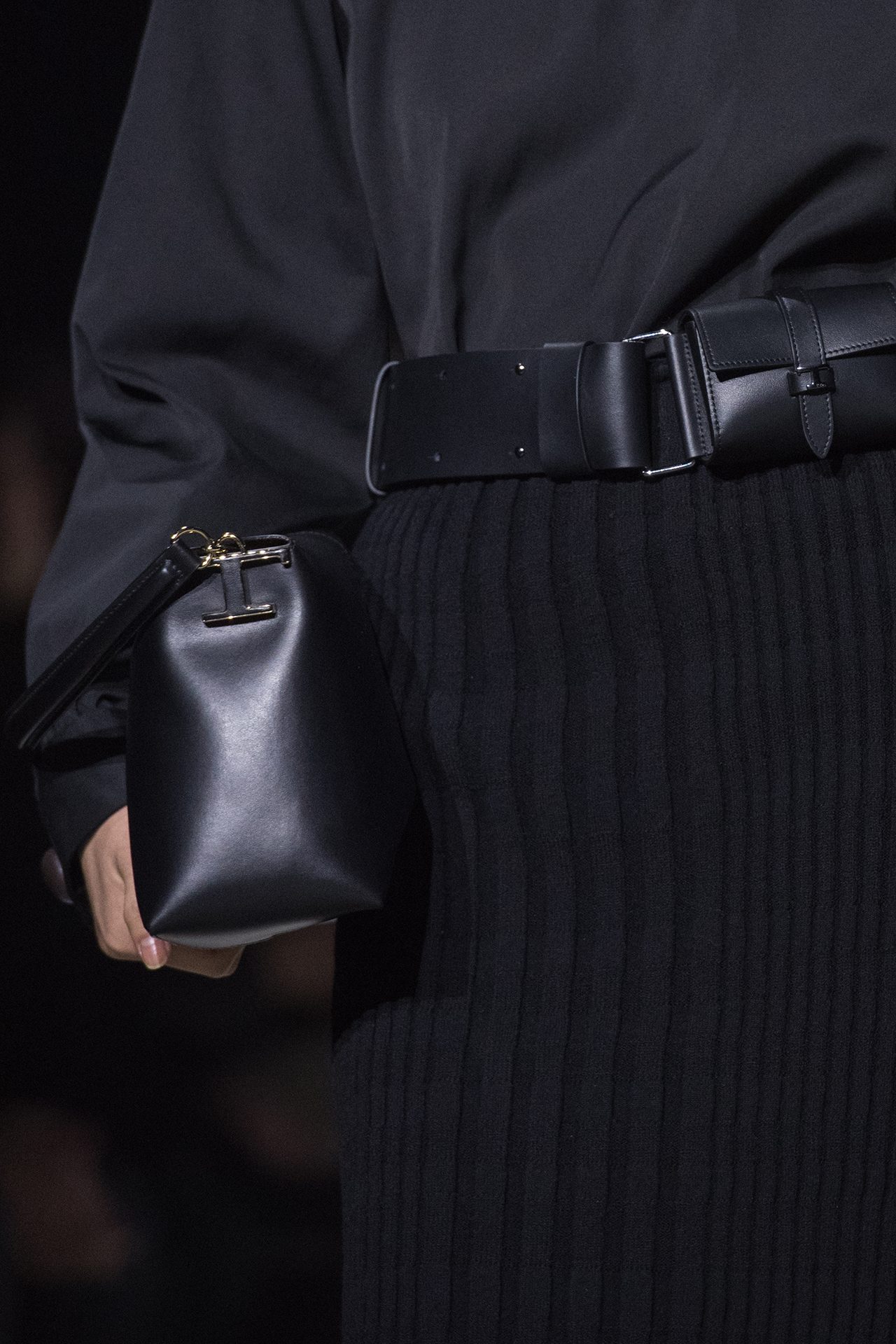 天然素材のファブリックのみが使用され、キャメル、ブラウン、クリームといった暖色系から、ブラックとホワイトのモノトーンまでのカラーパレットで統一された本コレクション。TOD’S のアイコニックなペブルモチーフを想わせる、革のくるみボタンが付いたピーコート、シアリングのディテールが加えられたショート丈のボンバージャケットや、エレガントなパデッドジャケットなど、希少な素材が用いられたアウターが登場。フェミニンなニットウェアとは反対に、マスキュリンなスーツは、構築的なシャツと合わせてお披露目された。