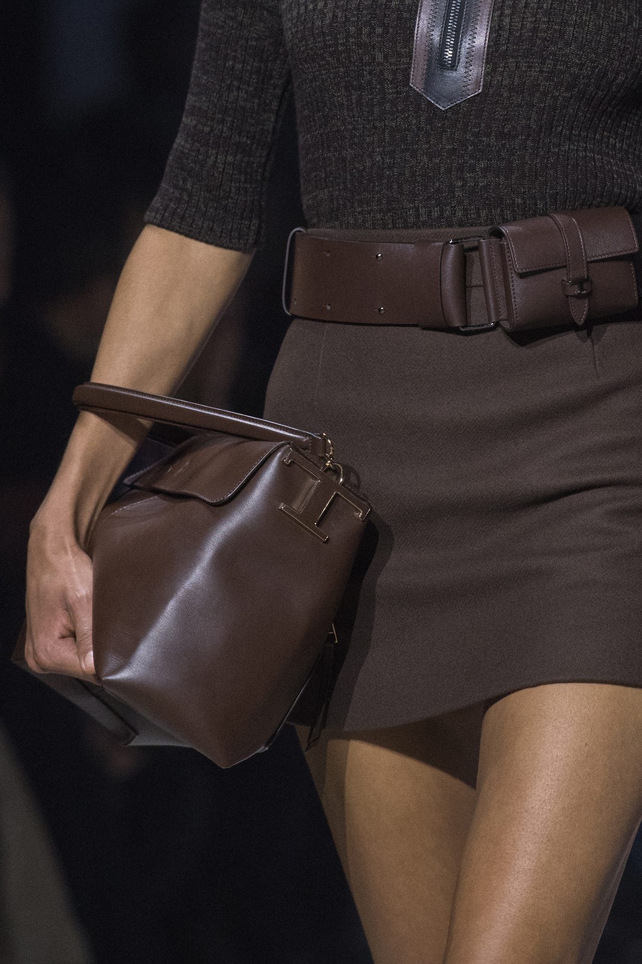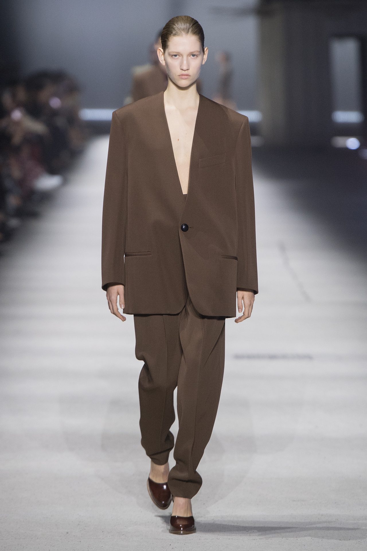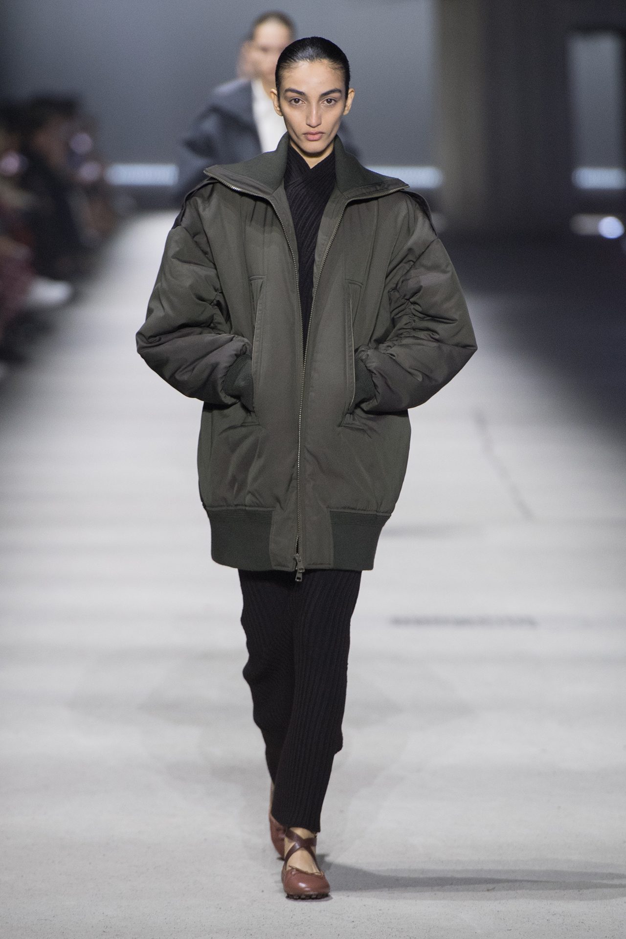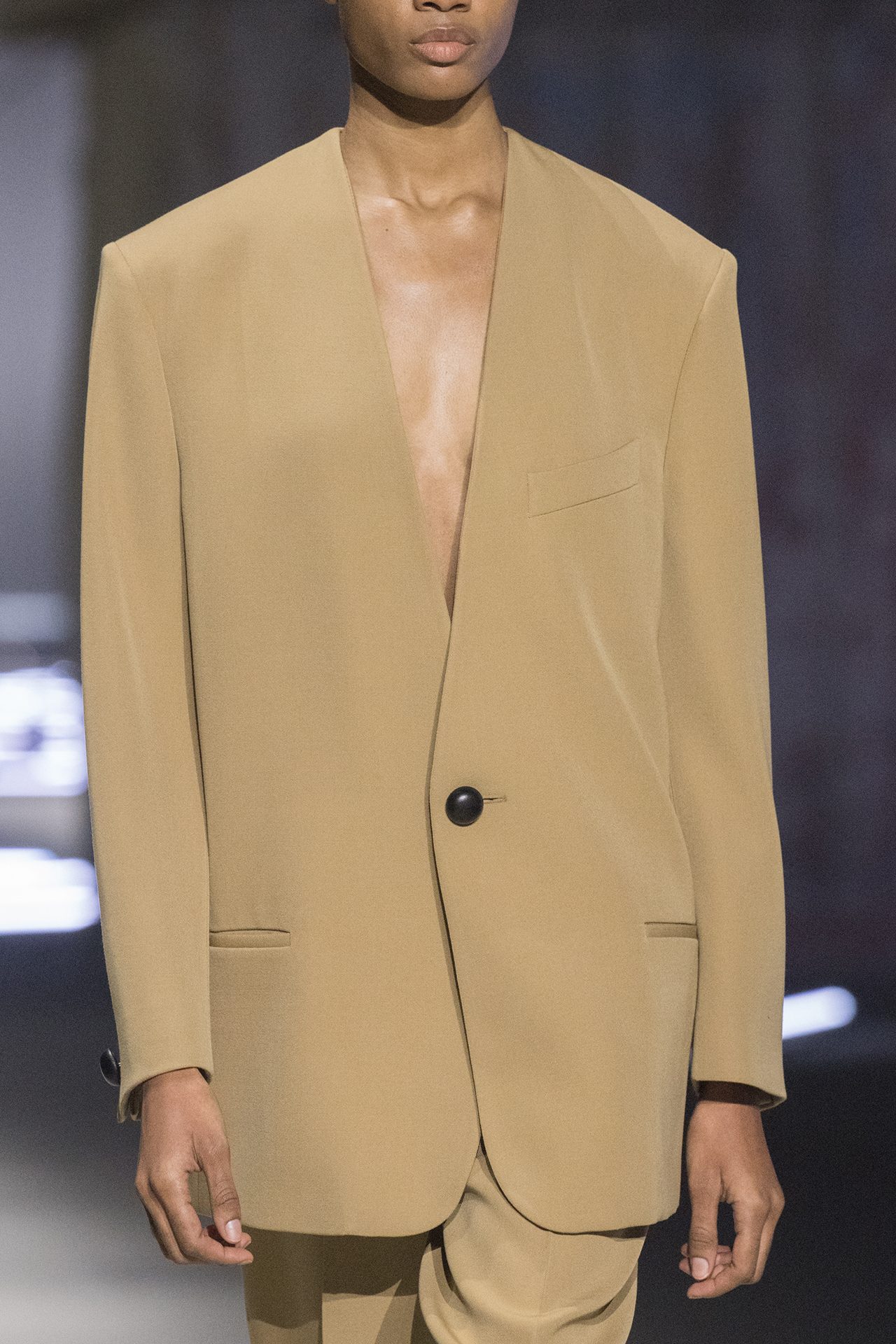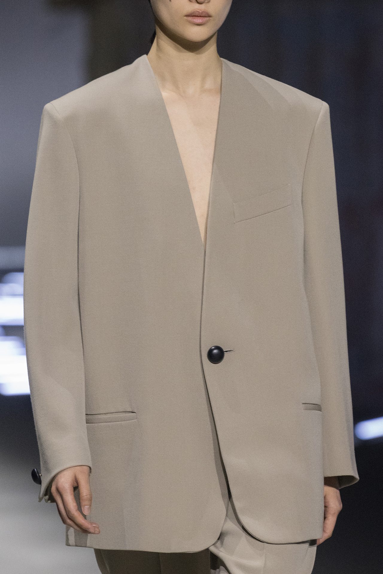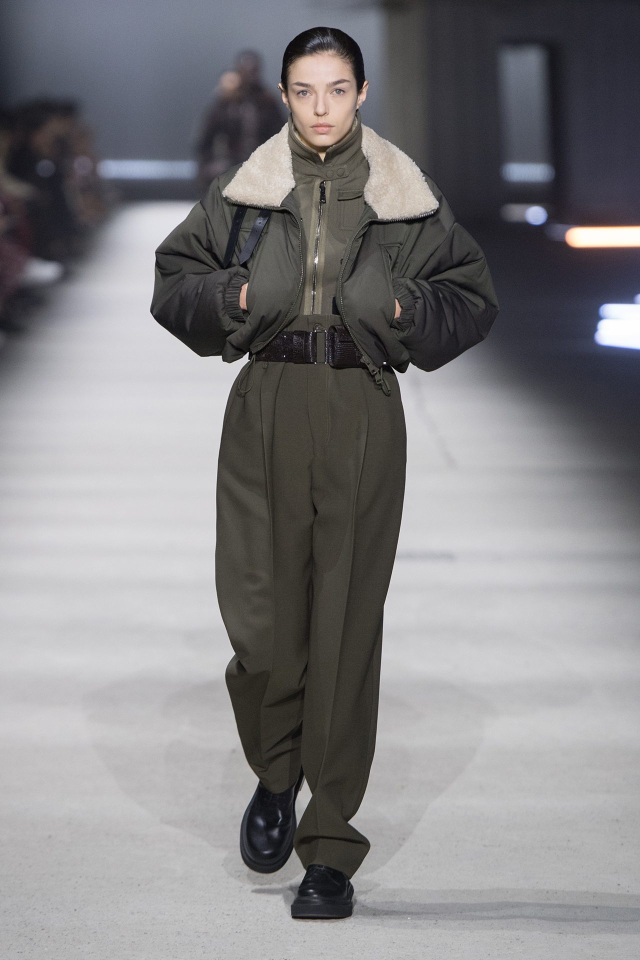 天然素材のファブリックのみが使用され、キャメル、ブラウン、クリームといった暖色系から、ブラックとホワイトのモノトーンまでのカラーパレットで統一された本コレクション。TOD’S のアイコニックなペブルモチーフを想わせる、革のくるみボタンが付いたピーコート、シアリングのディテールが加えられたショート丈のボンバージャケットや、エレガントなパデッドジャケットなど、希少な素材が用いられたアウターが登場。フェミニンなニットウェアとは反対に、マスキュリンなスーツは、構築的なシャツと合わせてお披露目された。