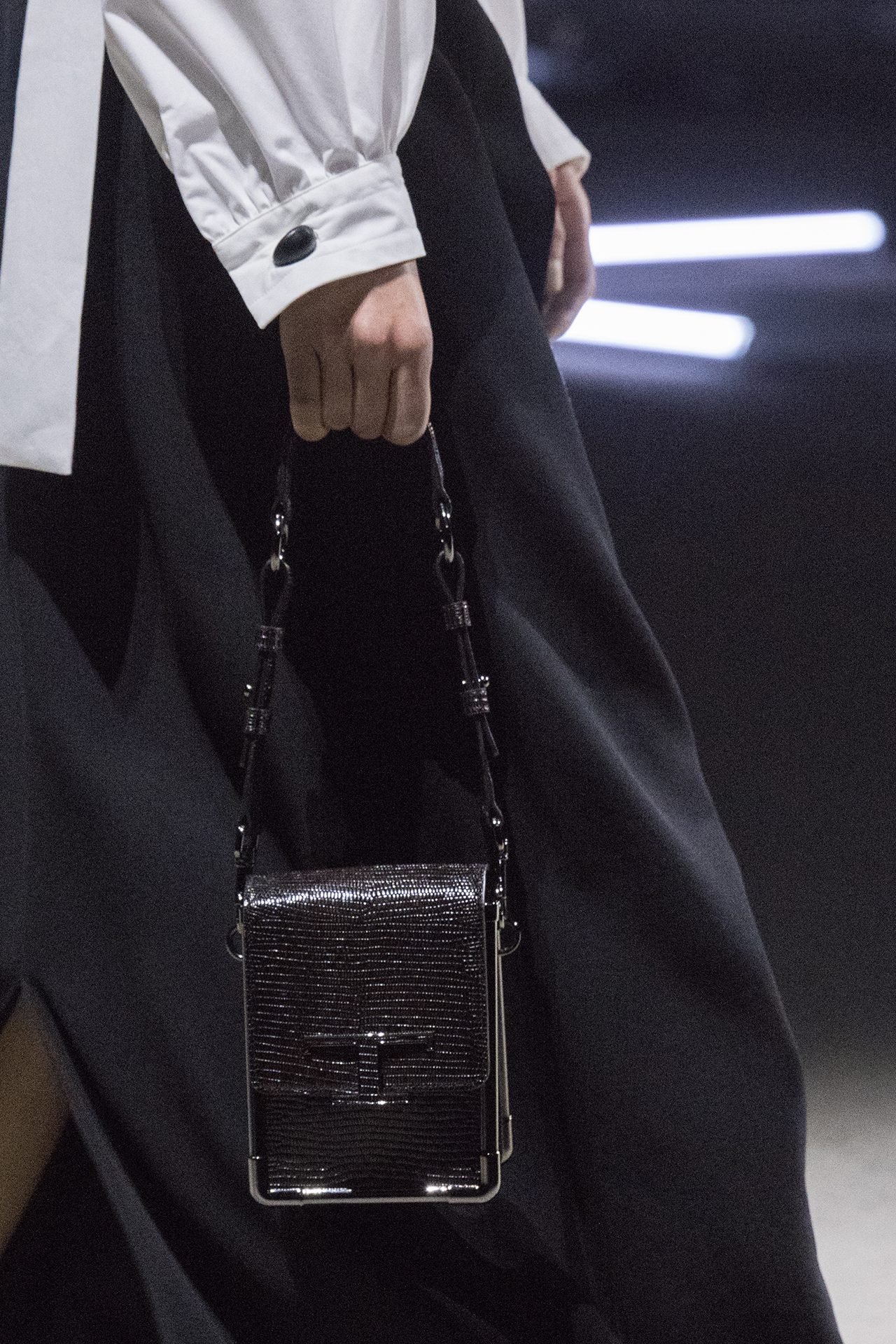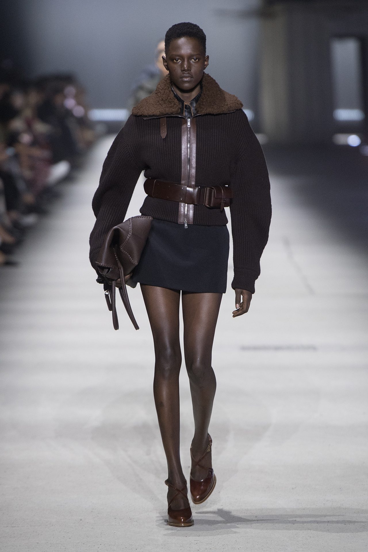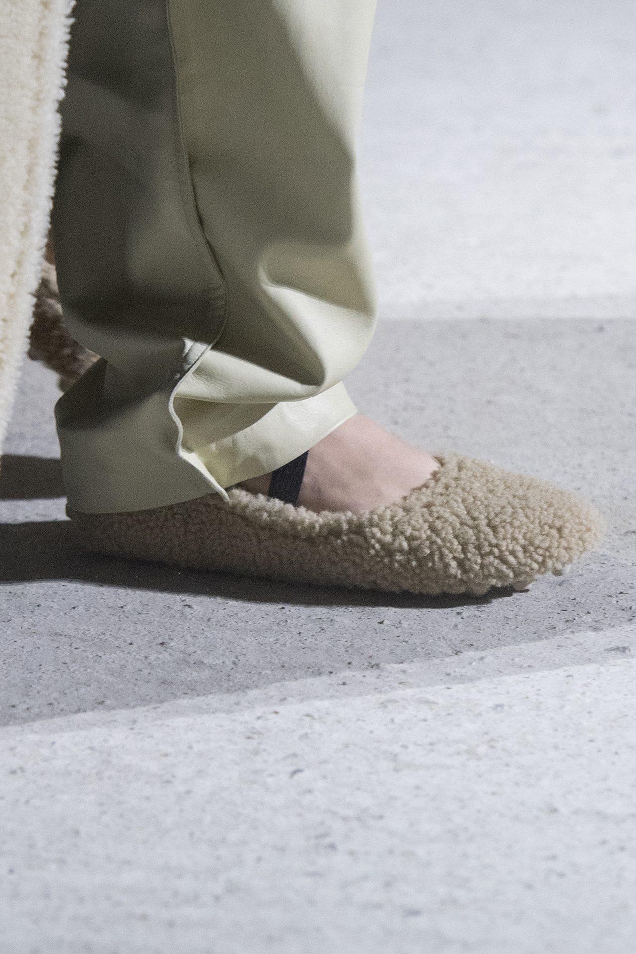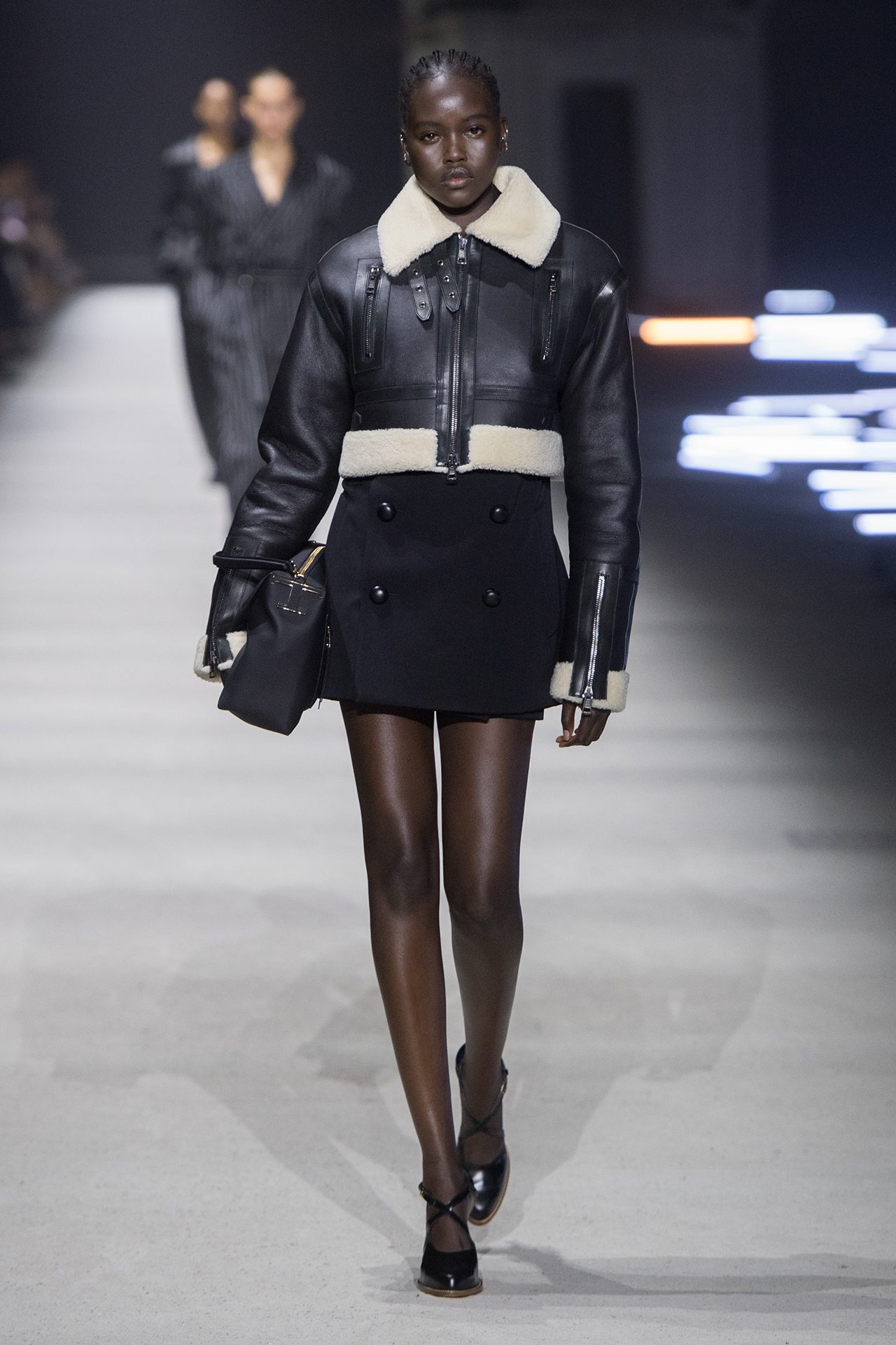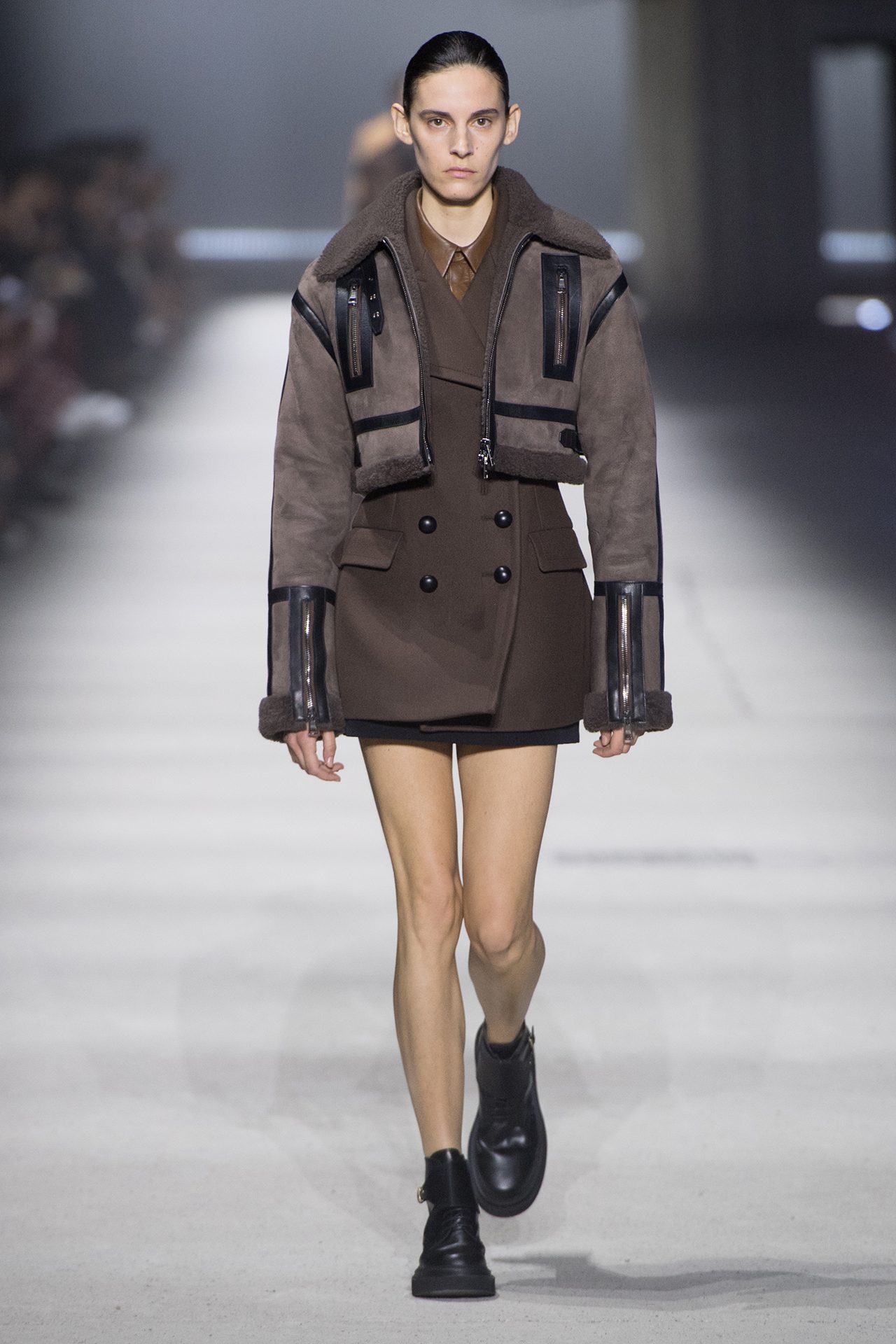 天然素材のファブリックのみが使用され、キャメル、ブラウン、クリームといった暖色系から、ブラックとホワイトのモノトーンまでのカラーパレットで統一された本コレクション。TOD’S のアイコニックなペブルモチーフを想わせる、革のくるみボタンが付いたピーコート、シアリングのディテールが加えられたショート丈のボンバージャケットや、エレガントなパデッドジャケットなど、希少な素材が用いられたアウターが登場。フェミニンなニットウェアとは反対に、マスキュリンなスーツは、構築的なシャツと合わせてお披露目された。