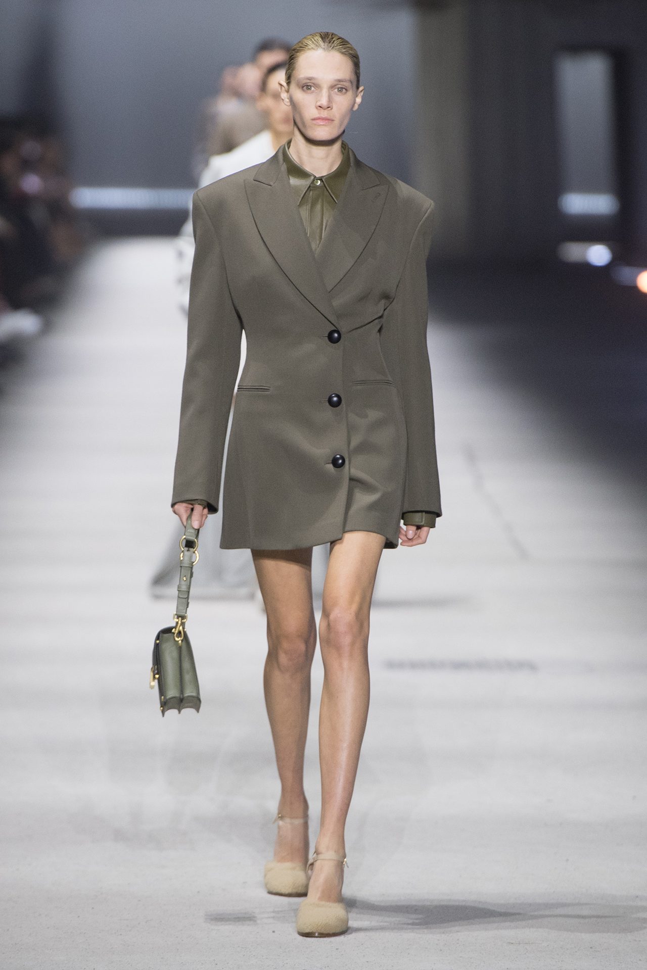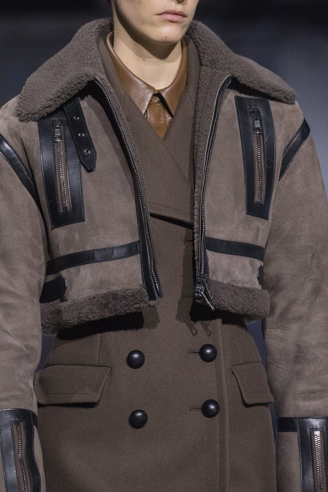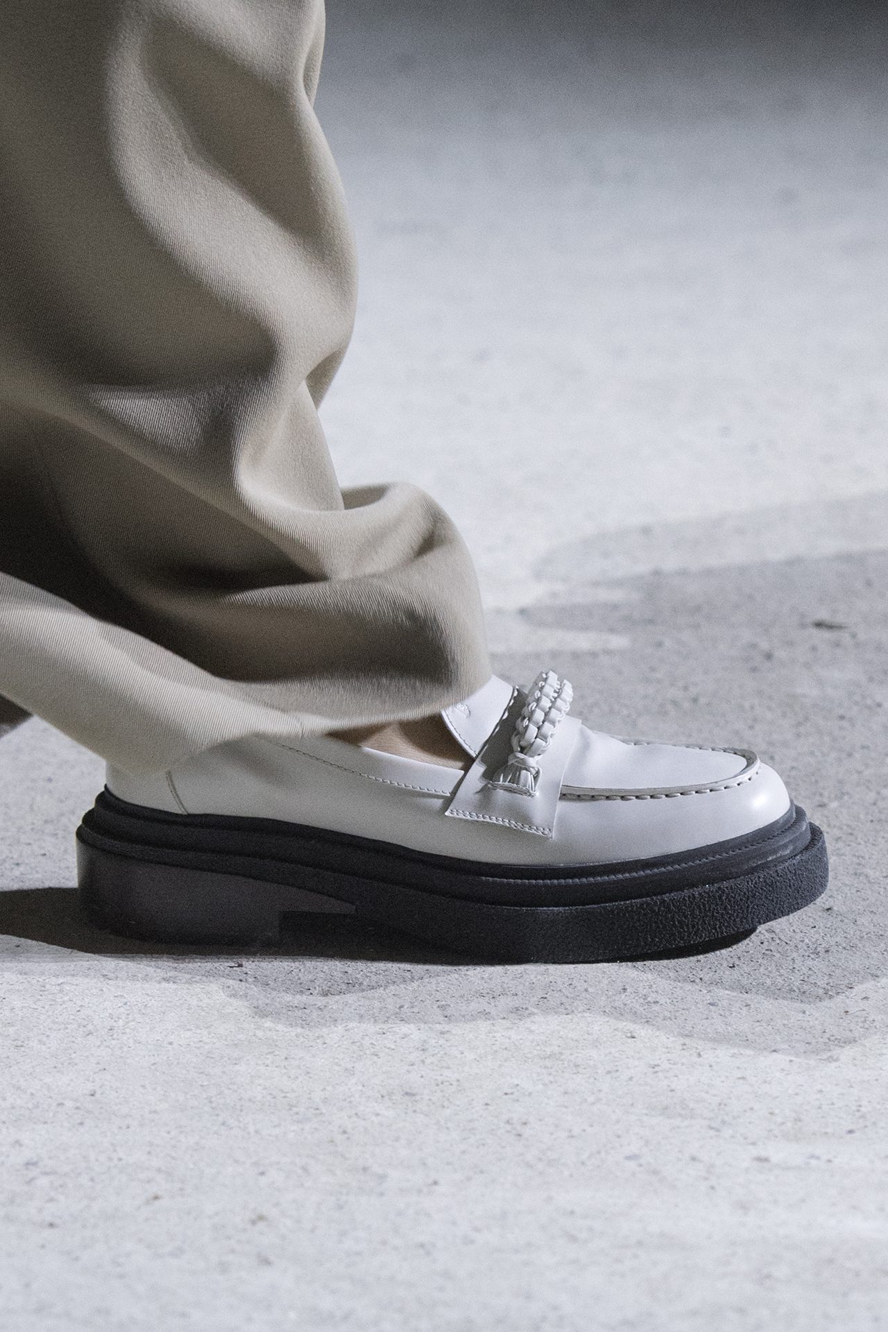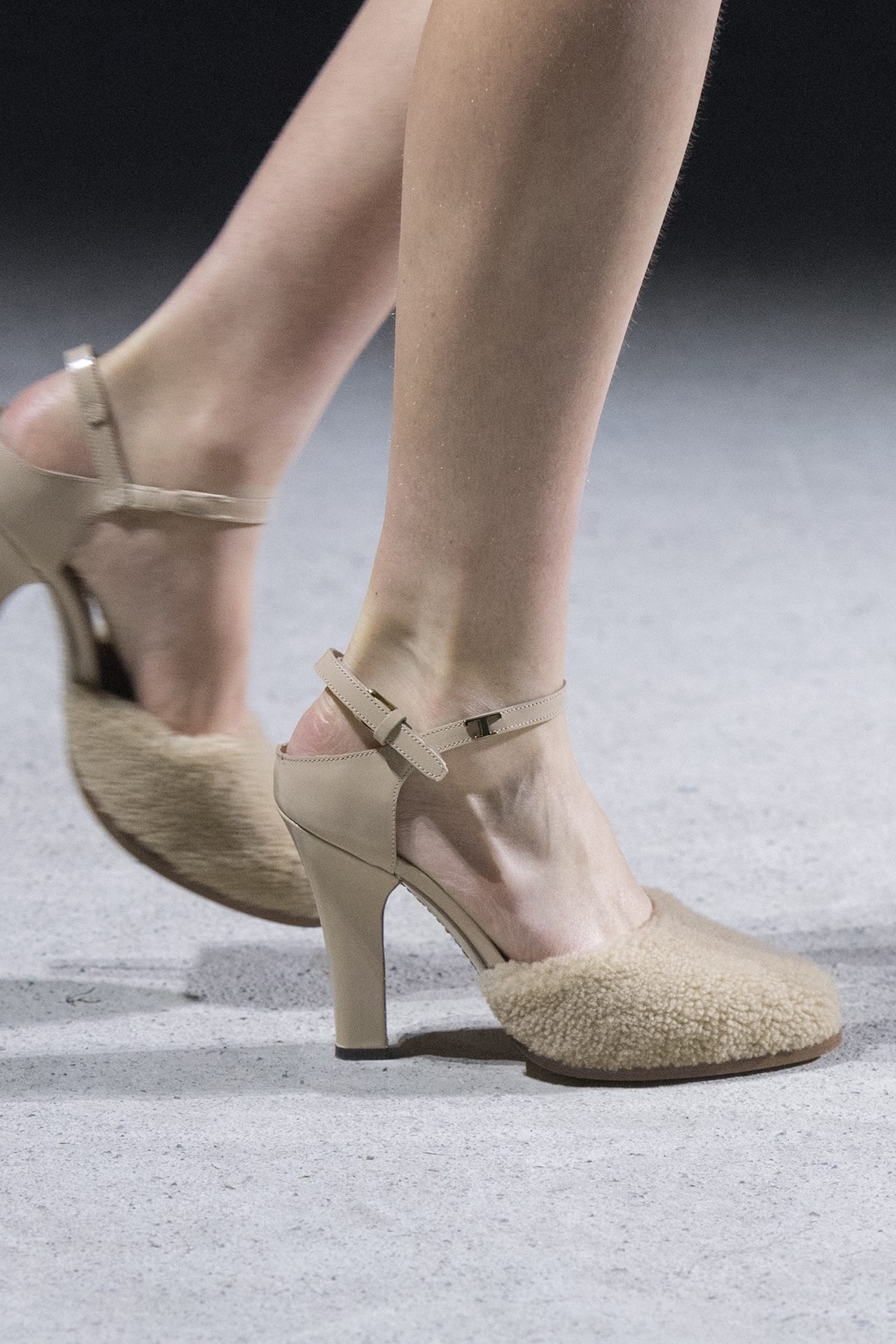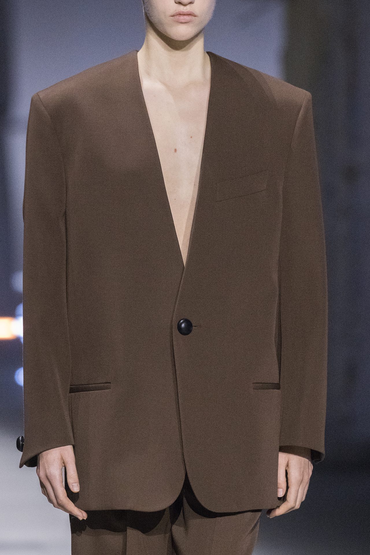 天然素材のファブリックのみが使用され、キャメル、ブラウン、クリームといった暖色系から、ブラックとホワイトのモノトーンまでのカラーパレットで統一された本コレクション。TOD’S のアイコニックなペブルモチーフを想わせる、革のくるみボタンが付いたピーコート、シアリングのディテールが加えられたショート丈のボンバージャケットや、エレガントなパデッドジャケットなど、希少な素材が用いられたアウターが登場。フェミニンなニットウェアとは反対に、マスキュリンなスーツは、構築的なシャツと合わせてお披露目された。