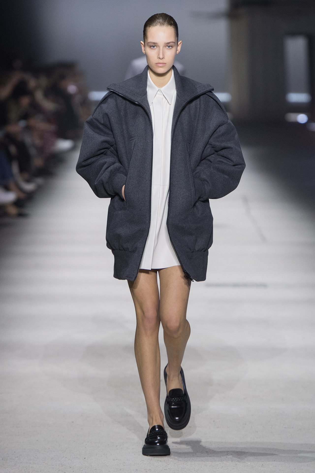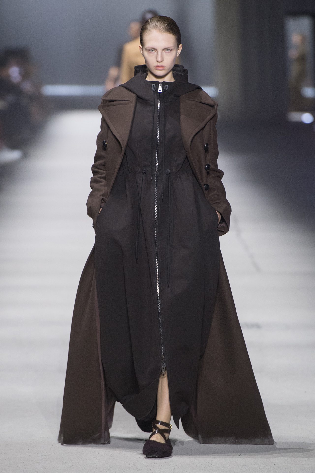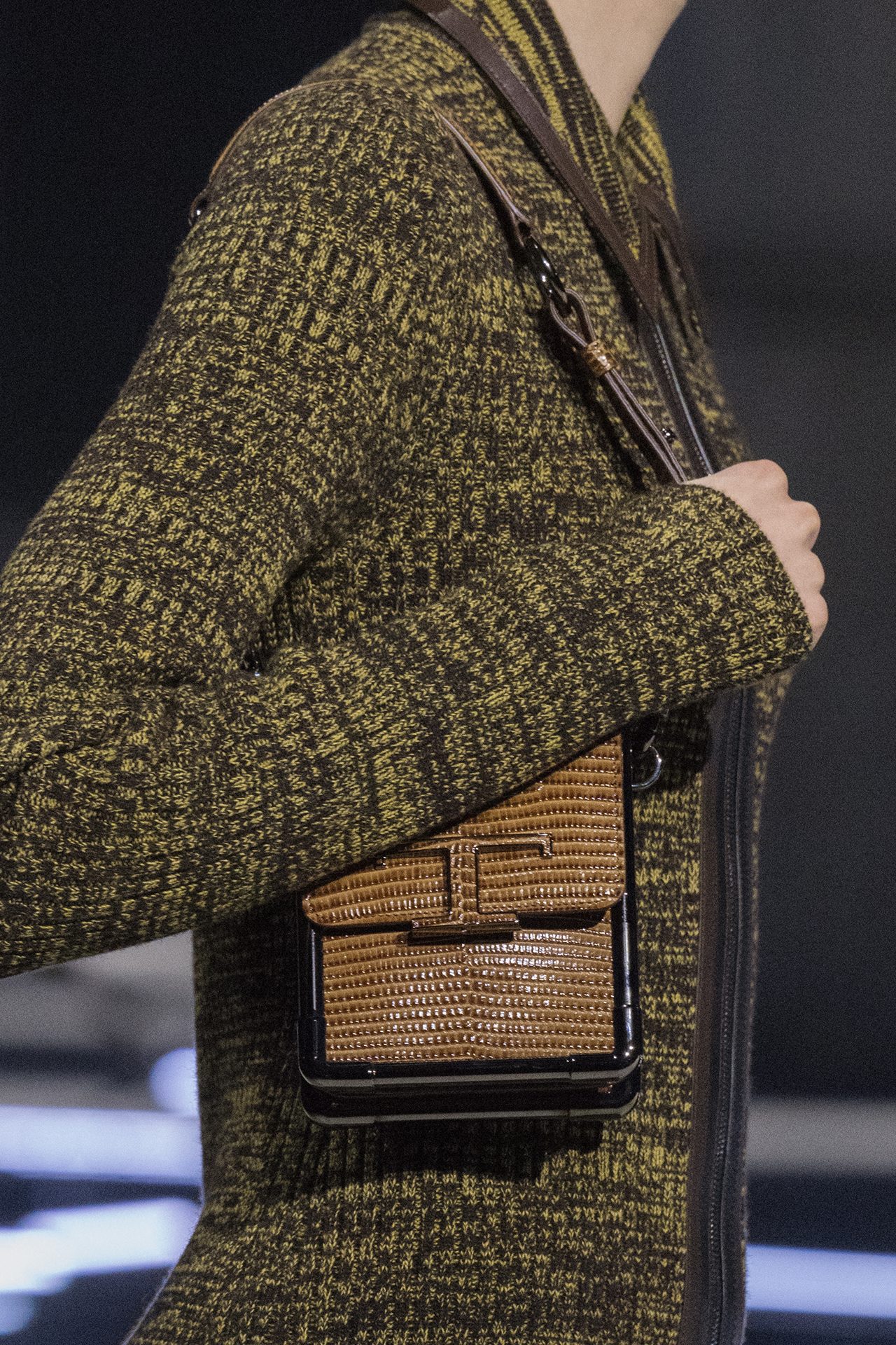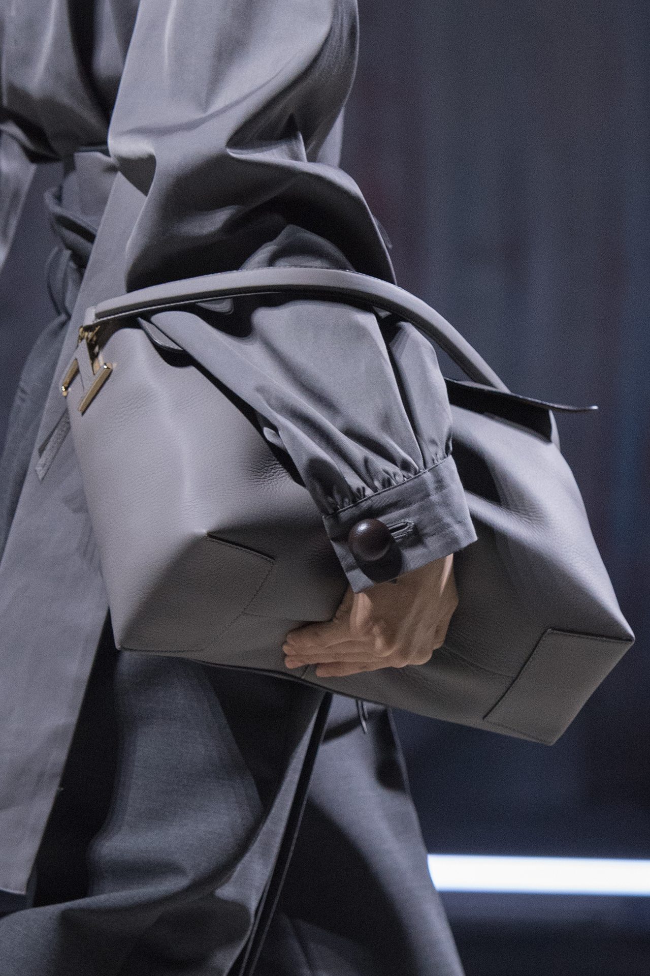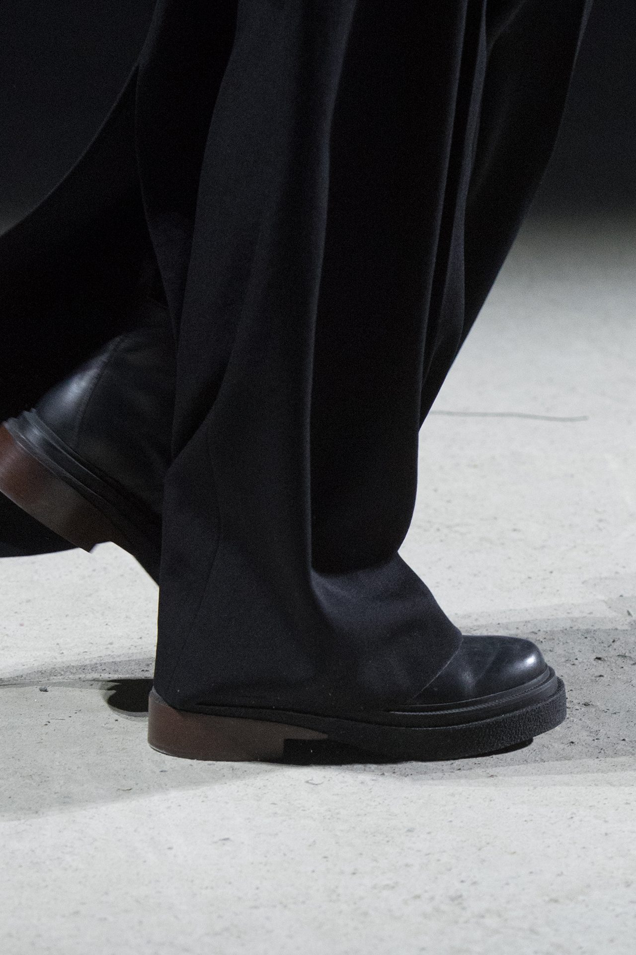 天然素材のファブリックのみが使用され、キャメル、ブラウン、クリームといった暖色系から、ブラックとホワイトのモノトーンまでのカラーパレットで統一された本コレクション。TOD’S のアイコニックなペブルモチーフを想わせる、革のくるみボタンが付いたピーコート、シアリングのディテールが加えられたショート丈のボンバージャケットや、エレガントなパデッドジャケットなど、希少な素材が用いられたアウターが登場。フェミニンなニットウェアとは反対に、マスキュリンなスーツは、構築的なシャツと合わせてお披露目された。