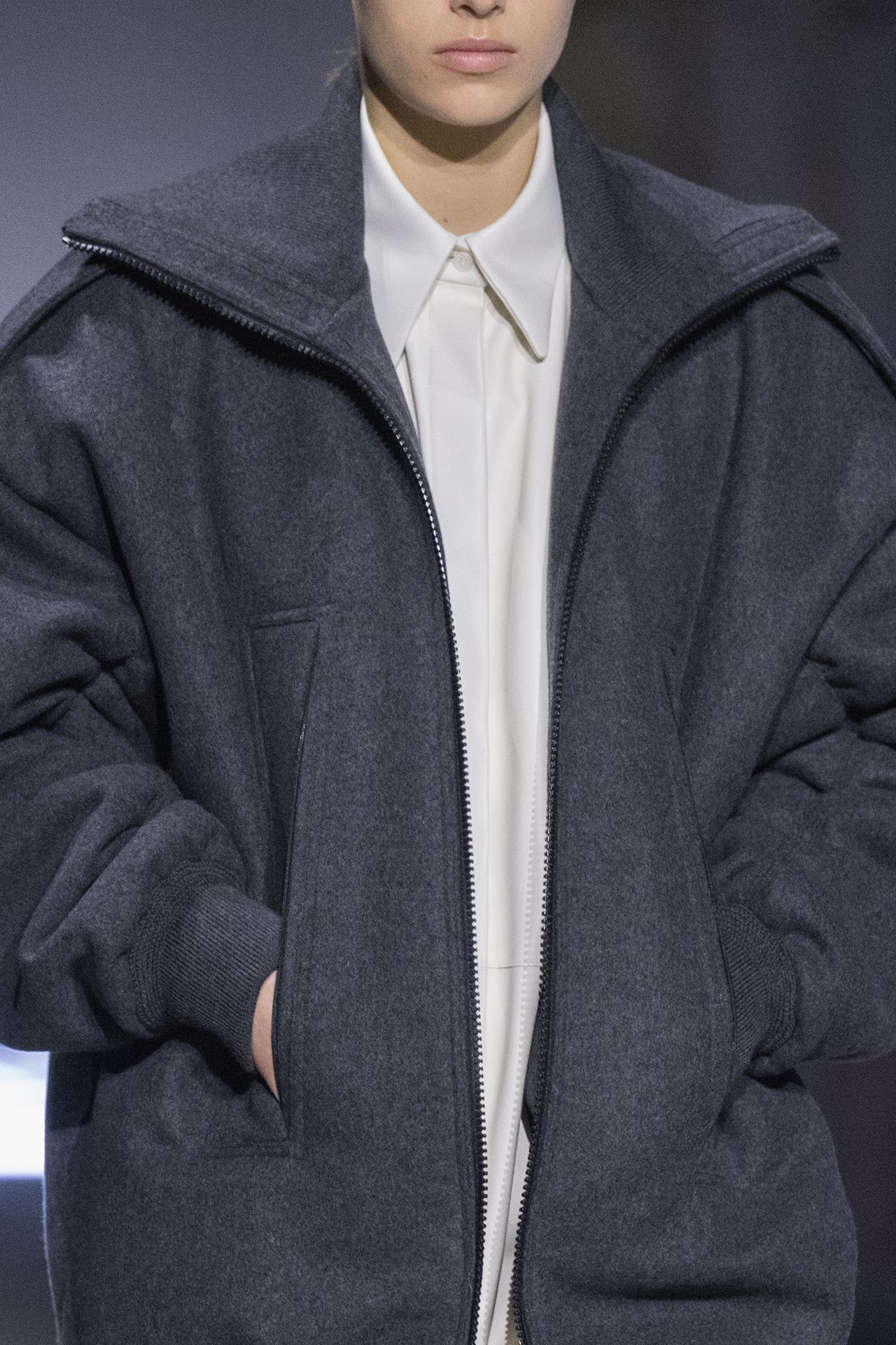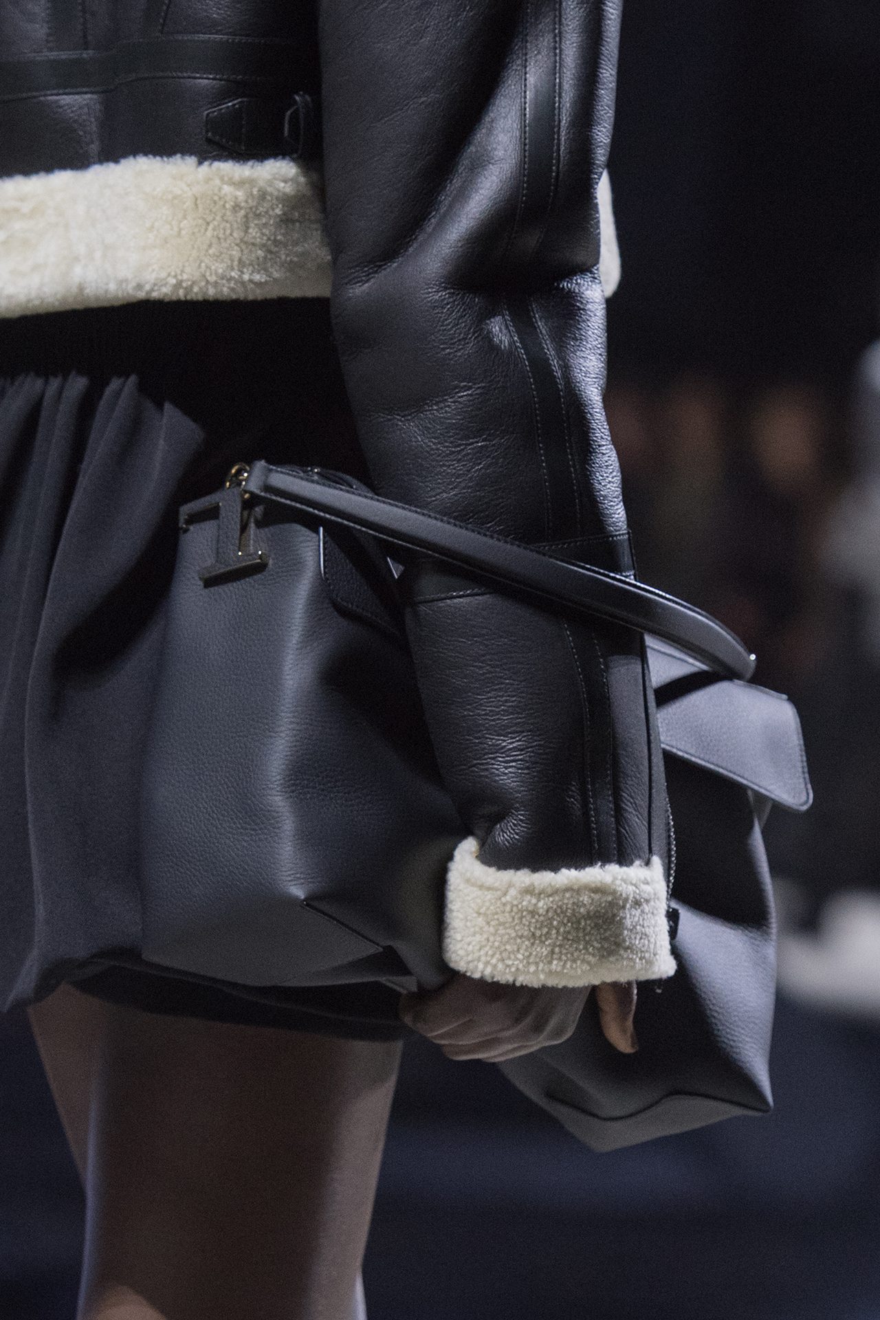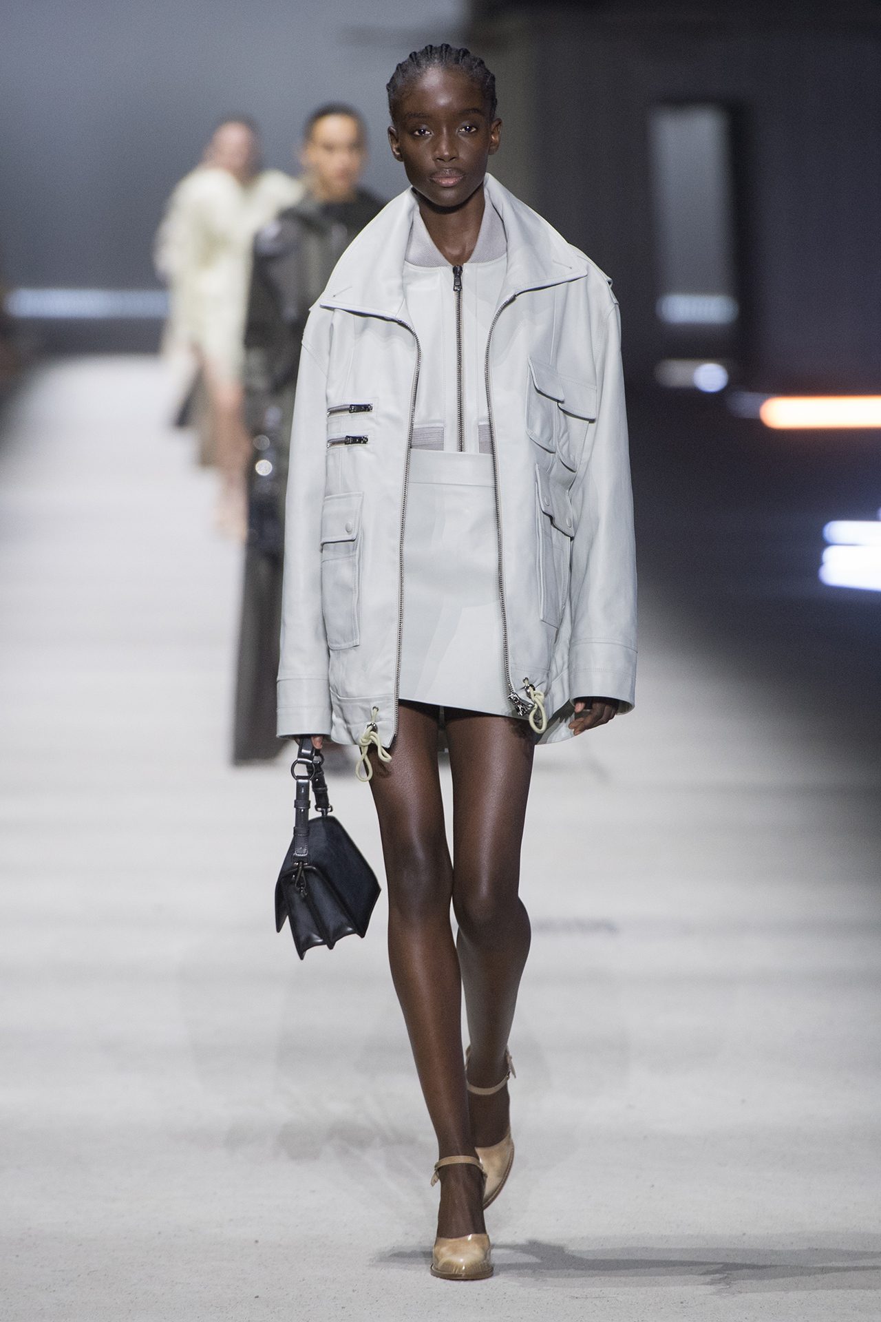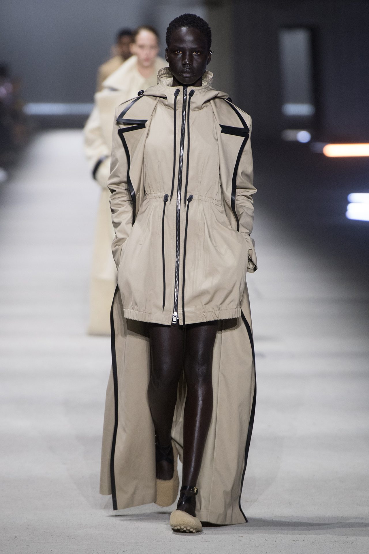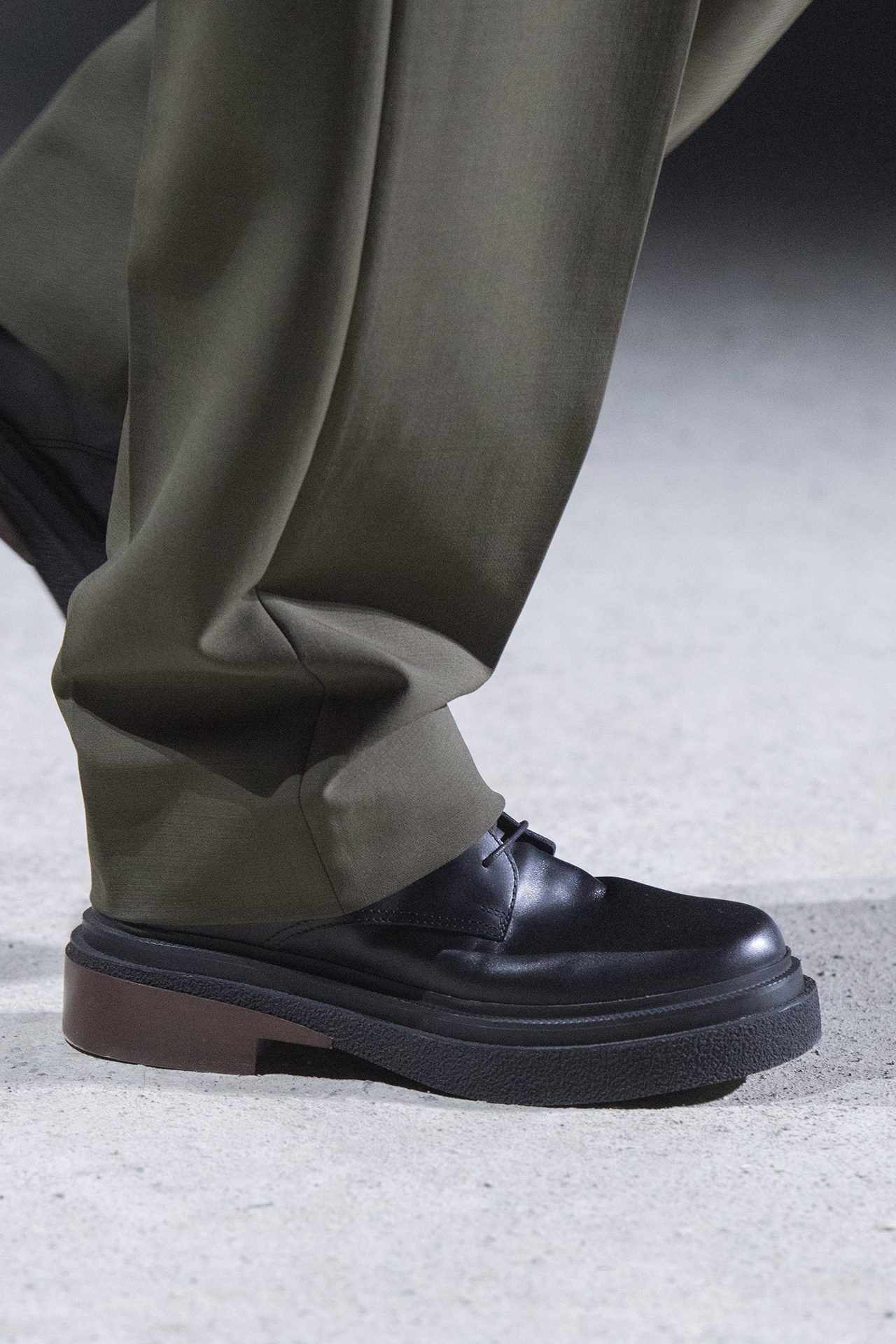 天然素材のファブリックのみが使用され、キャメル、ブラウン、クリームといった暖色系から、ブラックとホワイトのモノトーンまでのカラーパレットで統一された本コレクション。TOD’S のアイコニックなペブルモチーフを想わせる、革のくるみボタンが付いたピーコート、シアリングのディテールが加えられたショート丈のボンバージャケットや、エレガントなパデッドジャケットなど、希少な素材が用いられたアウターが登場。フェミニンなニットウェアとは反対に、マスキュリンなスーツは、構築的なシャツと合わせてお披露目された。