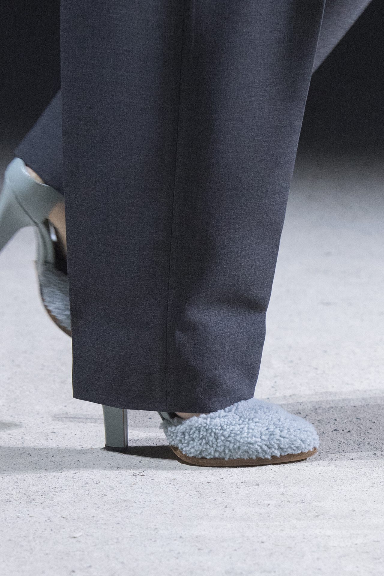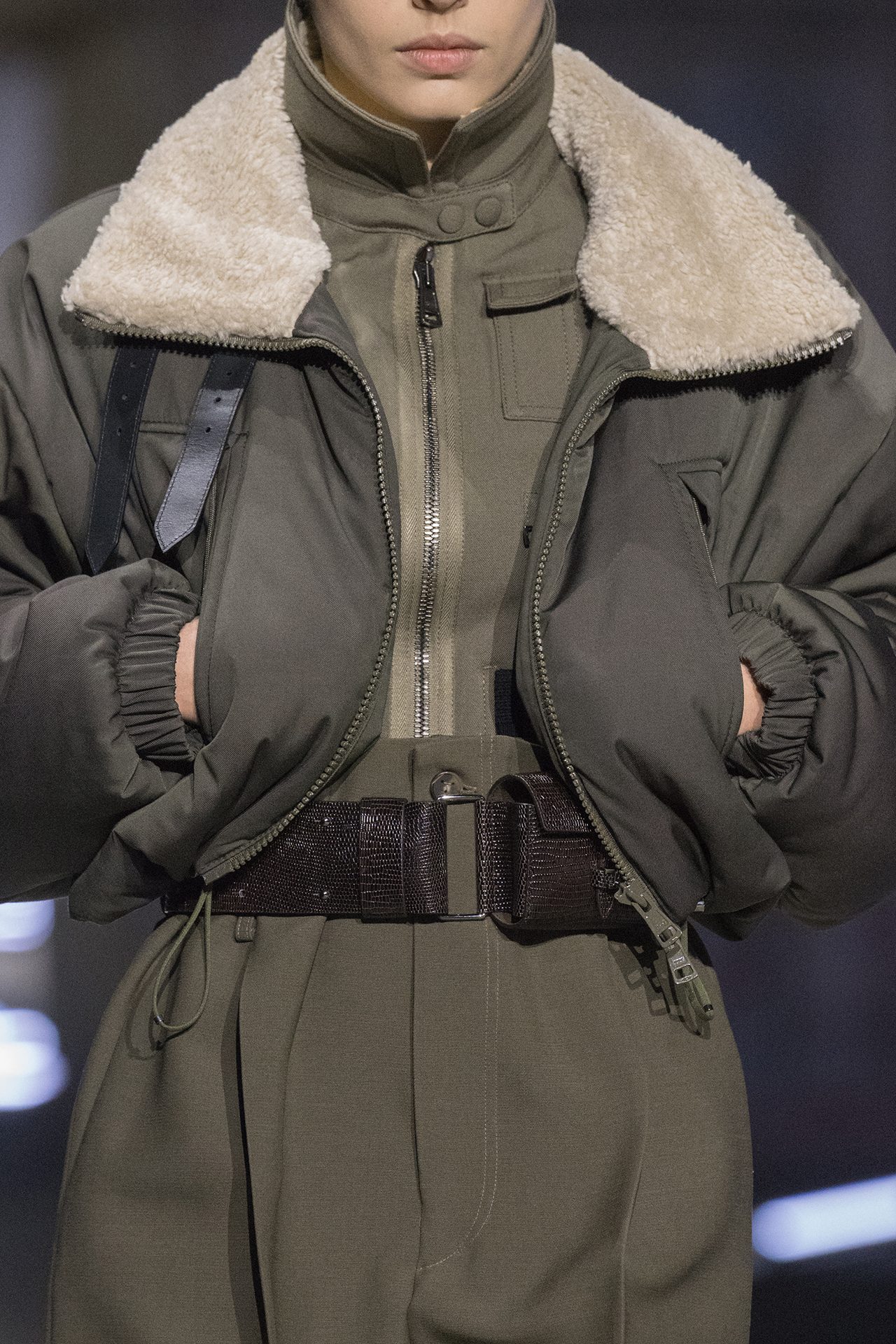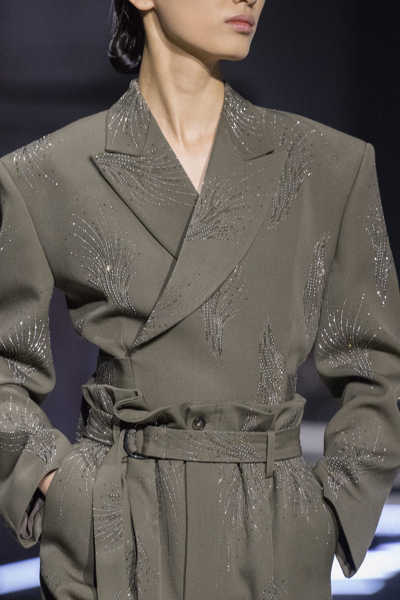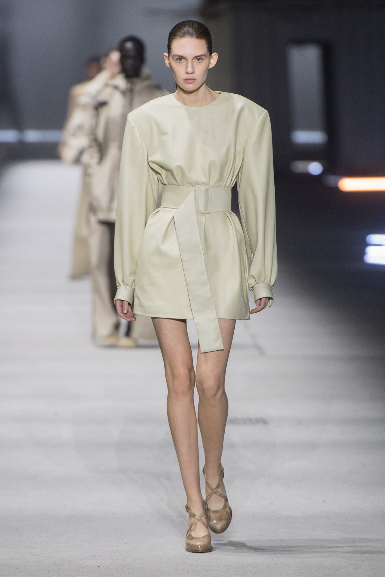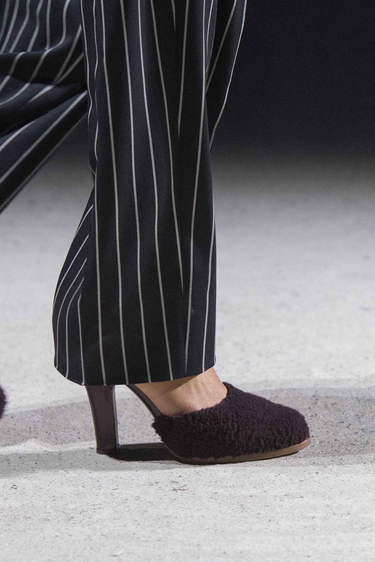 天然素材のファブリックのみが使用され、キャメル、ブラウン、クリームといった暖色系から、ブラックとホワイトのモノトーンまでのカラーパレットで統一された本コレクション。TOD’S のアイコニックなペブルモチーフを想わせる、革のくるみボタンが付いたピーコート、シアリングのディテールが加えられたショート丈のボンバージャケットや、エレガントなパデッドジャケットなど、希少な素材が用いられたアウターが登場。フェミニンなニットウェアとは反対に、マスキュリンなスーツは、構築的なシャツと合わせてお披露目された。