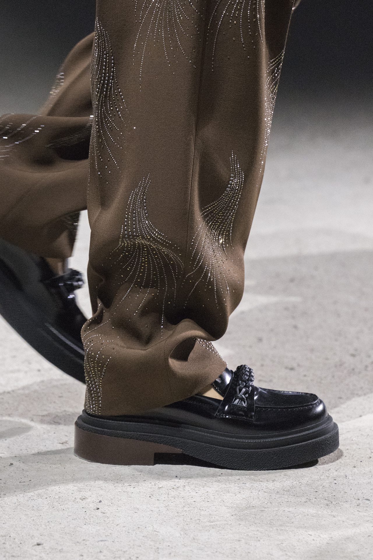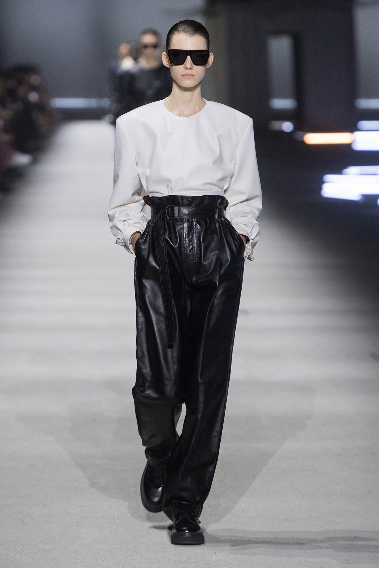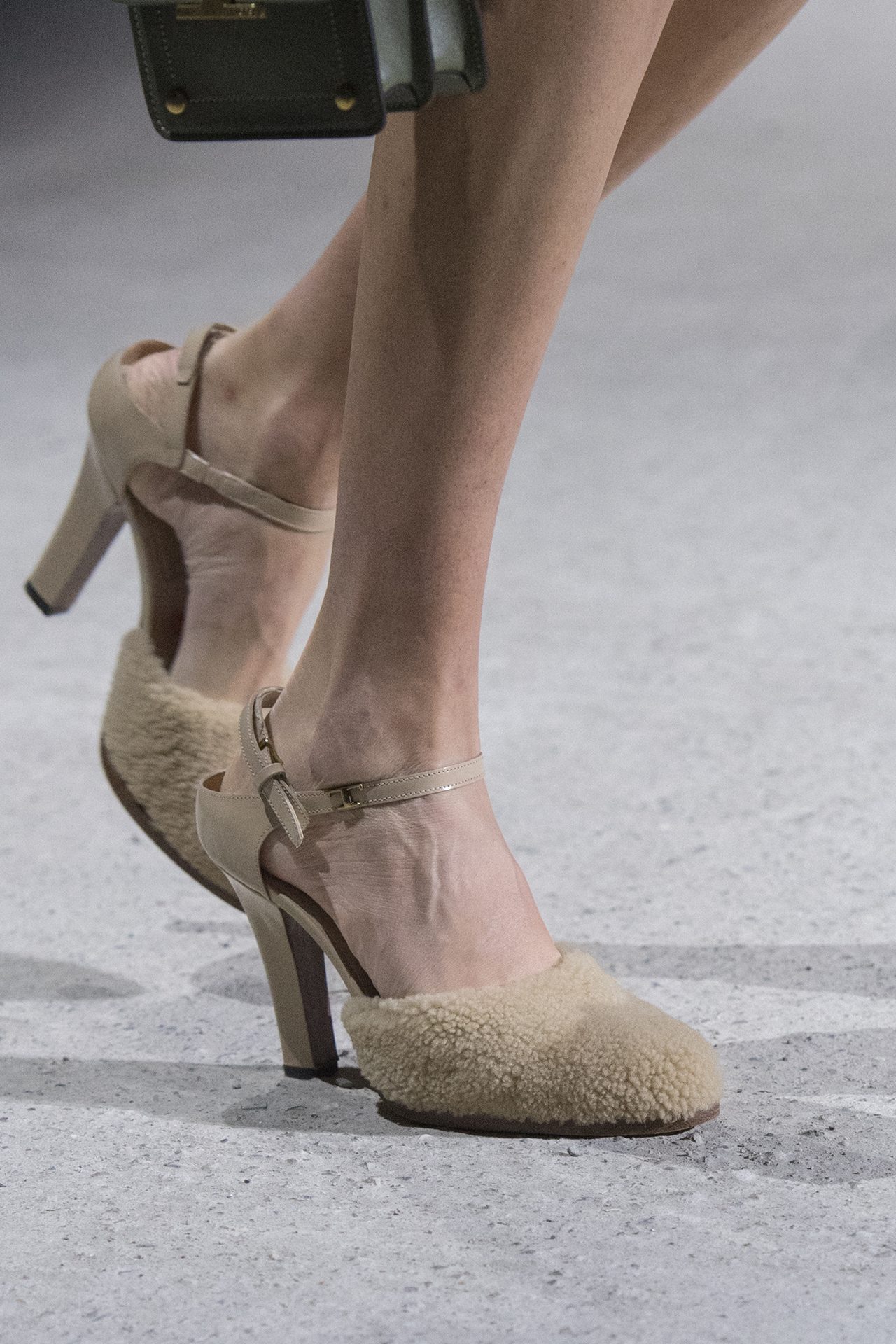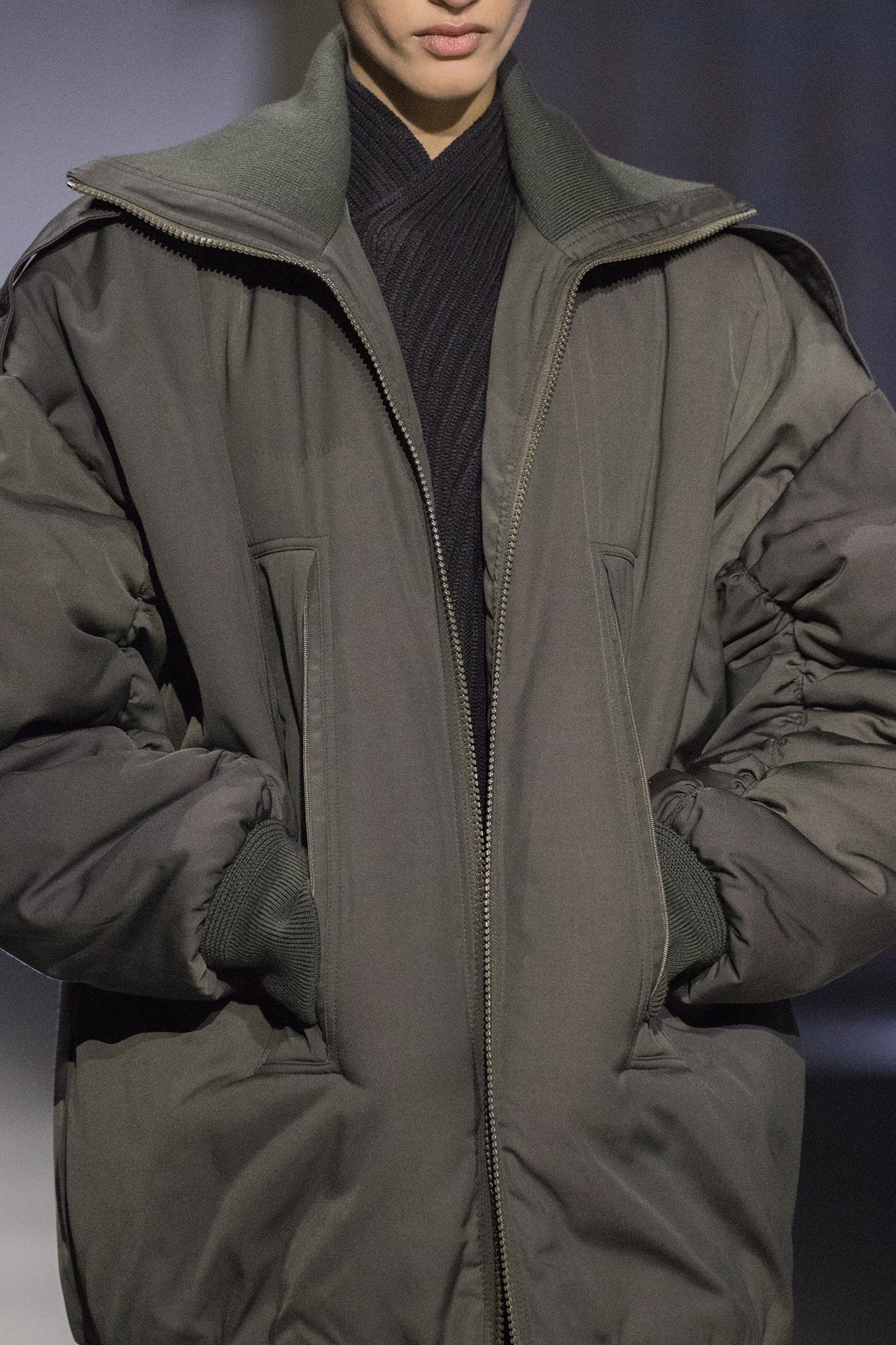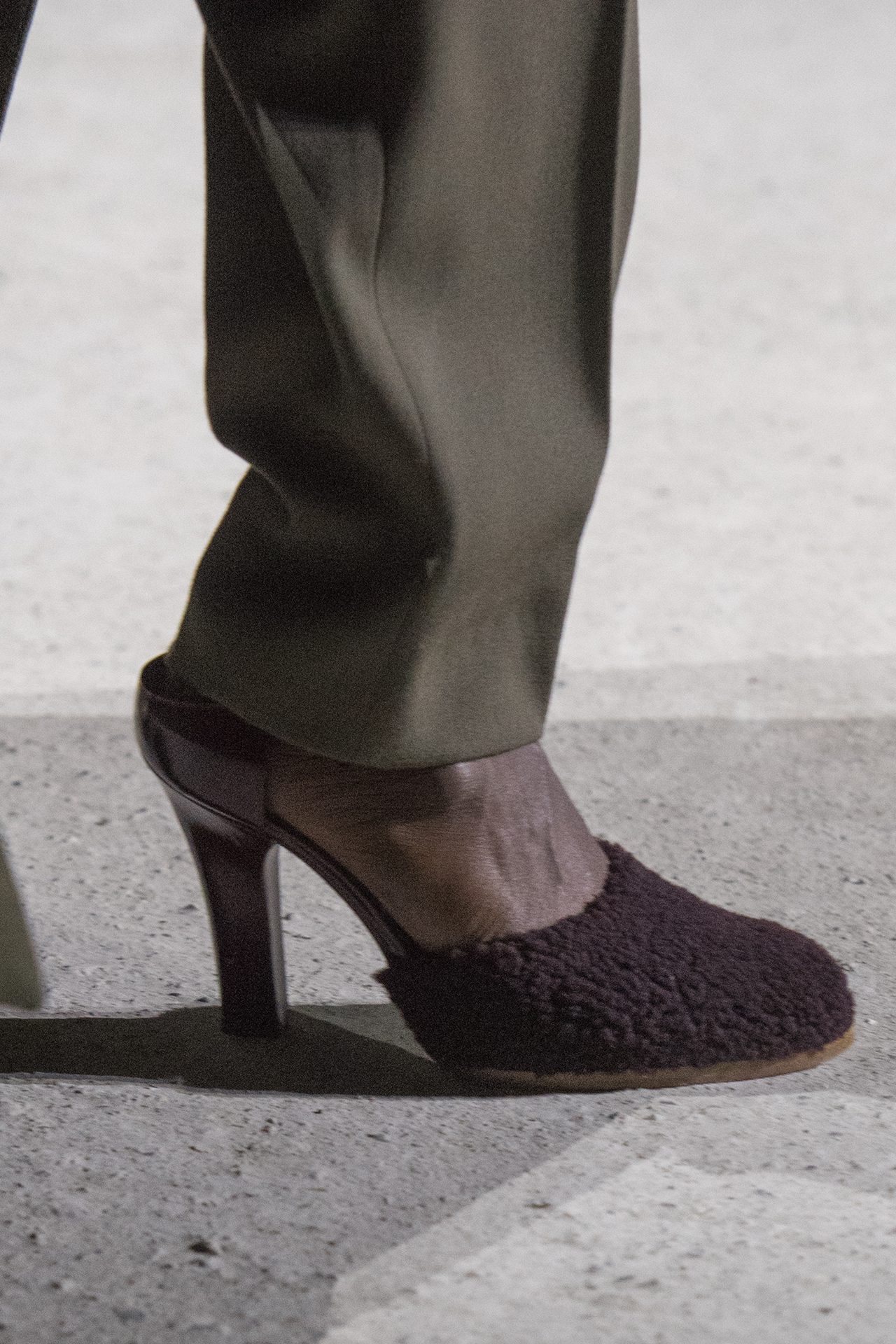 天然素材のファブリックのみが使用され、キャメル、ブラウン、クリームといった暖色系から、ブラックとホワイトのモノトーンまでのカラーパレットで統一された本コレクション。TOD’S のアイコニックなペブルモチーフを想わせる、革のくるみボタンが付いたピーコート、シアリングのディテールが加えられたショート丈のボンバージャケットや、エレガントなパデッドジャケットなど、希少な素材が用いられたアウターが登場。フェミニンなニットウェアとは反対に、マスキュリンなスーツは、構築的なシャツと合わせてお披露目された。