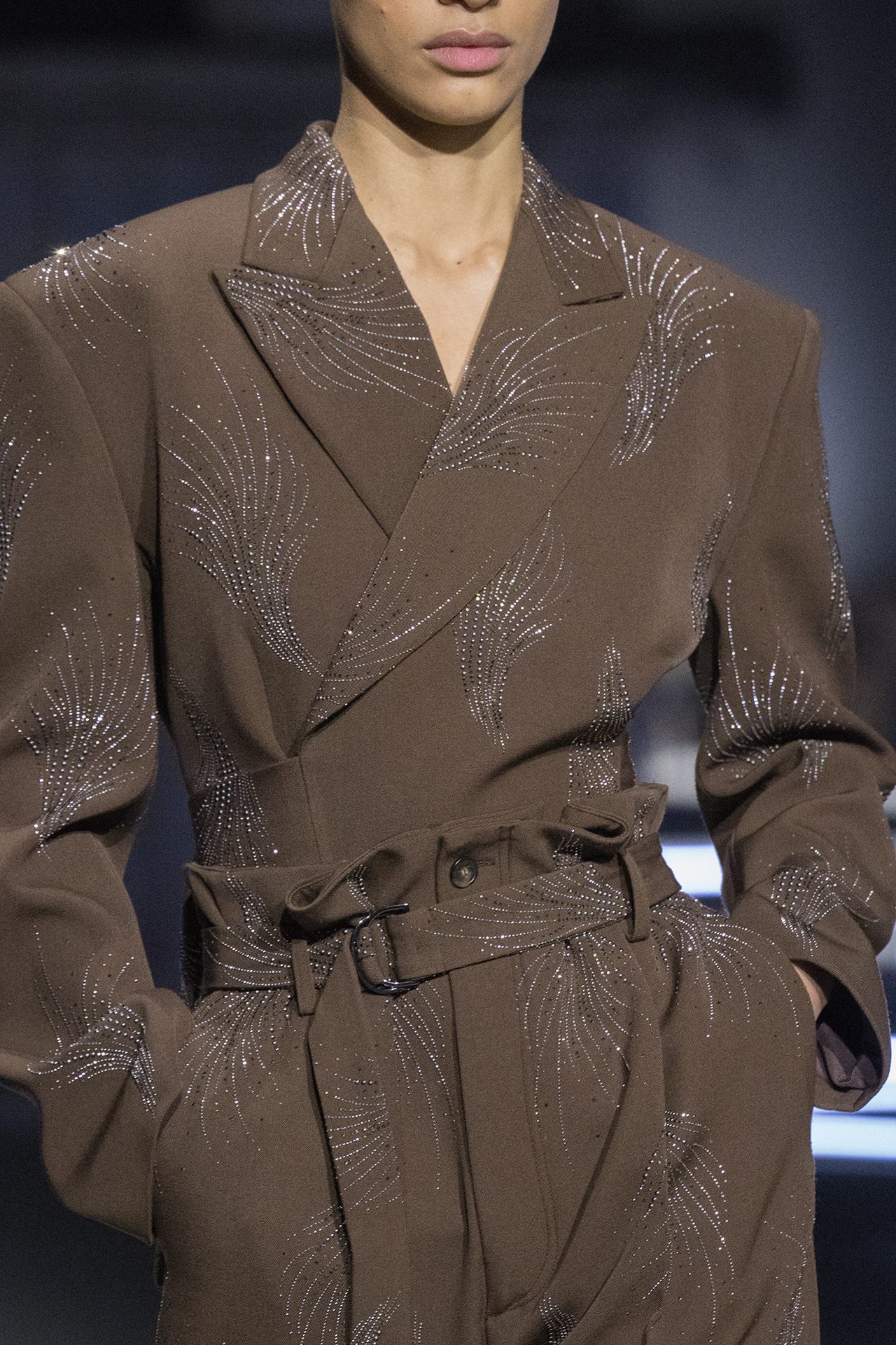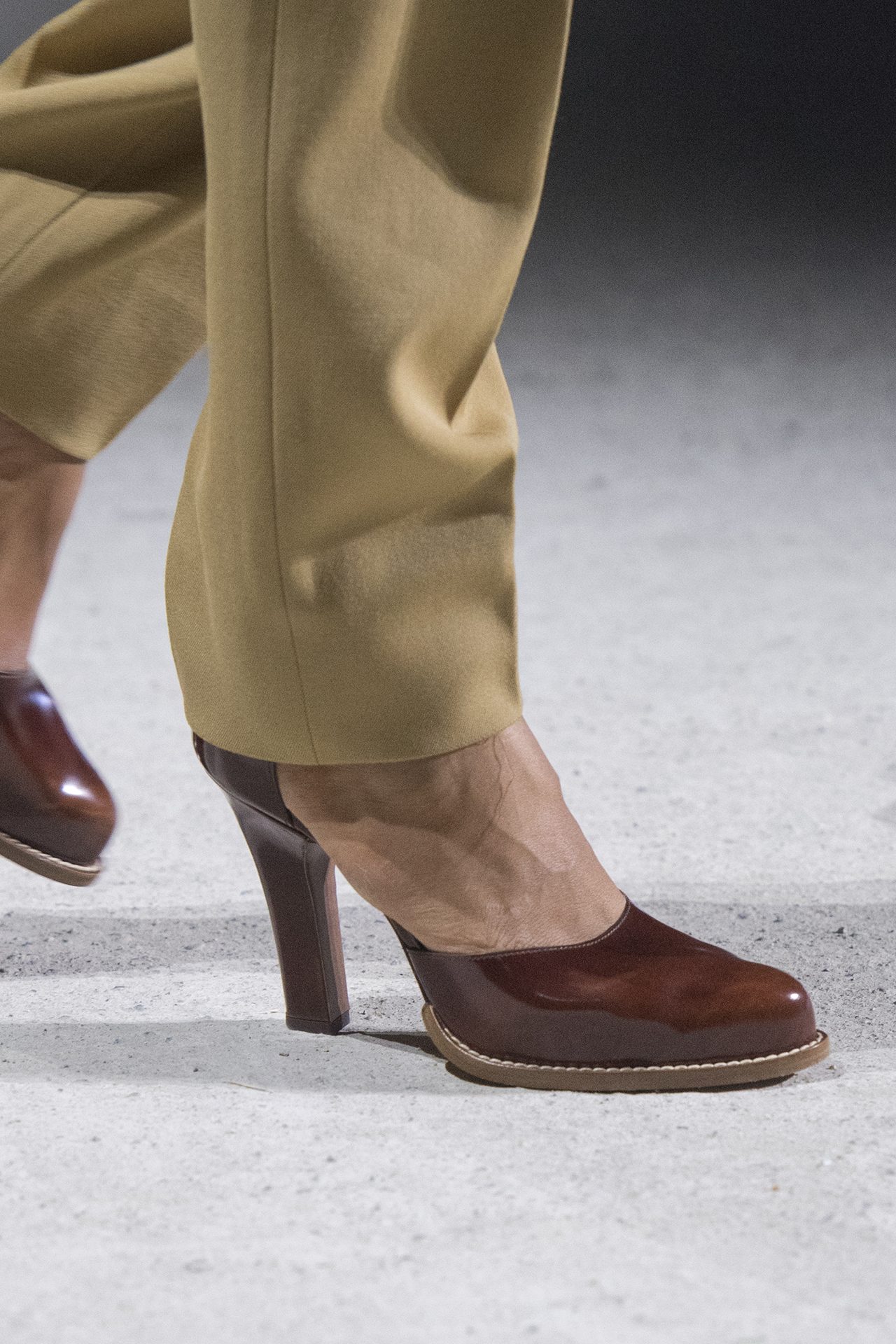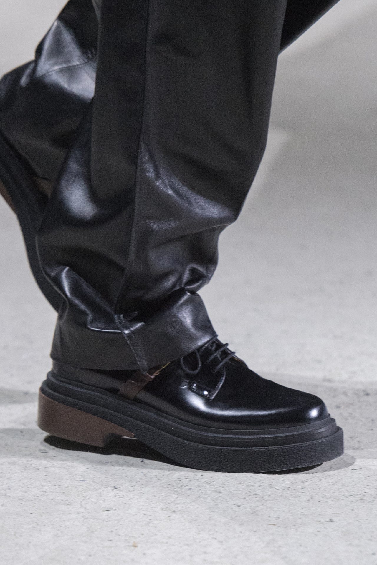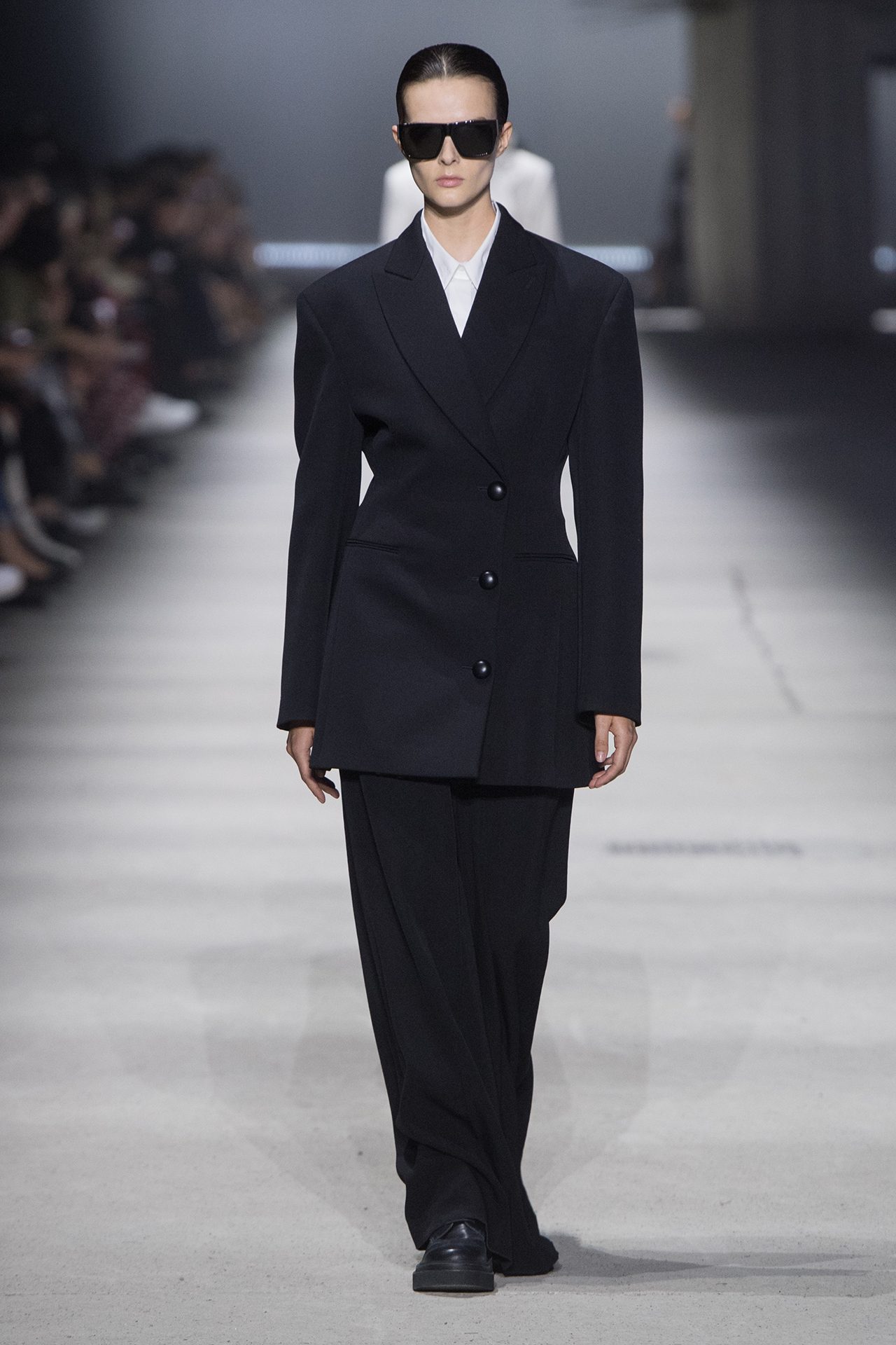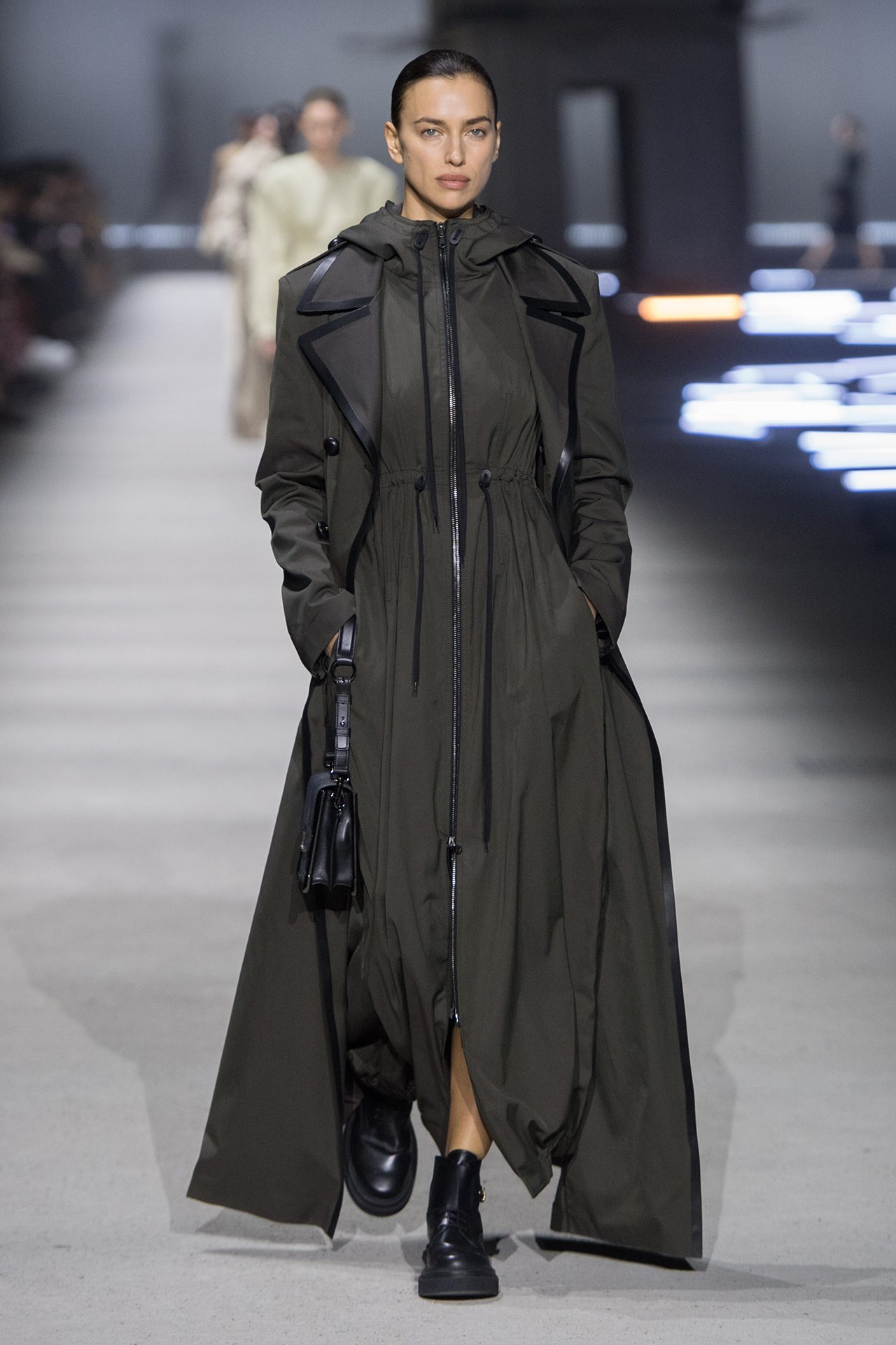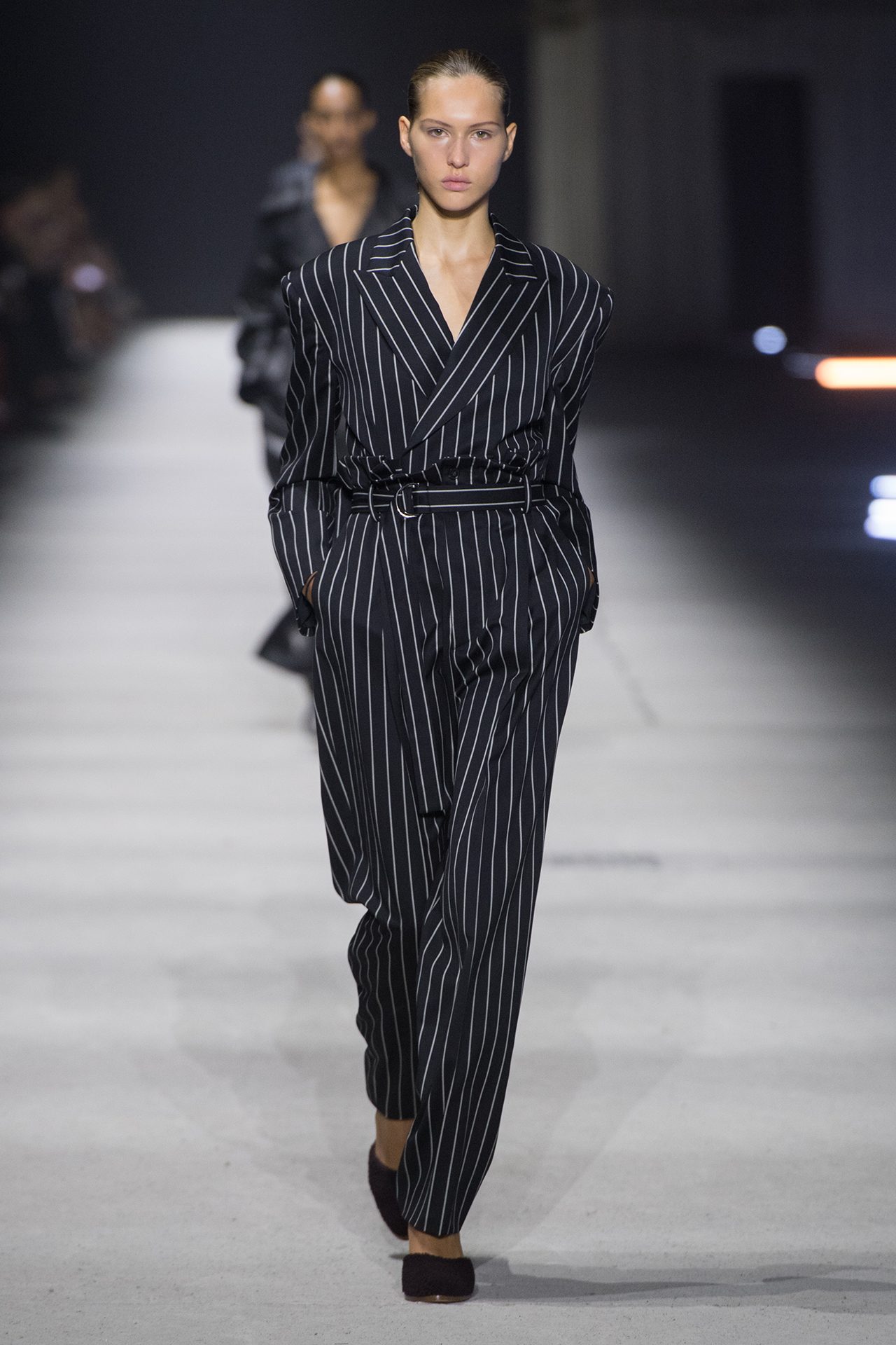 天然素材のファブリックのみが使用され、キャメル、ブラウン、クリームといった暖色系から、ブラックとホワイトのモノトーンまでのカラーパレットで統一された本コレクション。TOD’S のアイコニックなペブルモチーフを想わせる、革のくるみボタンが付いたピーコート、シアリングのディテールが加えられたショート丈のボンバージャケットや、エレガントなパデッドジャケットなど、希少な素材が用いられたアウターが登場。フェミニンなニットウェアとは反対に、マスキュリンなスーツは、構築的なシャツと合わせてお披露目された。