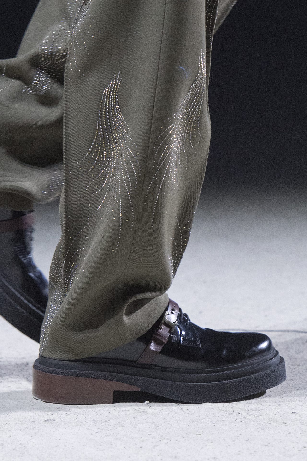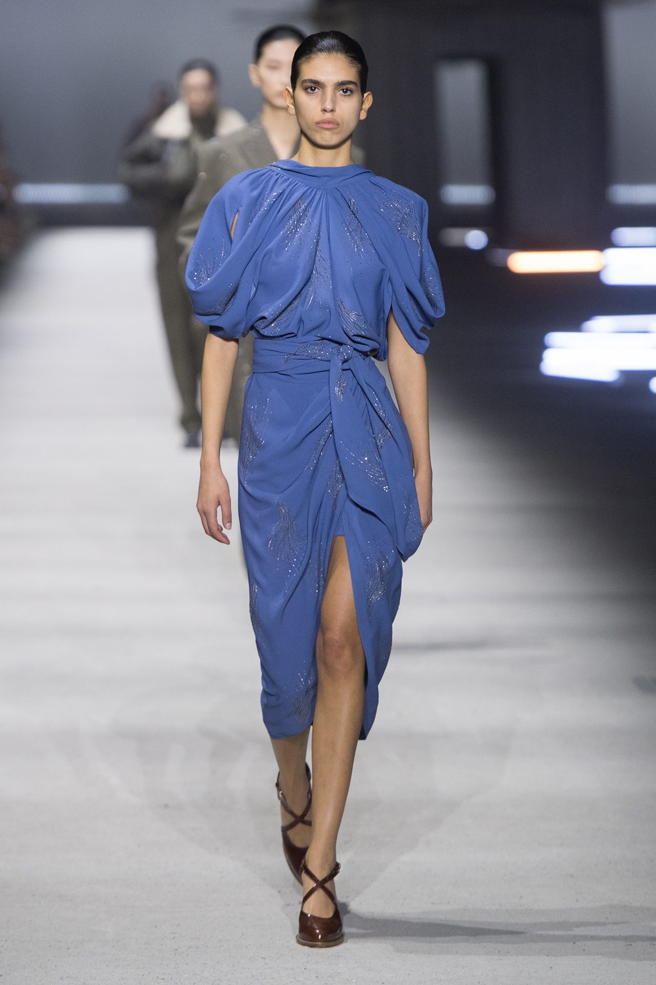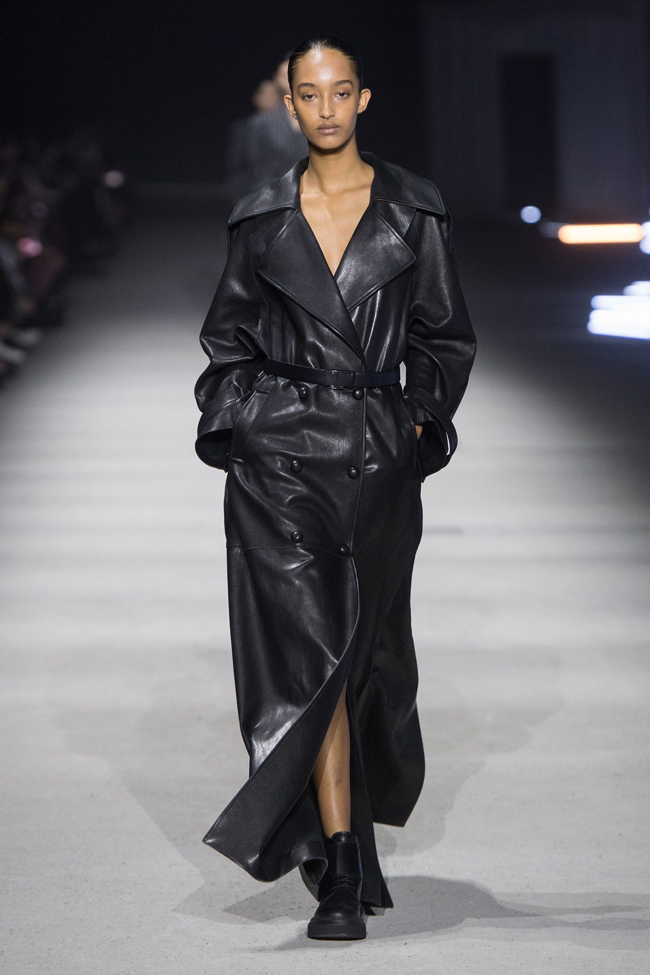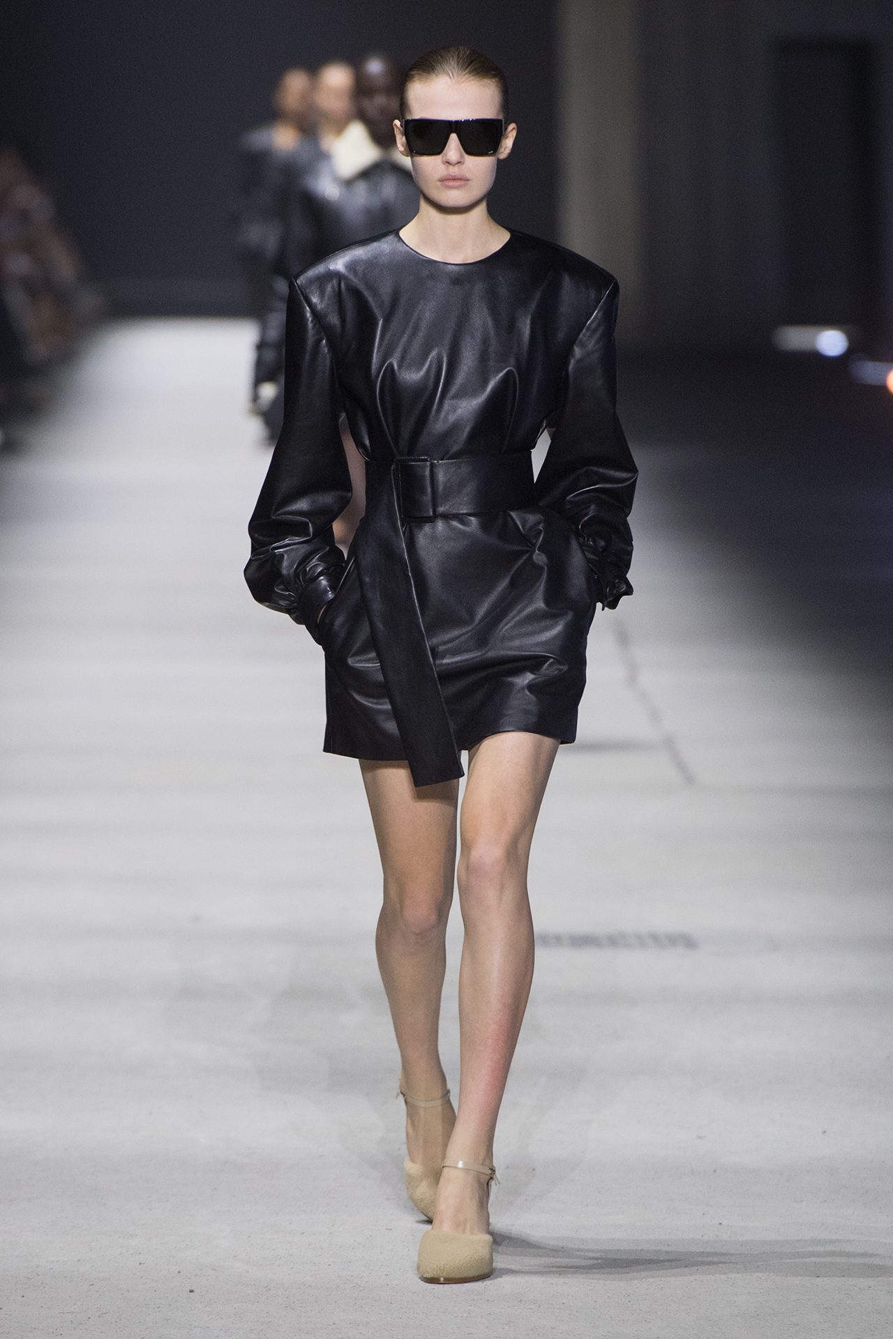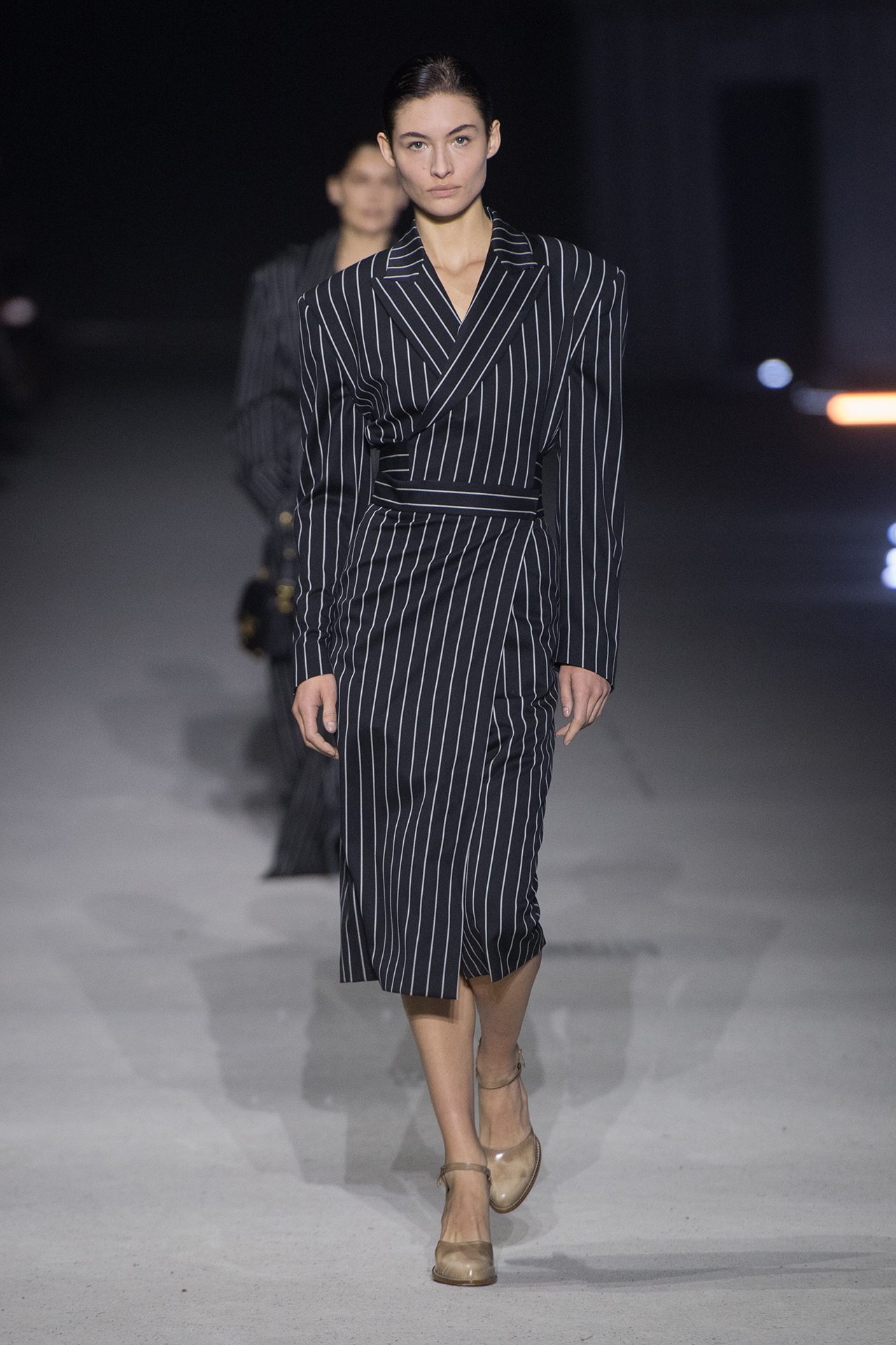 天然素材のファブリックのみが使用され、キャメル、ブラウン、クリームといった暖色系から、ブラックとホワイトのモノトーンまでのカラーパレットで統一された本コレクション。TOD’S のアイコニックなペブルモチーフを想わせる、革のくるみボタンが付いたピーコート、シアリングのディテールが加えられたショート丈のボンバージャケットや、エレガントなパデッドジャケットなど、希少な素材が用いられたアウターが登場。フェミニンなニットウェアとは反対に、マスキュリンなスーツは、構築的なシャツと合わせてお披露目された。