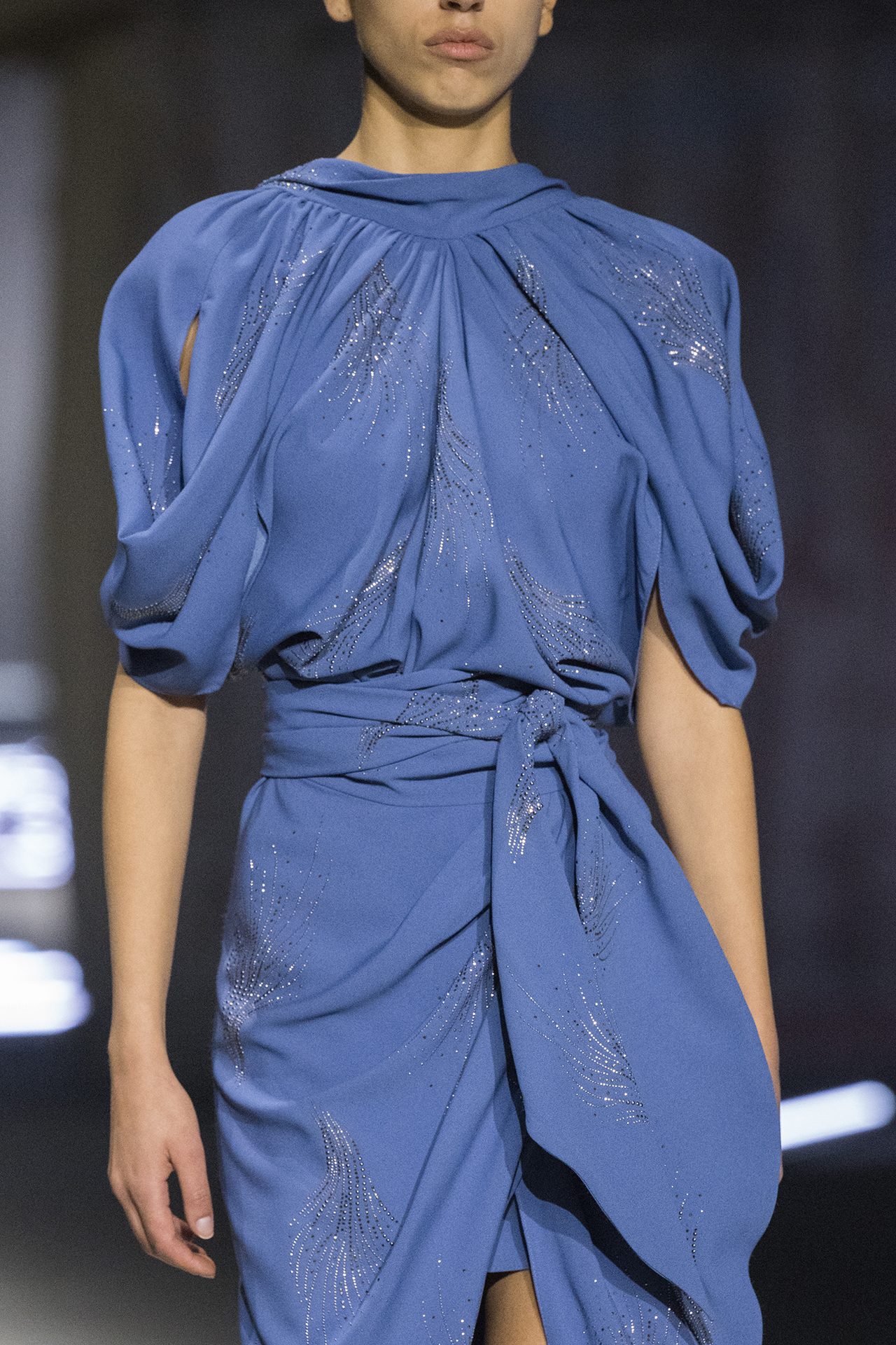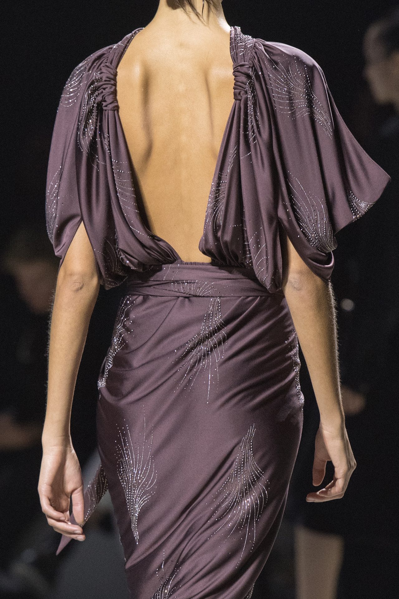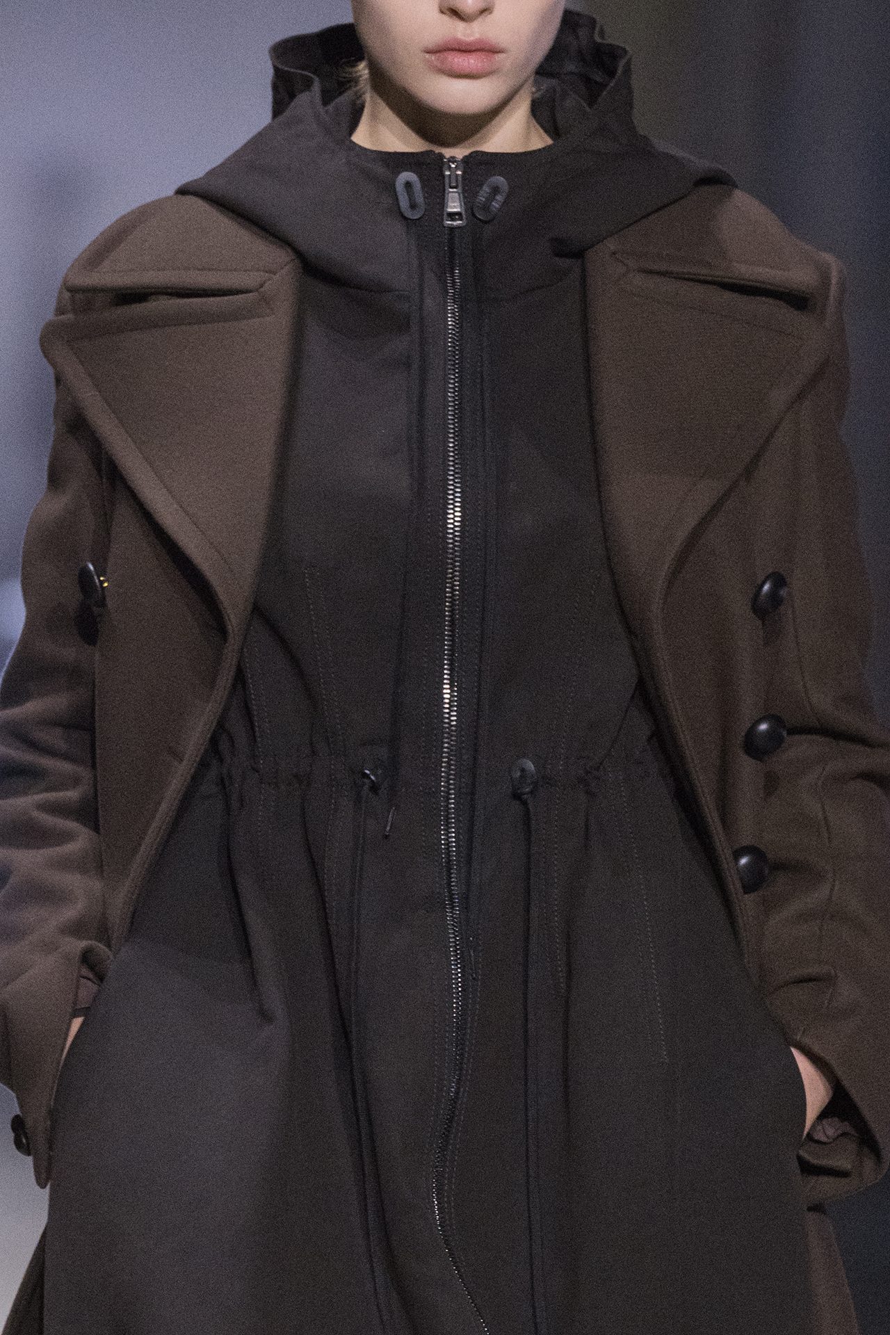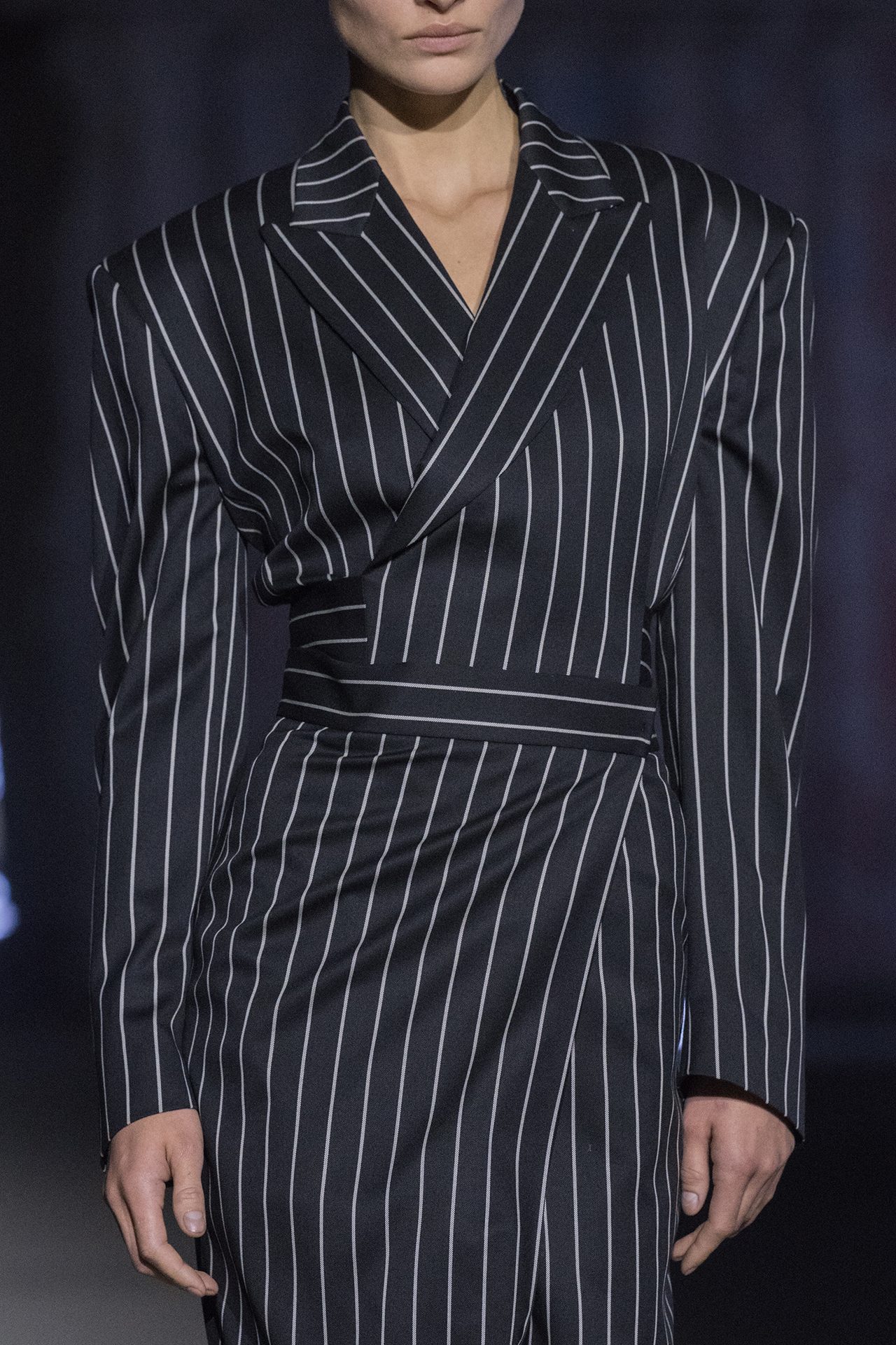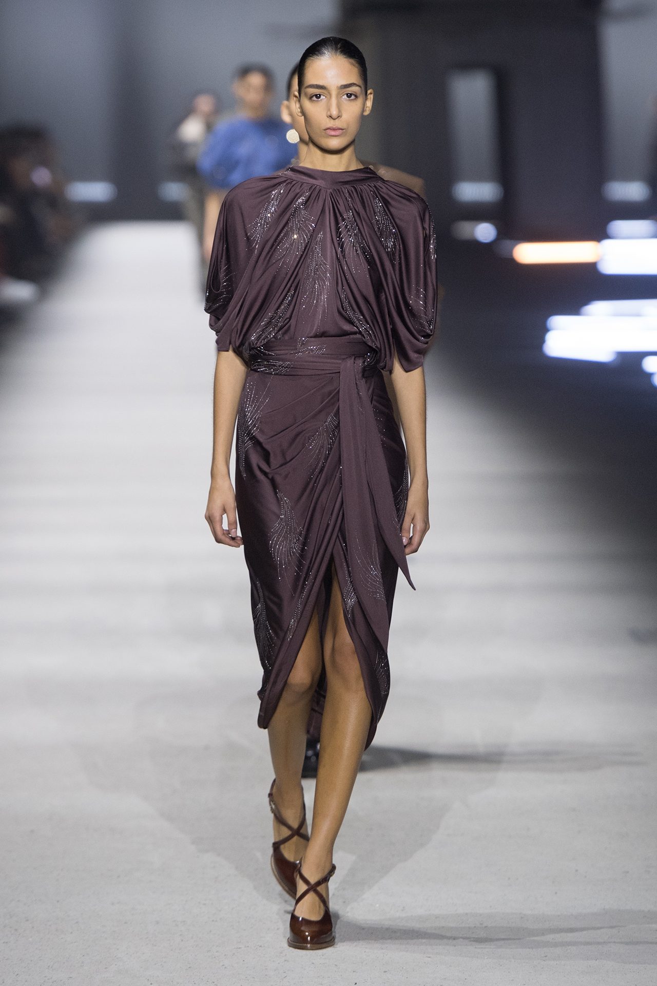天然素材のファブリックのみが使用され、キャメル、ブラウン、クリームといった暖色系から、ブラックとホワイトのモノトーンまでのカラーパレットで統一された本コレクション。TOD’S のアイコニックなペブルモチーフを想わせる、革のくるみボタンが付いたピーコート、シアリングのディテールが加えられたショート丈のボンバージャケットや、エレガントなパデッドジャケットなど、希少な素材が用いられたアウターが登場。フェミニンなニットウェアとは反対に、マスキュリンなスーツは、構築的なシャツと合わせてお披露目された。