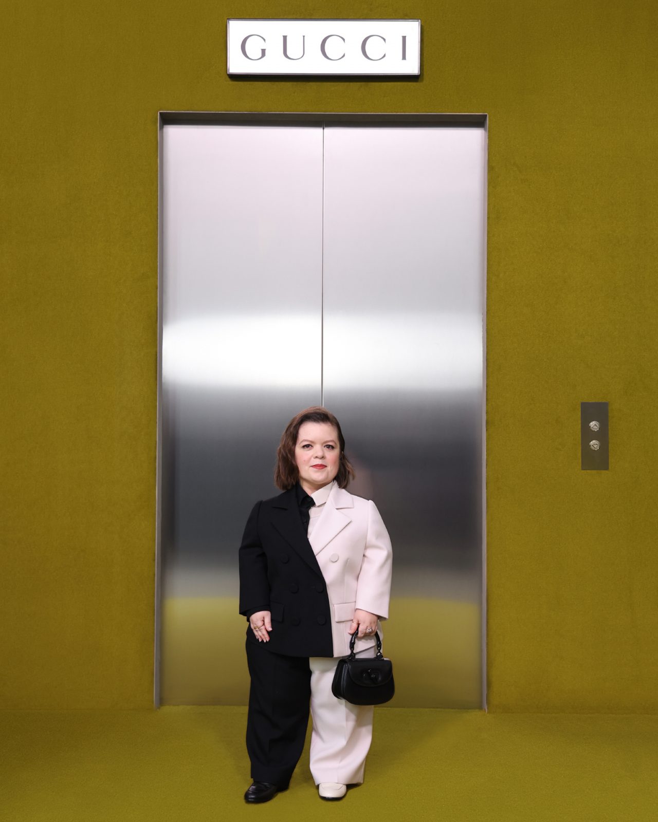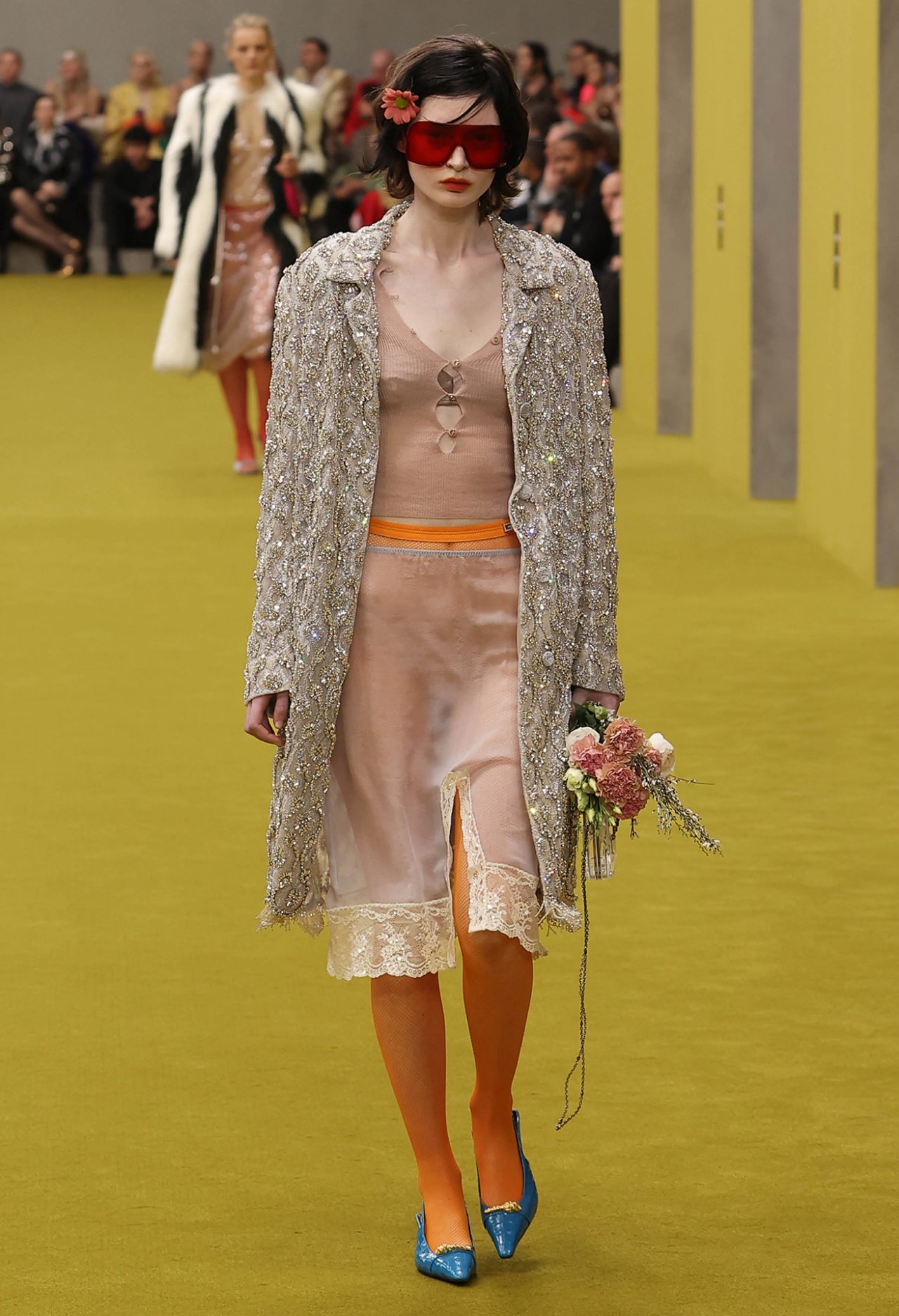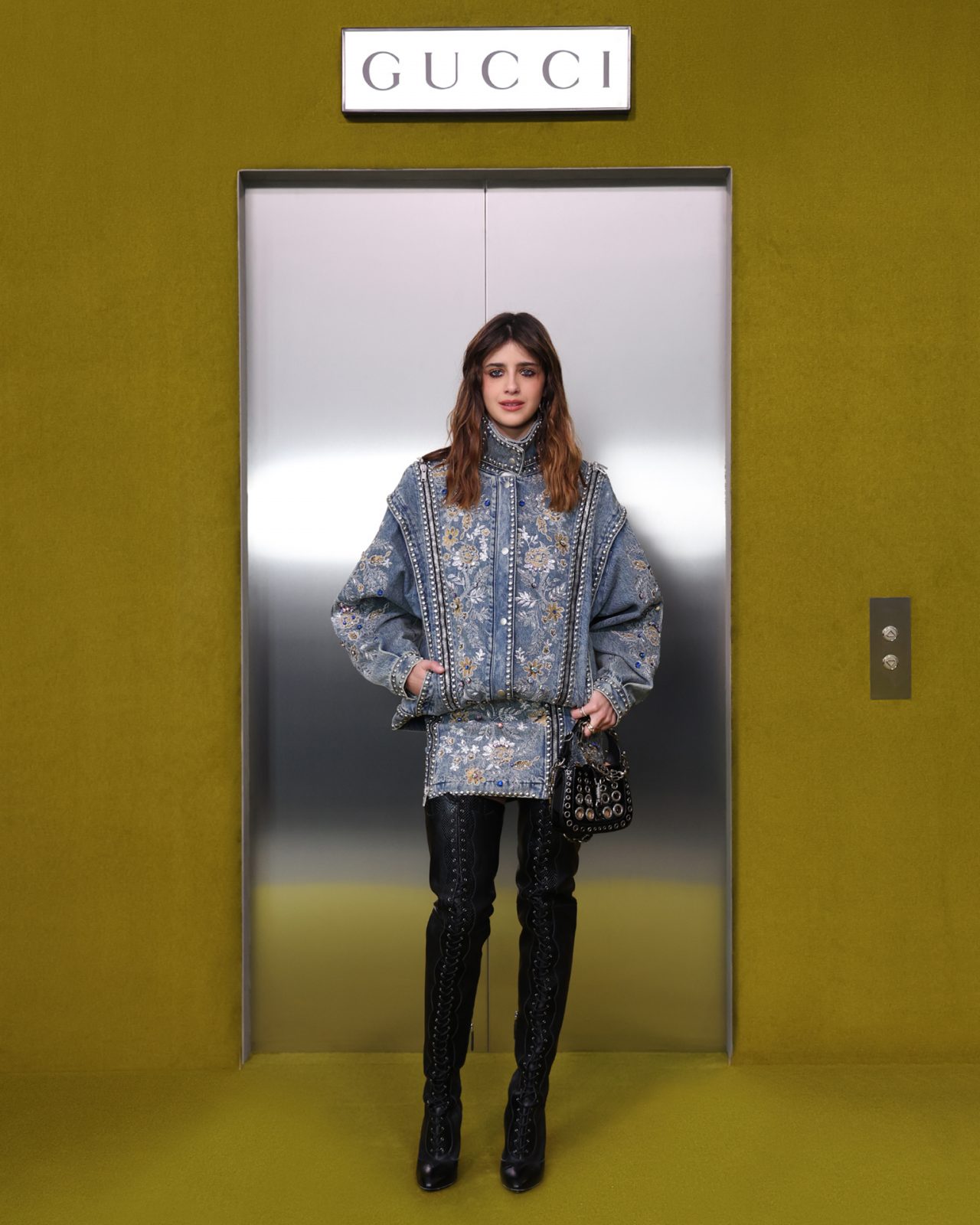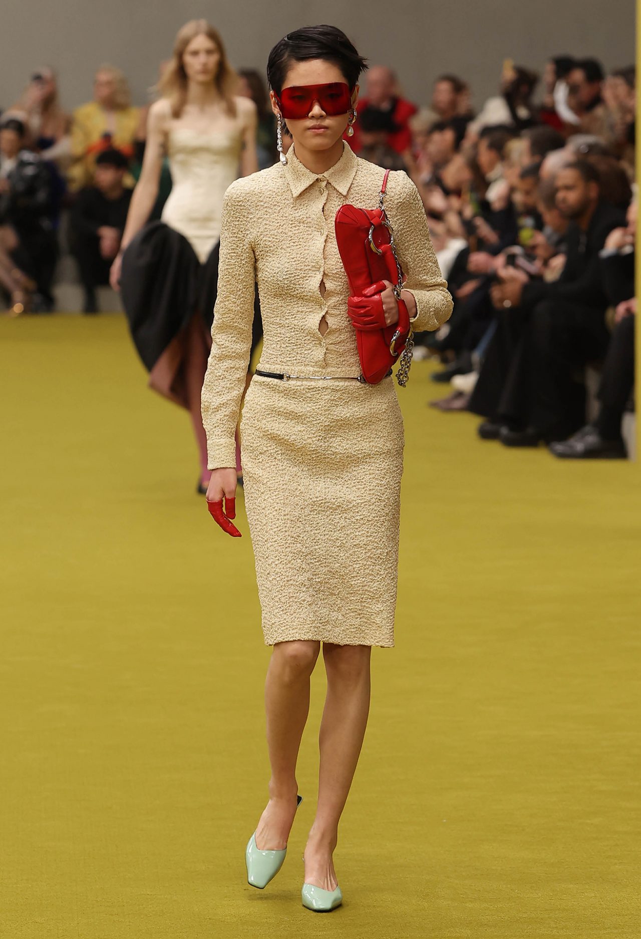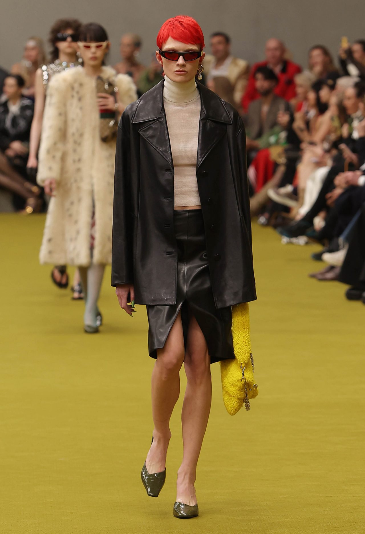 ショー会場となった GUCCI HUB (グッチ ハブ) には、イエローグリーンのカーペットが一面に敷かれ、2つの円形ステージの周りには GUCCI の革新的な素材「デメトラ」で作られたシートが並んだ。円形のステージは、GUCCI の中核であるデザイナーと職人が共有するエコシステム、1世紀以上にわたり受け継がれ進化を遂げてきた同ブランドの物語を表す。会場には2000年代の Britney Spears (ブリトニー・スピアーズ) の楽曲を思い起こさせる音楽が流れ、コレクションはクリスタルのきらめく「GGメタル」のブラルックよりはじまった。