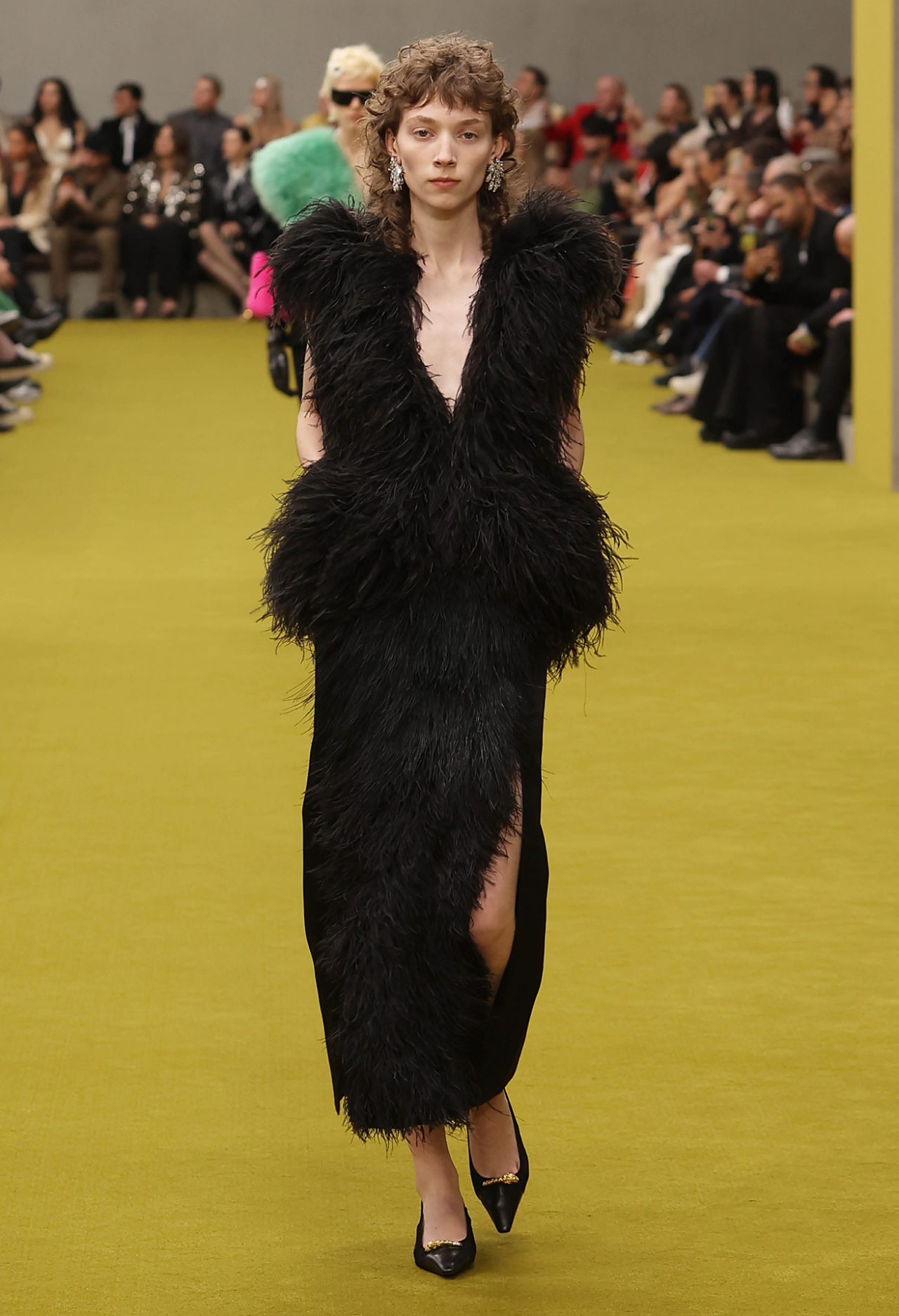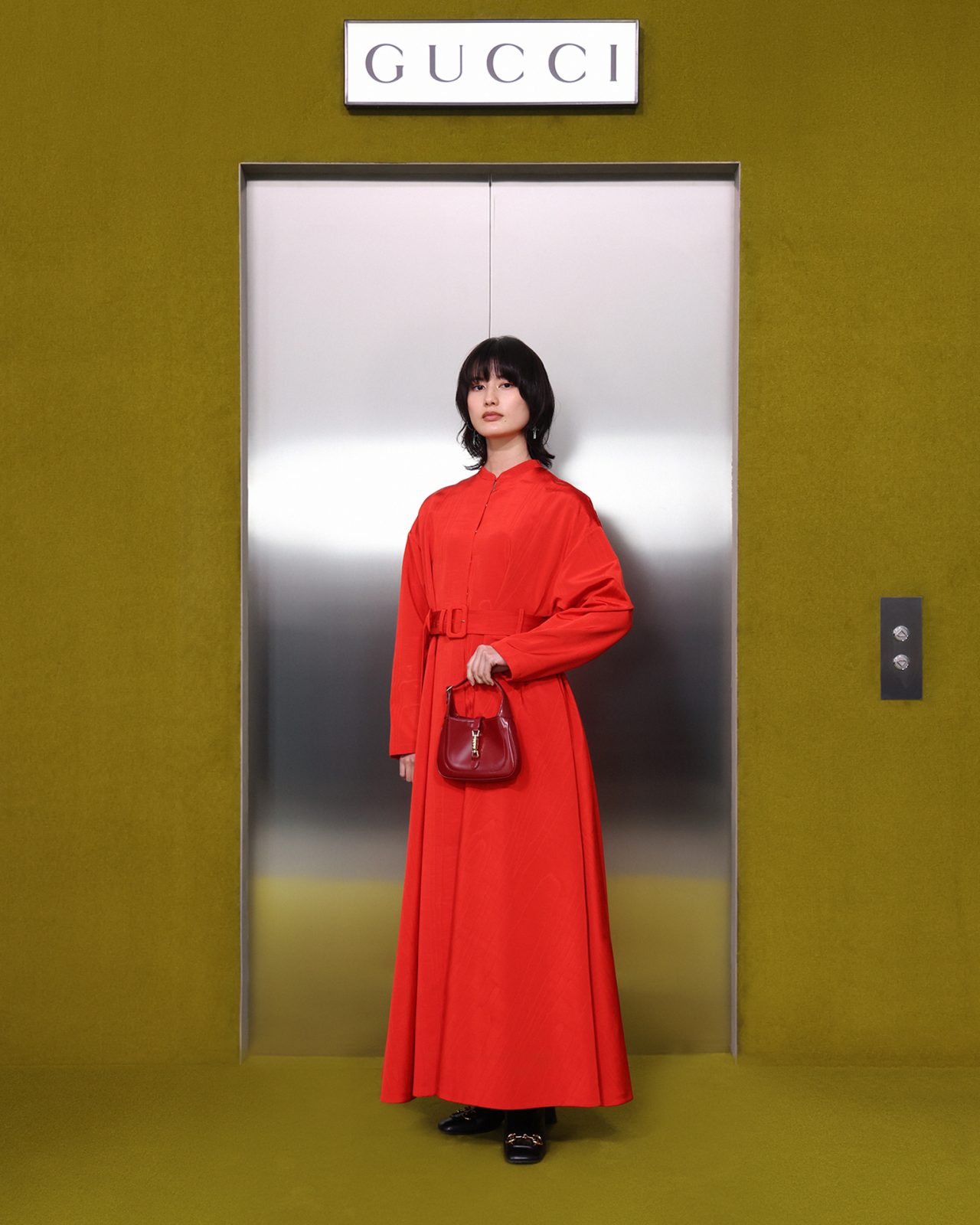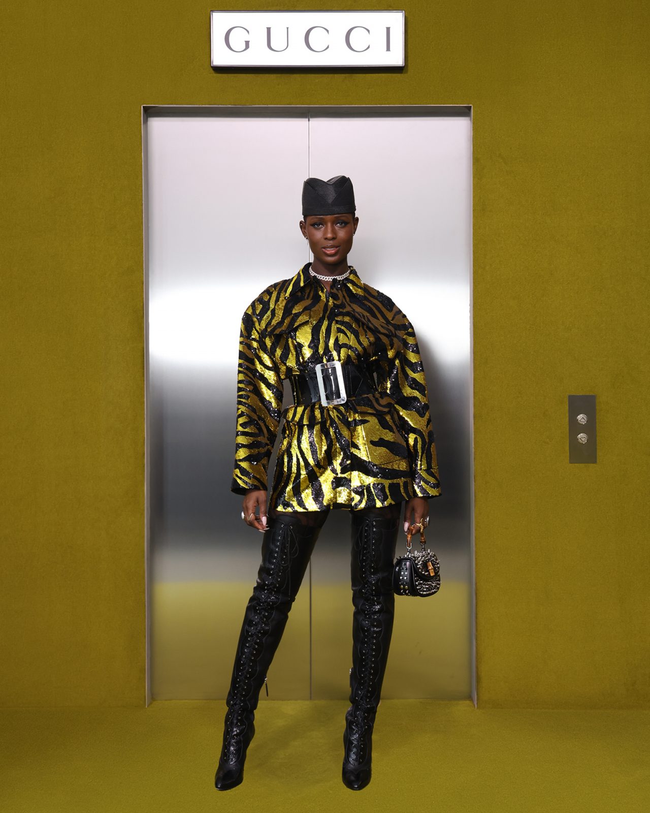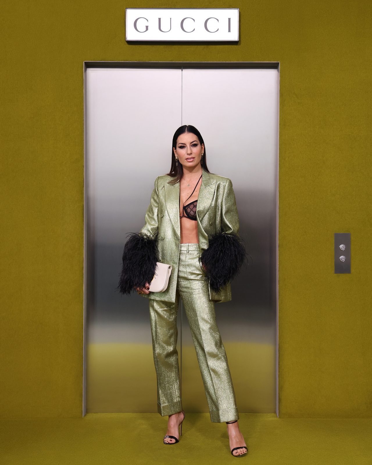 ショー会場となった GUCCI HUB (グッチ ハブ) には、イエローグリーンのカーペットが一面に敷かれ、2つの円形ステージの周りには GUCCI の革新的な素材「デメトラ」で作られたシートが並んだ。円形のステージは、GUCCI の中核であるデザイナーと職人が共有するエコシステム、1世紀以上にわたり受け継がれ進化を遂げてきた同ブランドの物語を表す。会場には2000年代の Britney Spears (ブリトニー・スピアーズ) の楽曲を思い起こさせる音楽が流れ、コレクションはクリスタルのきらめく「GGメタル」のブラルックよりはじまった。