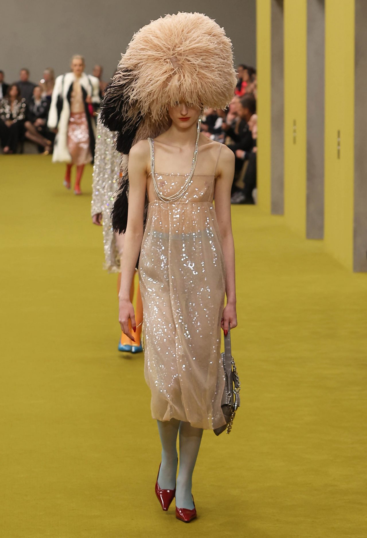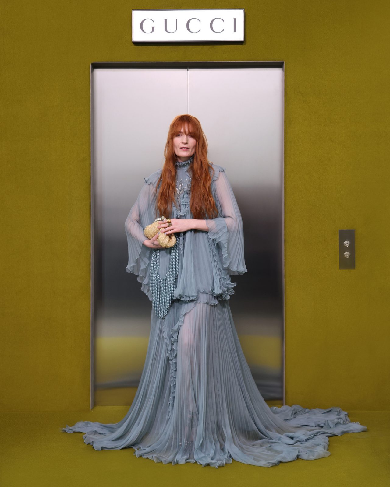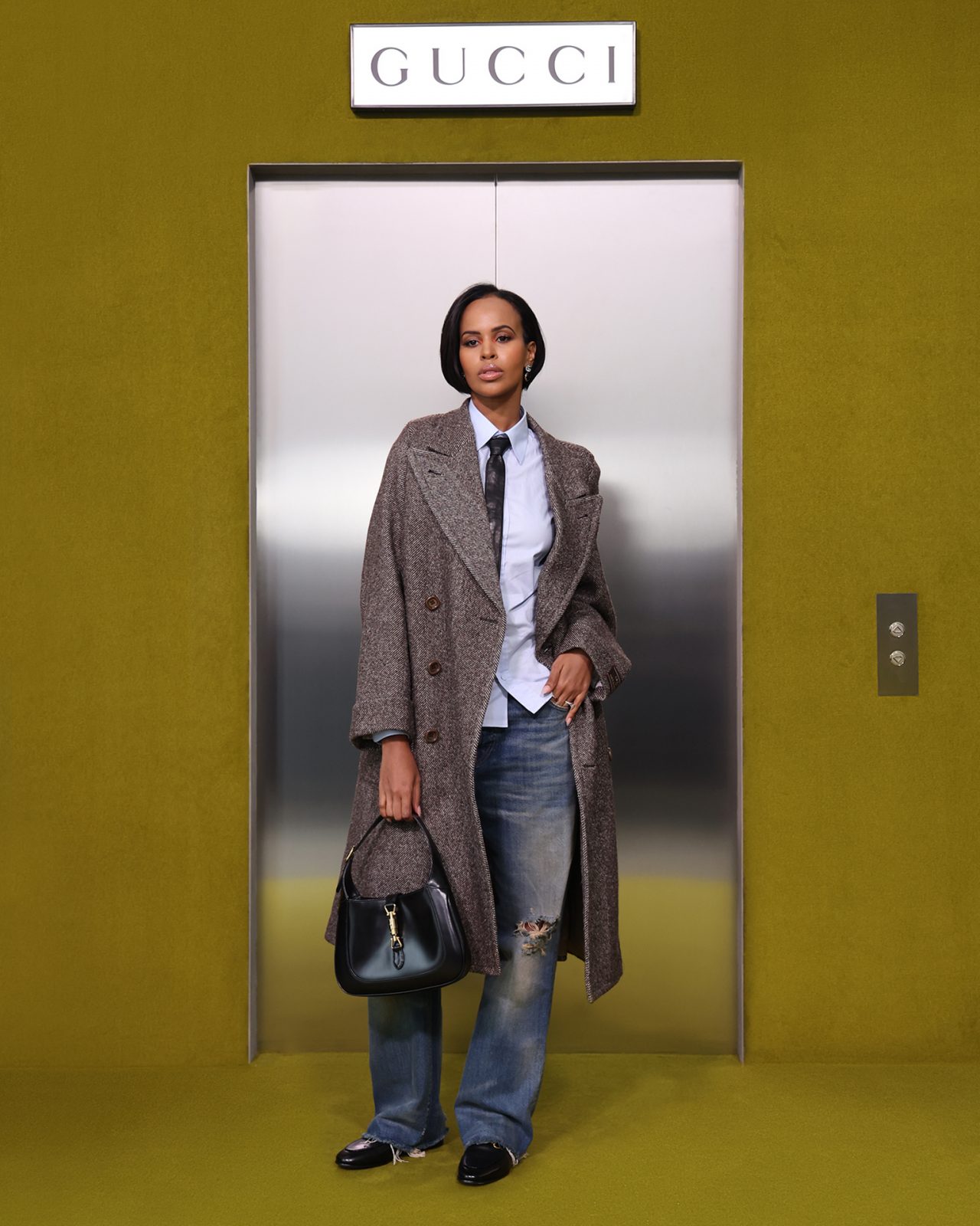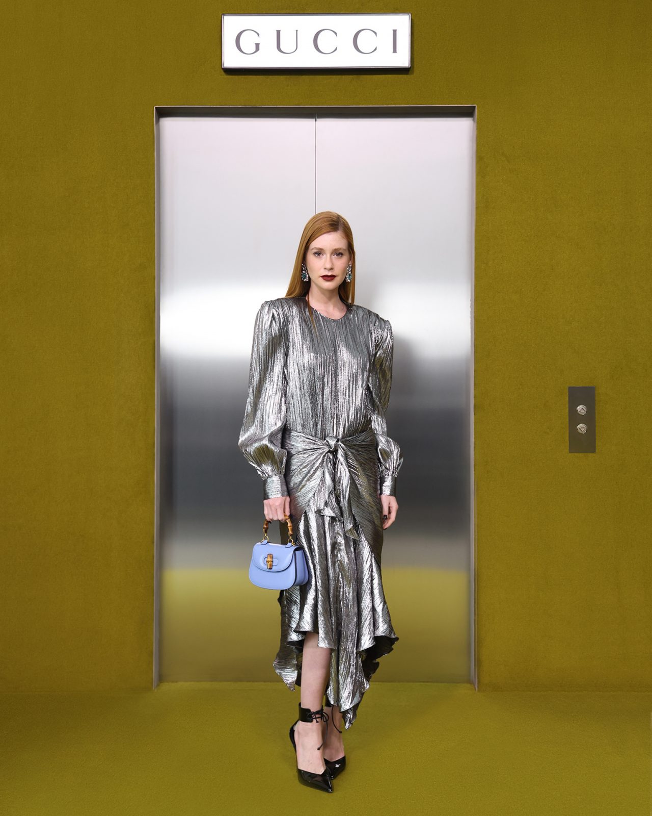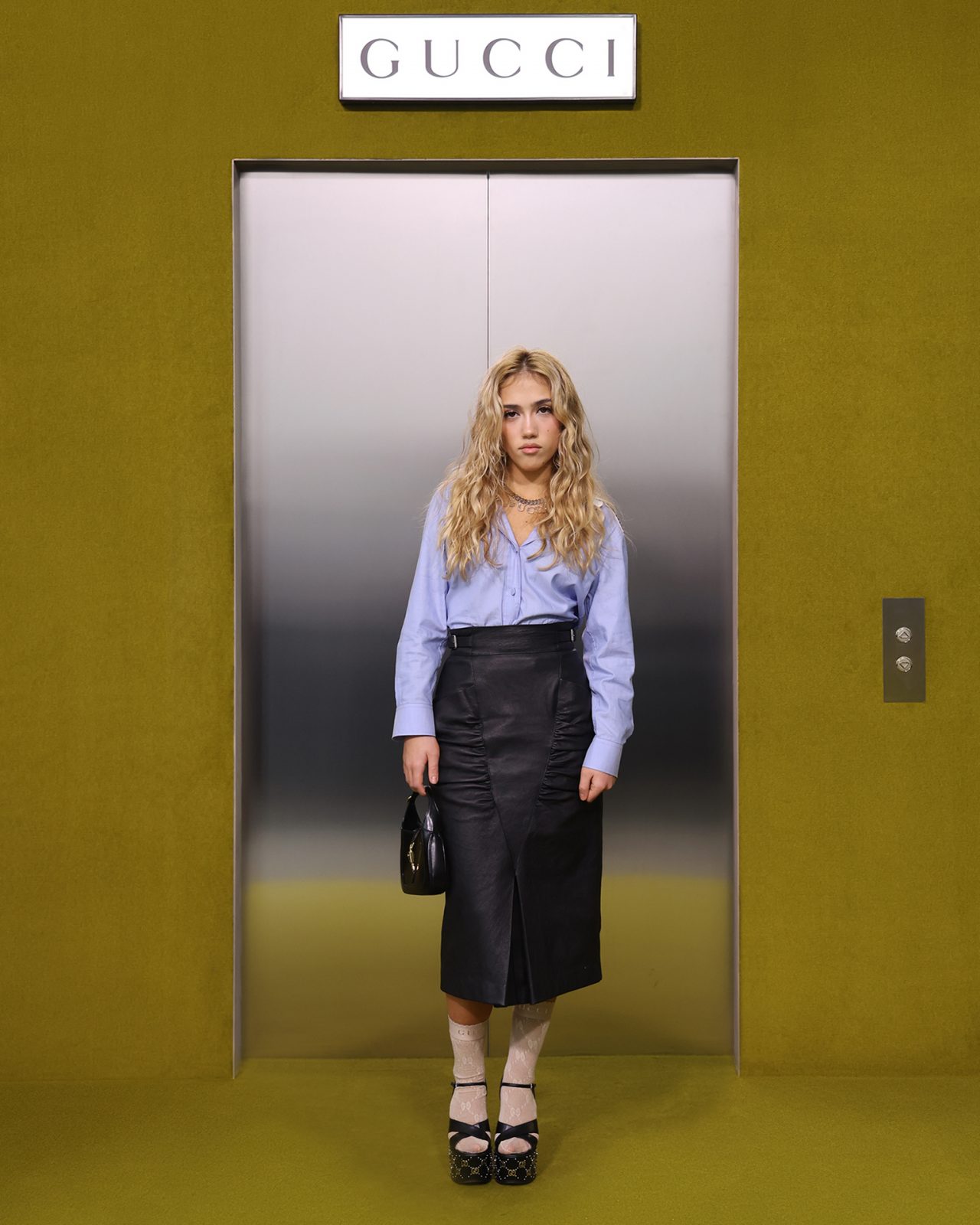 ショー会場となった GUCCI HUB (グッチ ハブ) には、イエローグリーンのカーペットが一面に敷かれ、2つの円形ステージの周りには GUCCI の革新的な素材「デメトラ」で作られたシートが並んだ。円形のステージは、GUCCI の中核であるデザイナーと職人が共有するエコシステム、1世紀以上にわたり受け継がれ進化を遂げてきた同ブランドの物語を表す。会場には2000年代の Britney Spears (ブリトニー・スピアーズ) の楽曲を思い起こさせる音楽が流れ、コレクションはクリスタルのきらめく「GGメタル」のブラルックよりはじまった。