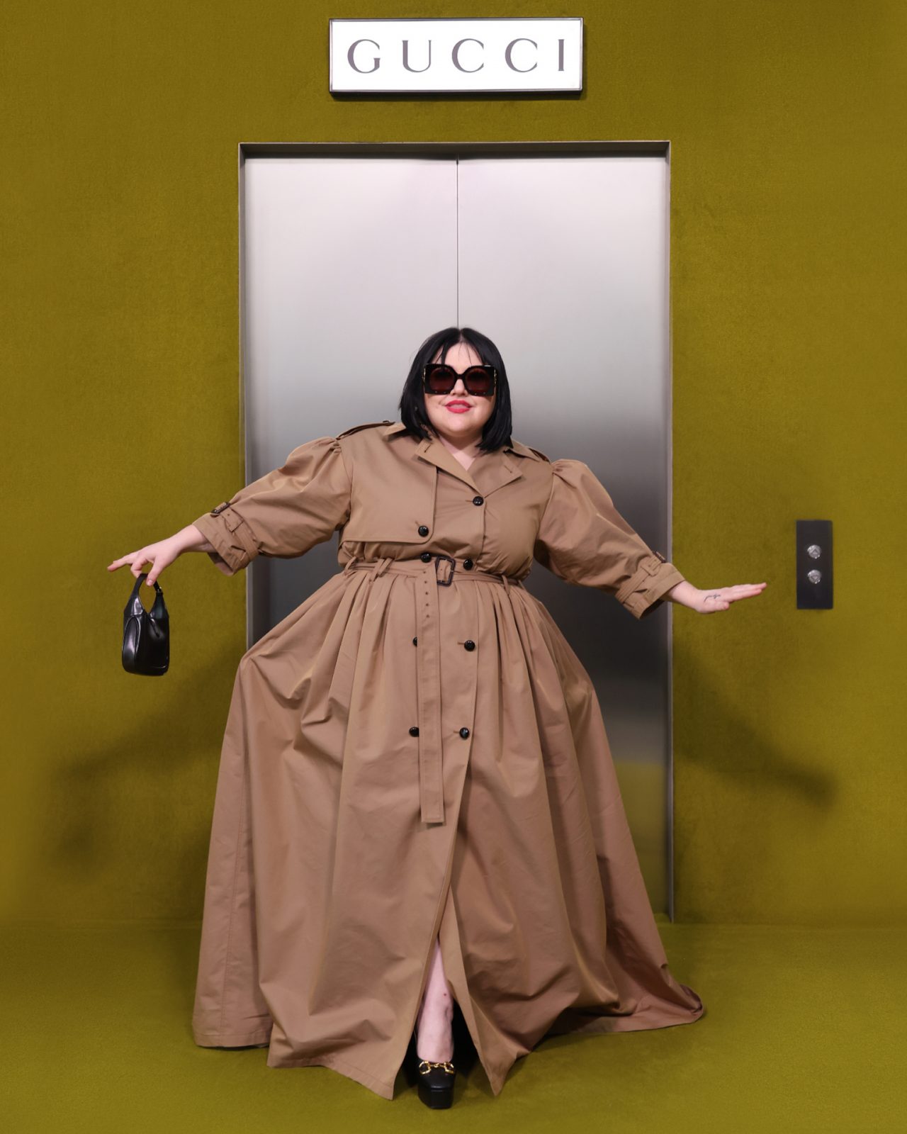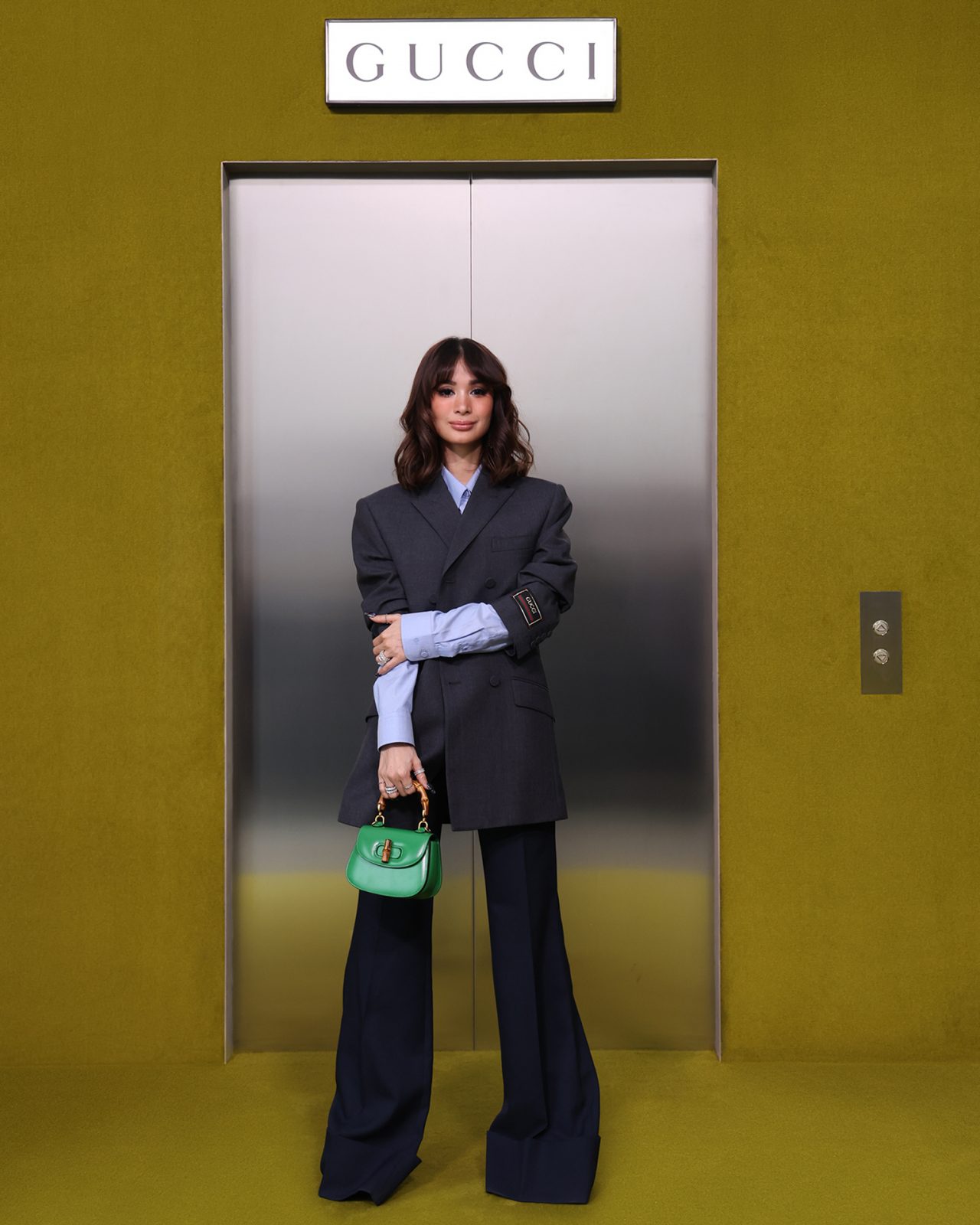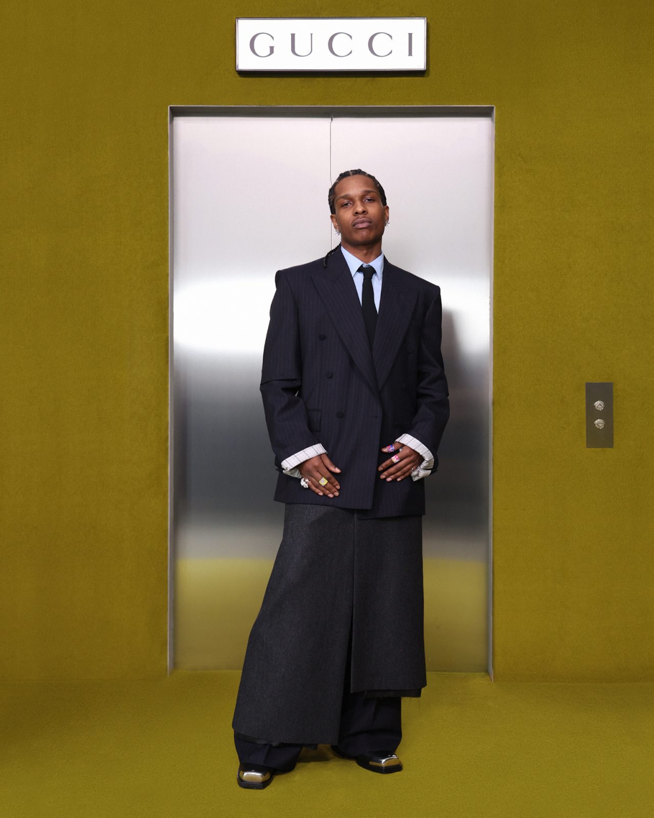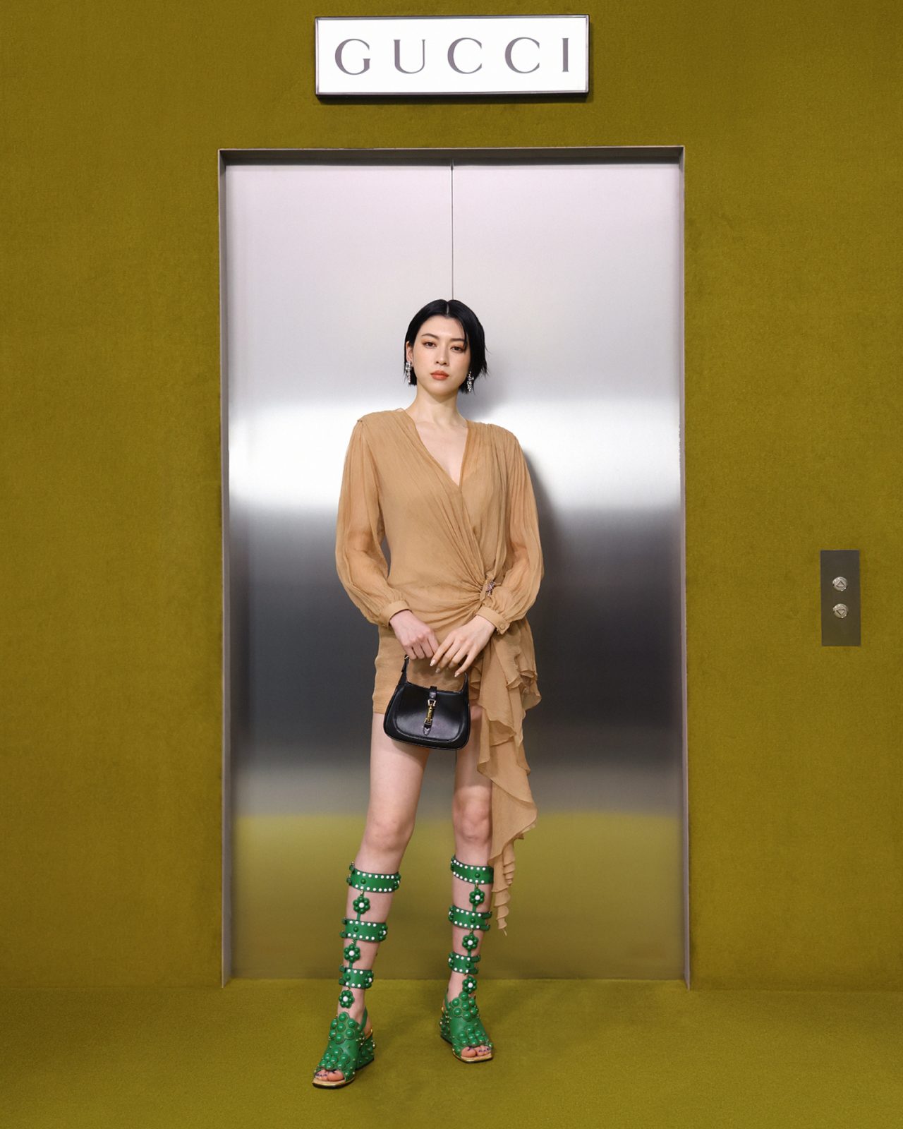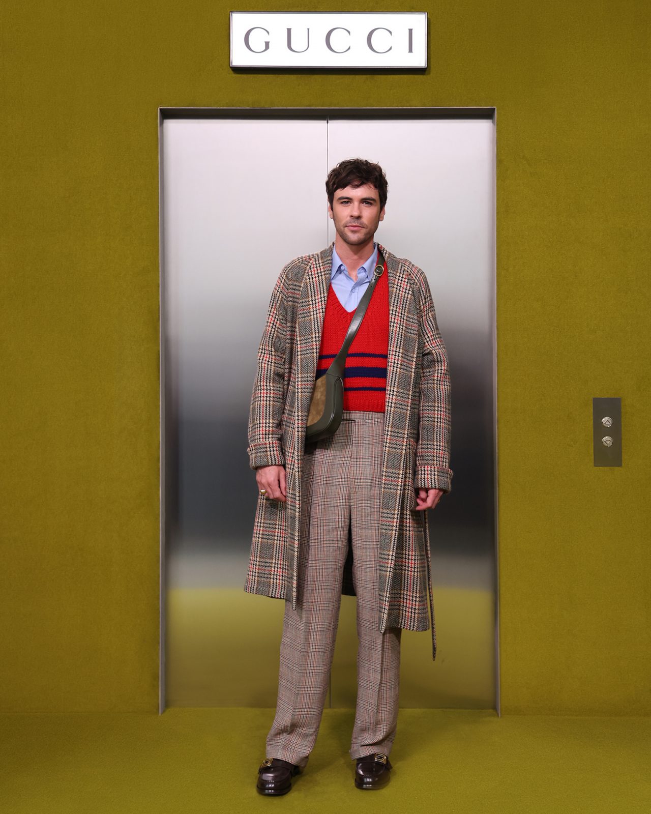 ショー会場となった GUCCI HUB (グッチ ハブ) には、イエローグリーンのカーペットが一面に敷かれ、2つの円形ステージの周りには GUCCI の革新的な素材「デメトラ」で作られたシートが並んだ。円形のステージは、GUCCI の中核であるデザイナーと職人が共有するエコシステム、1世紀以上にわたり受け継がれ進化を遂げてきた同ブランドの物語を表す。会場には2000年代の Britney Spears (ブリトニー・スピアーズ) の楽曲を思い起こさせる音楽が流れ、コレクションはクリスタルのきらめく「GGメタル」のブラルックよりはじまった。
