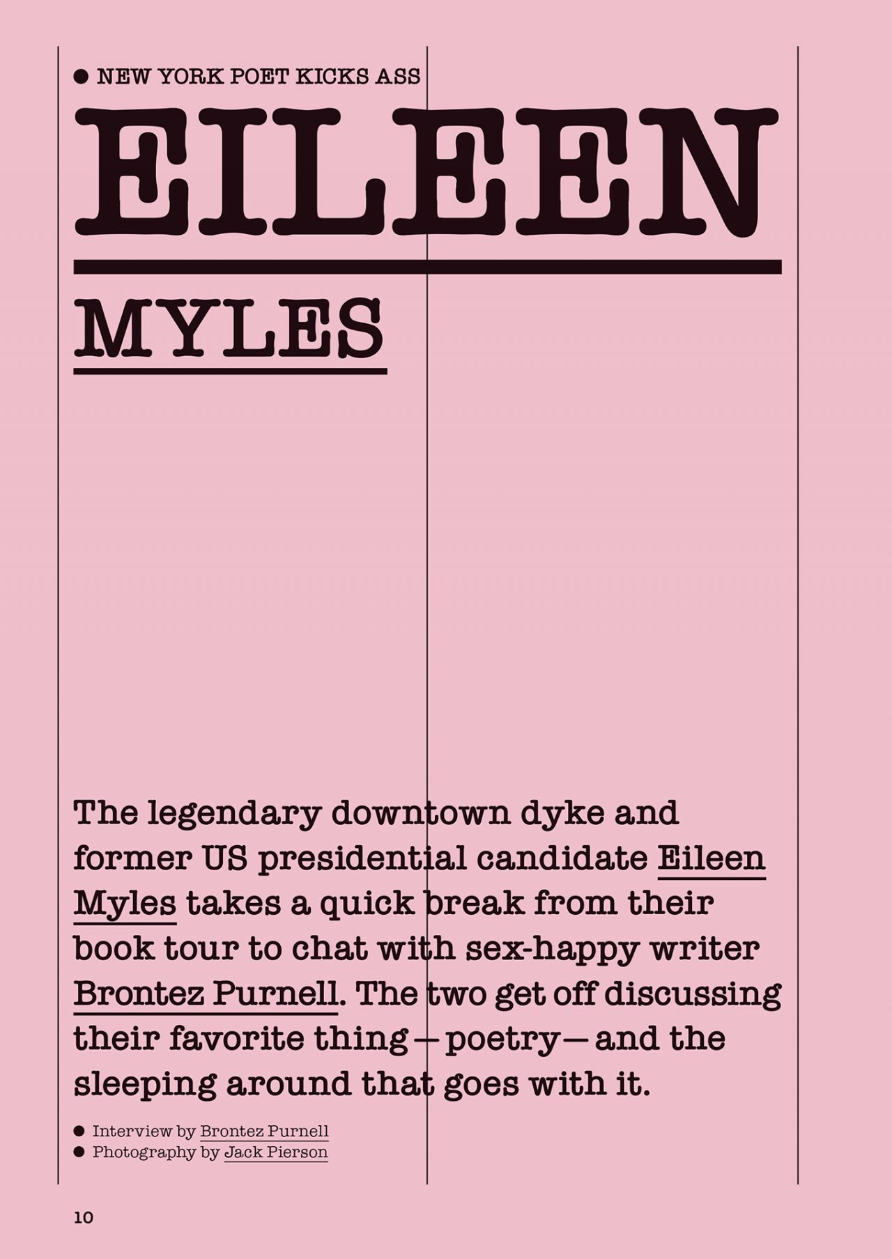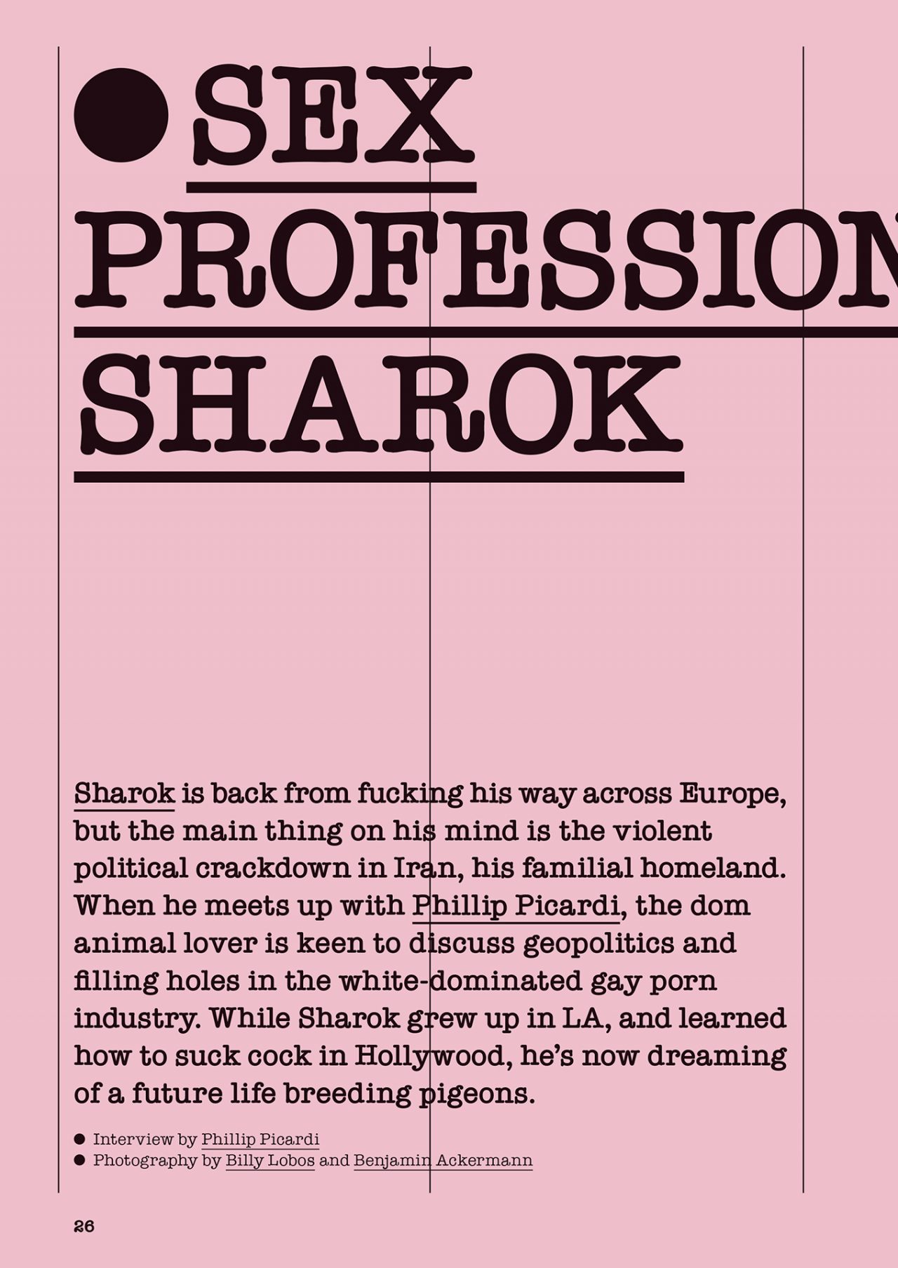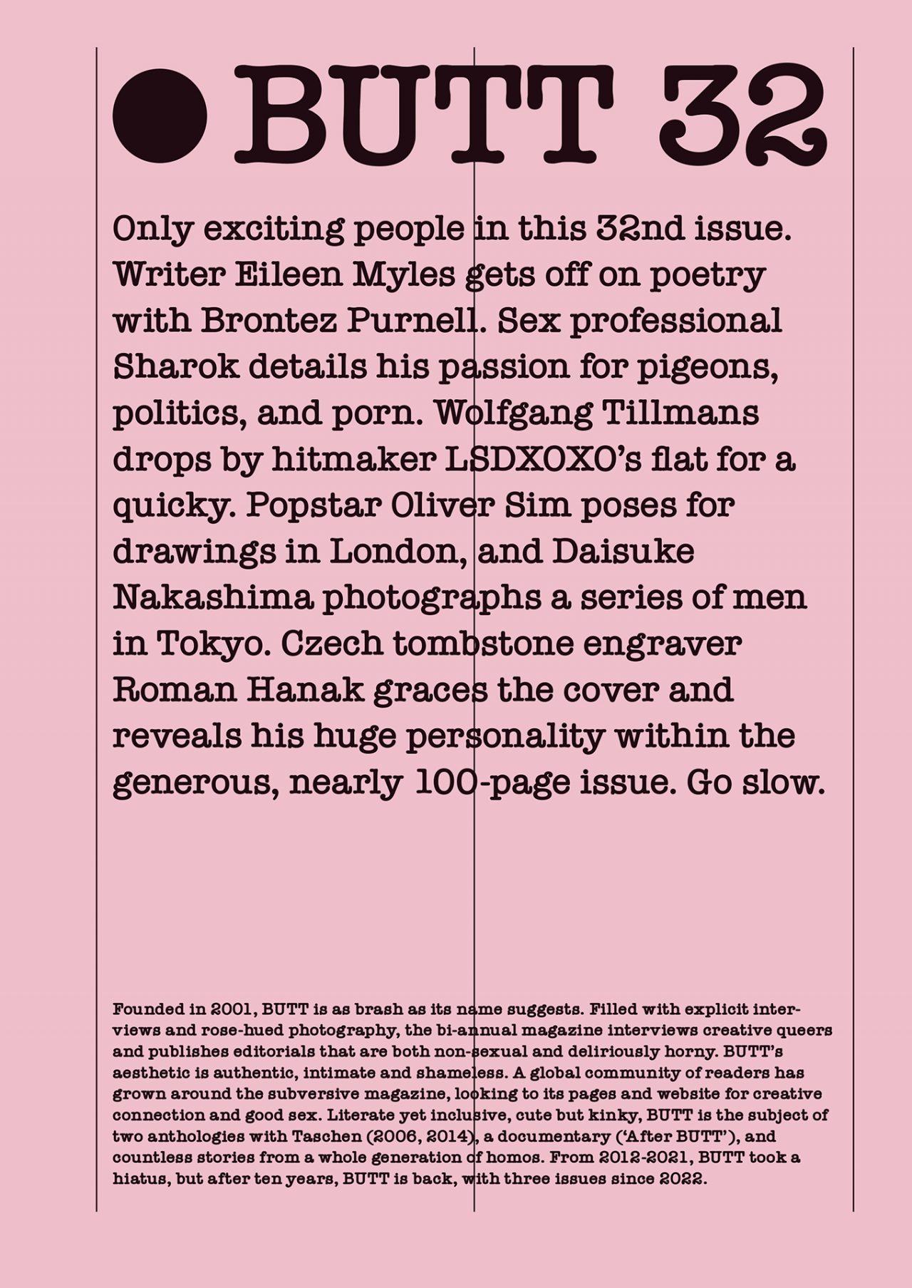 最新の第32号は、チェコの墓石彫刻家 Roman Hanak (ロマン・ハナーク) が表紙を飾った。また、作家の Eileen Myles (アイリーン・マイルズ) と Brontez Purnell (ブロンテス・パーネル) が詩について盛り上がり、セックスのプロフェッショナル Sharok (シャーロック) がハトや政治、ポルノへの情熱を語る。また、写真家の Wolfgang Tillmans (ヴォルフガング・ティルマンス) が DJ として活躍する LSDXOXO (LSDエックスオーエックスオー) を撮影した他、The xx (ザ・エックス・エックス) のボーカル Oliver Sim (オリヴァー・シム) をモデルに、イラストレーターの Wilfrid Wood (ウィルフリッド・ウッド) によって描かれた絵も掲載。さらに、写真家の中島大輔がシャツを脱いだ男達を東京で撮影するなど、アクセル全開な内容が盛りだくさんだ。