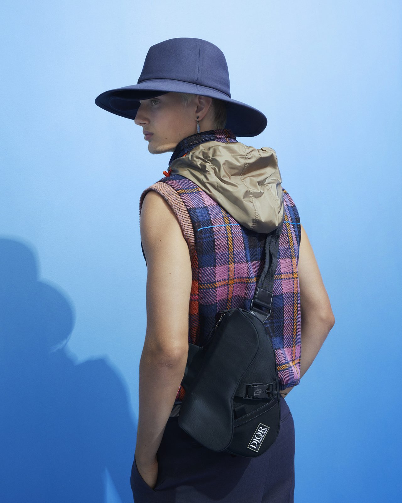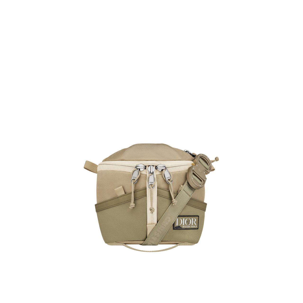 DIOR を象徴する「サドル」バッグはアウトドア仕様に再解釈。さまざまなアクセサリーを取り付けられるトップバンドが縫い付けられたナイロンジャカード製のショルダーストラップに、アルミニウム製の「CD」バックルが備え付けられている。