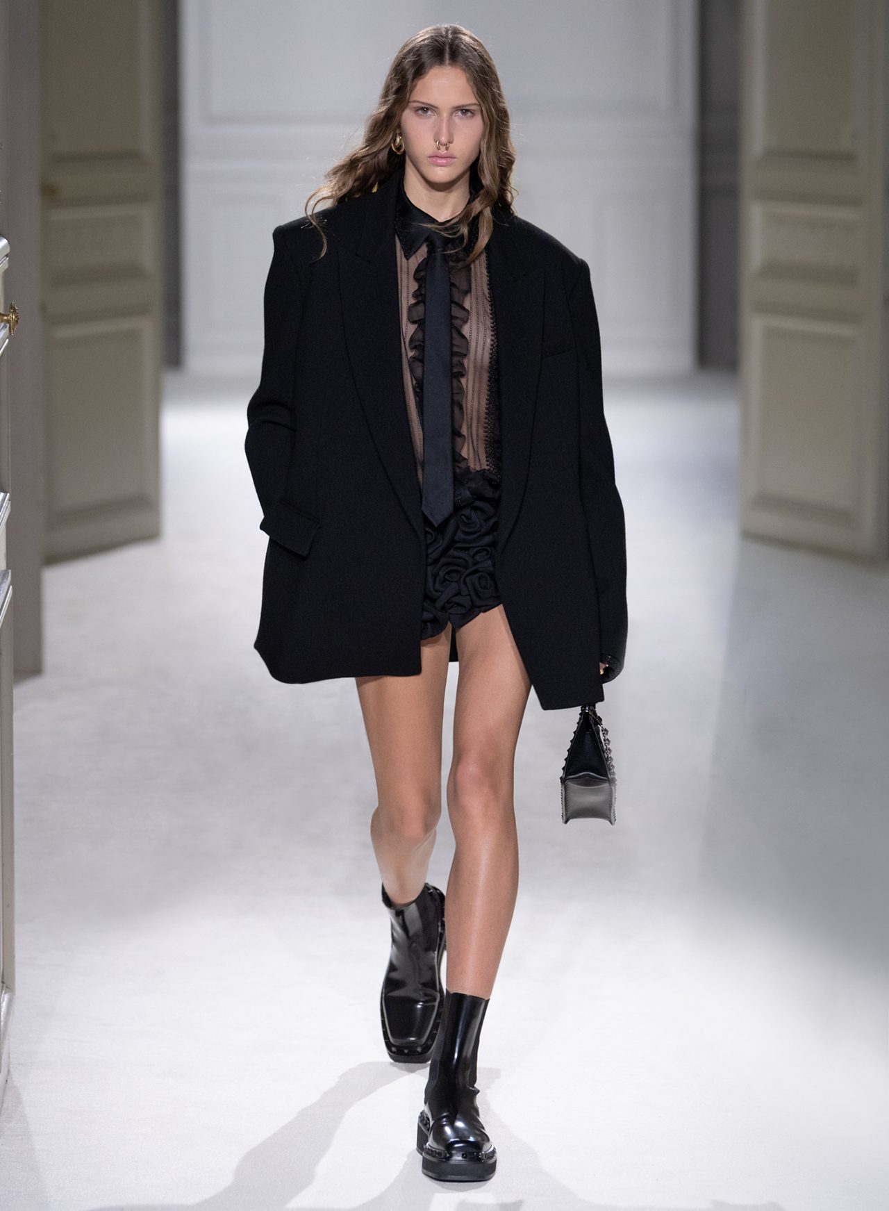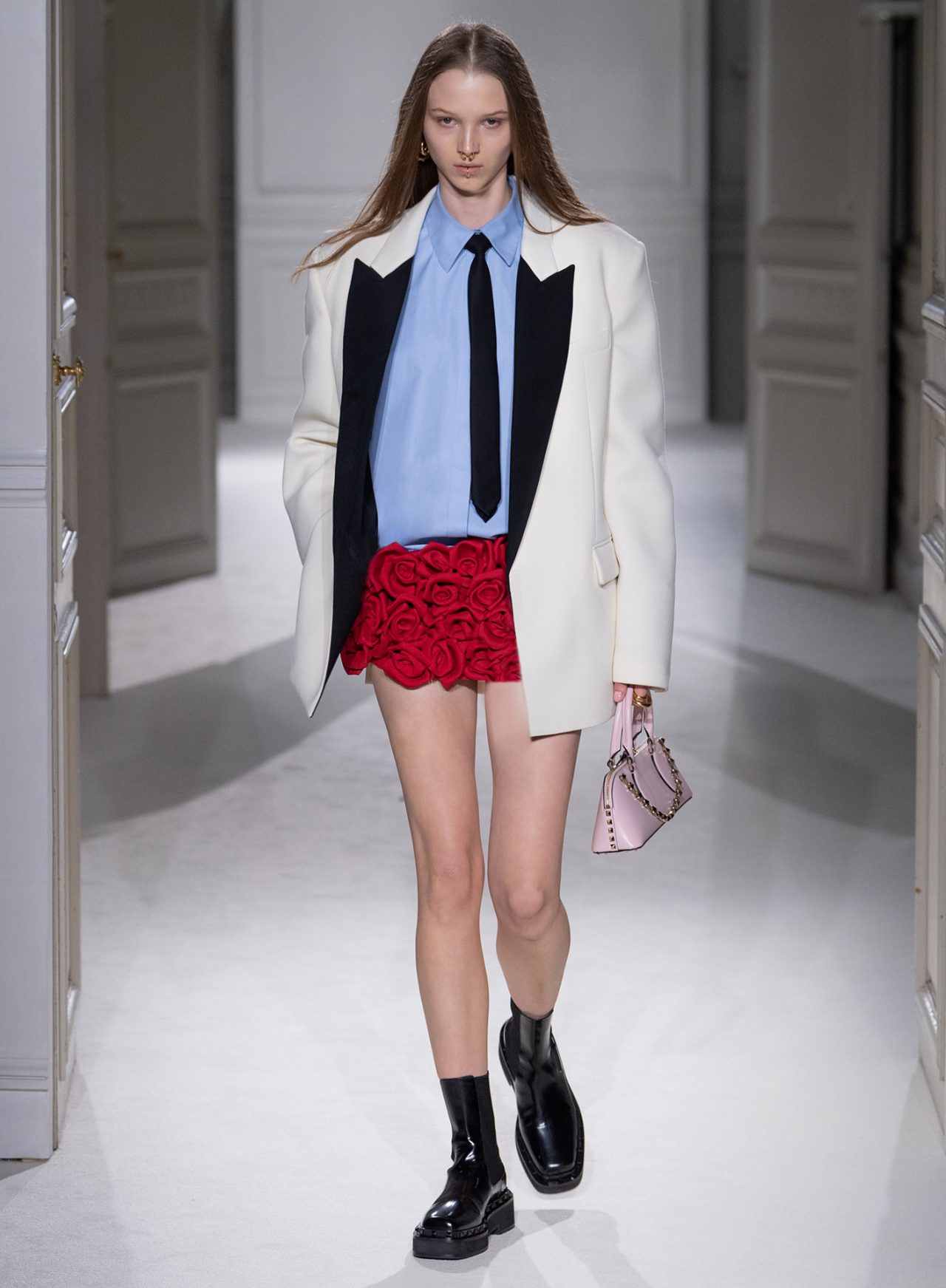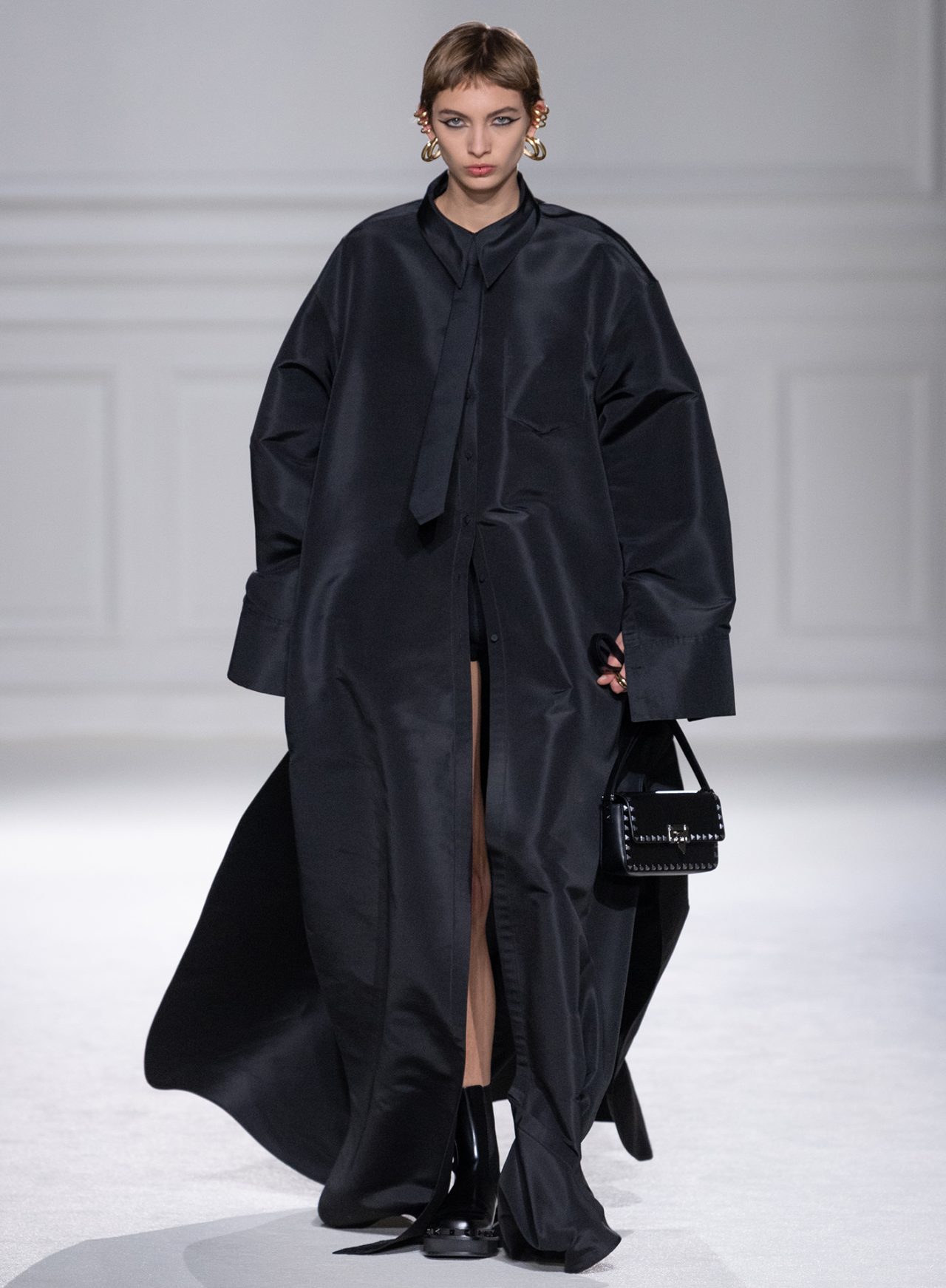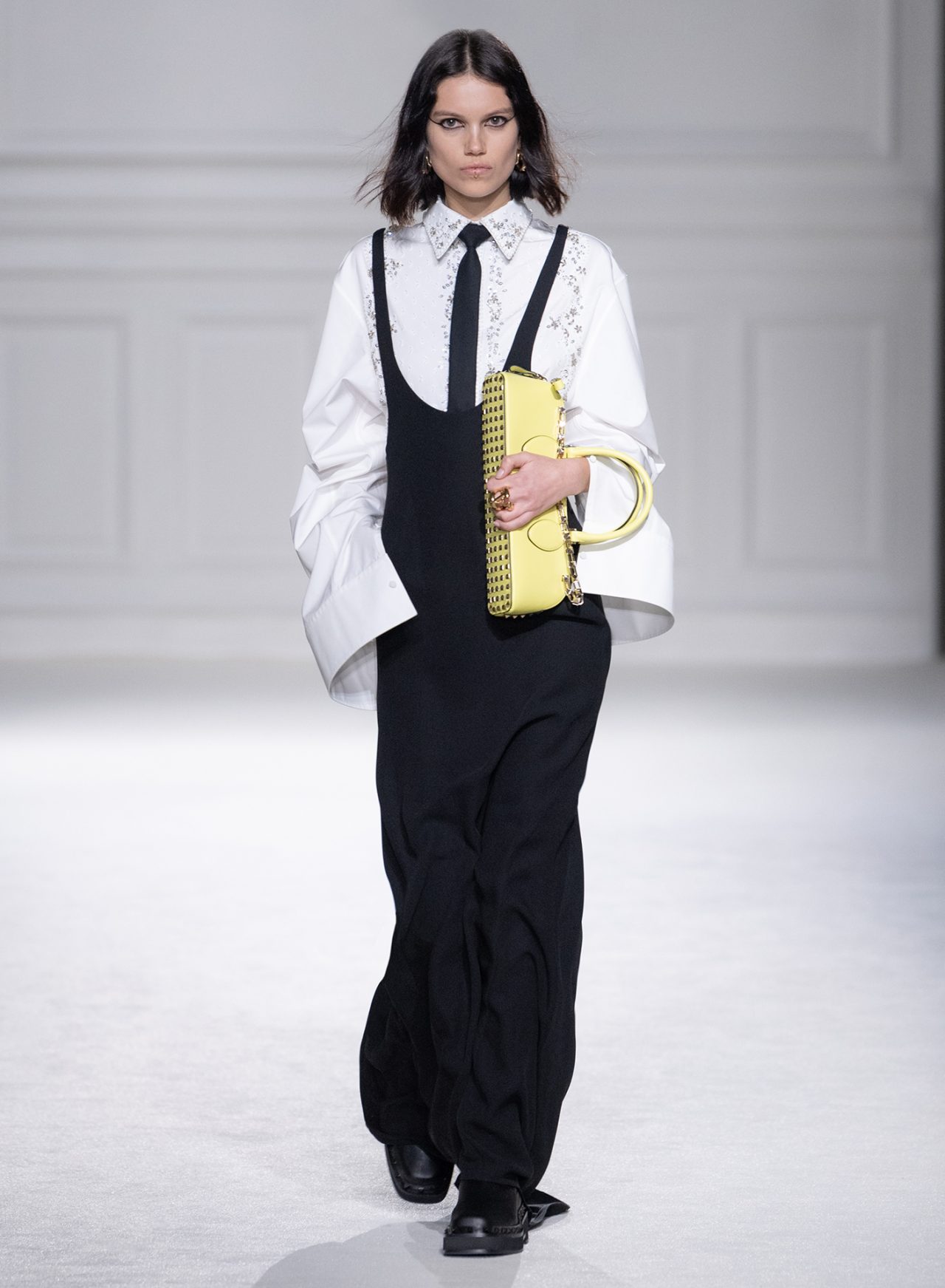 ネクタイは、今シーズン様々なブランドでも着用されたトレンドのアイテム。Pierpaolo Piccioli は、日常から引き出されるアイテムを中心に構築されるコレクションの比喩として、ブラックタイを文字通りに受け止め、表現した。
