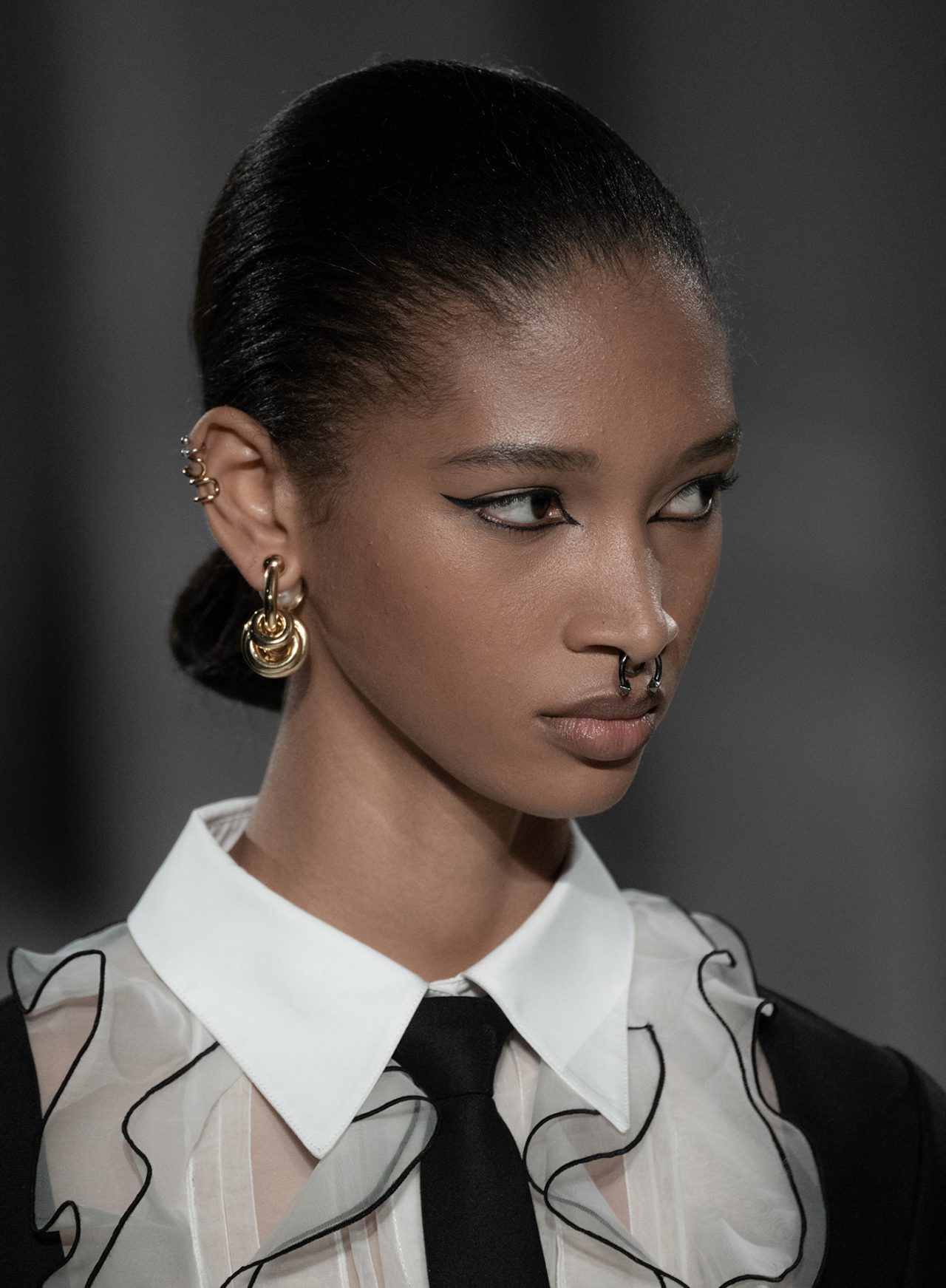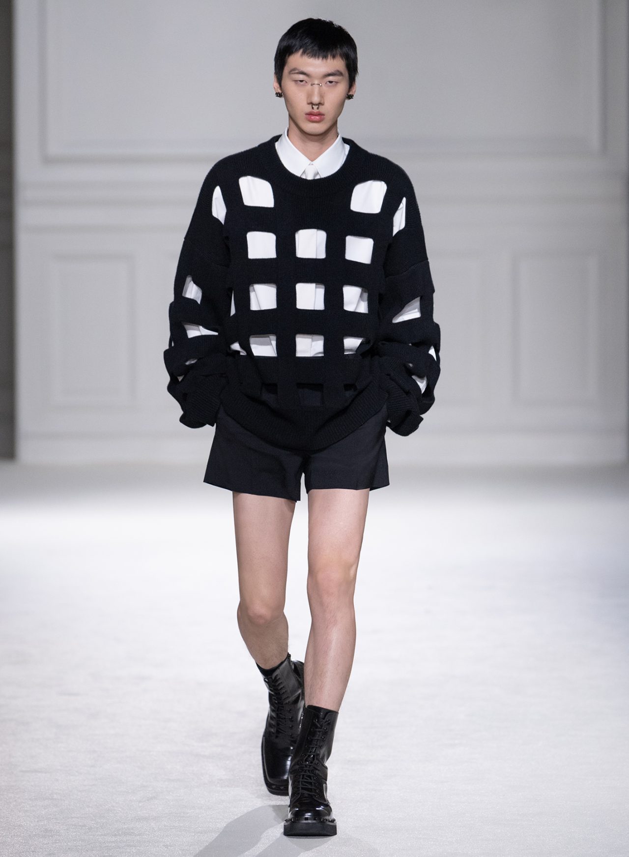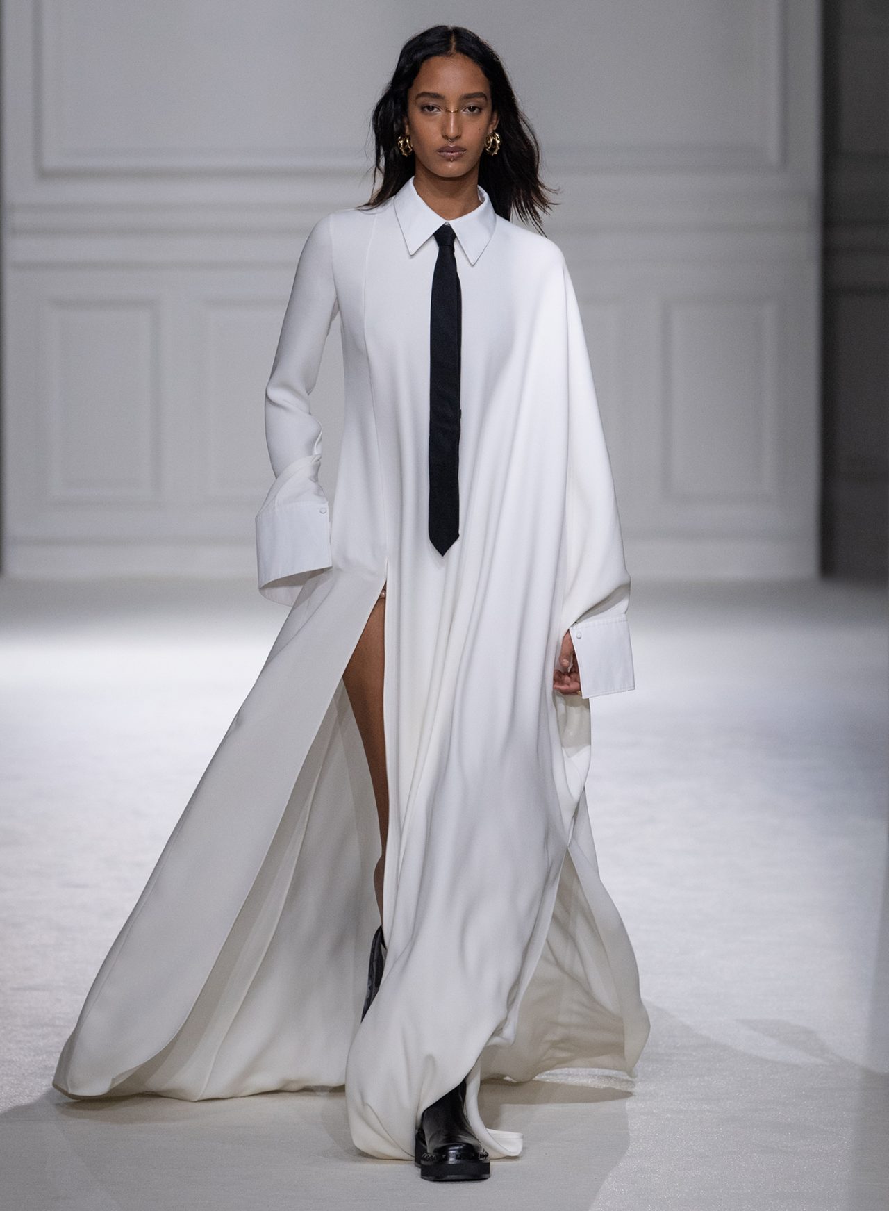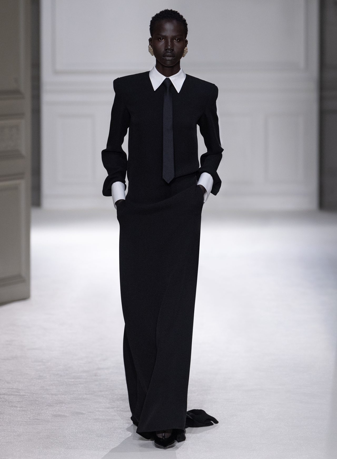 ネクタイは、今シーズン様々なブランドでも着用されたトレンドのアイテム。Pierpaolo Piccioli は、日常から引き出されるアイテムを中心に構築されるコレクションの比喩として、ブラックタイを文字通りに受け止め、表現した。