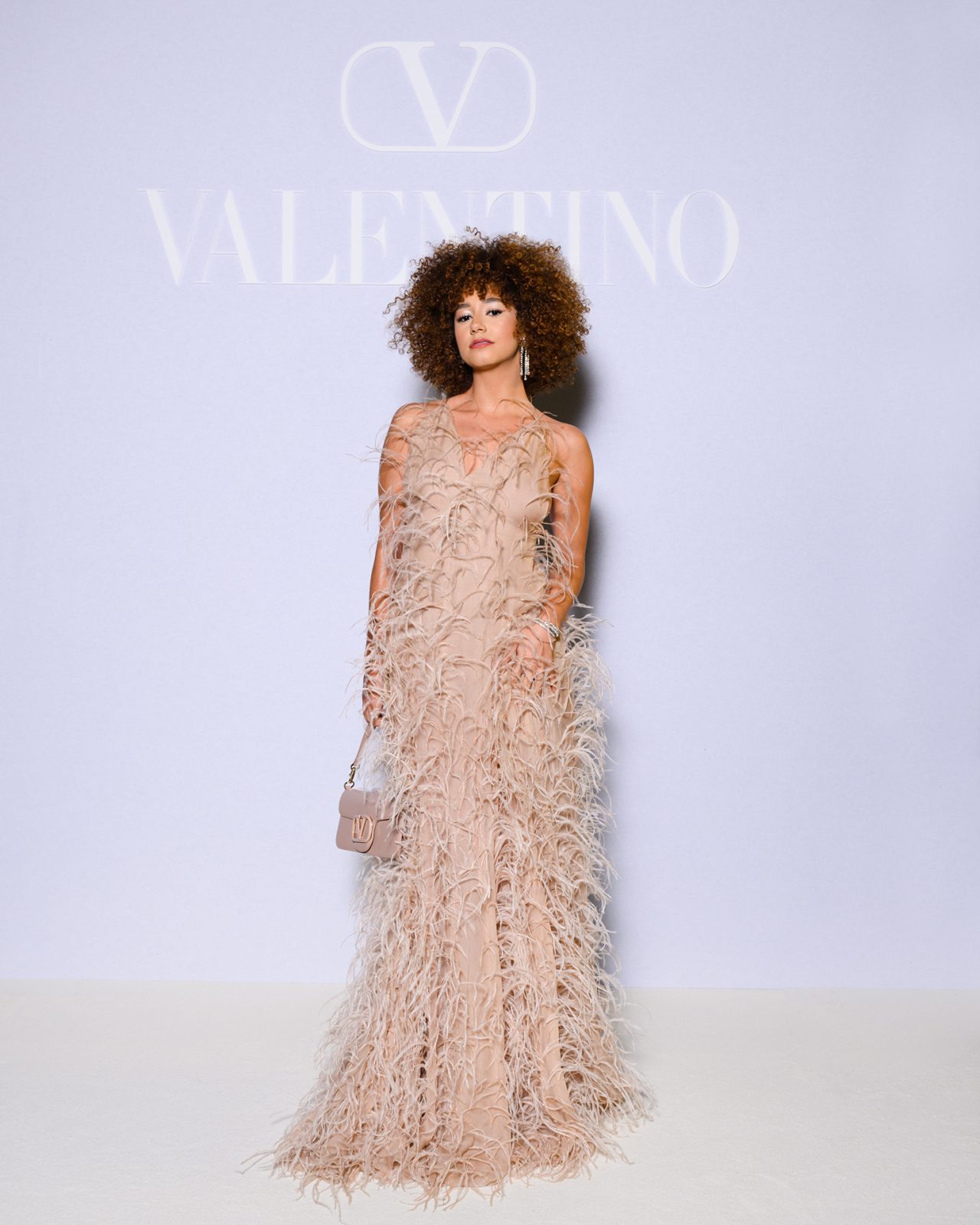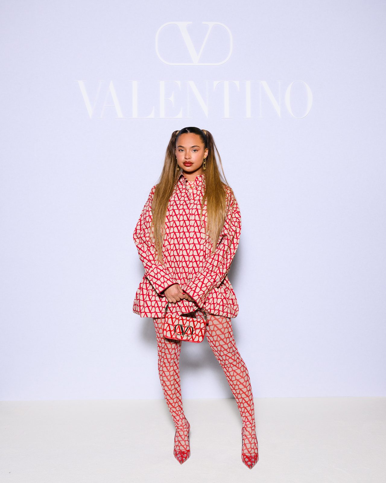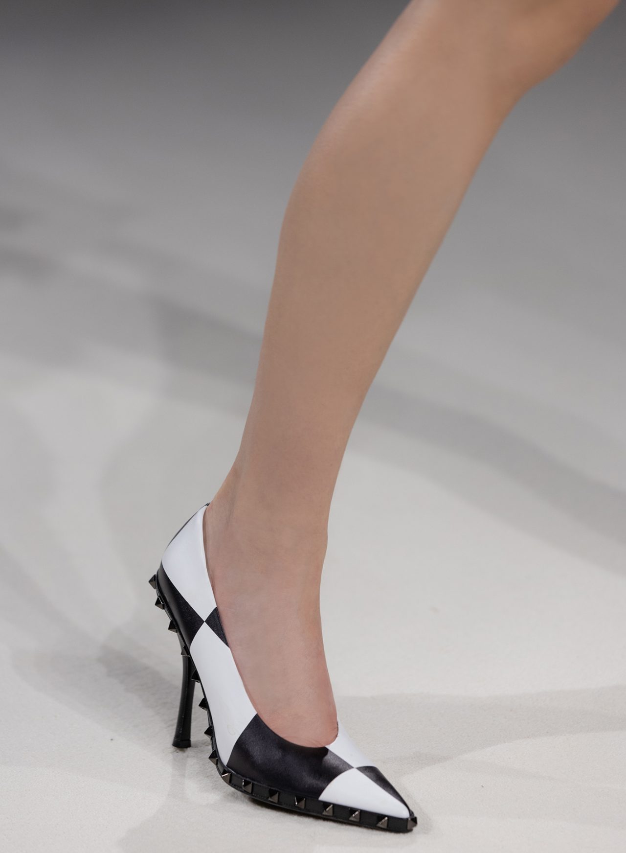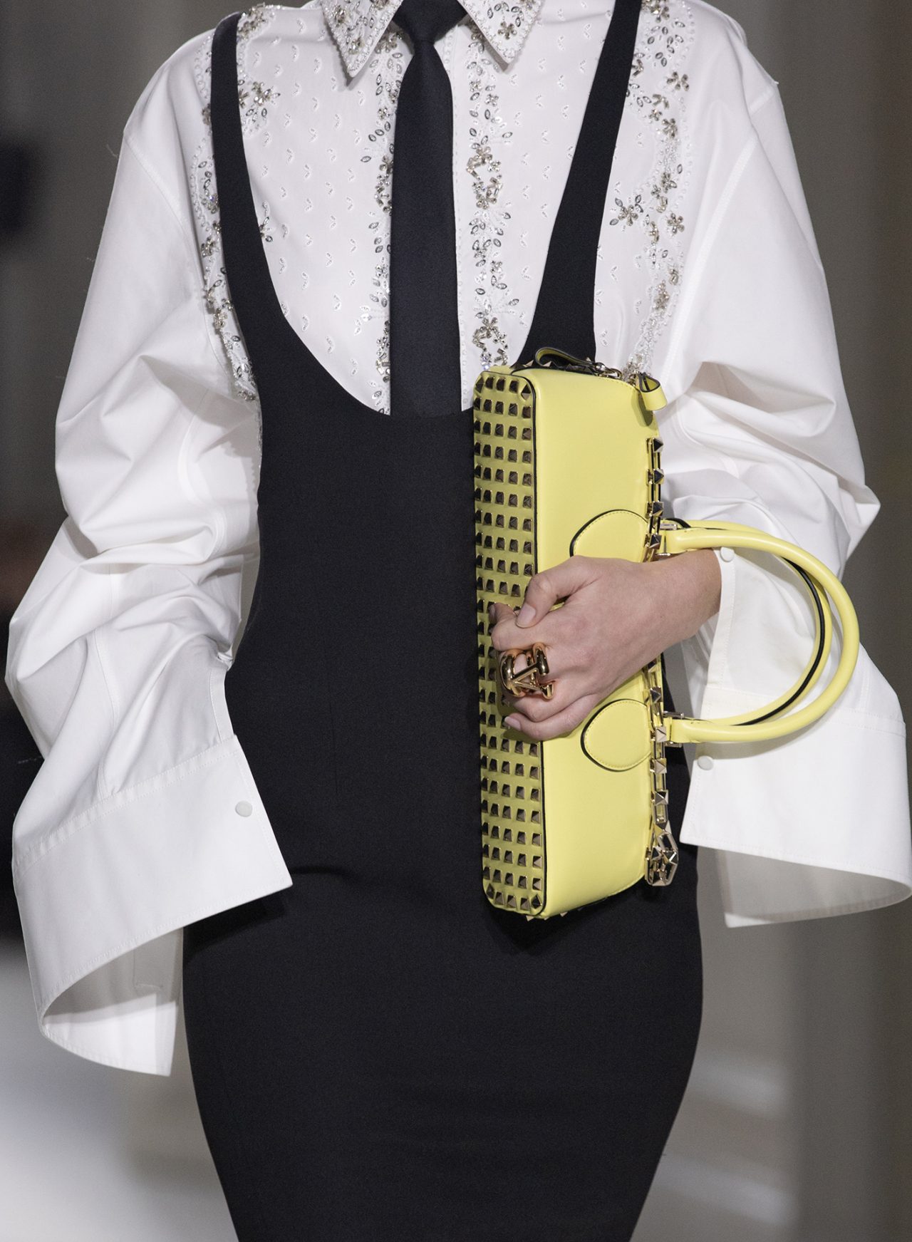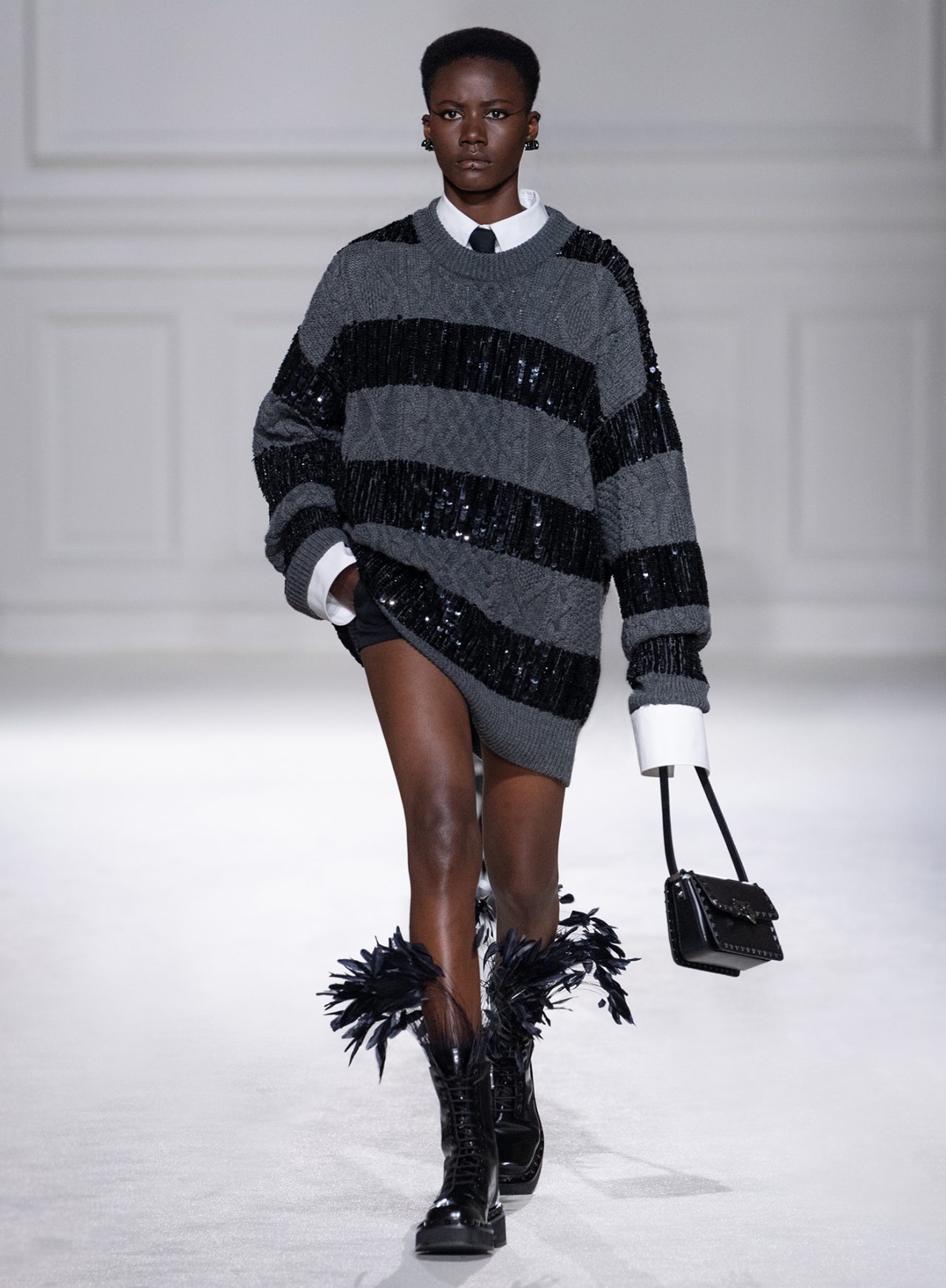 ブラック、ホワイトの他にイエロー、レッド、ピンク、グリーンといった、モノトーンに映えるカラーパレットが採用された。レッドのリボンを繋ぎ合わせたようなウェアは、ブルーのシャツドレスと合わせて着用することで、フェミニンに寄りすぎず、色のコントラストのバランスが取れたコーディネートとなった。細かなスパンコールやビジューがぎっしりと刺繍されたミニドレスやマイクロミニスカートは、細部までこだわった Valentino のクラフトマンシップが表れている。