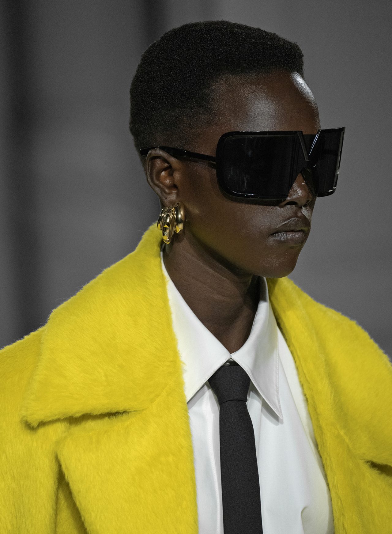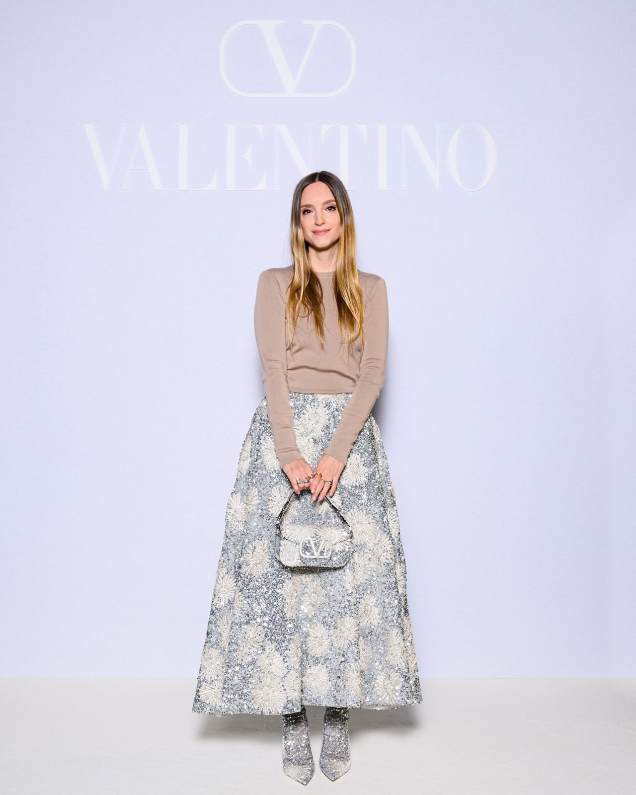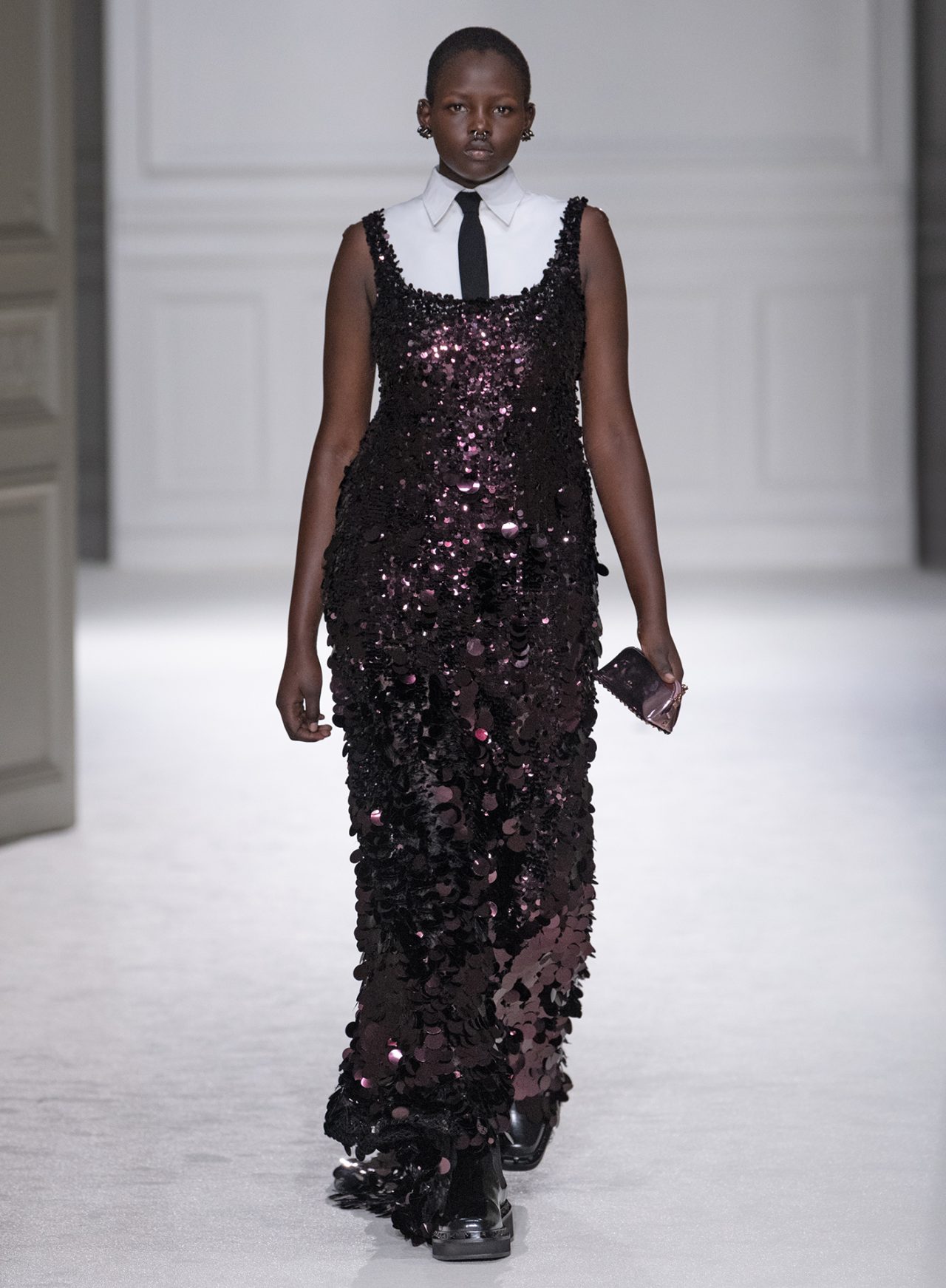フィナーレに登場したルックは、眩いほどのスパンコールがあしらわれたグラデーションのマーメイドスカートで、圧倒的な存在感を放っていた。オーバーサイズのシャツにブラックのネクタイというシンプルなトップスゆえに、よりスカートの美しさが際立っている。モデルが歩くたびに揺れるスパンコールと流れるような曲線を描くシルエットは、Pierpaolo Piccioli のこだわりが詰まっており、コレクションのラストを飾るにふさわしいルックだった。
