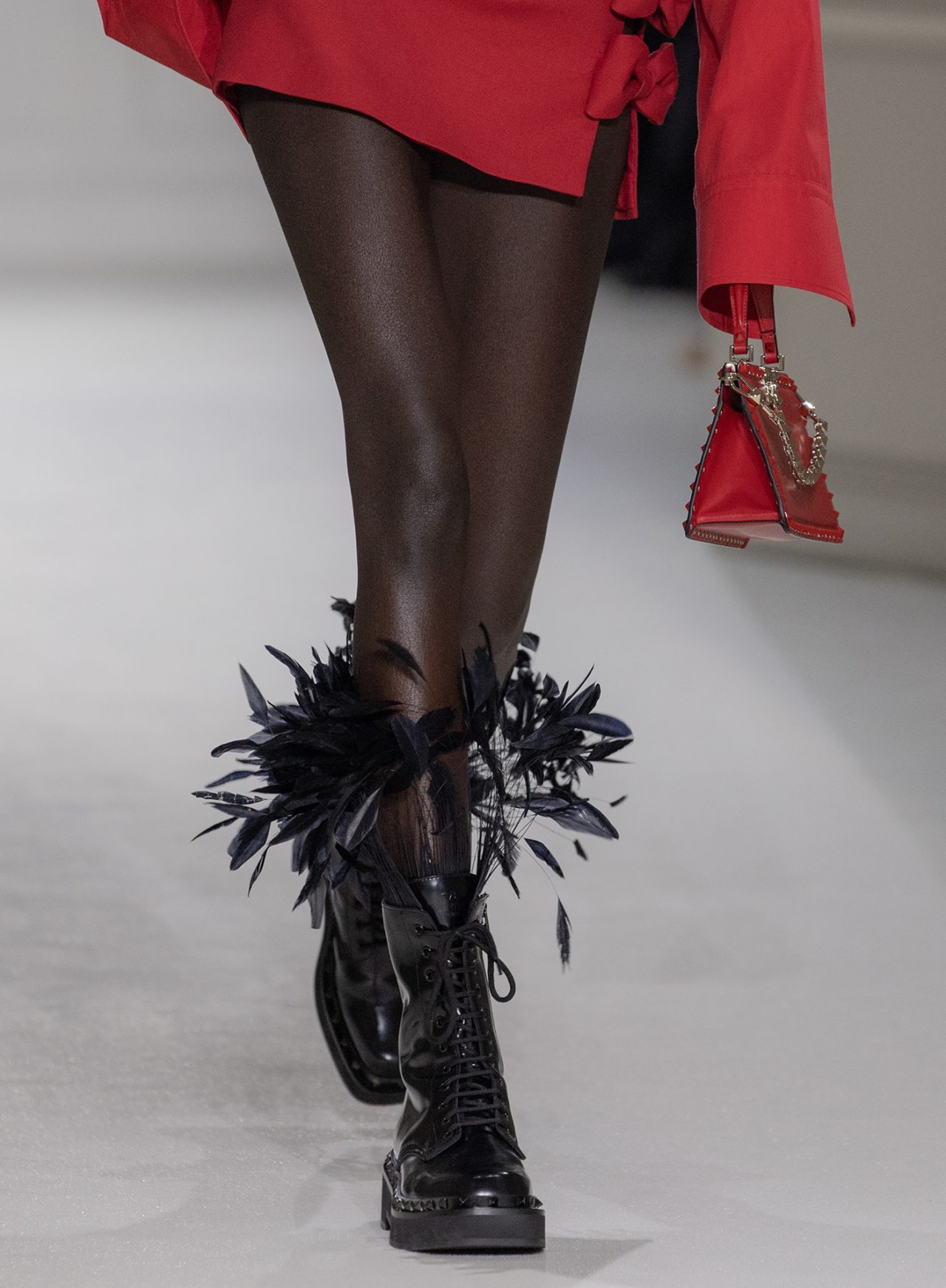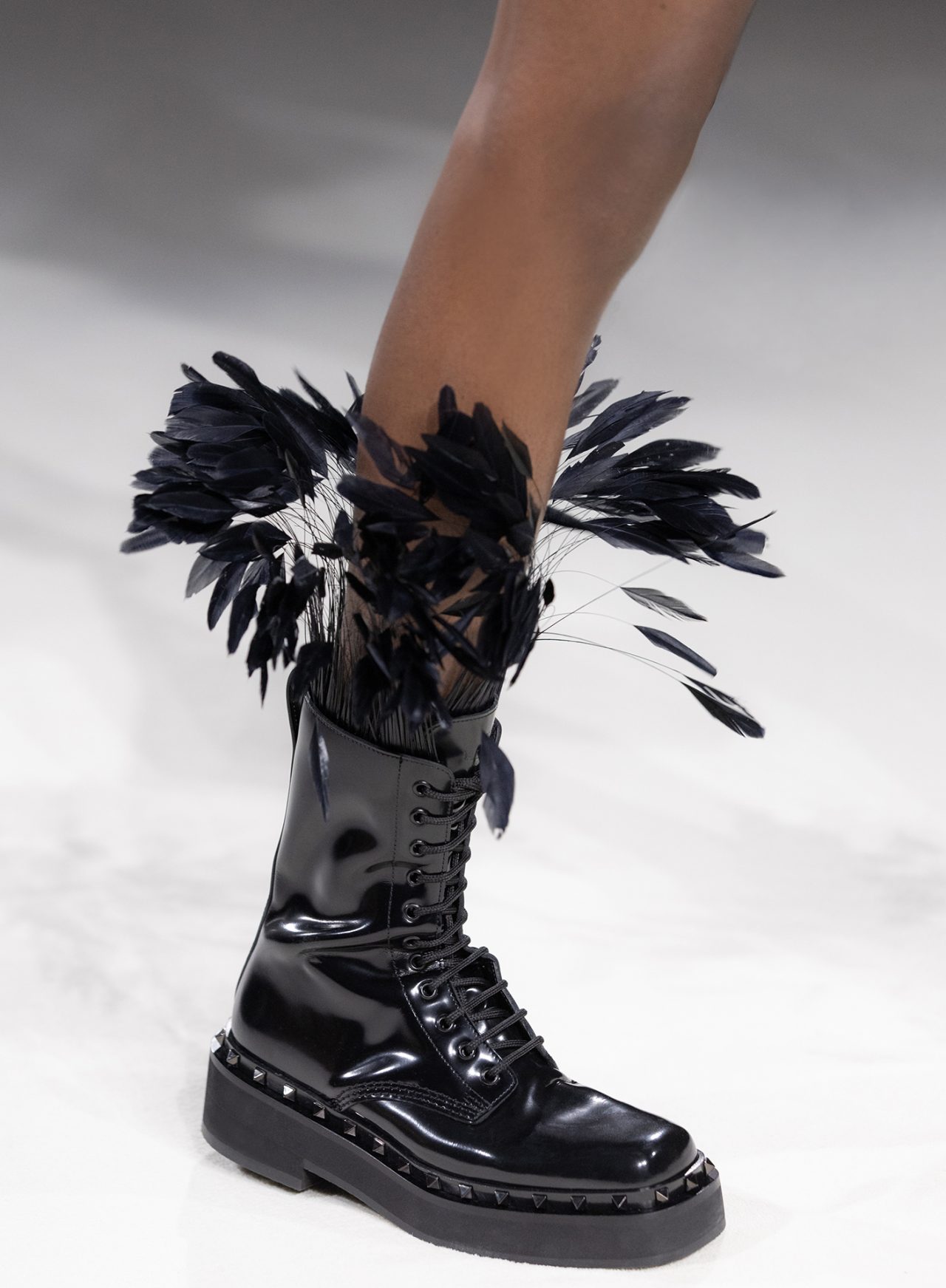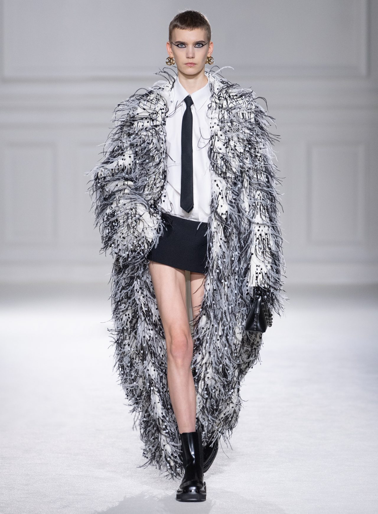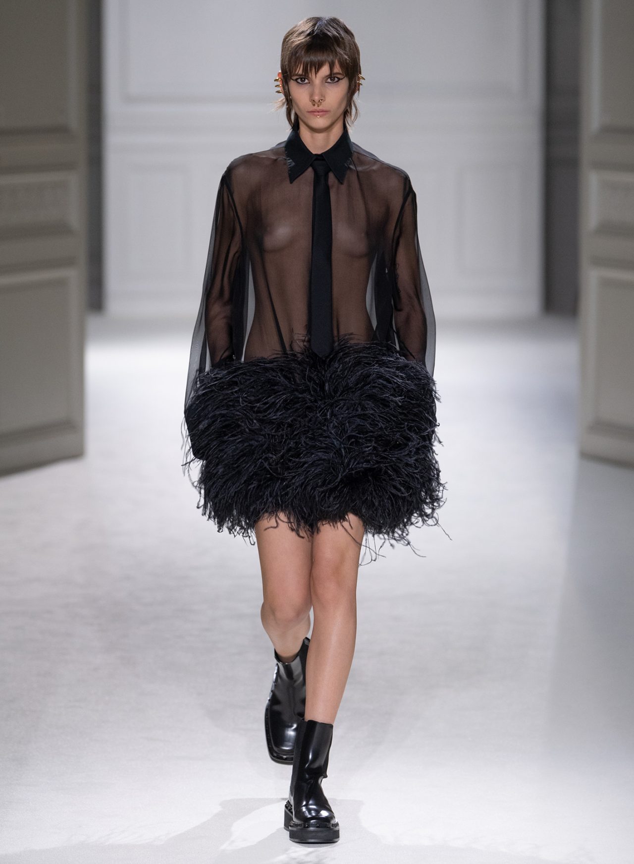続くルックもマスキュリンなブラックタイはそのままだが、伝統的なテーラリングのフォーマルウェアは登場していない。ミニ丈のボトムスや、裾が床を引きずるほど長いロングガウンなど、Pierpaolo Piccioli らしい個性を強調したルックが登場した。フェザーやフリル、レース、ビジューなどがあしらわれたアイテムの数々は、昨シーズンの「VALENTINO LE CLUB COUTURE (ヴァレンティノ ル クラブ クチュール)」で発表された、ナイトクラブルックを彷彿とさせる。