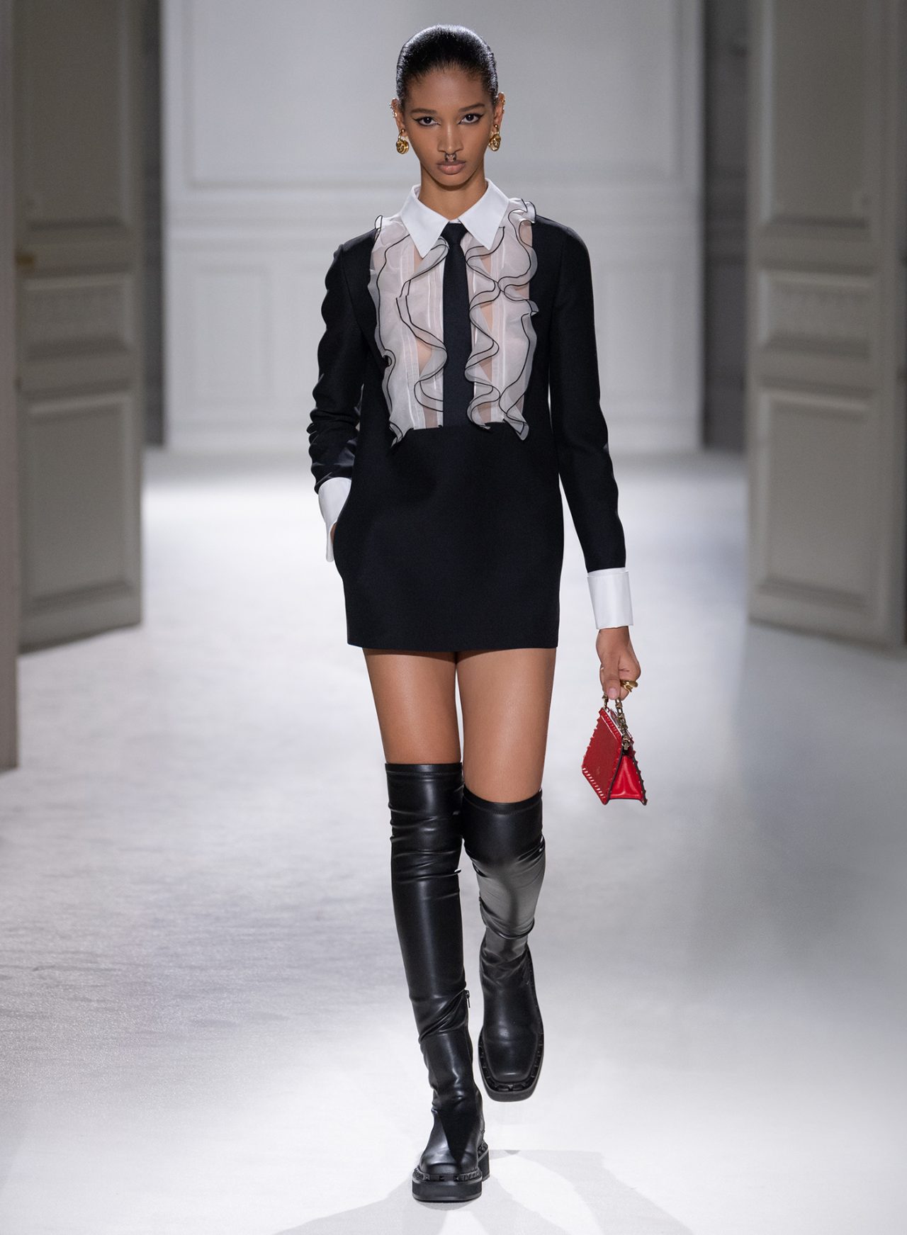 ファーストルックで登場したのは、ネクタイがドッキングしたホルターネックのブラックミニドレス。ホワイトの襟がネクタイのシルエットを際立たせながら、デコルテや肩部分を見せることで、女性らしさをプラスした。スタッズが施されたバッグや重ためのチェルシーブーツ、存在感のあるアクセサリーを合わせることで、パンキッシュな印象に。