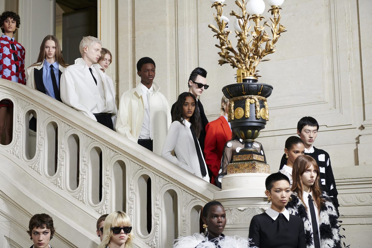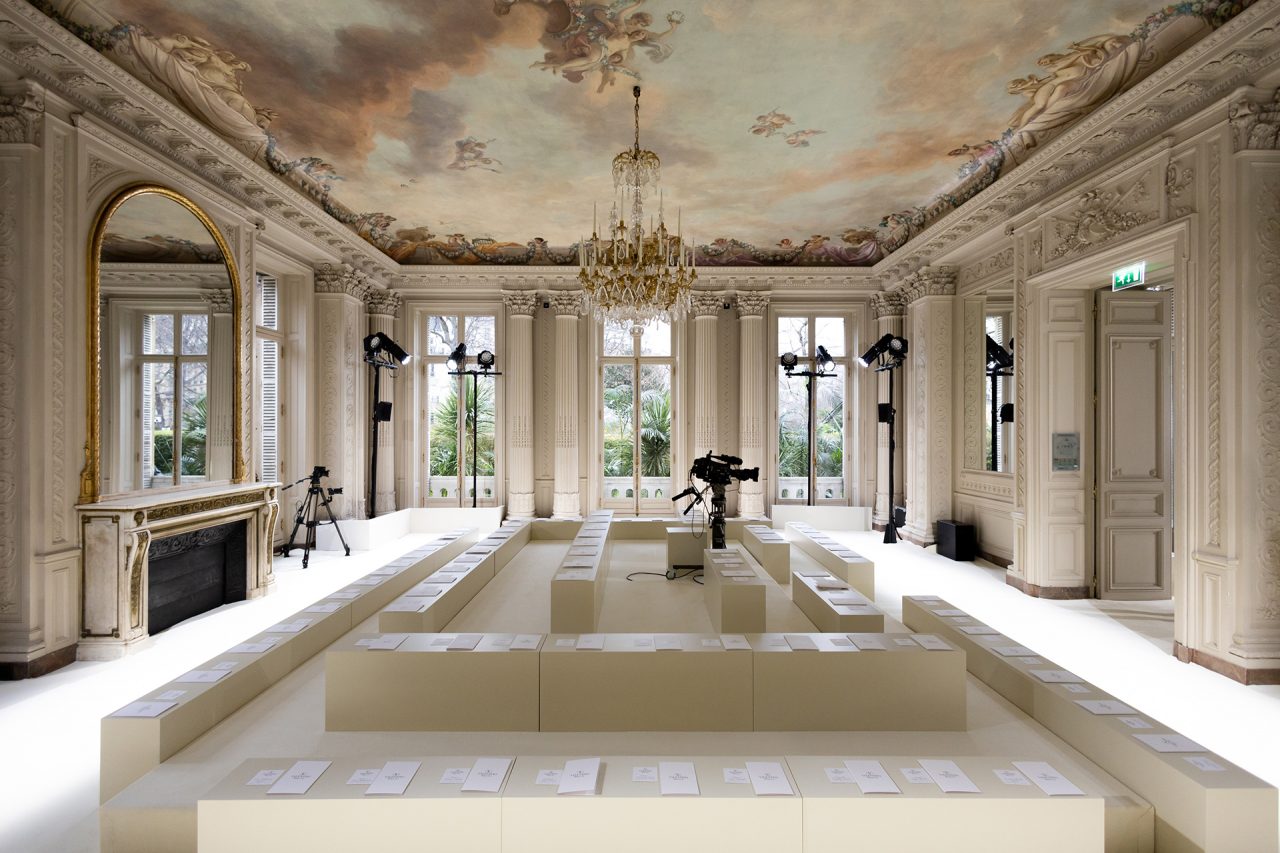 会場となったのは、パリにあるホテル・サロモン・ド・ロスチャイルド。ブリストル・サウンドの伝説的バンド Massive Attack (マッシブ・アタック) のメンバー Robert Del Naja (ロバート・デル・ナジャ) のサウンドトラックが流れてショーは始まった。ホワイトカラーを基調としたロココ調のランウェイに現れたモデルは、ピアス、タトゥー、ブラックタイを身につけたパンクスタイルで、会場とのコントラストを強調した。