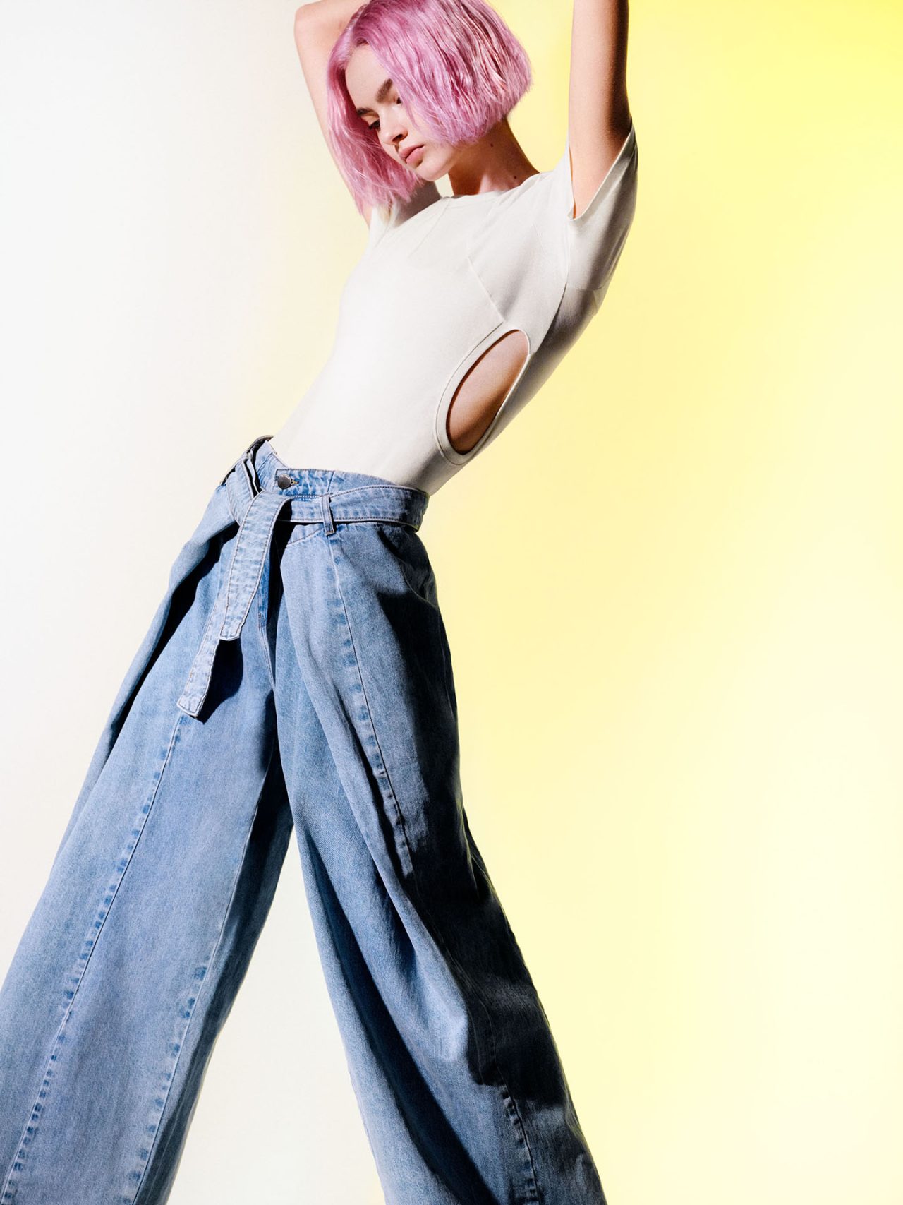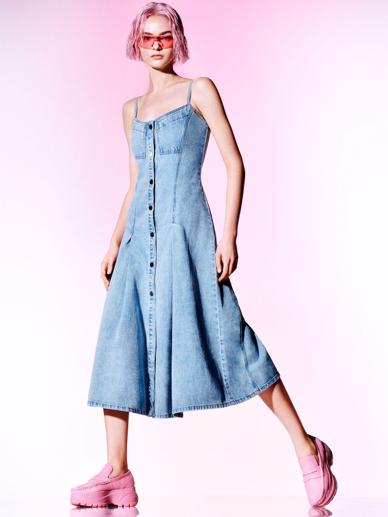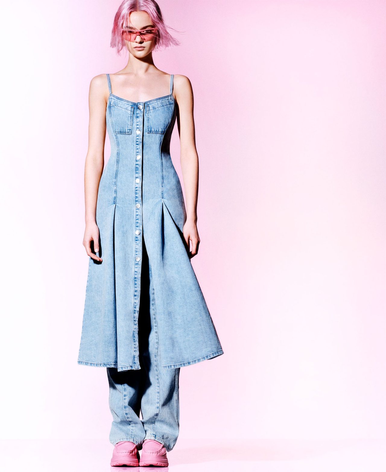 Desigual は、創業者の Thomas Meyer (トーマス・メイヤー) が、デニムパンツをリメイクしてジャケットを作ったことから始まった。本コレクションでもキーポイントとなる素材の一つであるデニムは、さまざまなシルエットでお目見え。スナップボタンをつけるとポンチョにもなる、マルチポジションのジャケットとストレートパンツは、ペールピンクのカラーパレットで春らしい印象に。また、爽やかなスノーウォッシュデニムで作られたウェアも登場し、フロントボタンが印象的なストラップドレスや、ベルトを結んだり外したりして2種類のシルエットを楽しむことができるスーパーワイドレッグのパンツが展開された。