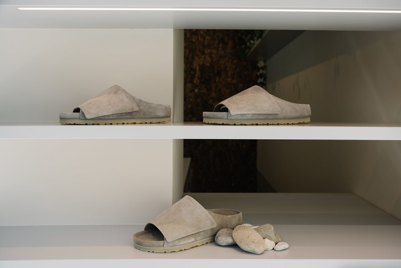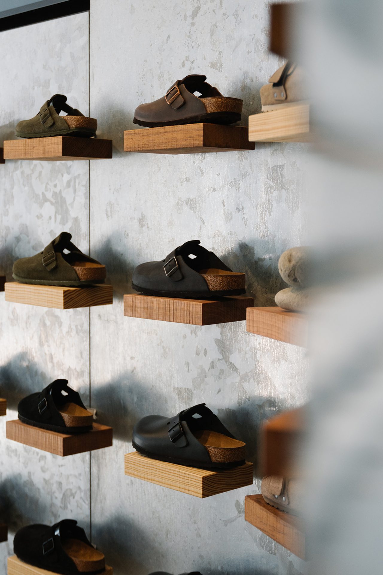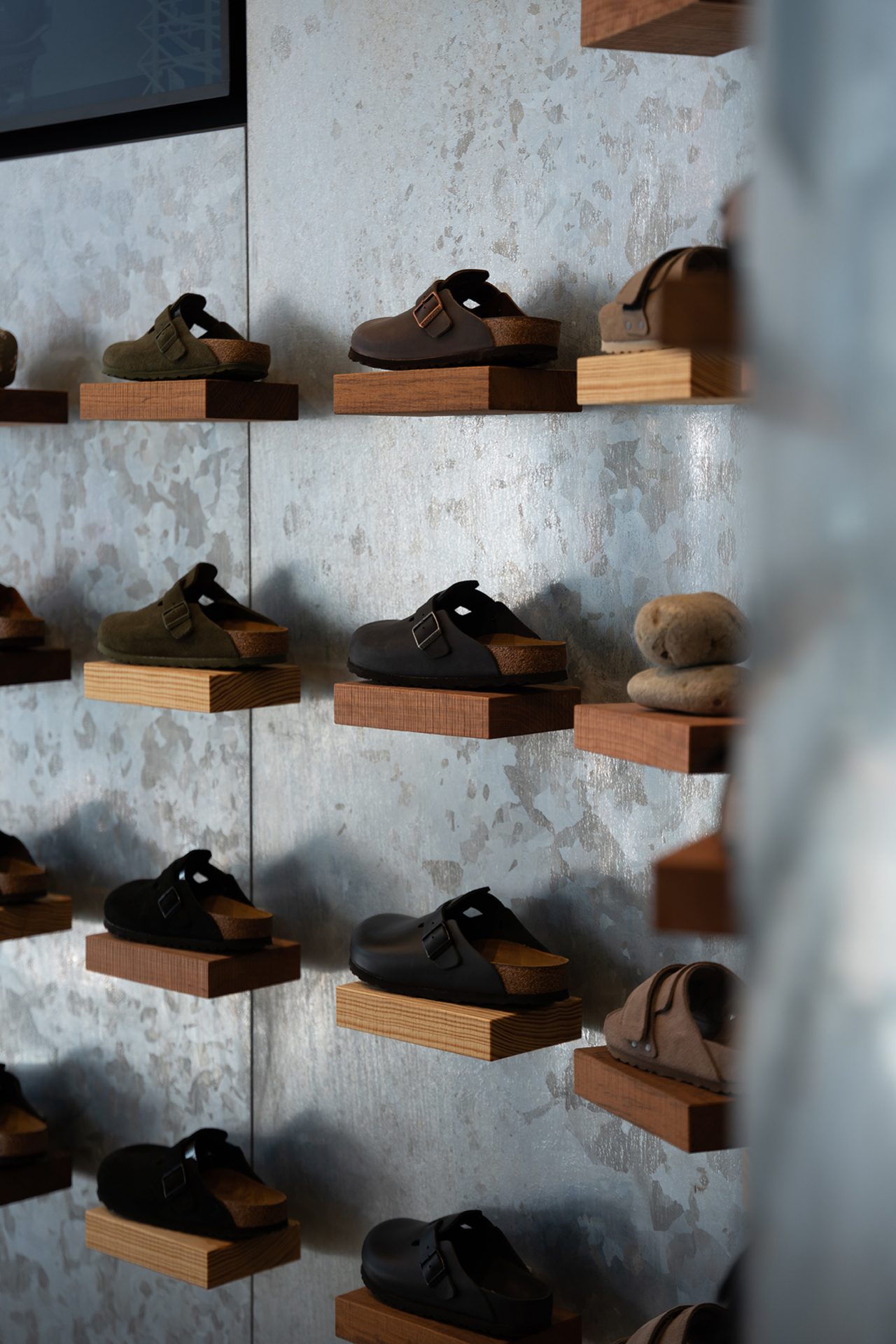 ショップの奥に進むと、210cmの巨大なフットベッドが飾られ、商品にも使用される上質なレザーを使ったベンチシートが出現。キャッシャー横の壁面には、BIRKENSTOCK のアイコンでもあるコルクが使用されている。国内随一のバリエーションを取り揃え、ハイエンドライン「1774」が展開する、各ブランドとのコラボレーション等も見ることができる。