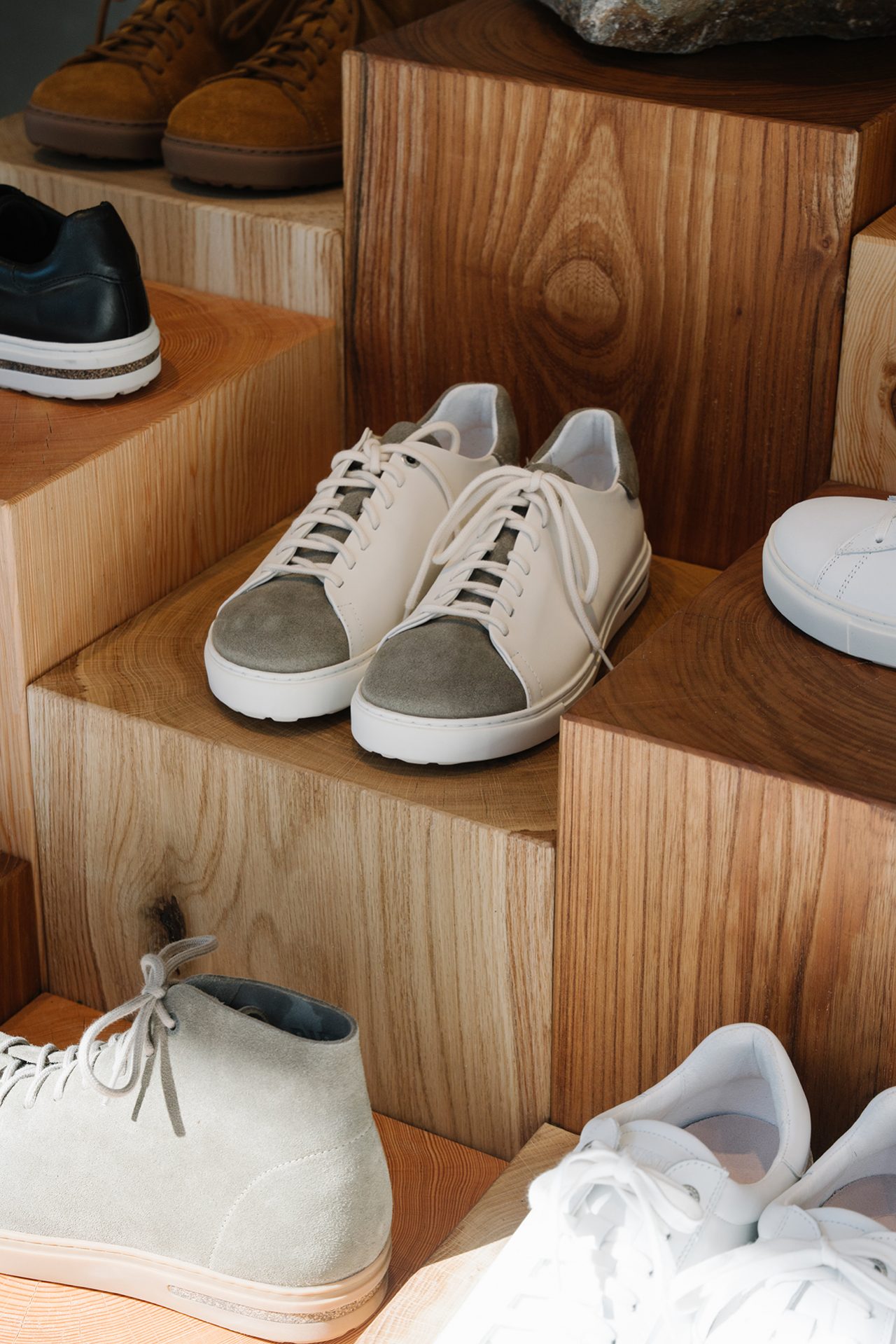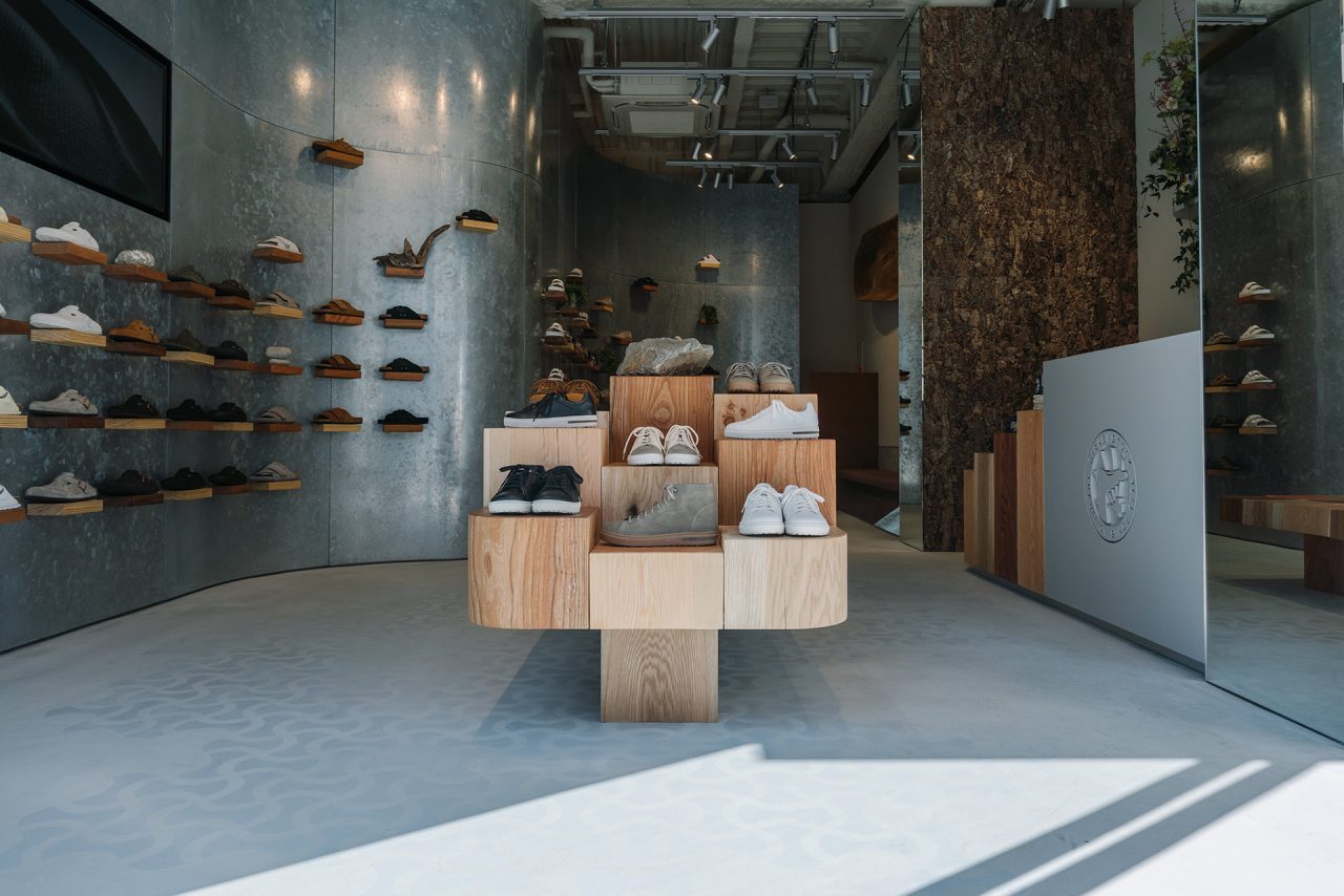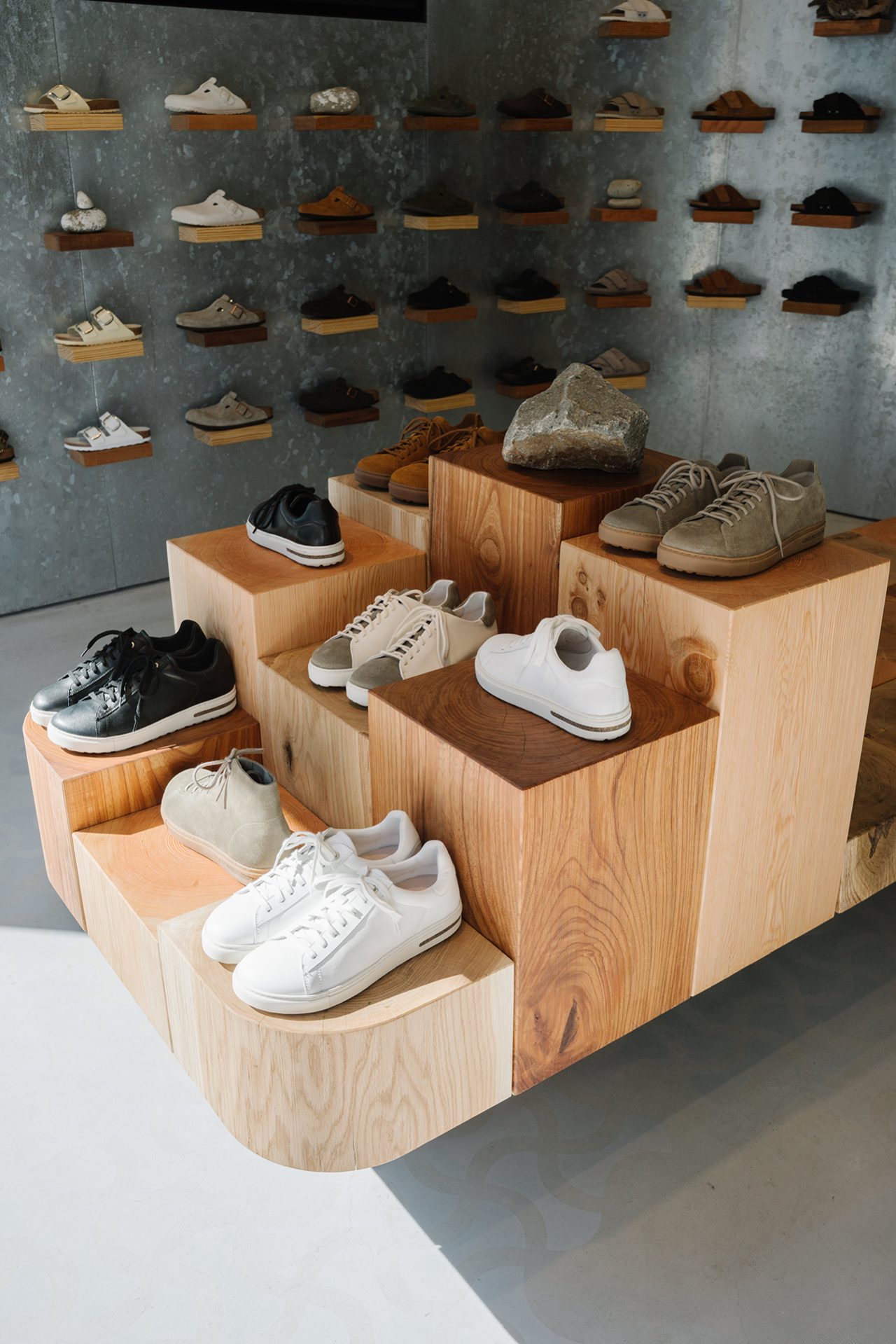 棚やディスプレイには、オーク、パイン、チークやケヤキといった木材を使用しており、木材を使用することで、BIRKENSTOCK のコンセプトを演出。ディスプレイとシーティングエリアを兼ねるウッドコーナーの足元のデザインは、ドイツの国の形に沿ってシューズのアウトソールに使用されている「ボーンパターン」があしらわれている。