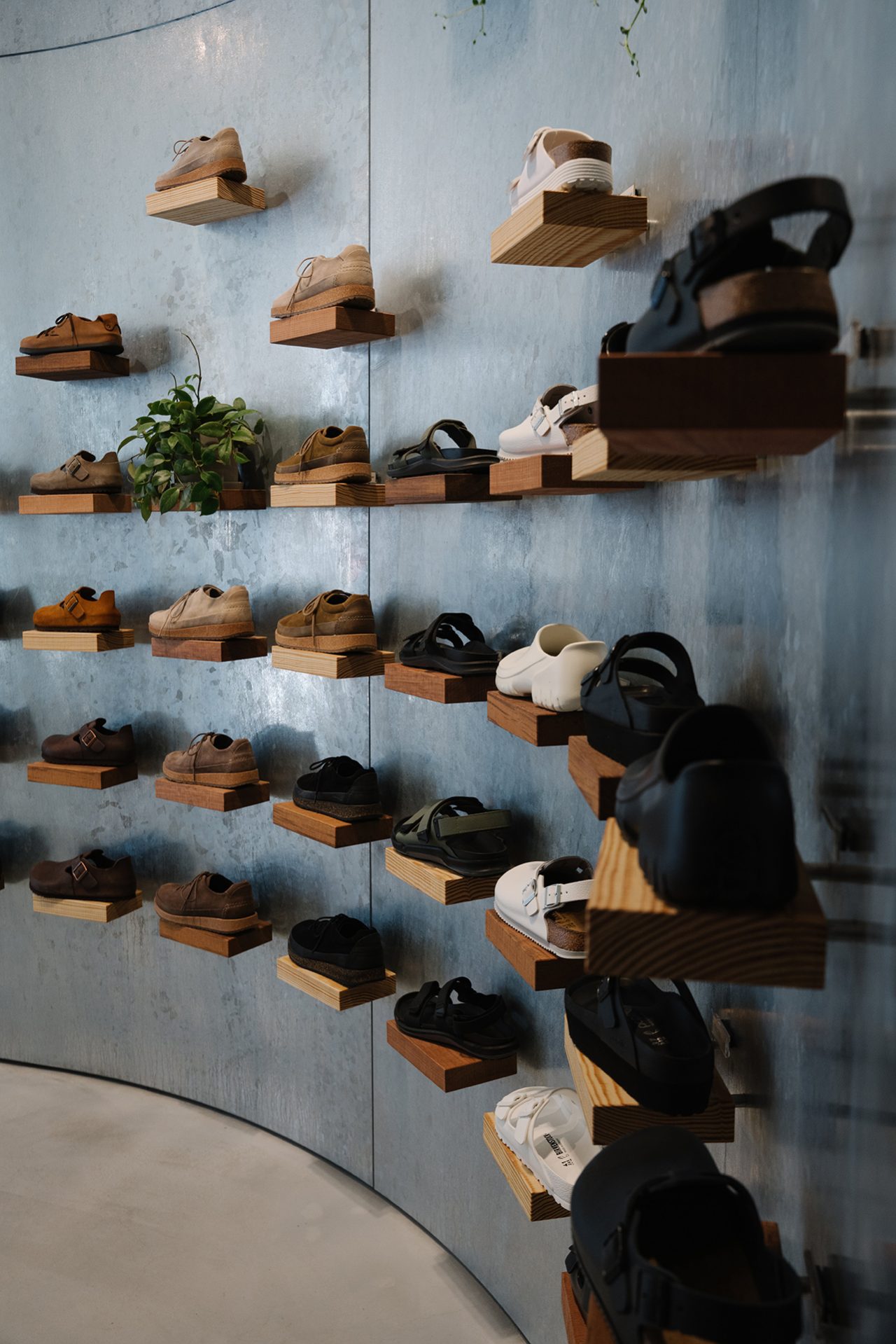 2023年よりビジネス戦略の一環として直営店舗の展開を始めており、年内に全7店舗のオープンを予定している。BIRKENSTOCK 原宿コンセプトストアに一歩足を踏みいれると、目に飛び込むのはブランドの DNA であるフットベッドのラインから着想を得てデザインされた、緩やかに湾曲したメタルのシューズウォール。原宿のユニークな都市のアーバンさも表現されている。