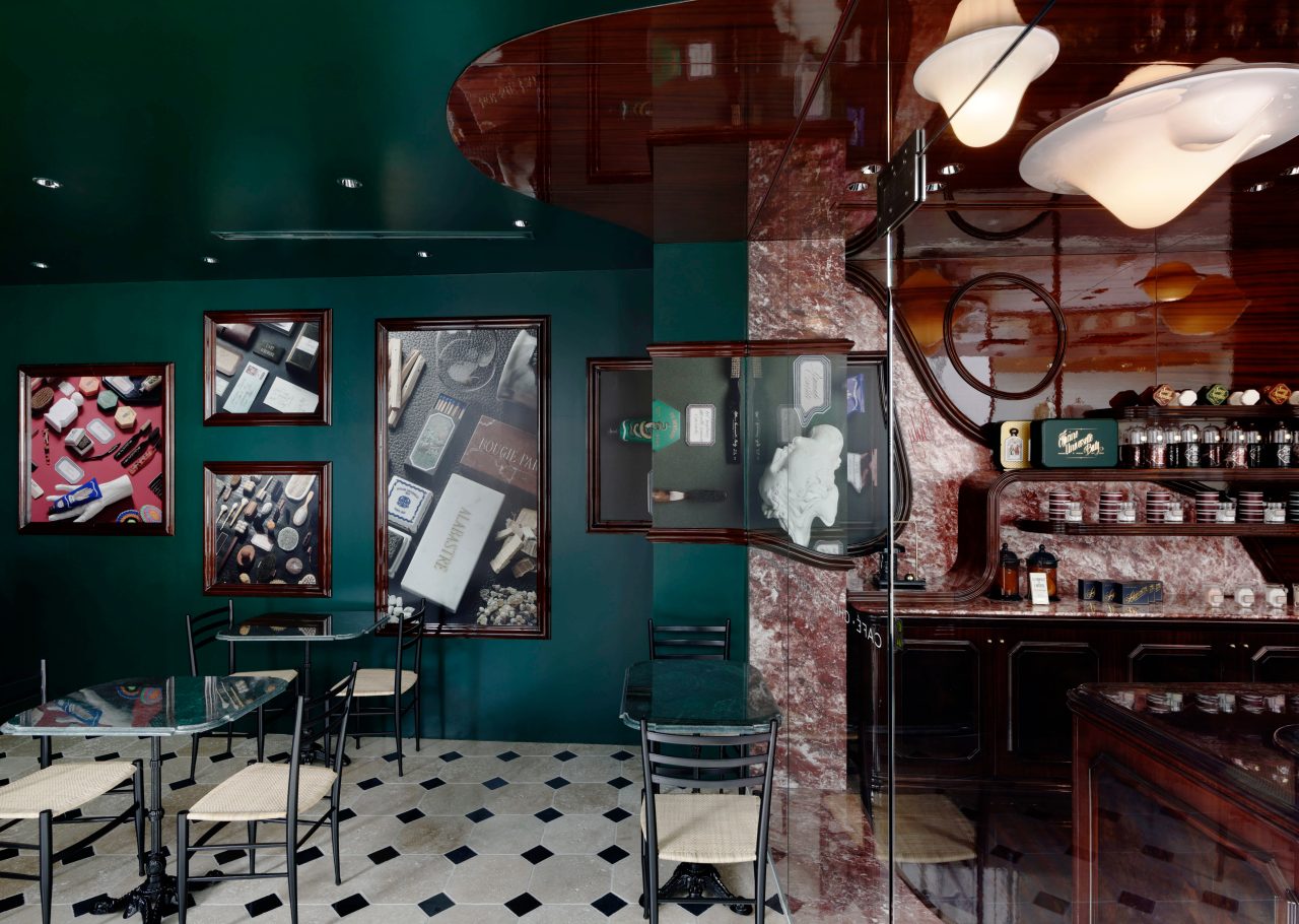 店内は、重厚なグリーンの壁と白い筋模様の入った赤大理石が特徴。アクセントとして、クラシックな照明や湾曲したカーブを持った棚を配した。また、クルミやナラといった貴重な木材をふんだんに使用したシェルフと、どっしりとした重量感のある贅沢な木製キャビネットは、ブルゴーニュ地方の家具職人が手がけ、ラッカー仕上げ、セラック塗装、浮き彫りの装飾にいたるまで、クラフトマンシップが光る美しい空間を作り出す。プレイフルなデザインと伝統的な要素が融合した空間は、新鮮な驚きをもたらしてくれる。