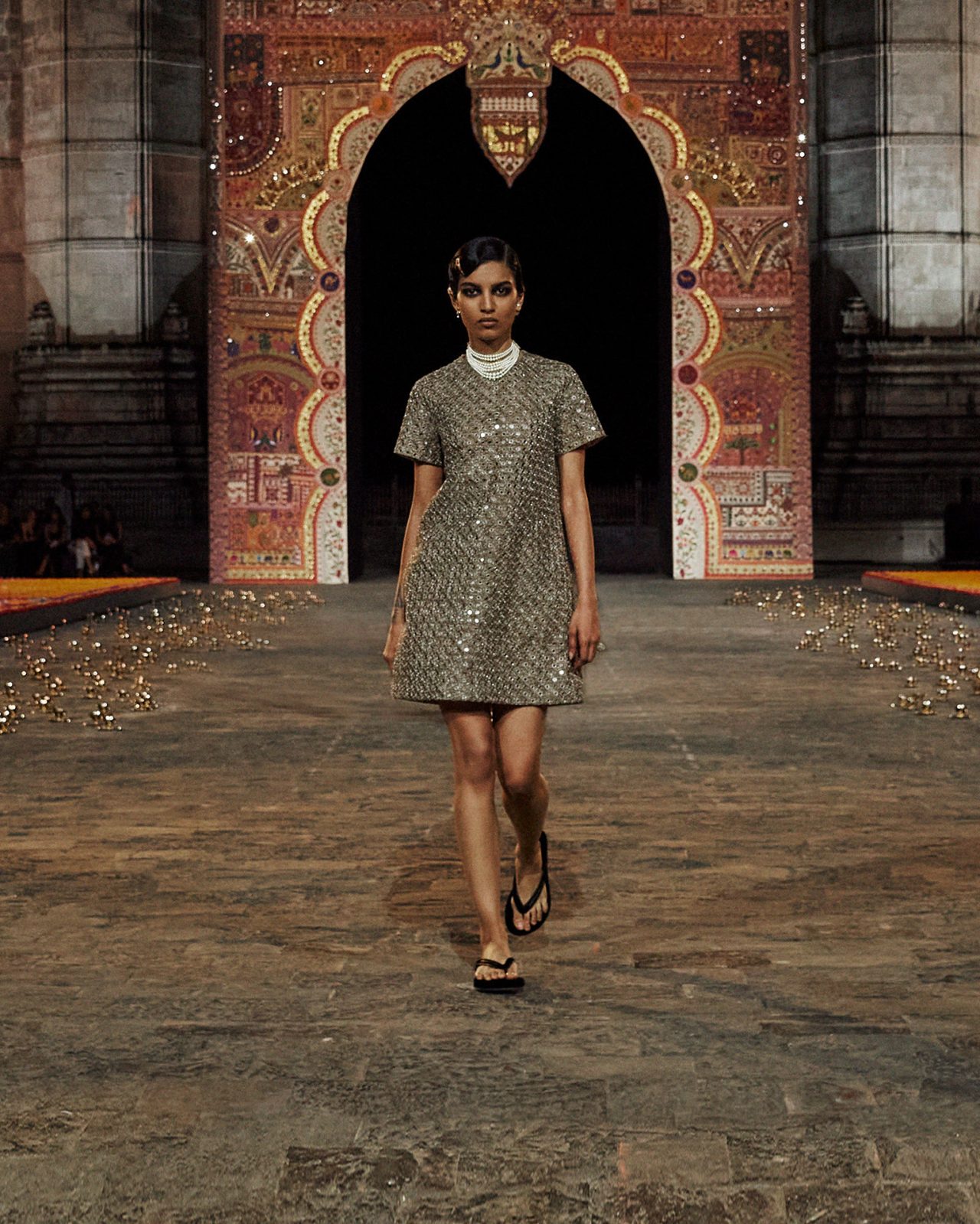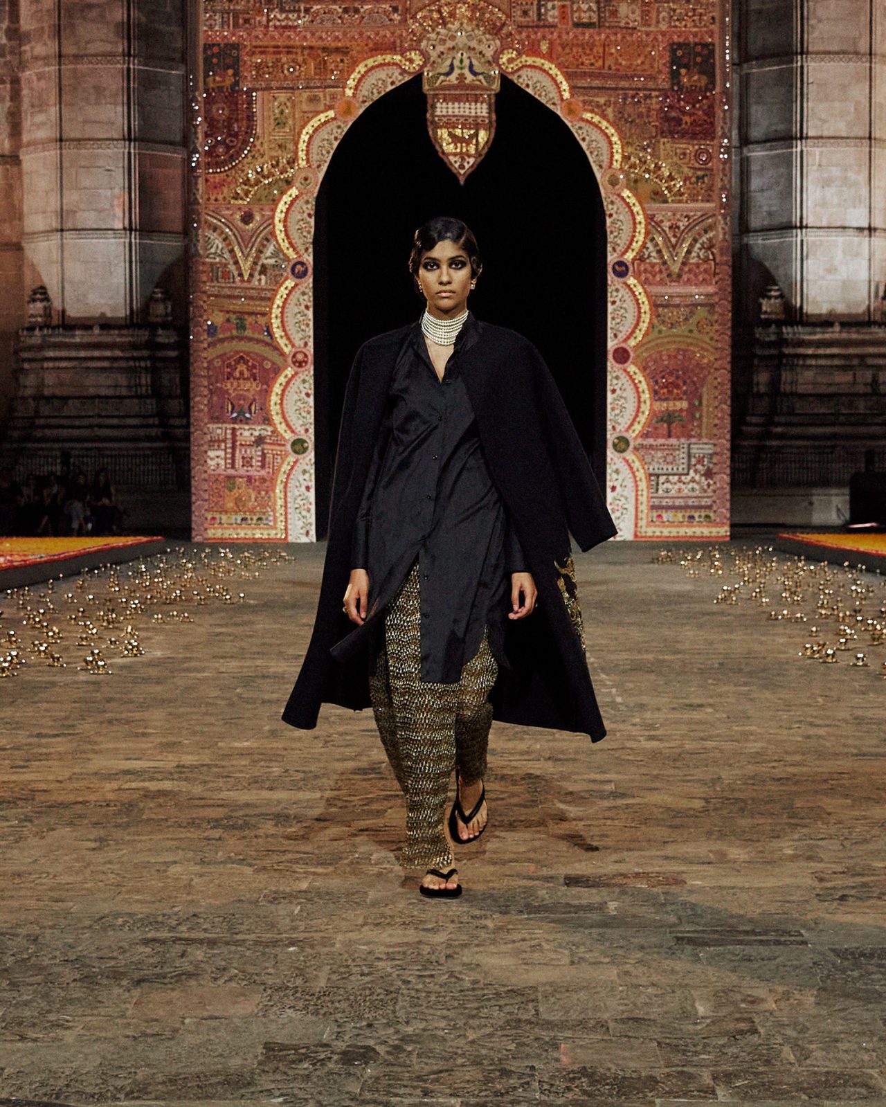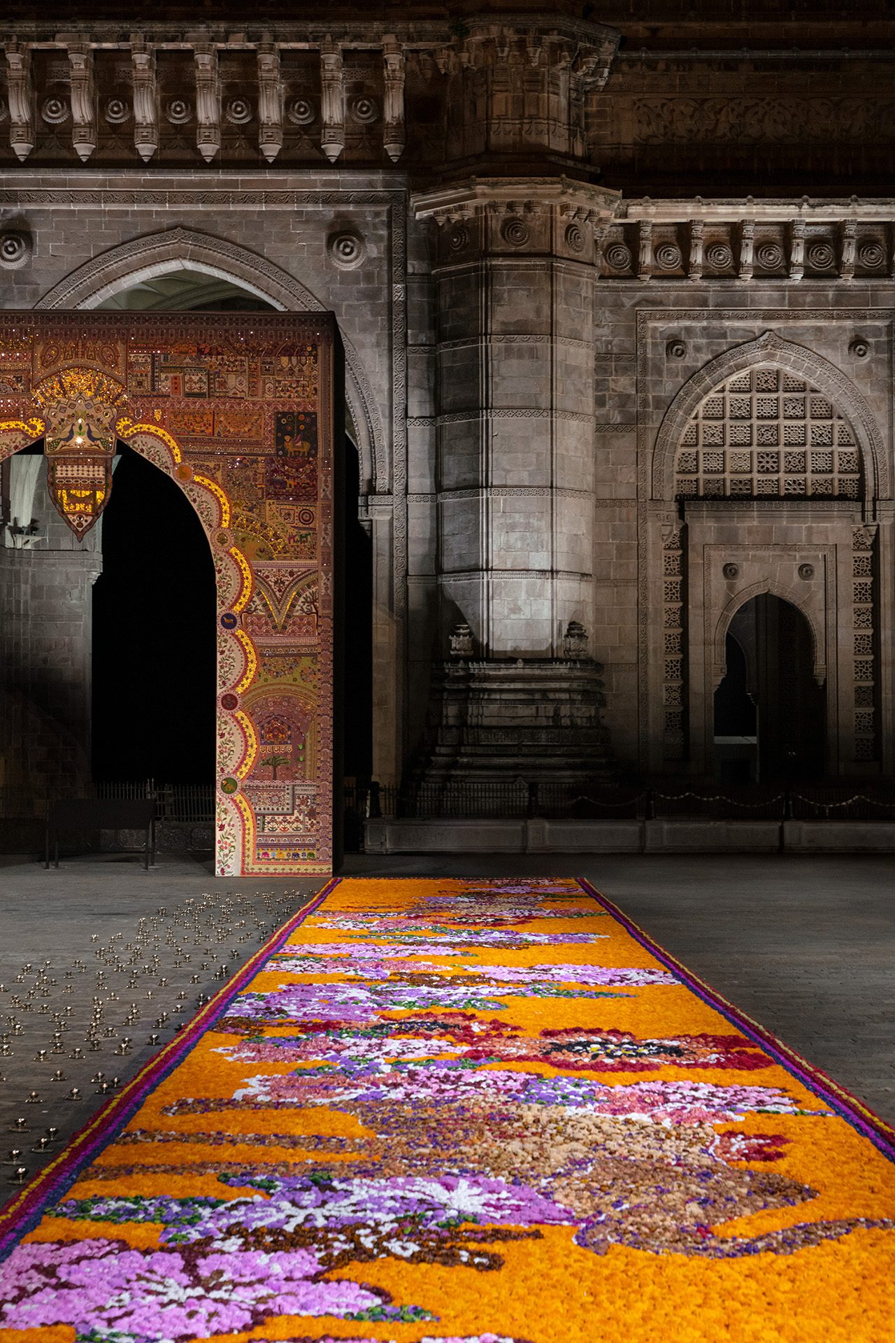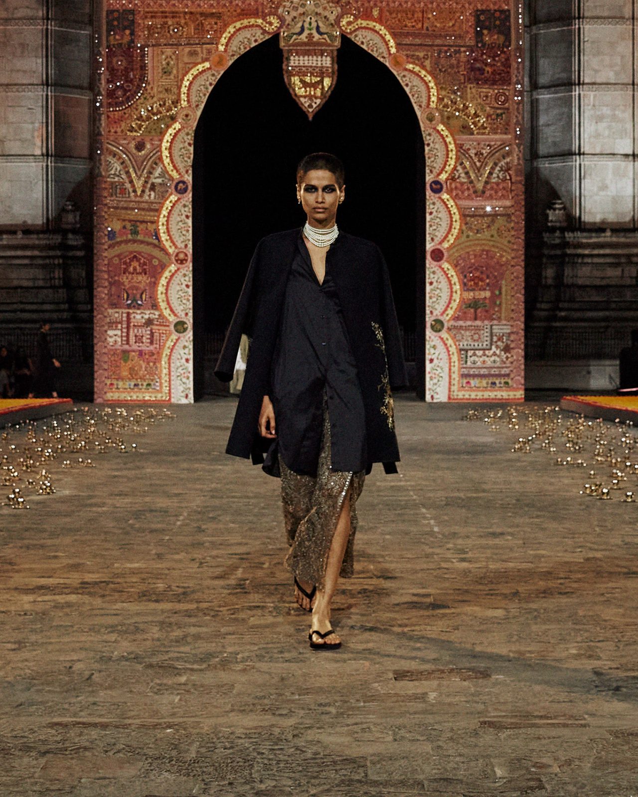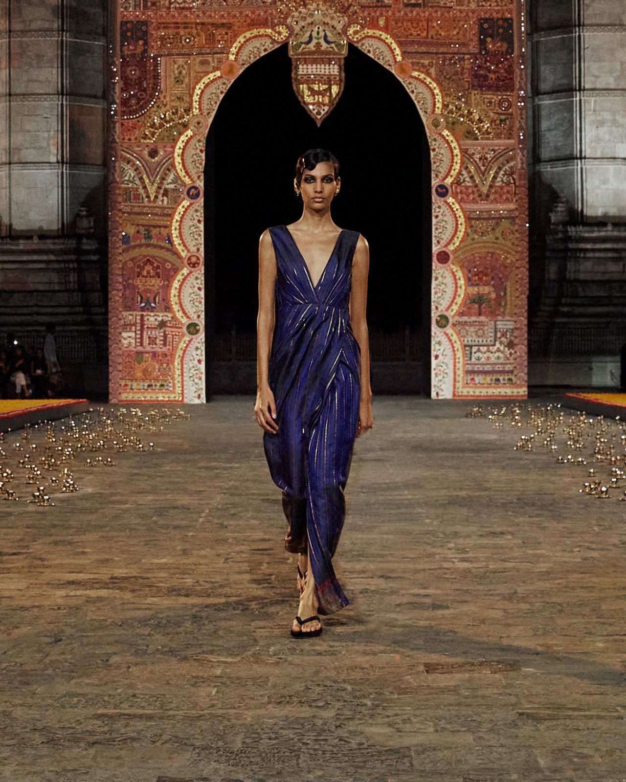 また舞台となったのは、インドの玄関口を象徴する「インド門」。モデルたちが歩くアーチには、インドの伝統的な装飾品であるトーランが再現され、チャーナキヤ工芸学校の職人や生徒たちが合計3万5000時間かけて手作業で製作した。