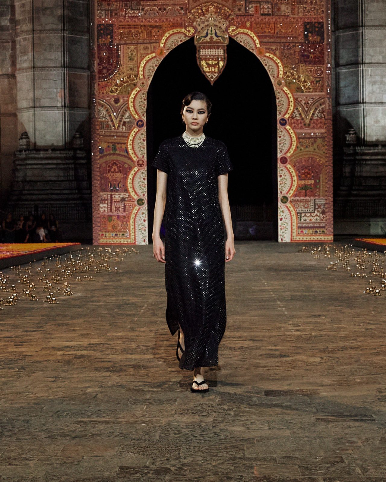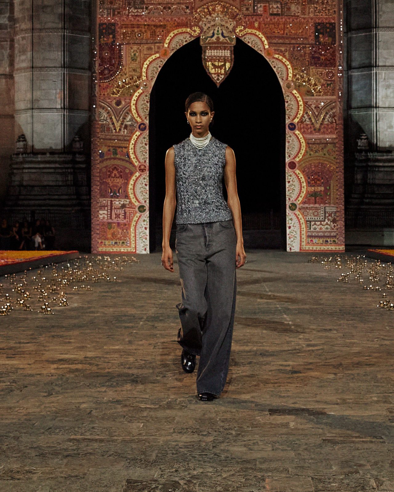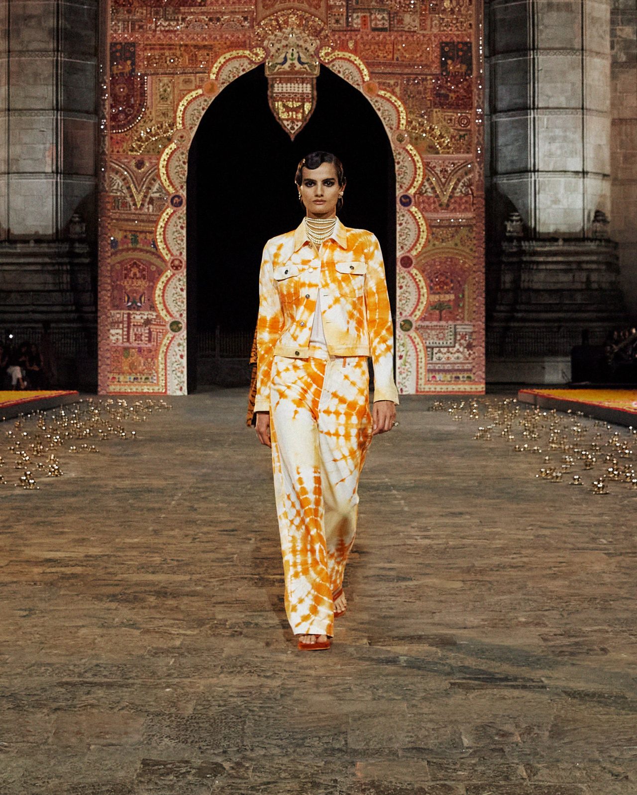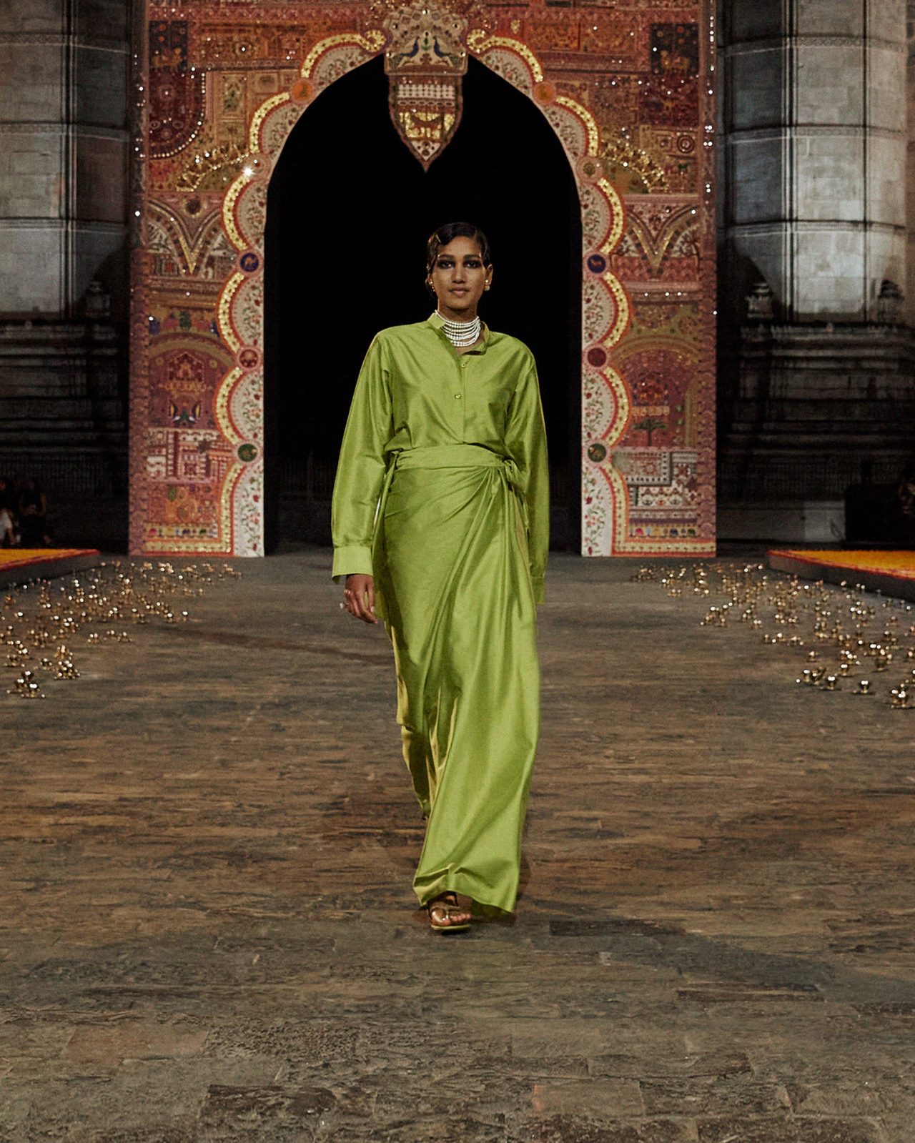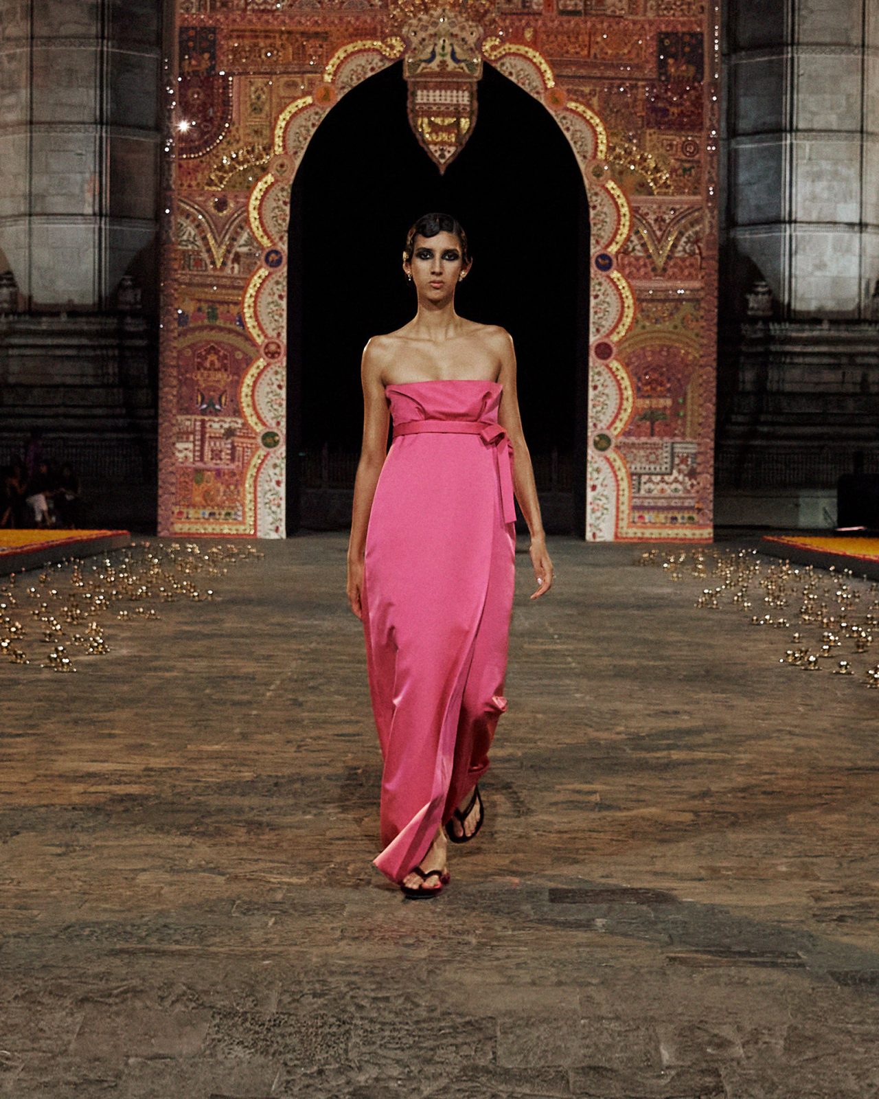 また舞台となったのは、インドの玄関口を象徴する「インド門」。モデルたちが歩くアーチには、インドの伝統的な装飾品であるトーランが再現され、チャーナキヤ工芸学校の職人や生徒たちが合計3万5000時間かけて手作業で製作した。