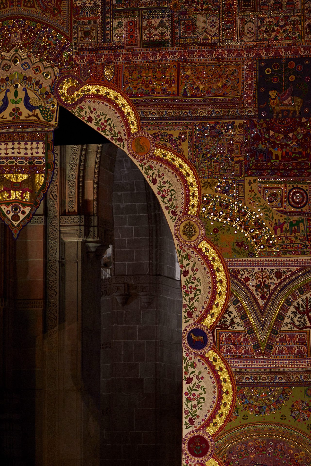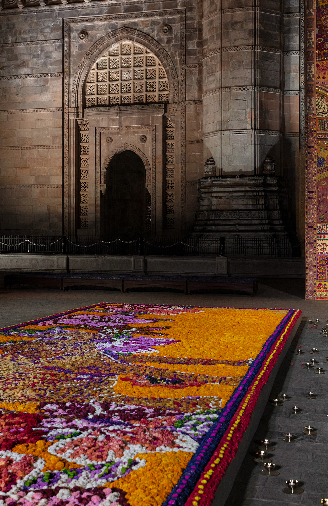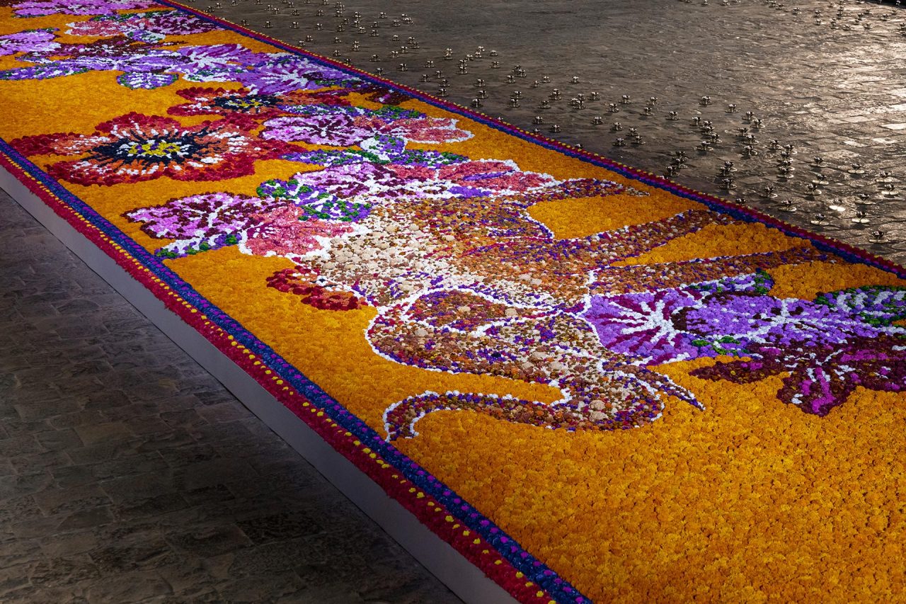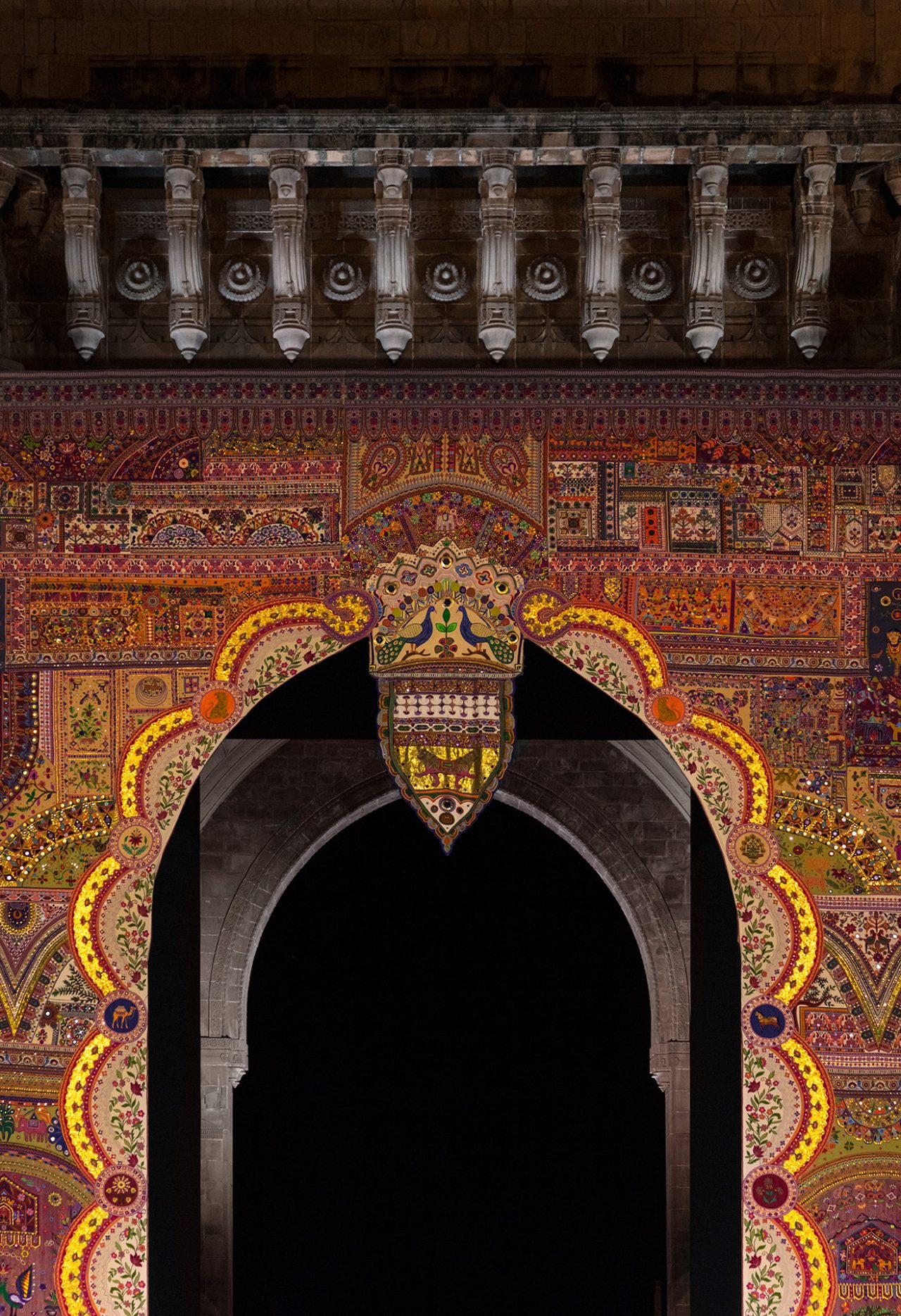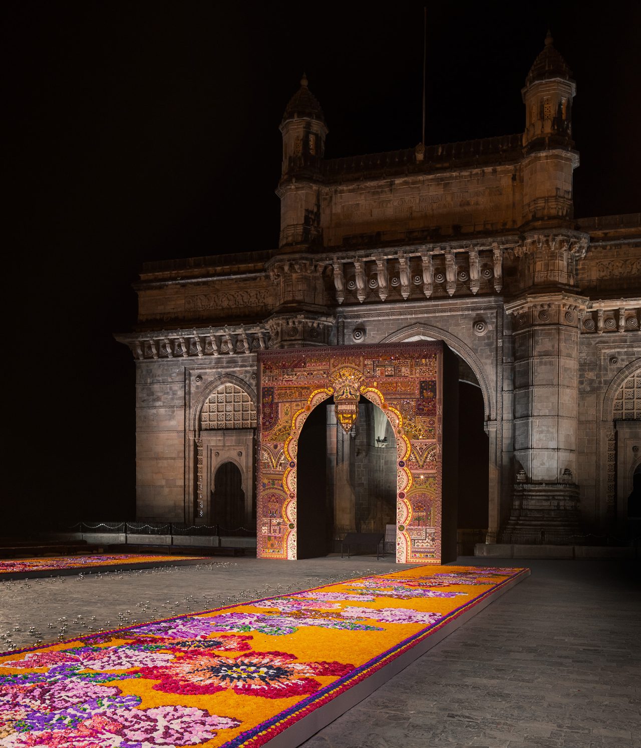 また舞台となったのは、インドの玄関口を象徴する「インド門」。モデルたちが歩くアーチには、インドの伝統的な装飾品であるトーランが再現され、チャーナキヤ工芸学校の職人や生徒たちが合計3万5000時間かけて手作業で製作した。