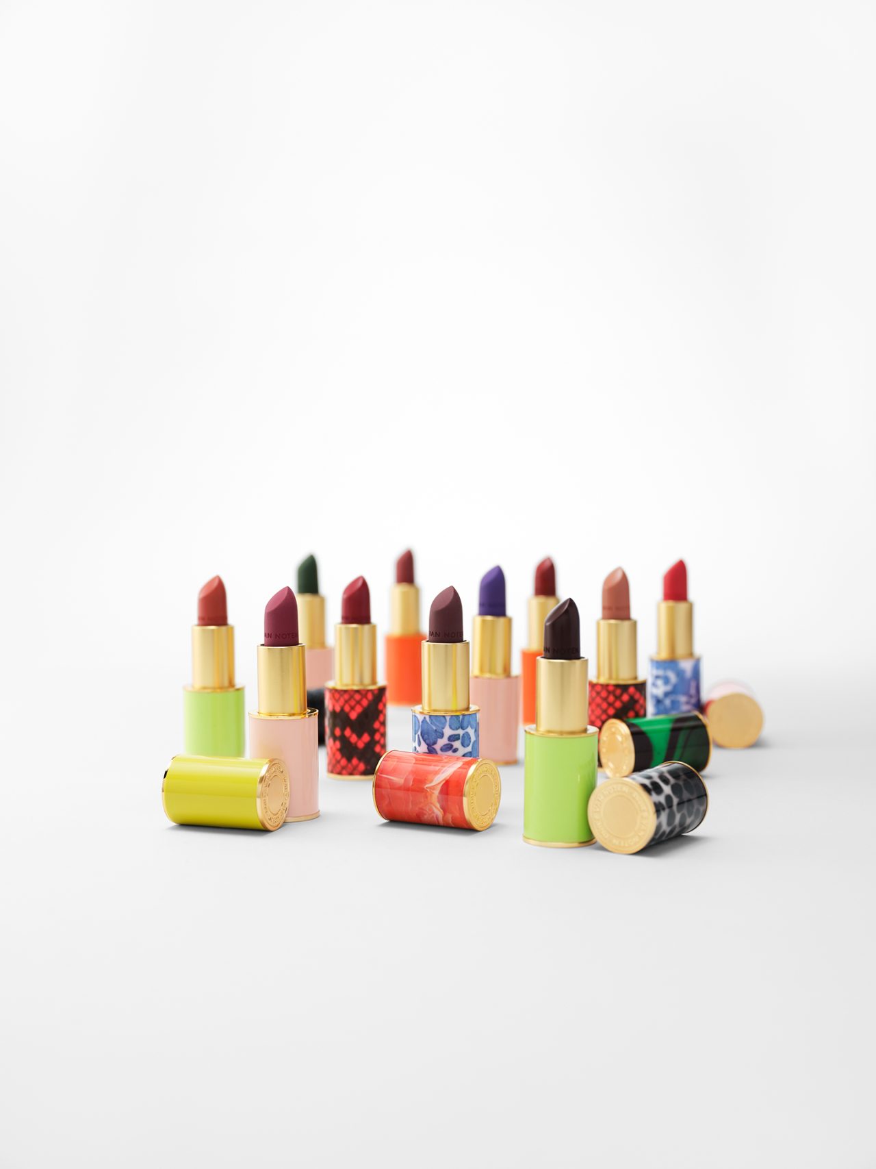 また、リップスティックは、サテン、マット、シアー、クリアバームといった様々なテクスチャーのリフィルを展開。今回追加された限定色は、洗練されたサテンのような光沢を持つ「ラブリー ライラック」とエレクトリック・パープルがより深みのある印象を与える、マット仕上がりの「デジタル ヴァイオレット」。どちらも、ブランドのプレタポルテの中で描かれるカラーパレットからインスパイアされた、大胆で美しい色合いだ。これらのリフィルに組み合わせるのは、5種類の詰め替え用ケース。ジャスパーコーラルとセラミック風のブルーパターンを用いた「コーラル セラミック」、燃えるようなオレンジとブラックのパイソン柄の対比が美しい「クロックワーク レザー」、オードパルファム「ジャルダン ドゥ ロランジュリー」の色を連想させる、パウダーピンクとレモンイエローの「アシッド ブラッシュ」などの Dries Van Noten らしい個性際立つデザインに。