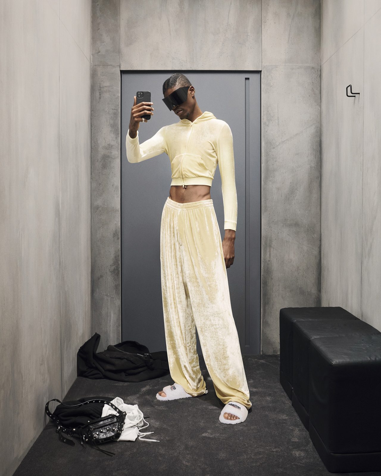 ショップにあるフィッティングルームでセルフィーを撮る、というユニークなルックを発表したバレンシアガ。モデルたちが今回のルックで身につけているアイテムは、テーラリングとサステナビリティの分野における研究をテーマにデザイン。