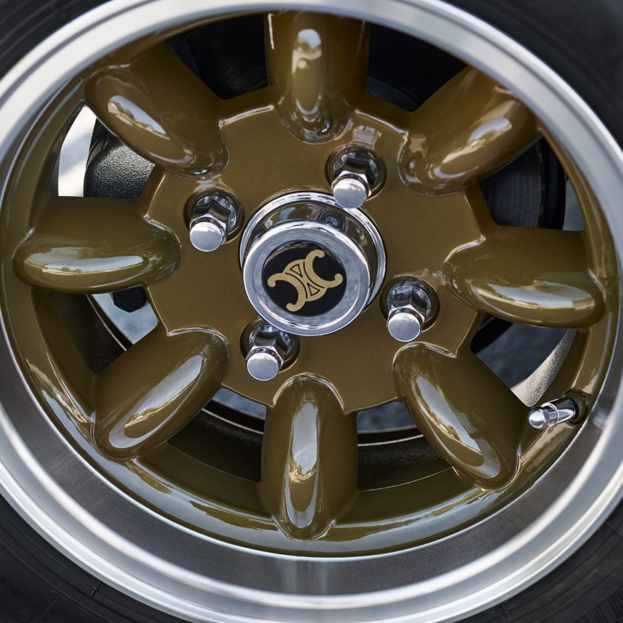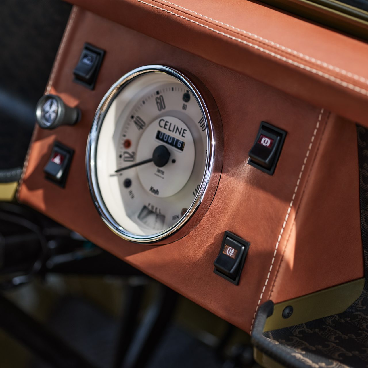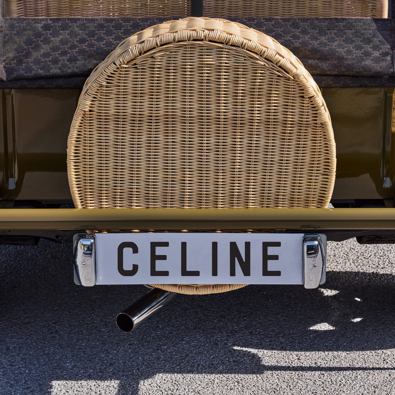 また、本キャンペーンのためにヴィンテージのミニモークをカスタマイズ。トリオンフの木製ハンドル、トリオンフキャンバスの幌や CELINE の代表的なタンカラーのレザーが施されたダッシュボード、籐のシート、スペアホイールのプロテクションとなっている。ホイールとギアシフトには、金色のトリオンフのエンブレムがあしらわれているなど、世界に一台だけのミニモークにもご注目を。
