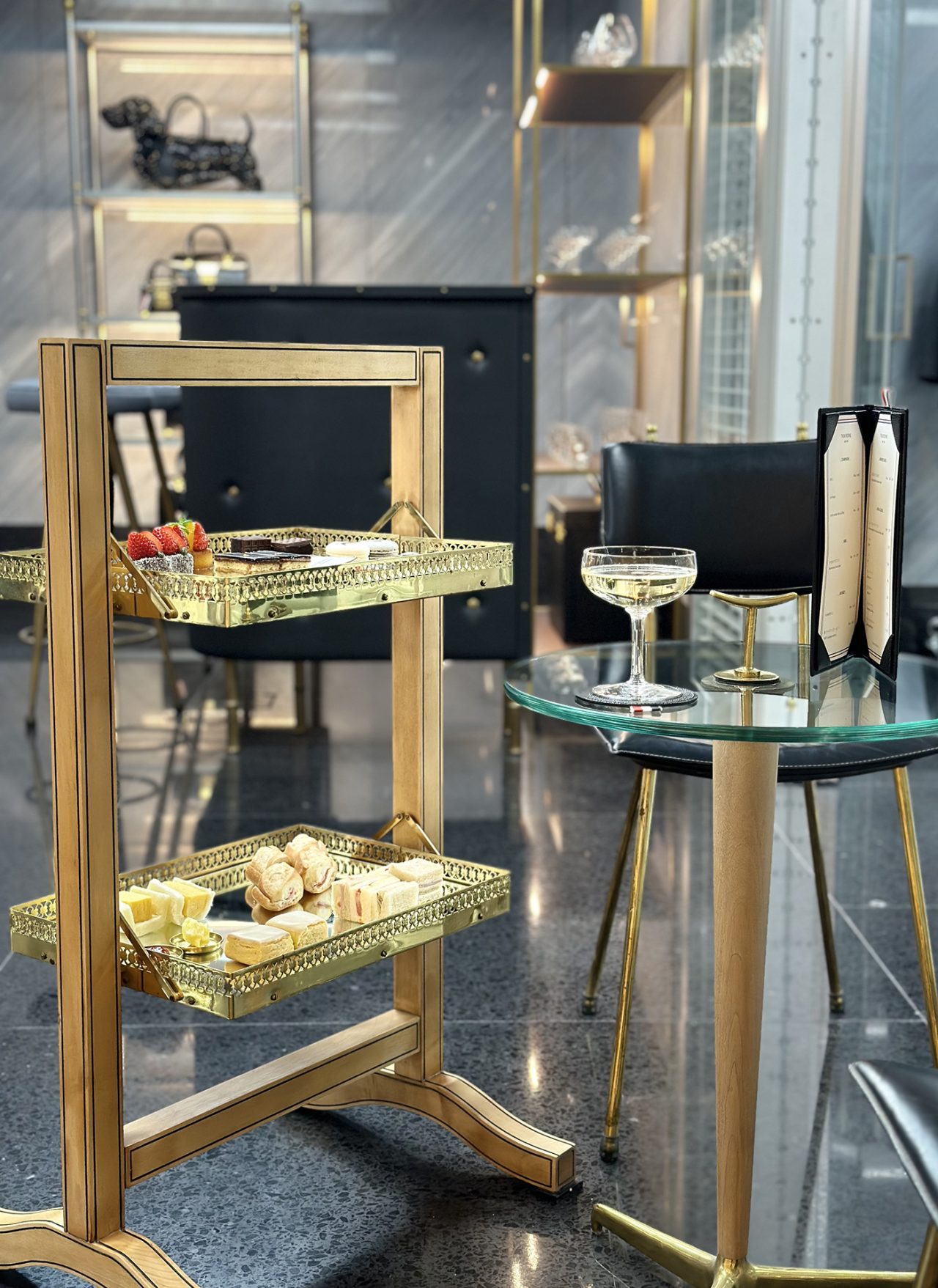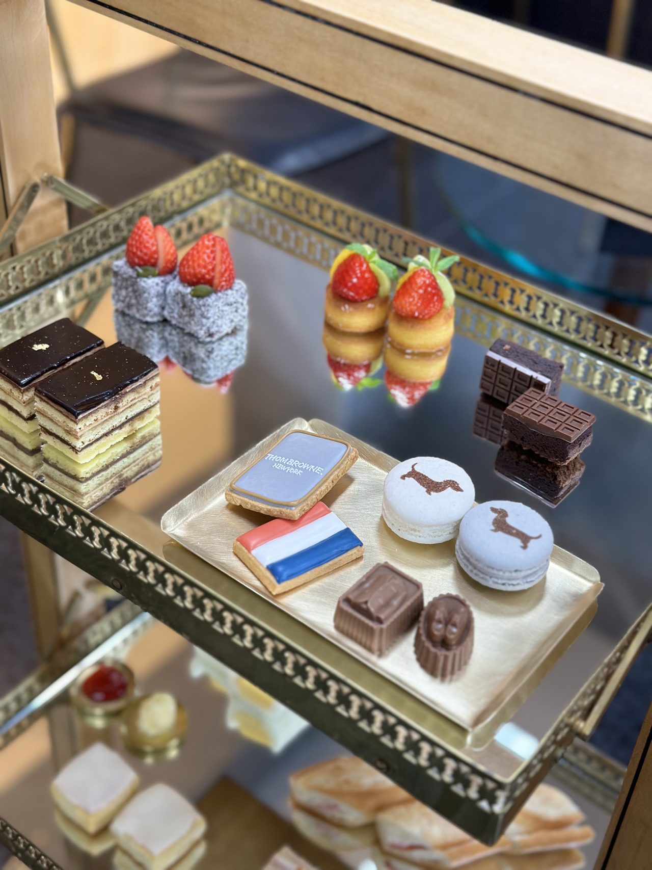 神⼾阪急新館2階にある THOM BROWNE は、ブランドで世界唯一のバーが併設された店舗。そこへ新たに、アフタヌーンティーの提供をスタート。完全予約制となる、1⽇3組までの限定セットには、ブランドの様々なアイコンがデザインされたフォトジェニックなスイーツを楽しむ事ができる。本店舗限定の THOM BROWNE チョコレートや、プリントが施されたマカロン、ブランドの象徴であるグログランのカラーで彩られたクッキーなどに加え、今回のために特別に考案された、彩り鮮やかなケーキと豊富なバリエーションとなっている。デザイナーの THOM BROWNE ⾃⾝がプライベートでも愛⽤しているバカラのグラスを使⽤するなど、こだわりが詰まった、世界観溢れるスタイリッシュな空間で、ファッションと⾷事のひとときを楽しめる。