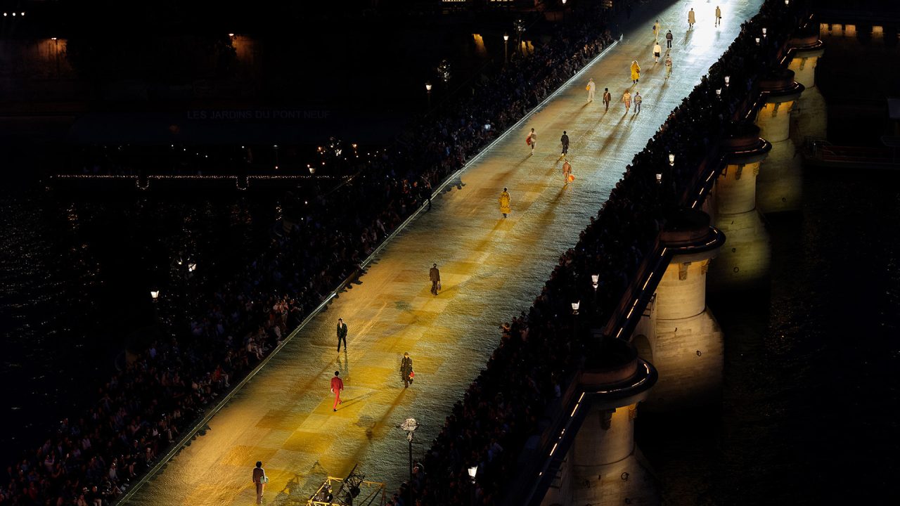 過去、2004年と2008年のコラボレーションを経て、メンズ クリエイティブ・ディレクターとして、パフォーマーからデザイナーへと新しいスタート切ったPharrell Williamsによる初のショー。会場はセーヌ川に架かるパリで最も古い橋、ポンヌフで行われ、普遍的な源である太陽をメインテーマに発表された。橋の上に作られたランウェイには、黄金に輝くブランドを象徴するモノグラムが敷かれ、彼が伝えたかったメッセージである温かさ、幸福感、歓迎する気持などを表す“LVERS”が表現された舞台にも注目が集まった。