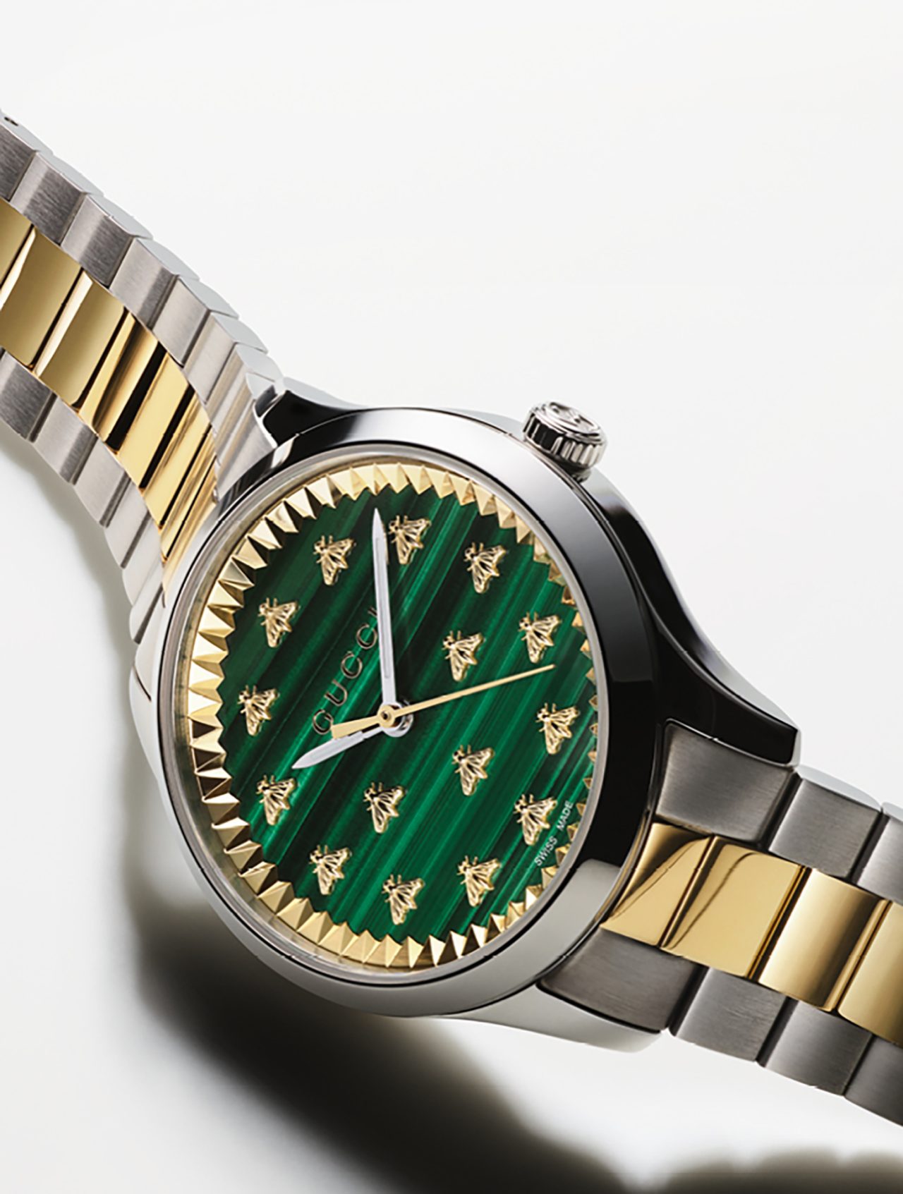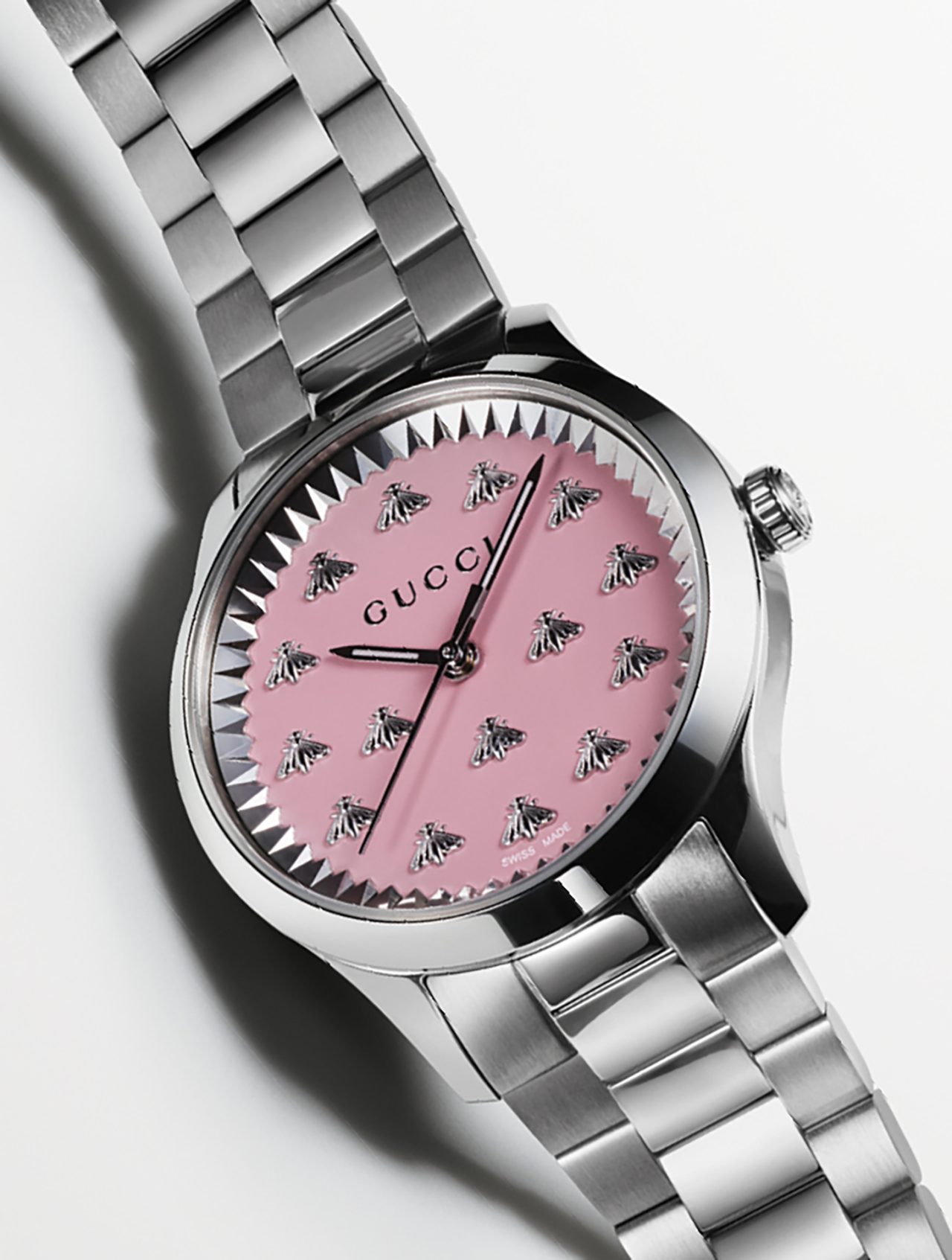 そしてウォッチコレクション「G-タイムレス」から、2種類のスモールサイズ クォーツ モデルが登場し、いずれもピンク ラッカー仕上げのダイアルとなっている。さらに「グッチ ダイヴ」ウォッチから誕生したオートマティック モデルは300mの防水性を実現し、今の季節にぴったりな夏のダイビングの楽しみをさらに広げるアイテムとなっている。