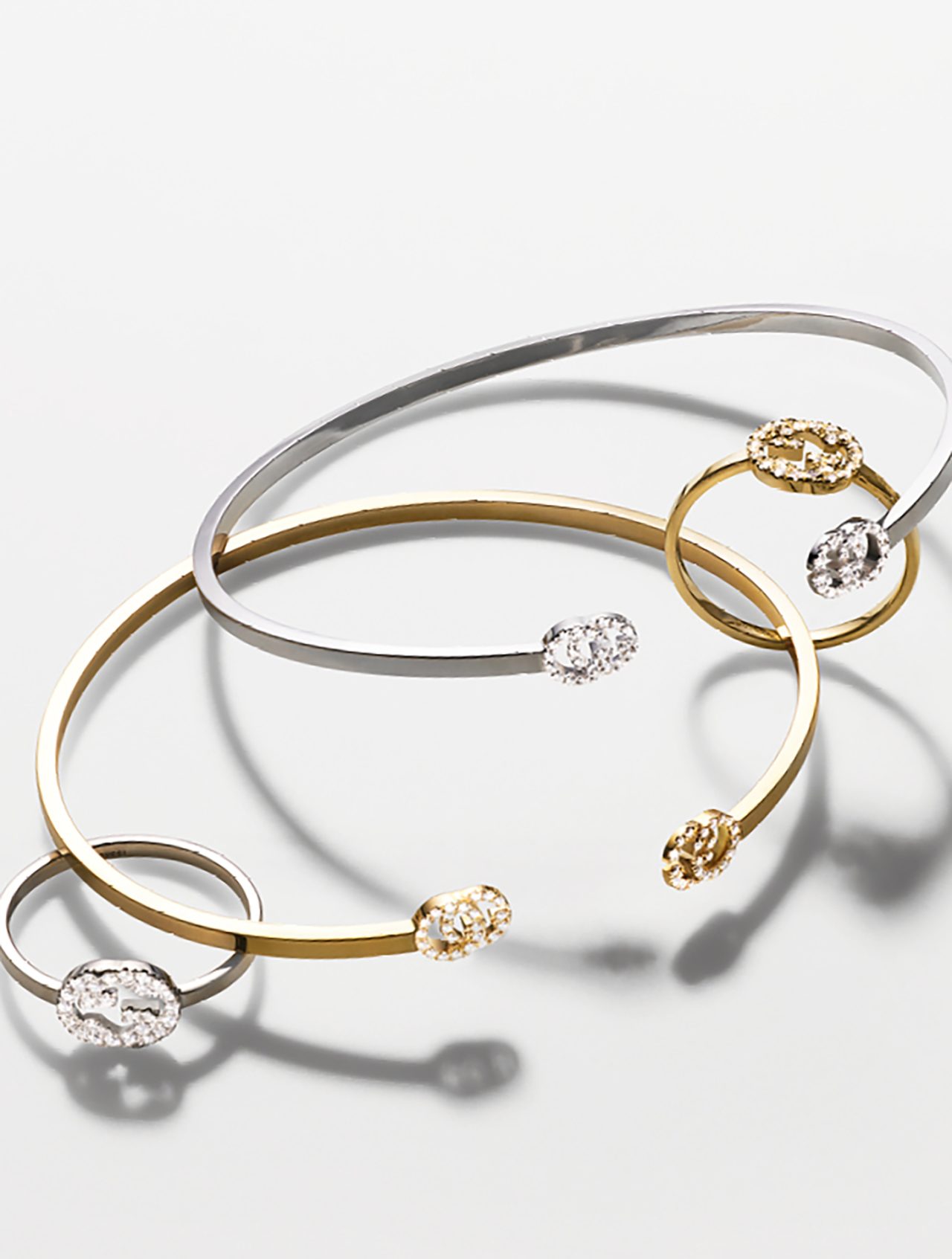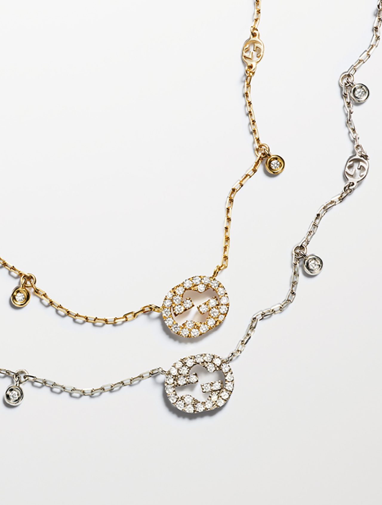GUCCI の新たなキャンペーンでは「インターロッキング G」と「GG ランニング」にフィーチャー。いずれもグッチを象徴する GG の2文字を用いたモチーフが印象的なファインジュエリーとなっている。「インターロッキング G」からは、18K イエローゴールド、18K ホワイトゴールドに、パヴェダイヤモンドがきらめくネックレス、イヤリング、リングの新作が登場。また「GG ランニング」からは、18K イエローゴールド、18K ホワイトゴールドにダイヤモンドディテールを組み合わせたオープンブレスレットをはじめ、GGモチーフに輝きが詰まったアイテムが揃う。